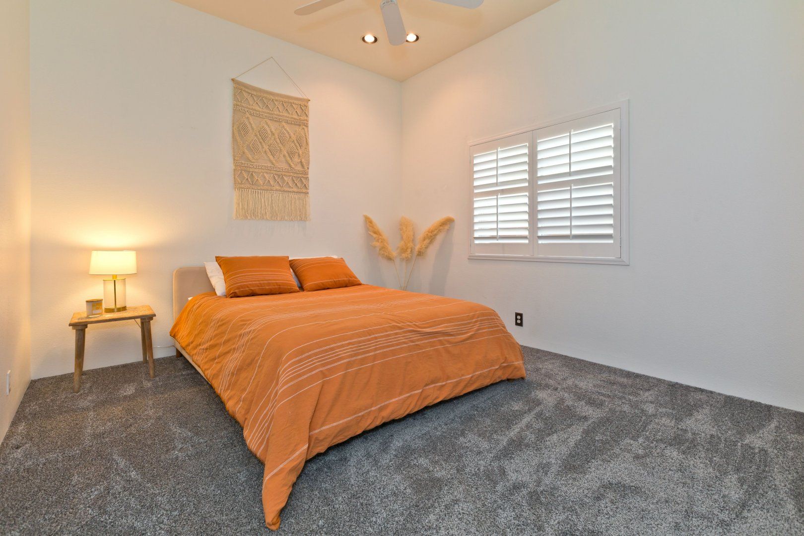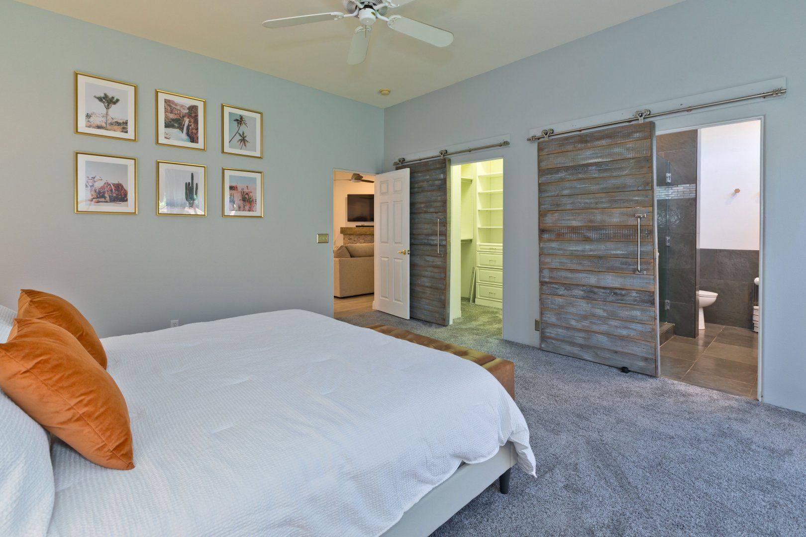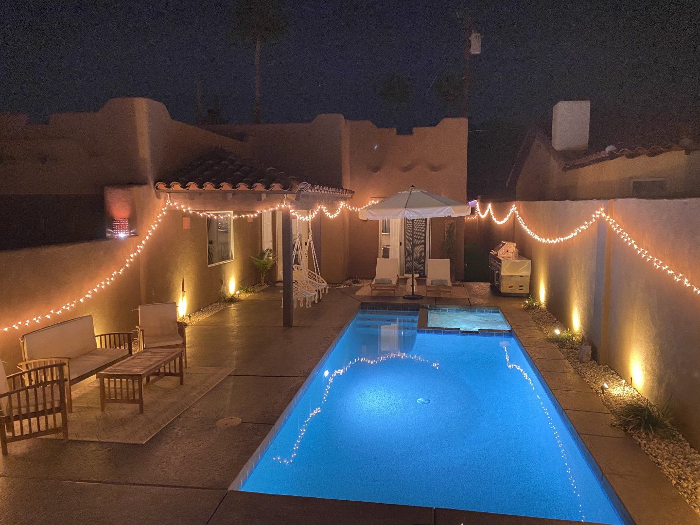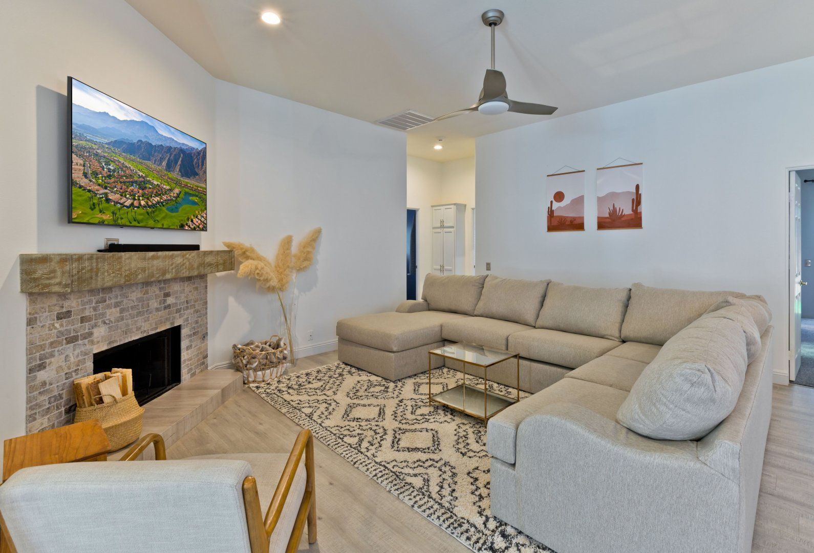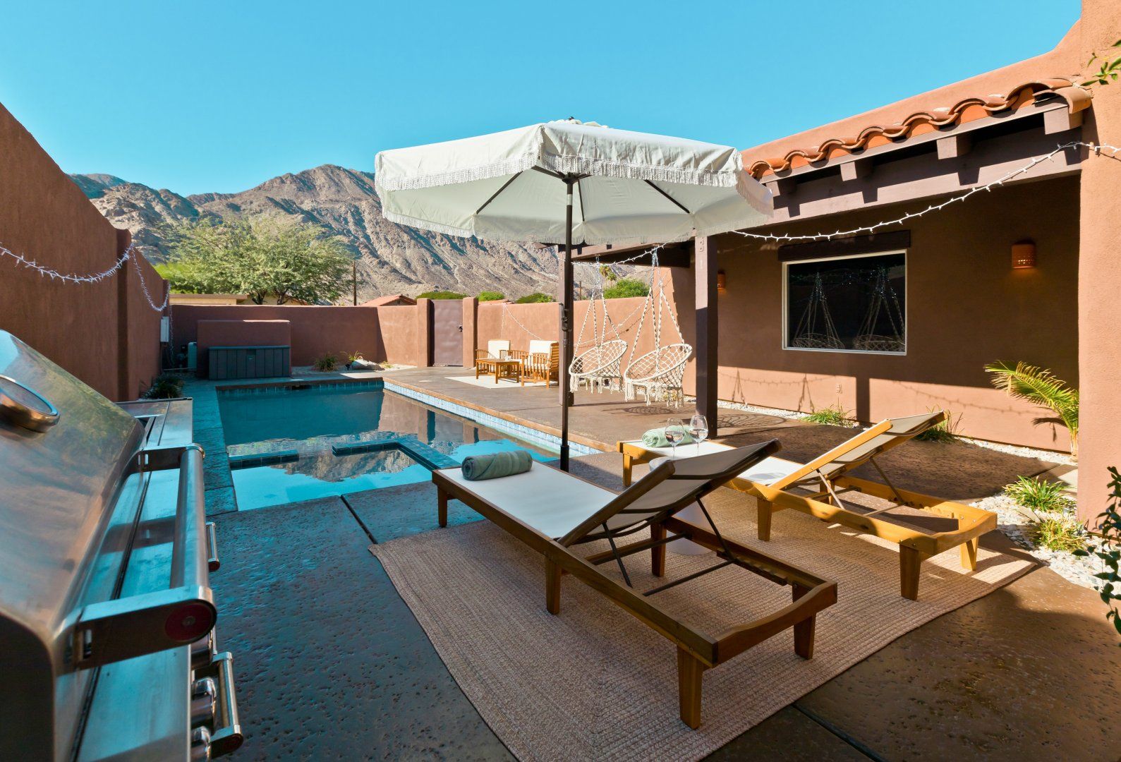 In the charismatic town of La Quinta, this home is as comfortable as it is stylish. Built in traditional style, and all set on one floor, it's been recently refurbished to create a smart new place to call your own for a while. White walls blend with modern greys and creams and the furnishings are all plush and new. The huge sofa is the centrepiece of the sociable open-plan living space, along with a dining table and well-equipped kitchen. There's a distinct boho flavour to the styling, with throws and rugs inside and a couple of woven swing seats to snuggle into on the terrace. We love the vast master bedroom, with its own walk-in wardrobe and chic en-suite. But the chances are you'll be here for the outdoor space, which centres around a heated pool and a sunken hot tub. Pour yourself a glass of something cold and sit back in your private garden, admiring views over the nearby mountains. Here you'll be just minutes away from the hiking trails and golf courses of La Quinta, with Joshua Tree and the Coachella Valley within a half-hour drive.