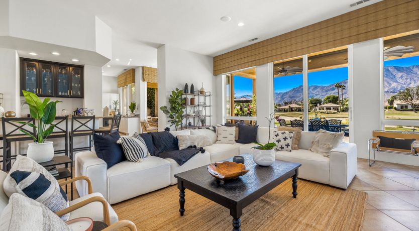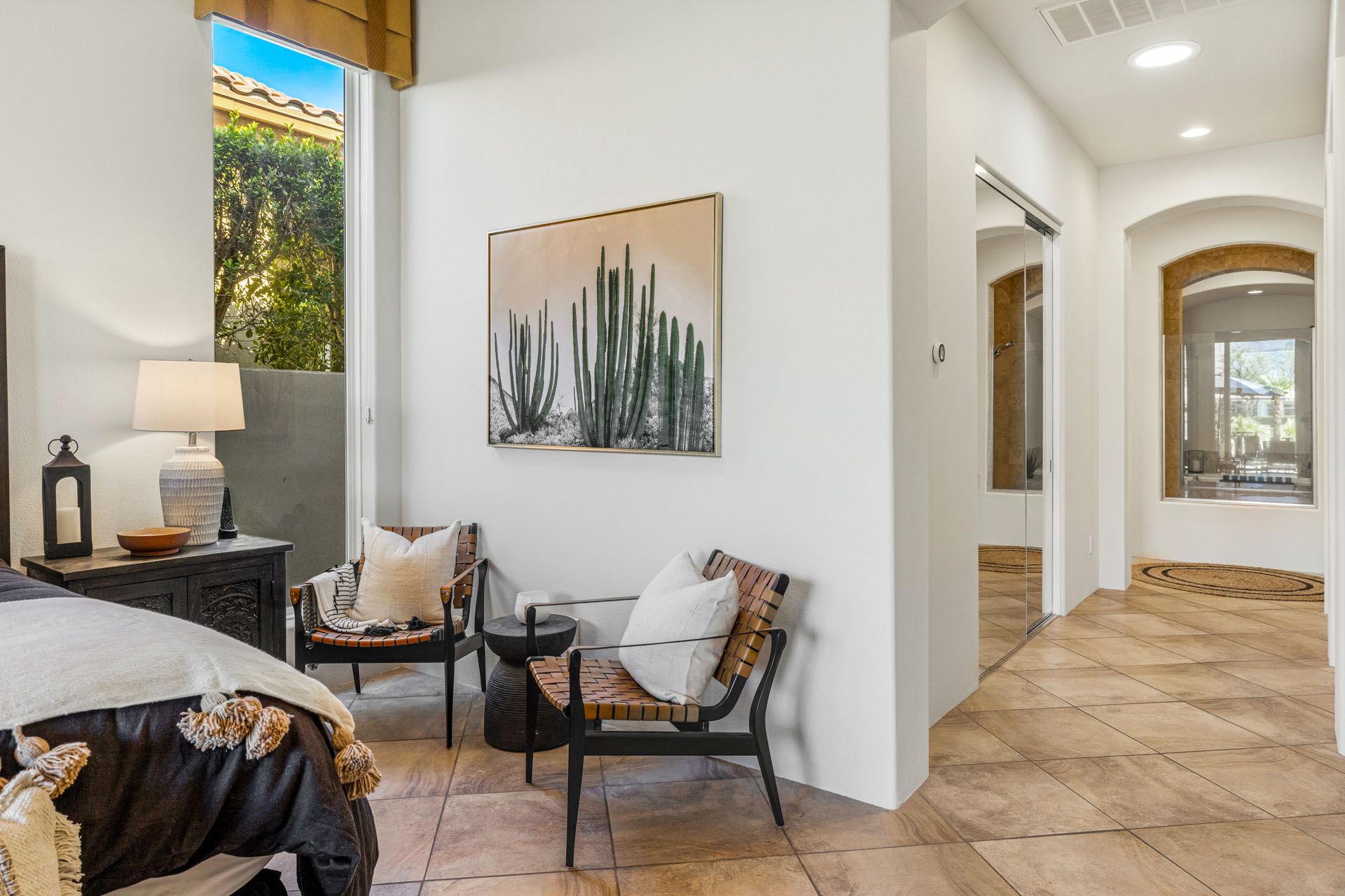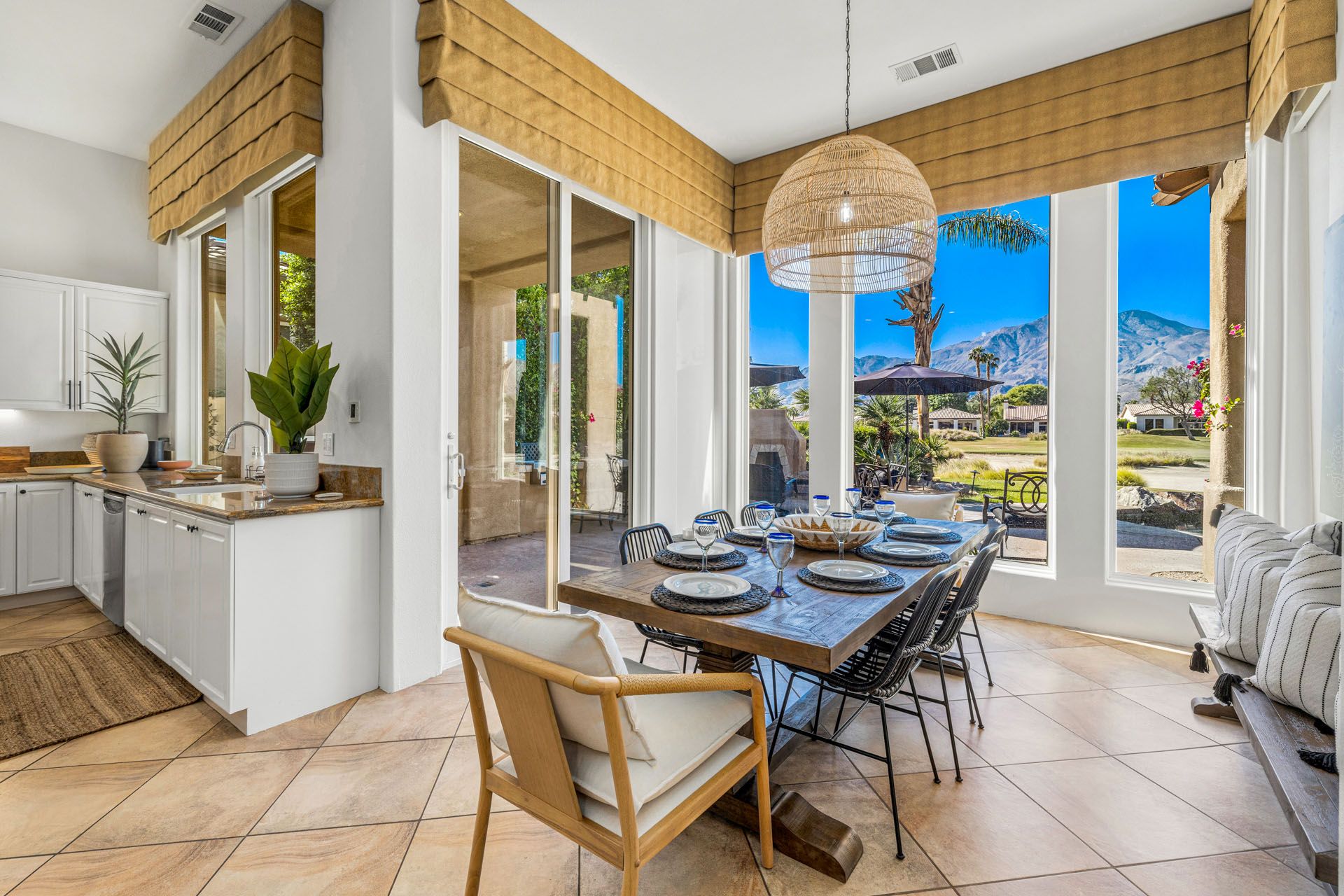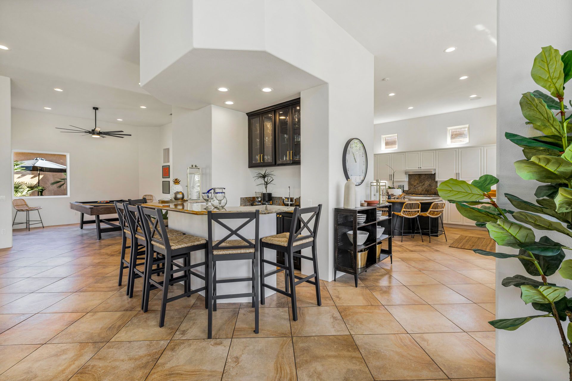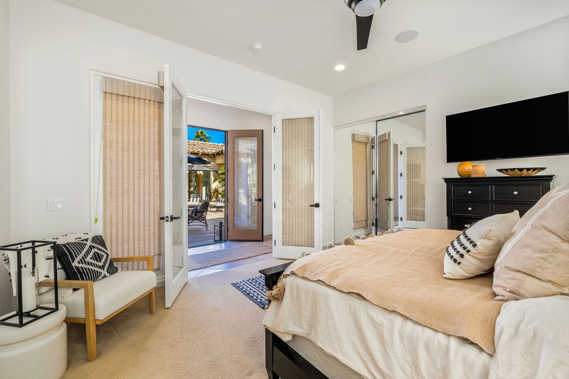 This desert home is all about wide horizons and effortless living. From the saltwater pool you can watch the sun dip behind the mountains, or linger by the firepit as the cool desert night settles in. Inside, sunlight streams through big windows onto generous spaces made for gathering – cocktails at the bar, a game of billiards, or a quiet dinner together. Bedrooms feel like private retreats, each one designed for rest after a day on the course, hiking through the desert, or visiting the restaurants and eateries of nearby Palm Springs.