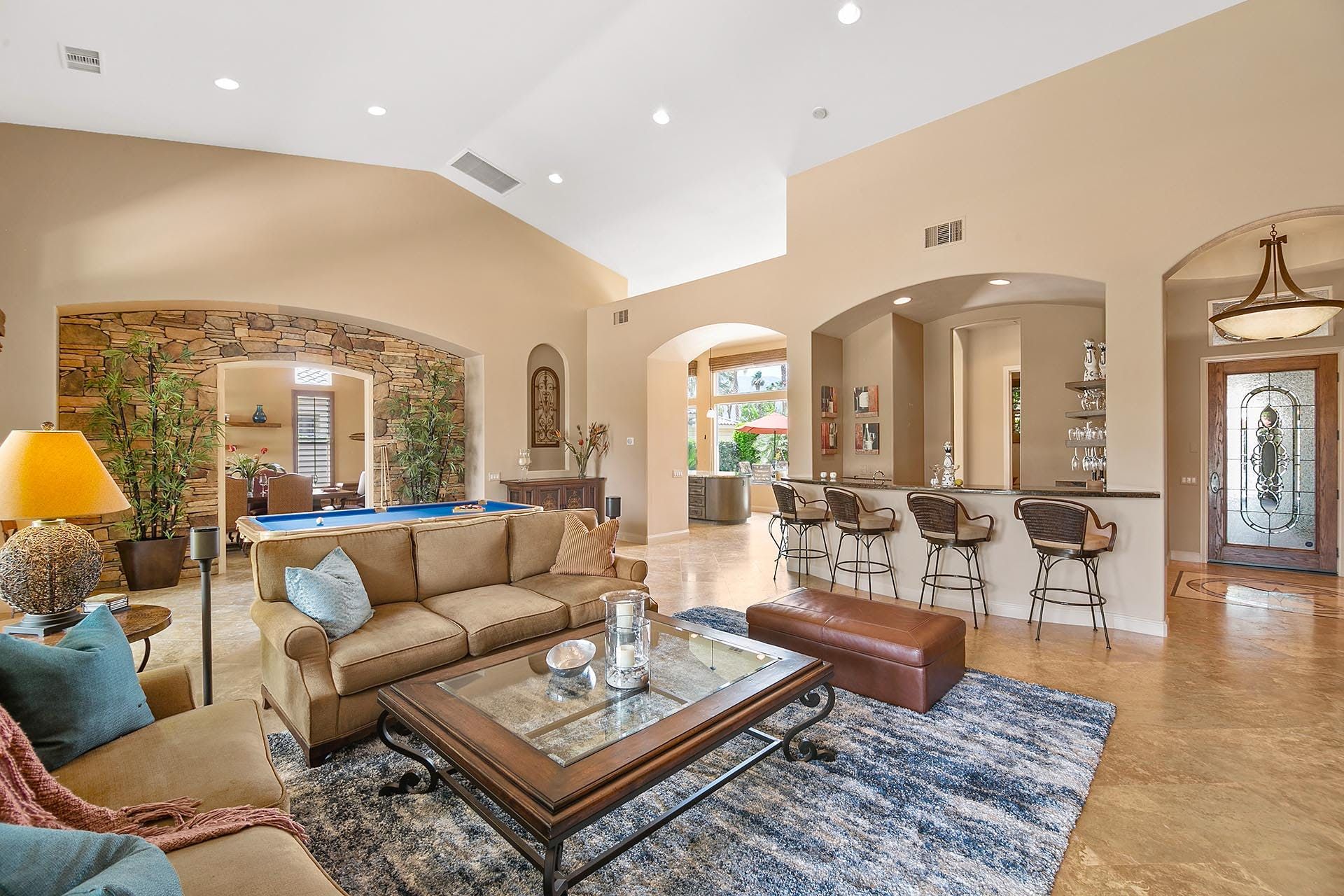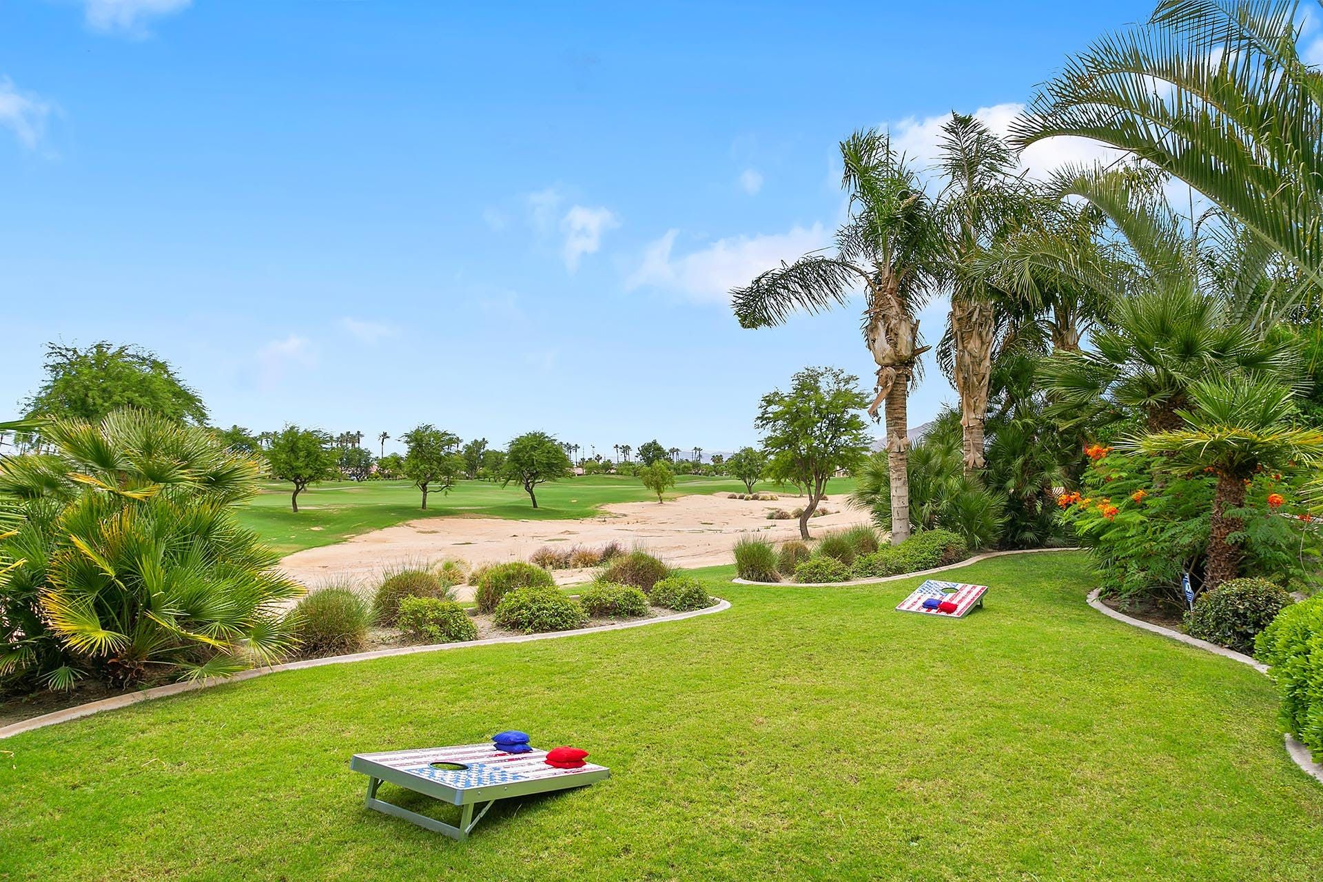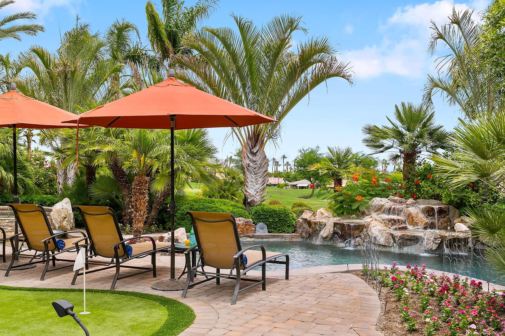 Spend days out in the lush garden, with its tropical hibiscus, citrus, bird of paradise and, of course, palm trees. While there’s plenty of places to sit, you’ll probably be moving from the pool to the Jacuzzi, to the sun lounger and then back to the pool again. Toss a round of cornhole with friends or family, or play some golf on your own personal putting green. When the sun sets and the desert night air settles in, light up the grill and fire pit for a cosy dinner under the stars. Inside, you’ll find the home is equally well set up for entertaining – the enormous kitchen is ideal for fixing up elaborate dinners, while the pool table and wet bar provide the evening’s fun and games. Even from inside, you can enjoy the wonderful landscaping of the garden, with the large paneled living room windows providing a beautiful view of the inviting outdoors. The bedroom suites are roomy and the bathrooms are spotless, adding to the comfort found in every room of this thoughtfully designed home. Though it will be hard to run out of things to do here, it’s worth making time for the area’s hiking and shopping. The famous El Paseo shopping district is only fifteen minutes away and Empire Polo Grounds is just four minutes away. Plus, if you fancy a larger golf course, you’re already on one, with several more in the surrounding area.