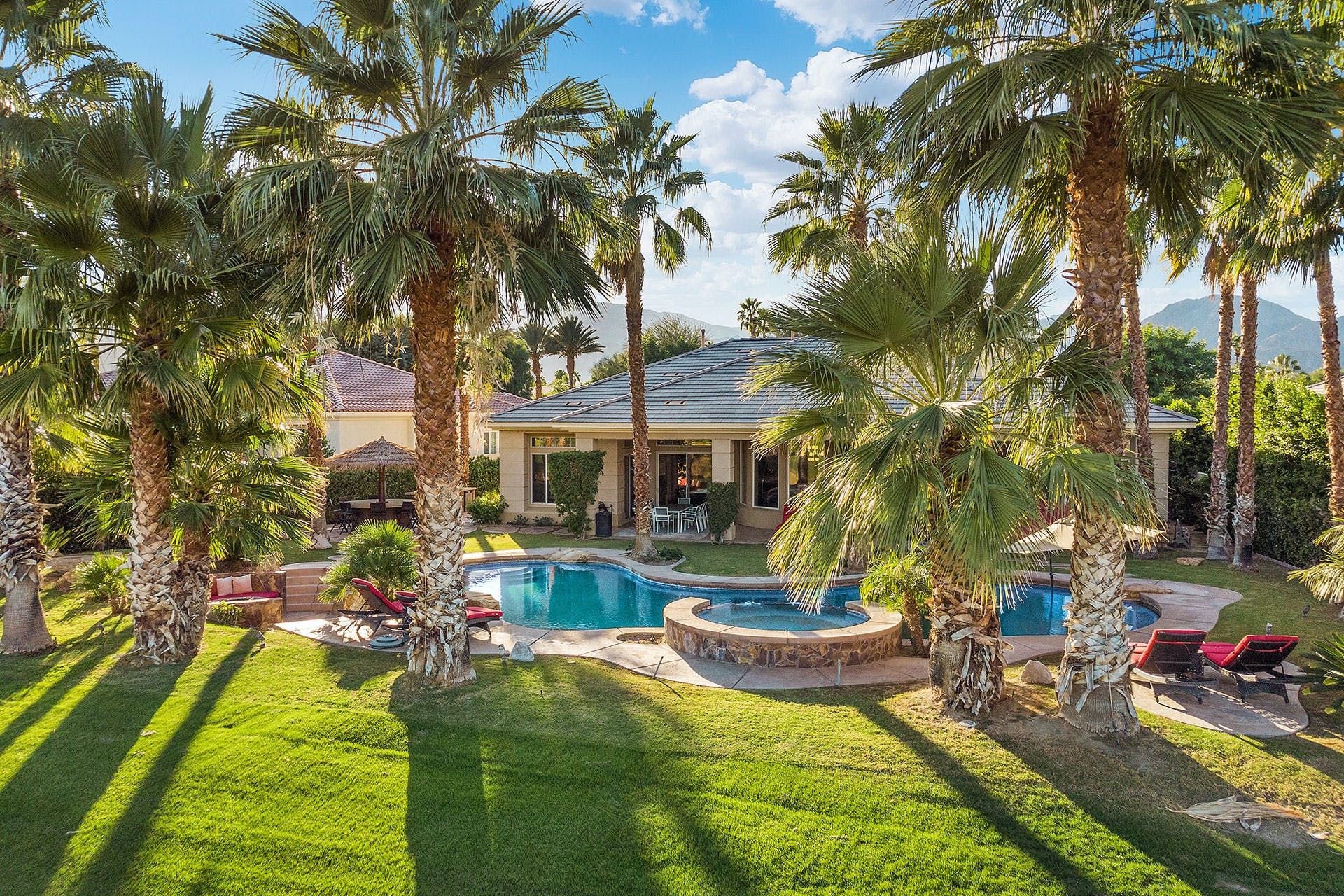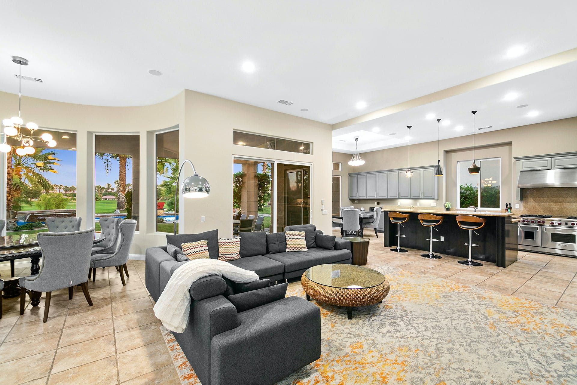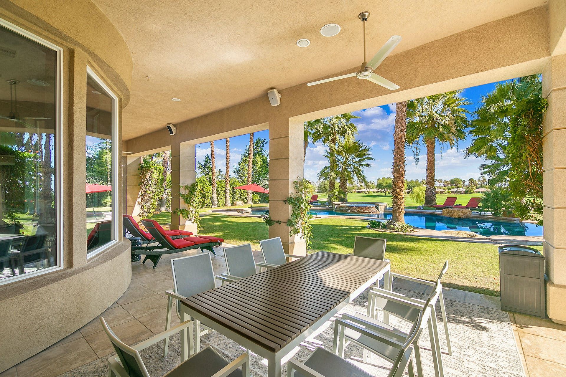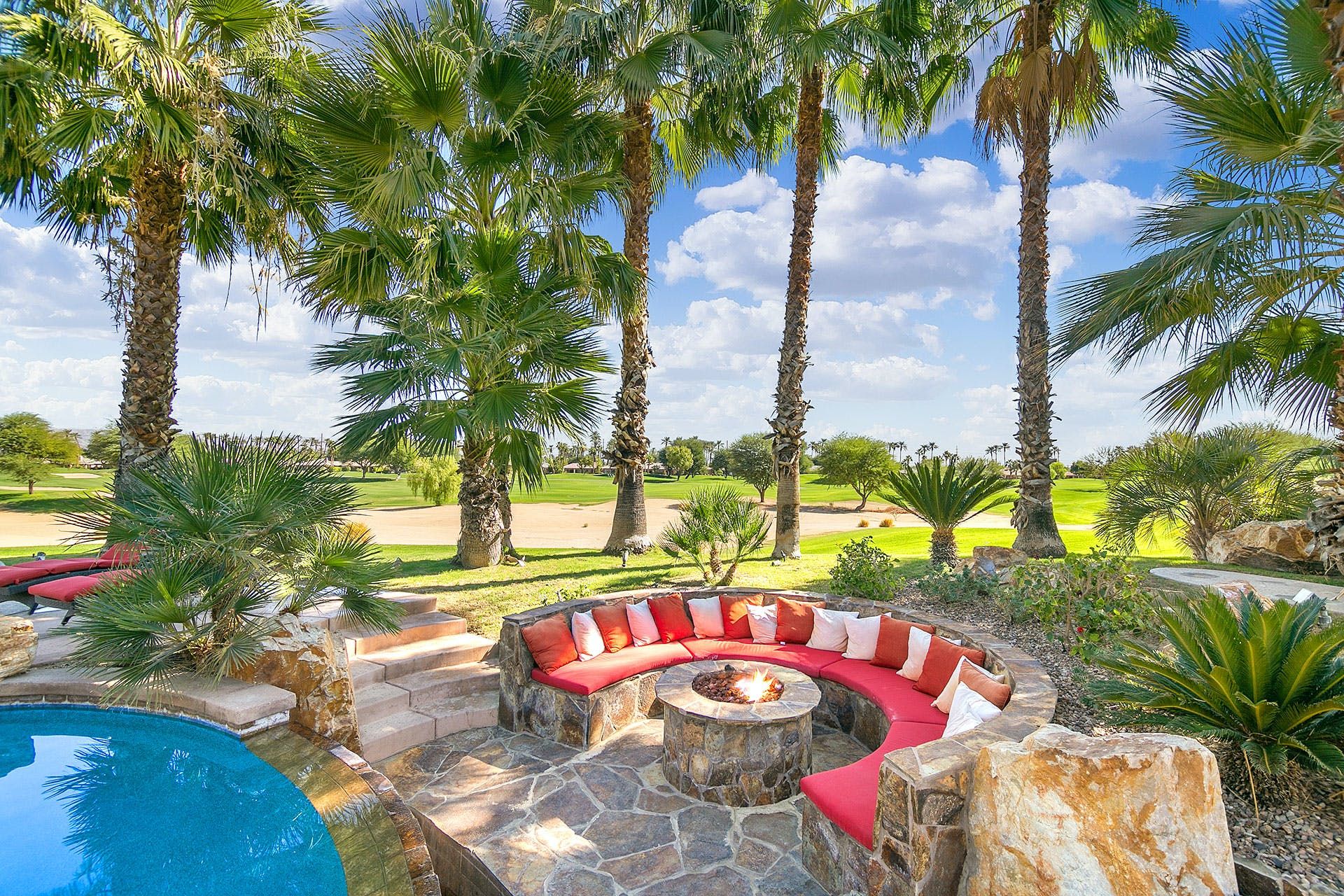 Situated on a golf course, this expansive home boasts sweeping views of the fairway and the Santa Rosa Mountain range – both of which you’ll be appreciating a lot given the incredible outdoor area here. Dive into the saltwater infinity pool to break from the heat, then soak your muscles in the Jacuzzi. Read your book under the refreshing spritz of the misting system with a margarita in hand (yep, there’s a Signature Margarita Machine). Sit by the fire pit, turn up the grill or simply relax on a lounger – this home’s a poolside wonderland. Inside, you’ll find an open-plan living area where both functional and playful spaces blend together. Challenge a friend to a game of pool or poker while the chef of the group makes use of the incredibly well-equipped kitchen – with a blender, food processor, rice cooker, deep fryer and pizza stone, any kind of cuisine can be on the menu. When it’s time to sleep, the bedrooms boast luxury linens and plenty of space for sprawling out. While there’s so much to do at the house, if you fancy going out you'll find golf courses, restaurants and shopping all around the area. Plus, for adventurous hikers or nature lovers, Joshua Tree National Park is only forty-five minutes away by car.