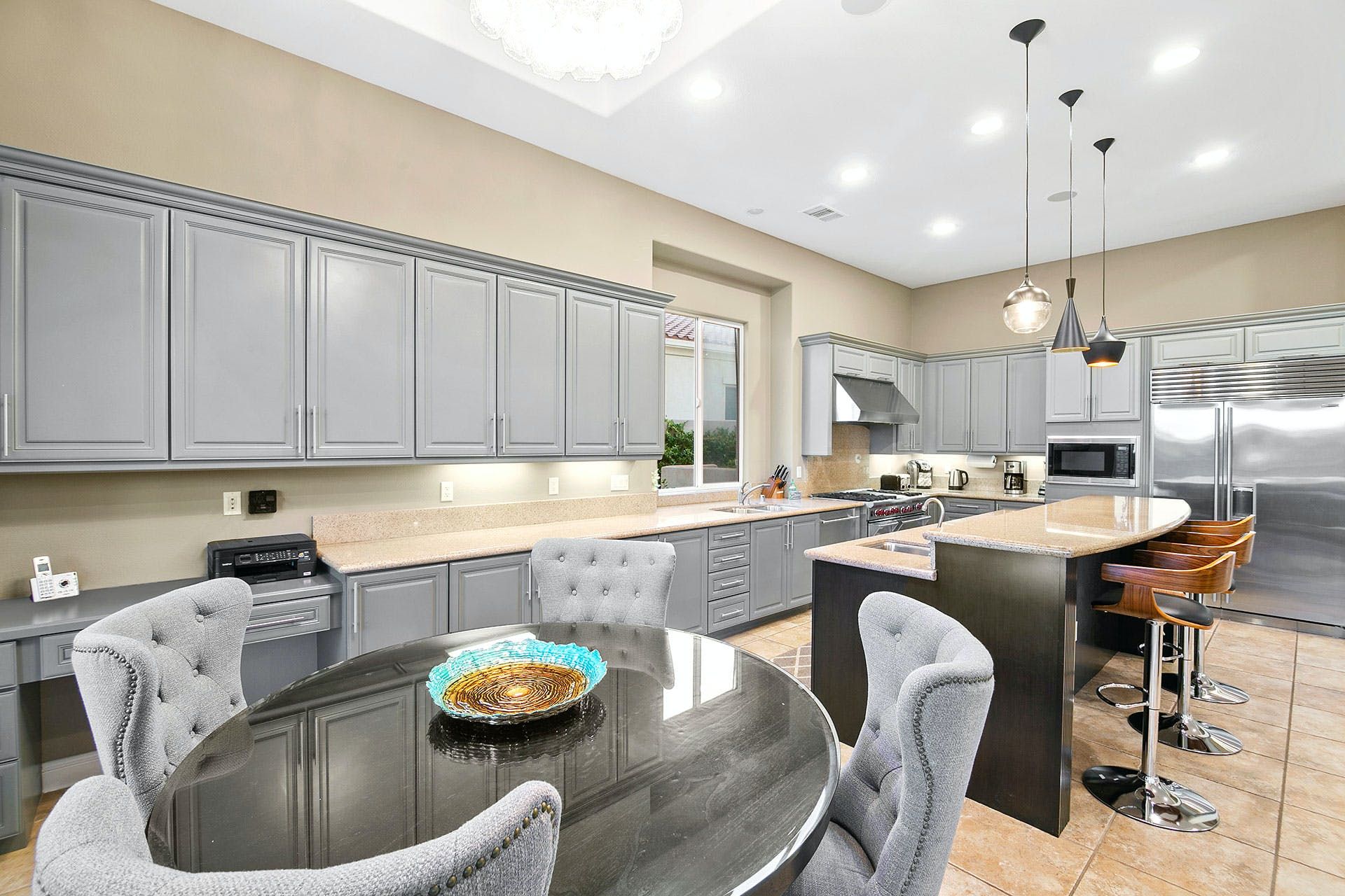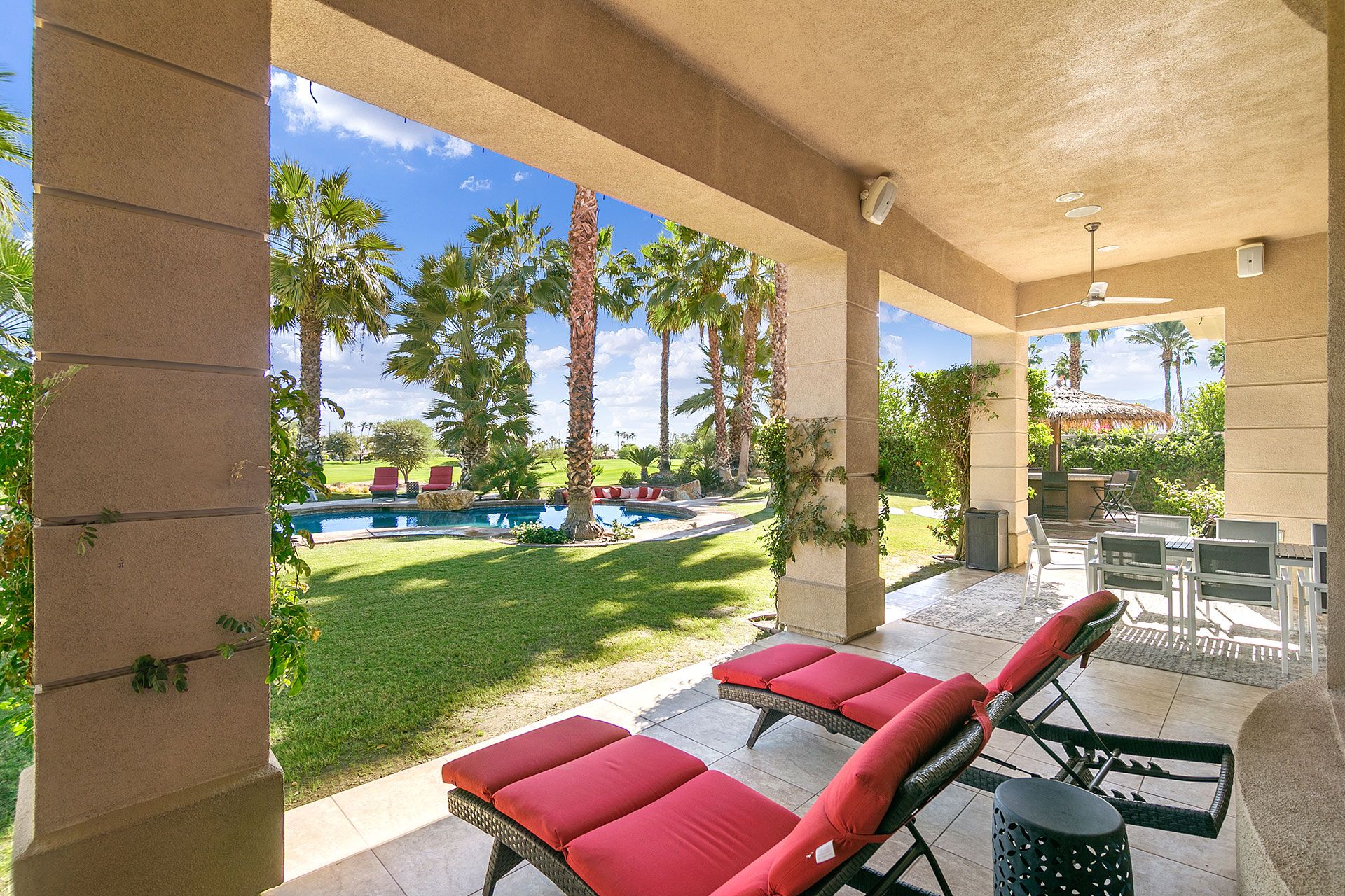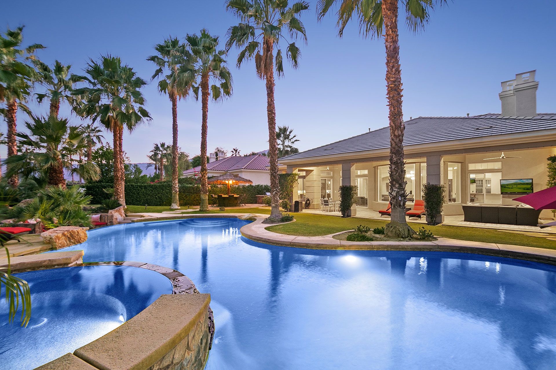 Situated on a golf course, this expansive home boasts sweeping views of the fairway and the Santa Rosa Mountain range – both of which you’ll be appreciating a lot given the incredible outdoor area here. Dive into the saltwater infinity pool to break from the heat, then soak your muscles in the Jacuzzi. Read your book under the refreshing spritz of the misting system with a margarita in hand (yep, there’s a Signature Margarita Machine). Sit by the fire pit, turn up the grill or simply relax on a lounger – this home’s a poolside wonderland. Inside, you’ll find an open-plan living area where both functional and playful spaces blend together. Challenge a friend to a game of pool or poker while the chef of the group makes use of the incredibly well-equipped kitchen – with a blender, food processor, rice cooker, deep fryer and pizza stone, any kind of cuisine can be on the menu. When it’s time to sleep, the bedrooms boast luxury linens and plenty of space for sprawling out. While there’s so much to do at the house, if you fancy going out you'll find golf courses, restaurants and shopping all around the area. Plus, for adventurous hikers or nature lovers, Joshua Tree National Park is only forty-five minutes away by car.