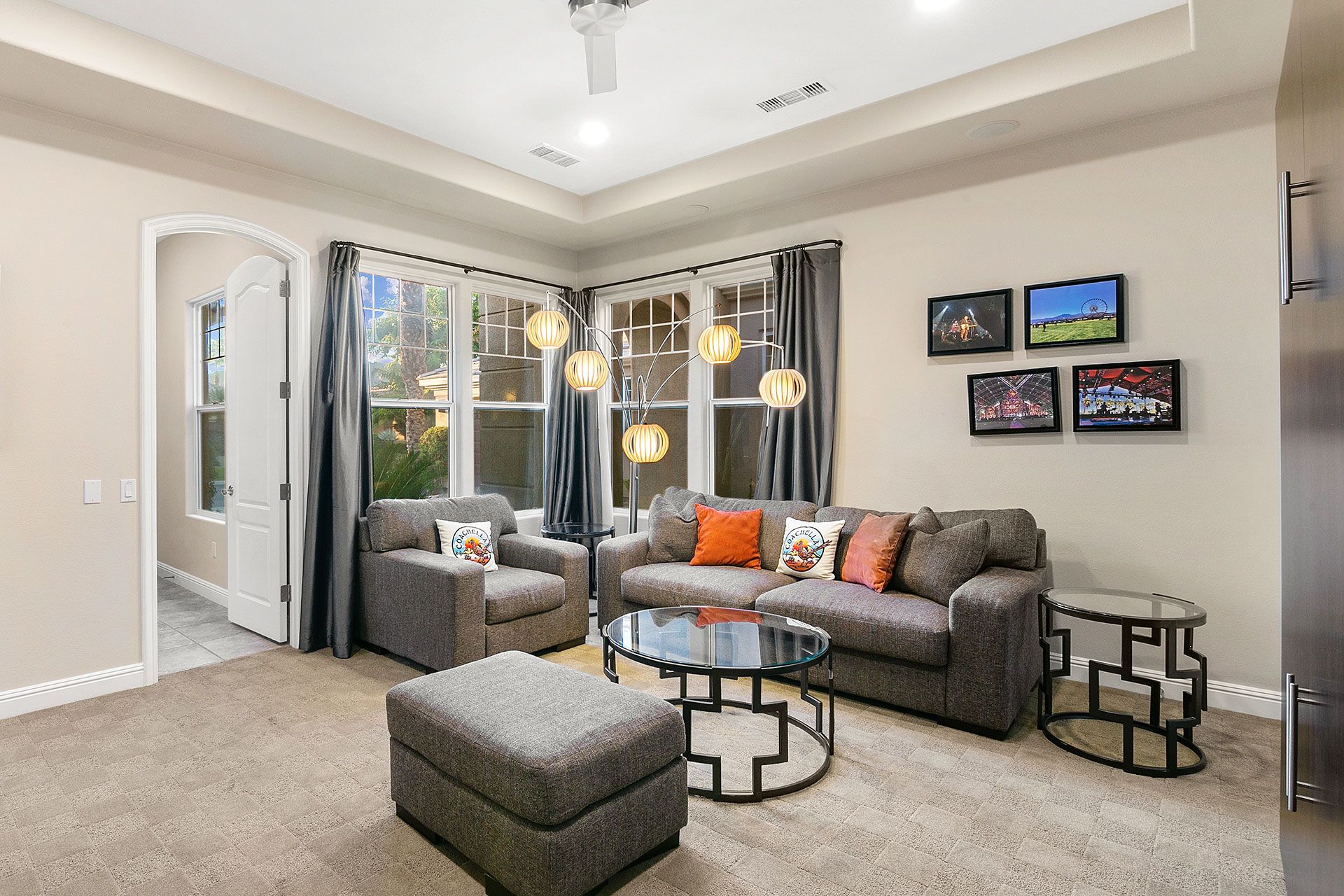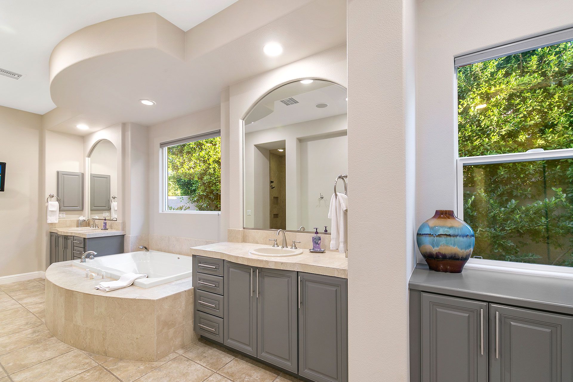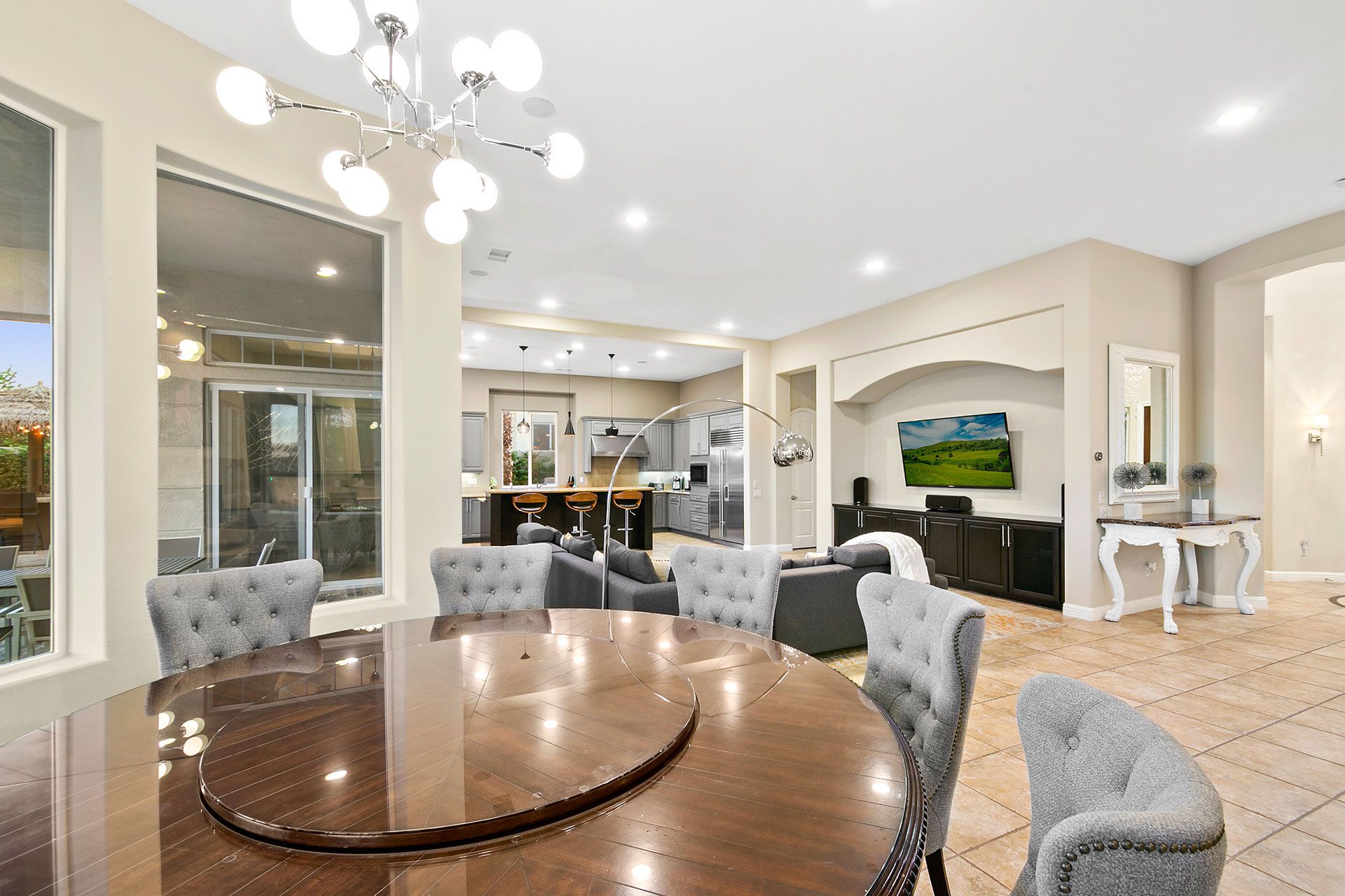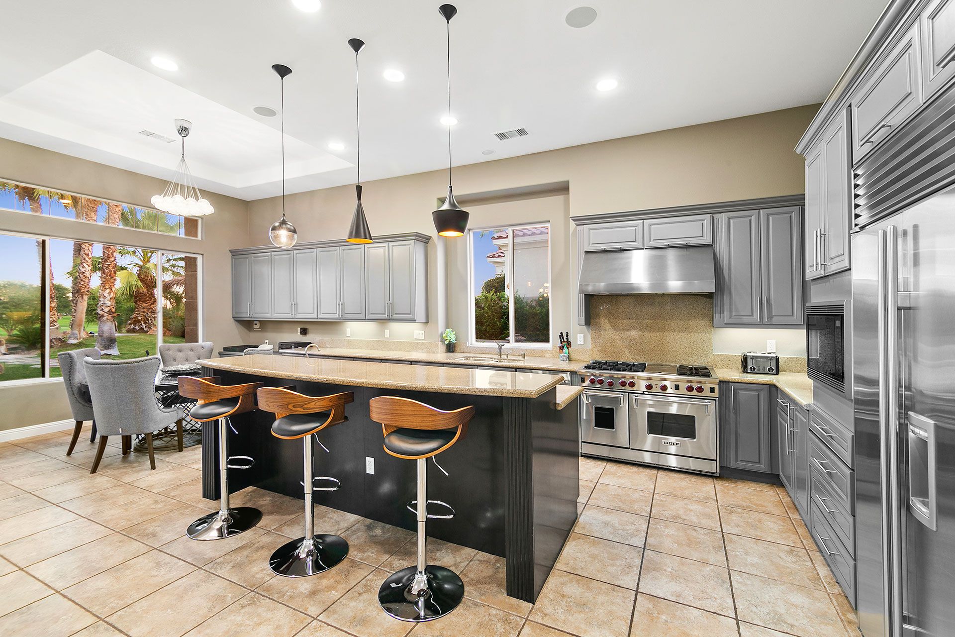 Situated on a golf course, this expansive home boasts sweeping views of the fairway and the Santa Rosa Mountain range – both of which you’ll be appreciating a lot given the incredible outdoor area here. Dive into the saltwater infinity pool to break from the heat, then soak your muscles in the Jacuzzi. Read your book under the refreshing spritz of the misting system with a margarita in hand (yep, there’s a Signature Margarita Machine). Sit by the fire pit, turn up the grill or simply relax on a lounger – this home’s a poolside wonderland. Inside, you’ll find an open-plan living area where both functional and playful spaces blend together. Challenge a friend to a game of pool or poker while the chef of the group makes use of the incredibly well-equipped kitchen – with a blender, food processor, rice cooker, deep fryer and pizza stone, any kind of cuisine can be on the menu. When it’s time to sleep, the bedrooms boast luxury linens and plenty of space for sprawling out. While there’s so much to do at the house, if you fancy going out you'll find golf courses, restaurants and shopping all around the area. Plus, for adventurous hikers or nature lovers, Joshua Tree National Park is only forty-five minutes away by car.