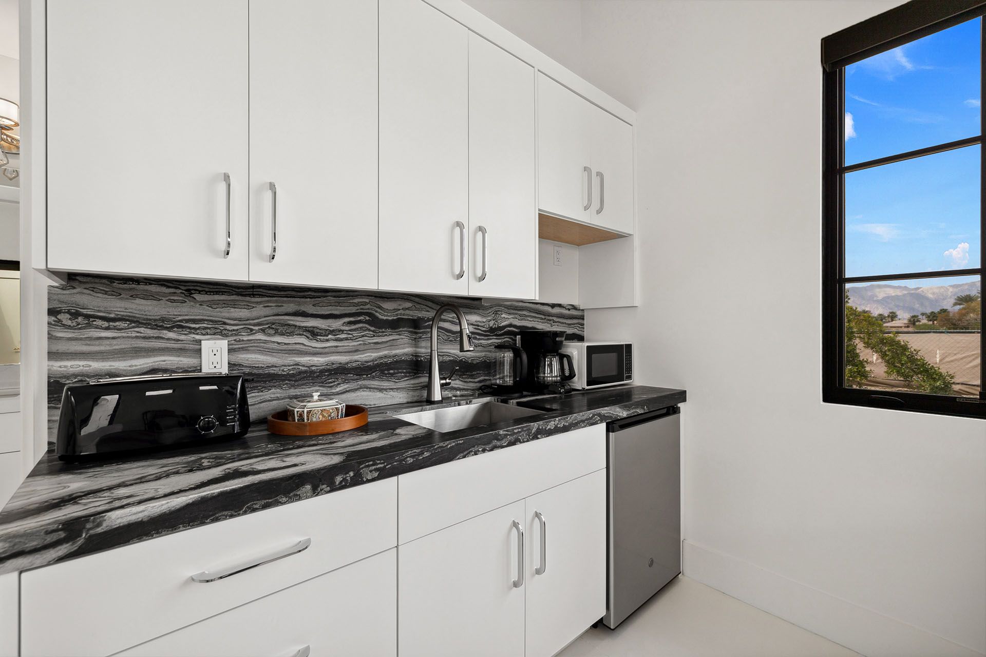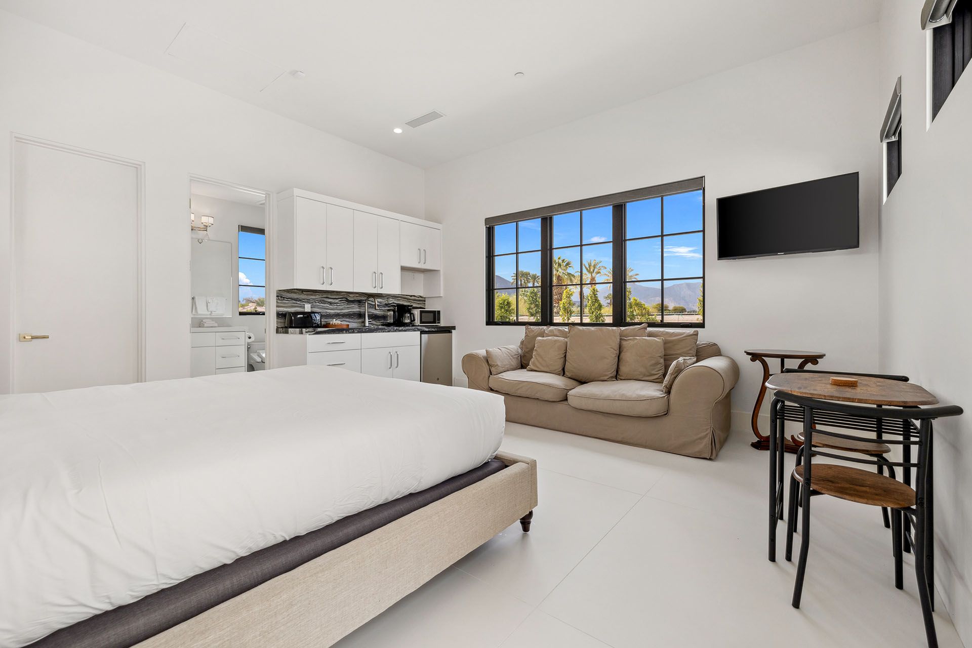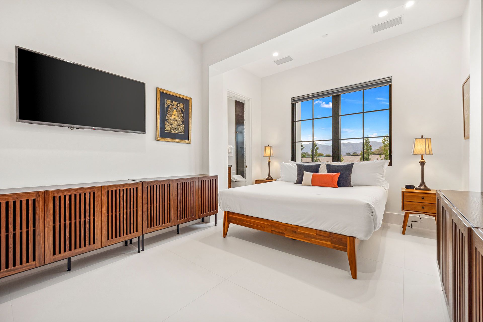 Who needs Coachella when you have this swanky home to settle into? But if you’re here for the festival, you’re moments from the iconic Coachella grounds. Epitomising desert luxury, it feels more like adult camp, with five en-suite bedrooms – including a self-contained guest house – and amenities galore, from a home cinema and tennis court to a pool with a jacuzzi. Inside, everything is sleek and ready to entertain, with an open-flow design blurring the line between indoors and out. Outside, you have over two and a half acres to soak up desert life and stargaze at night. Beyond the grounds, Palm Springs is just a thirty-minute drive away, with Joshua Tree National Park a little further.