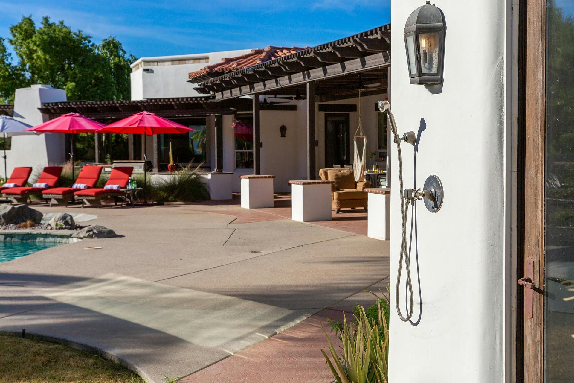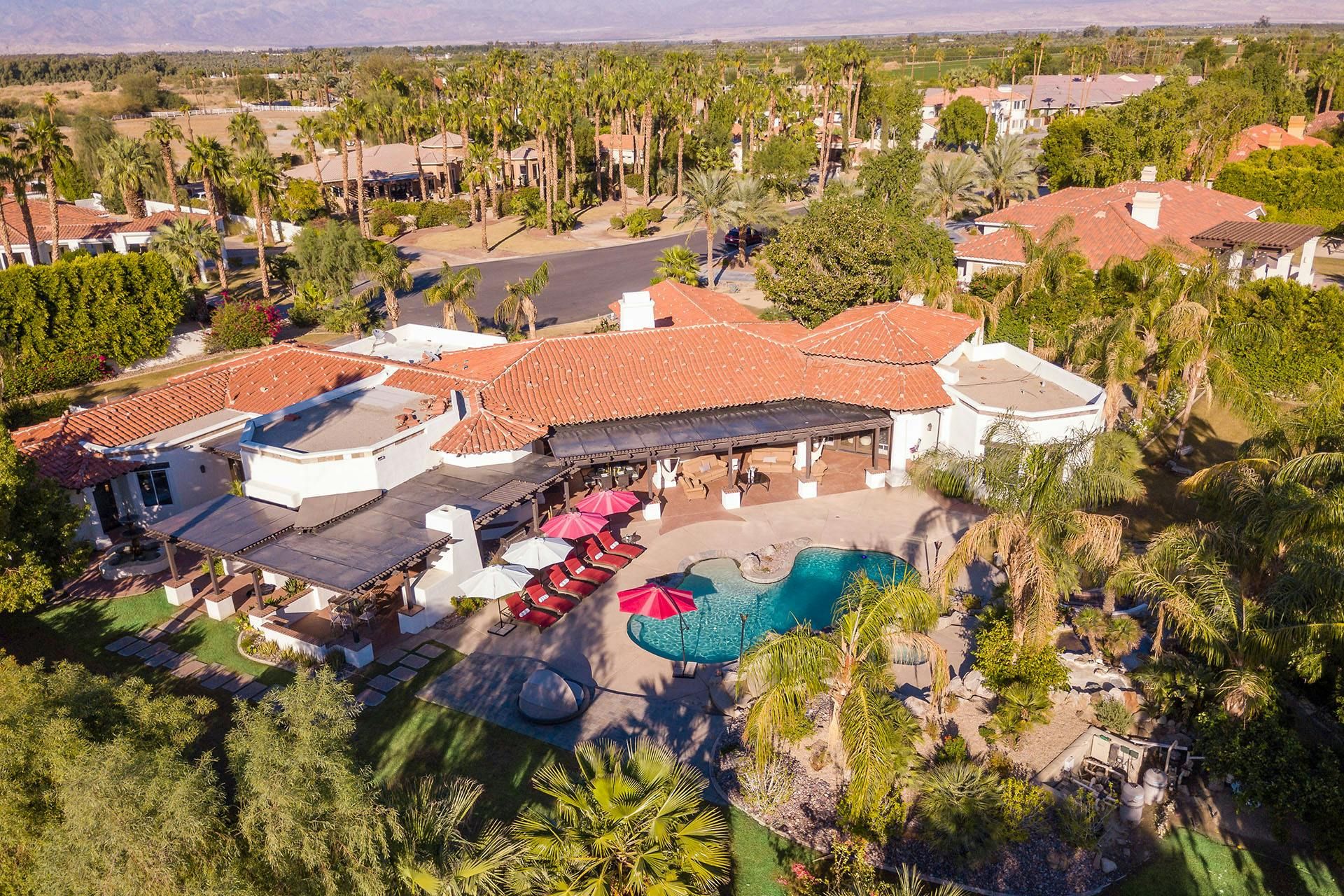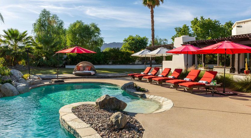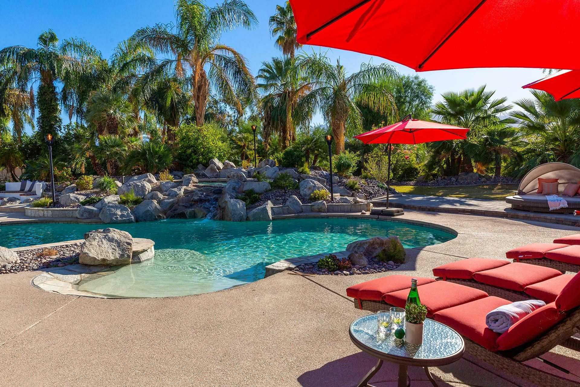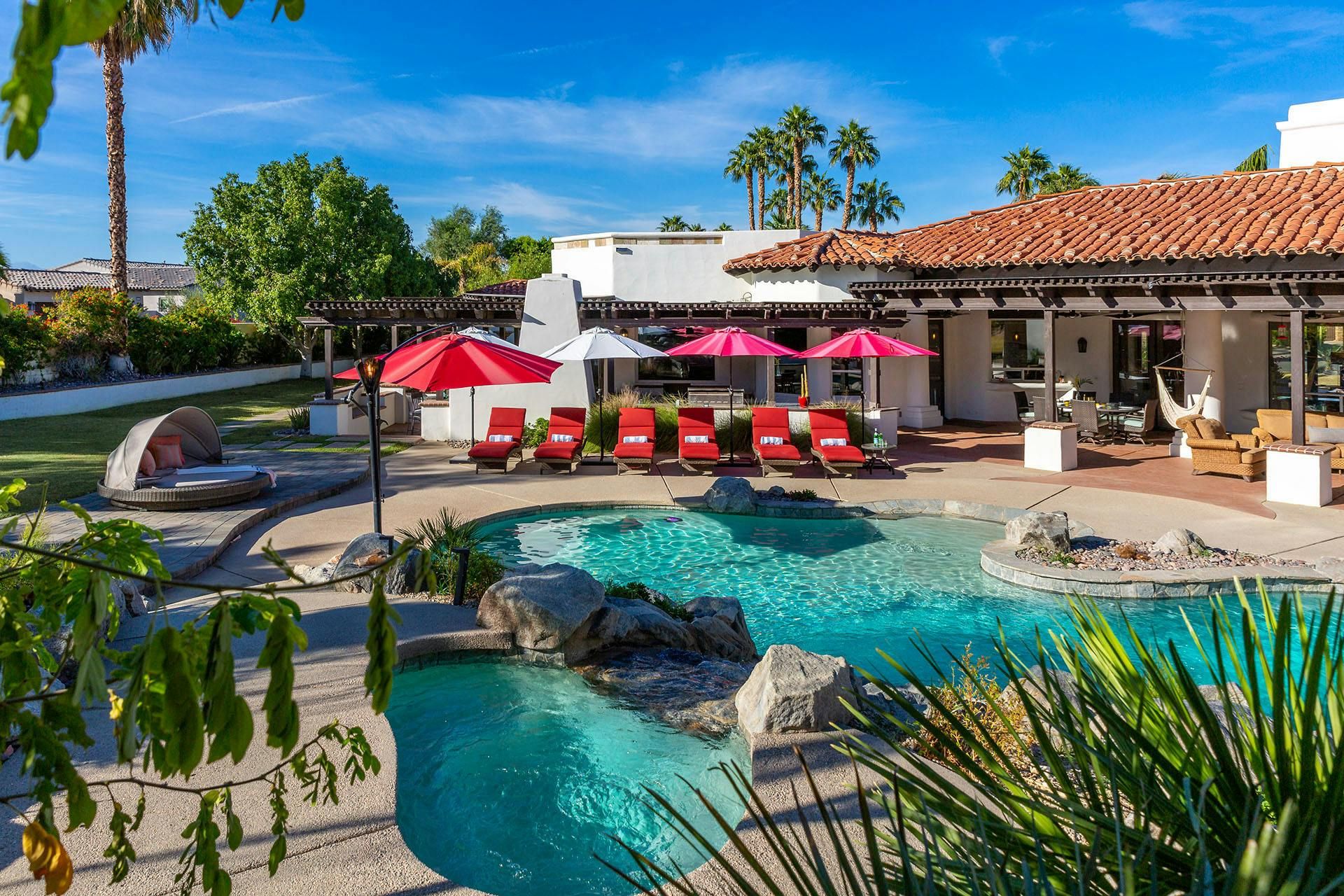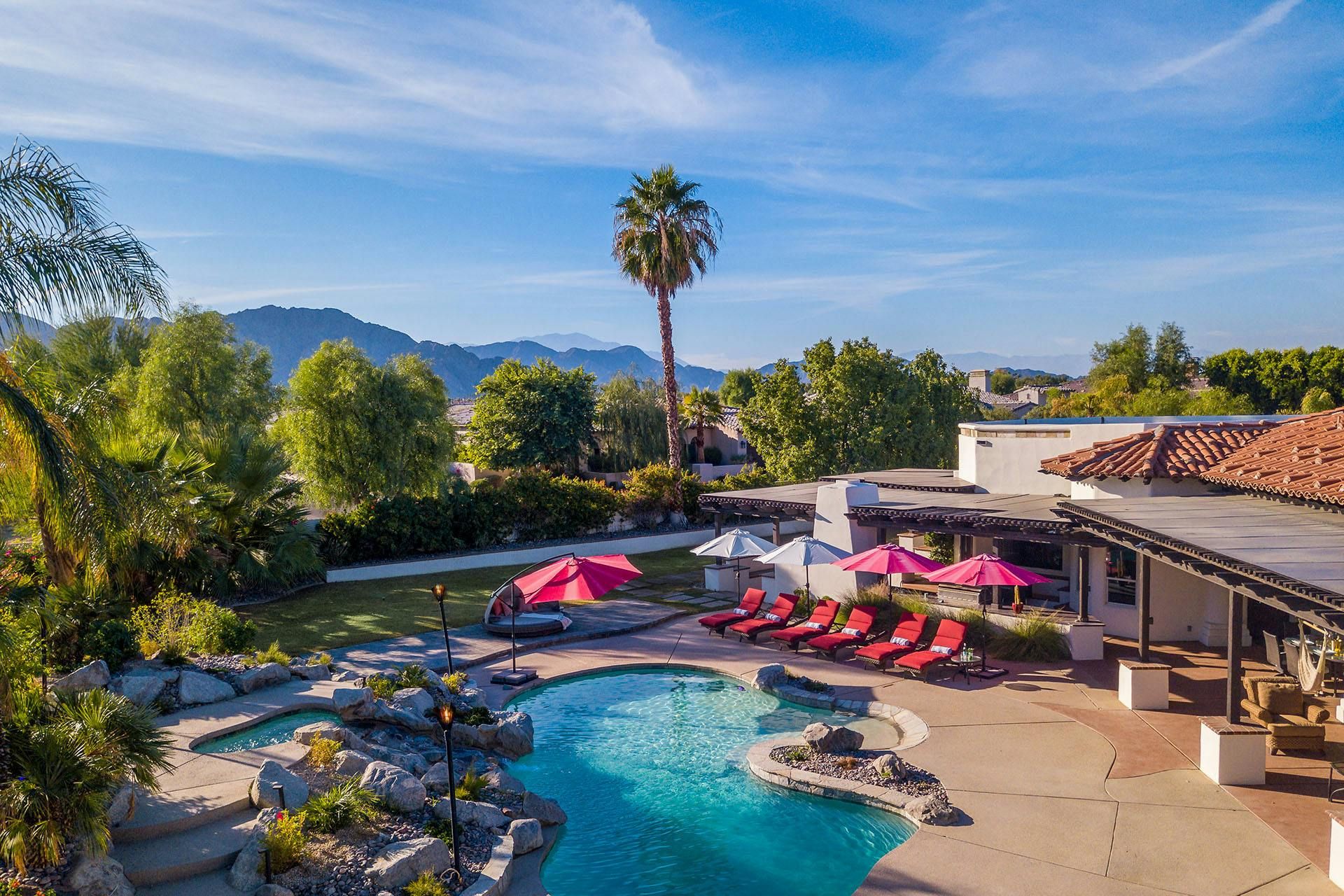 Fringed by mountains, this La Quinta villa captures the spirit of desert living at its most indulgent. Spend sun-drenched days floating in the lagoon-style pool, surrounded by palms and citrus trees, complete with a mini waterfall, two built-in barbecues and a misting system to keep you cool. There are three bedrooms in the main house, while a separate two-bedroom casita offers privacy for friends or family. Beyond the gates, you’ll find world-class golf courses, hiking trails through the Santa Rosa Mountains, and the boutiques and restaurants of Old Town La Quinta — with Palm Springs just a thirty-minute drive away.
