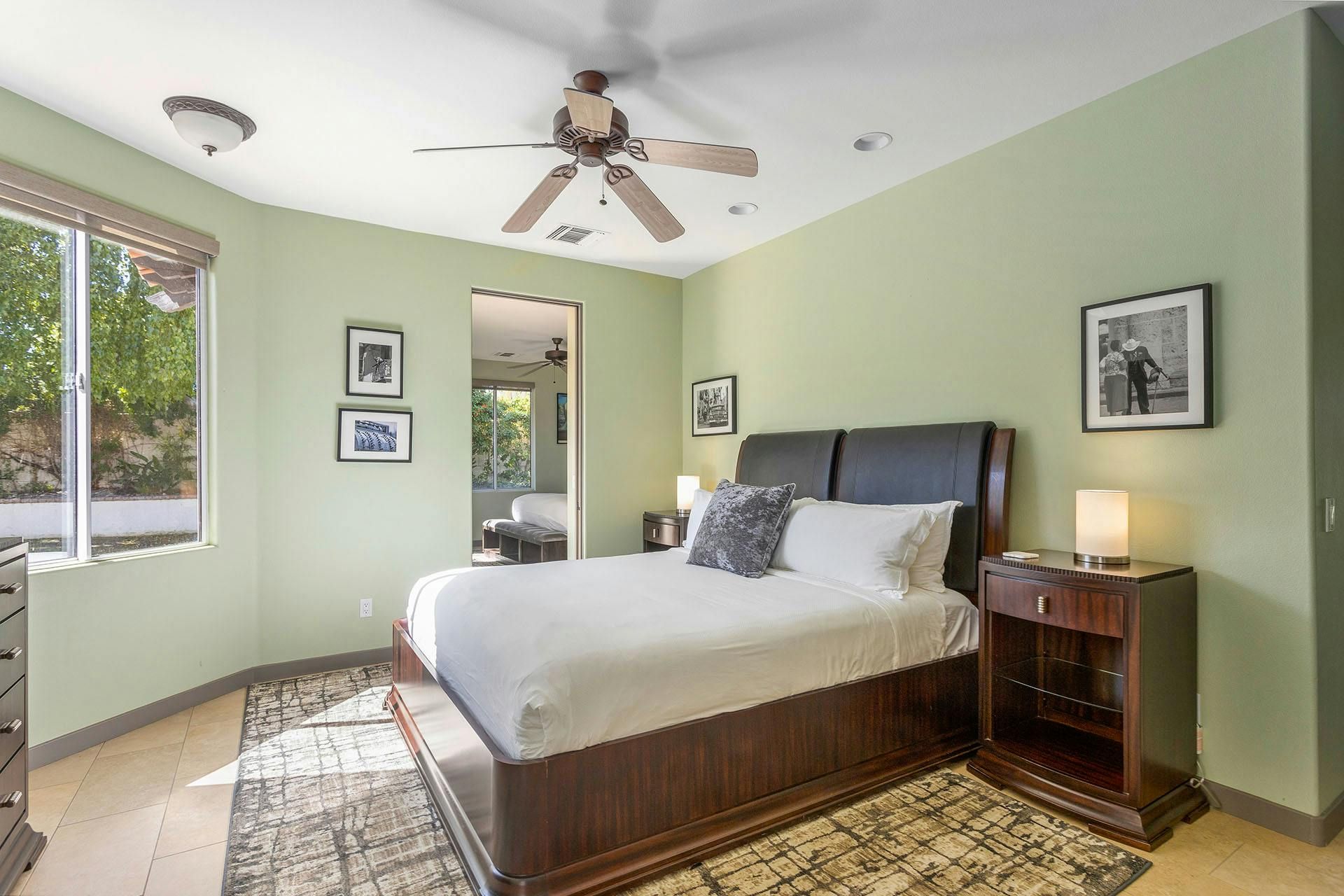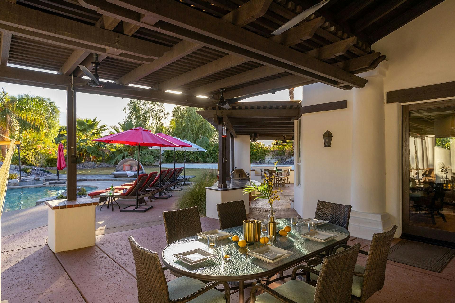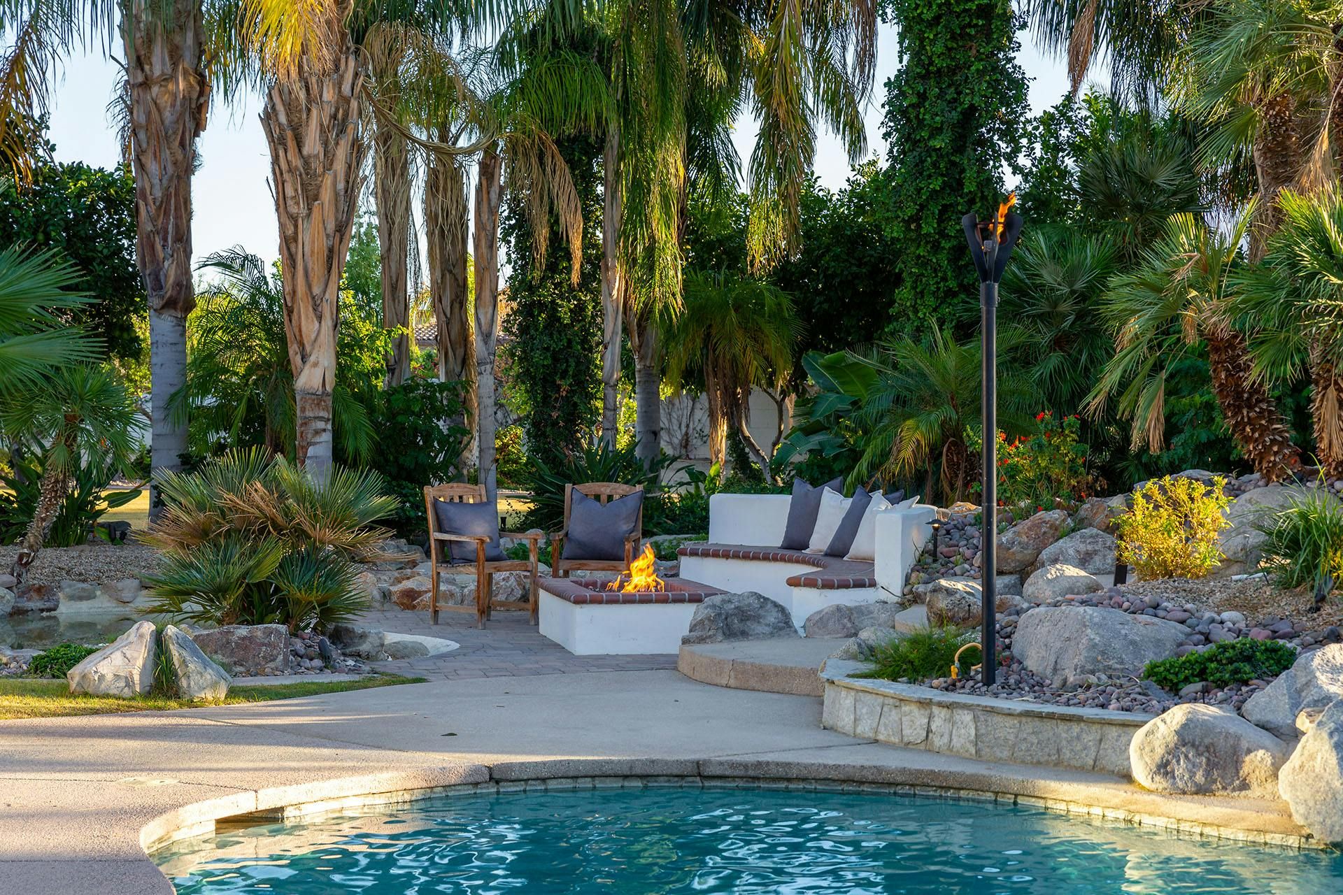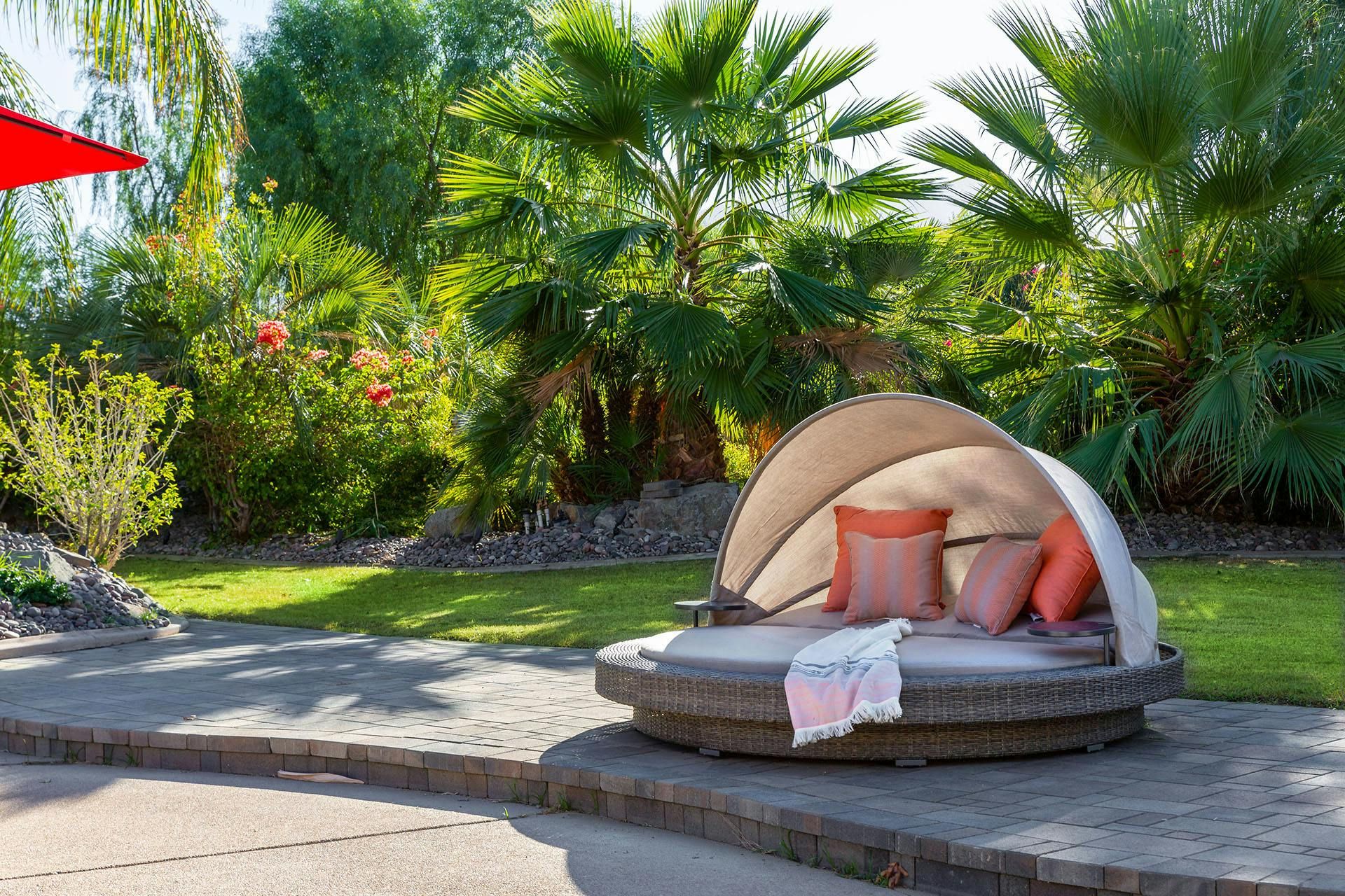 Fringed by mountains, this La Quinta villa captures the spirit of desert living at its most indulgent. Spend sun-drenched days floating in the lagoon-style pool, surrounded by palms and citrus trees, complete with a mini waterfall, two built-in barbecues and a misting system to keep you cool. There are three bedrooms in the main house, while a separate two-bedroom casita offers privacy for friends or family. Beyond the gates, you’ll find world-class golf courses, hiking trails through the Santa Rosa Mountains, and the boutiques and restaurants of Old Town La Quinta — with Palm Springs just a thirty-minute drive away.