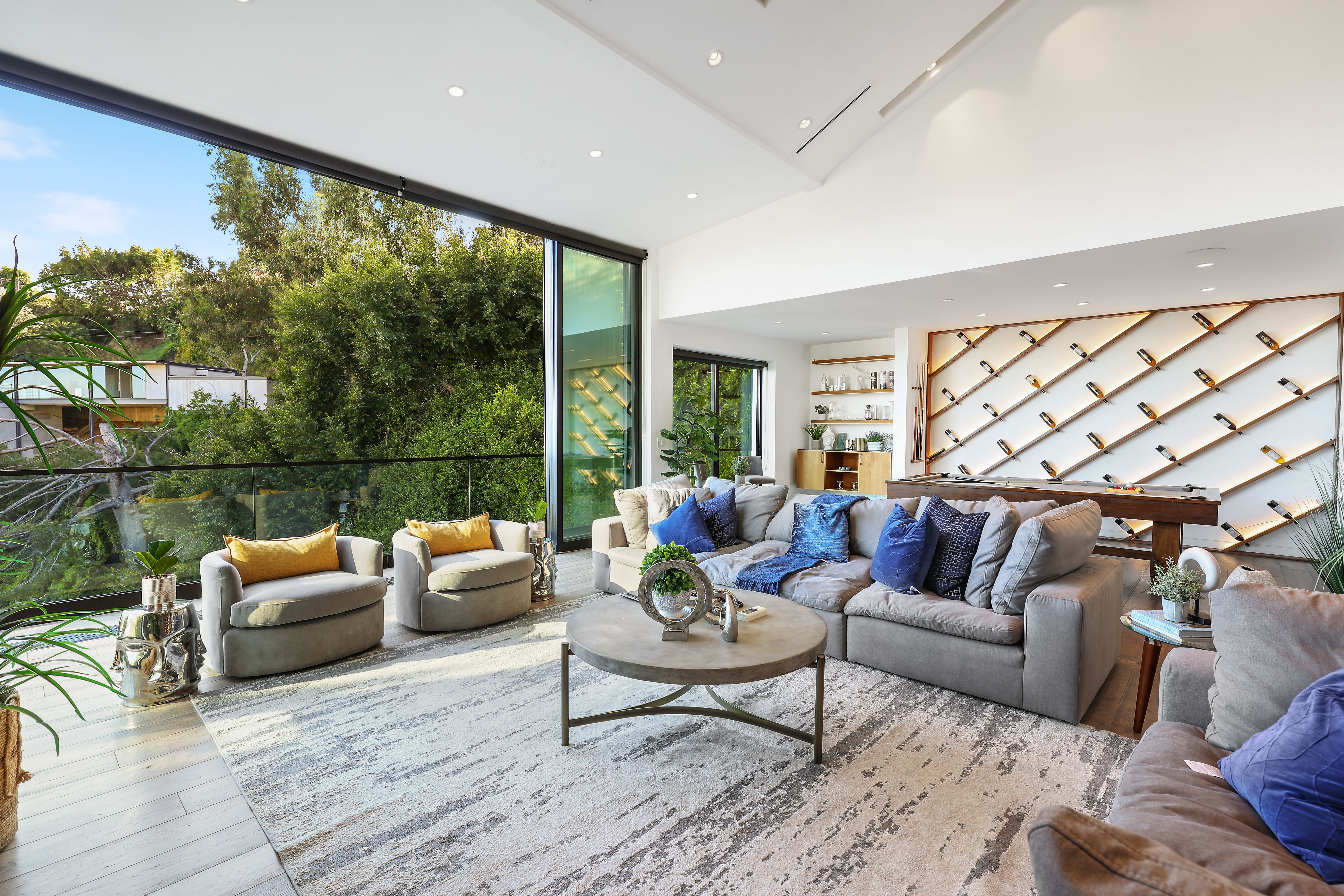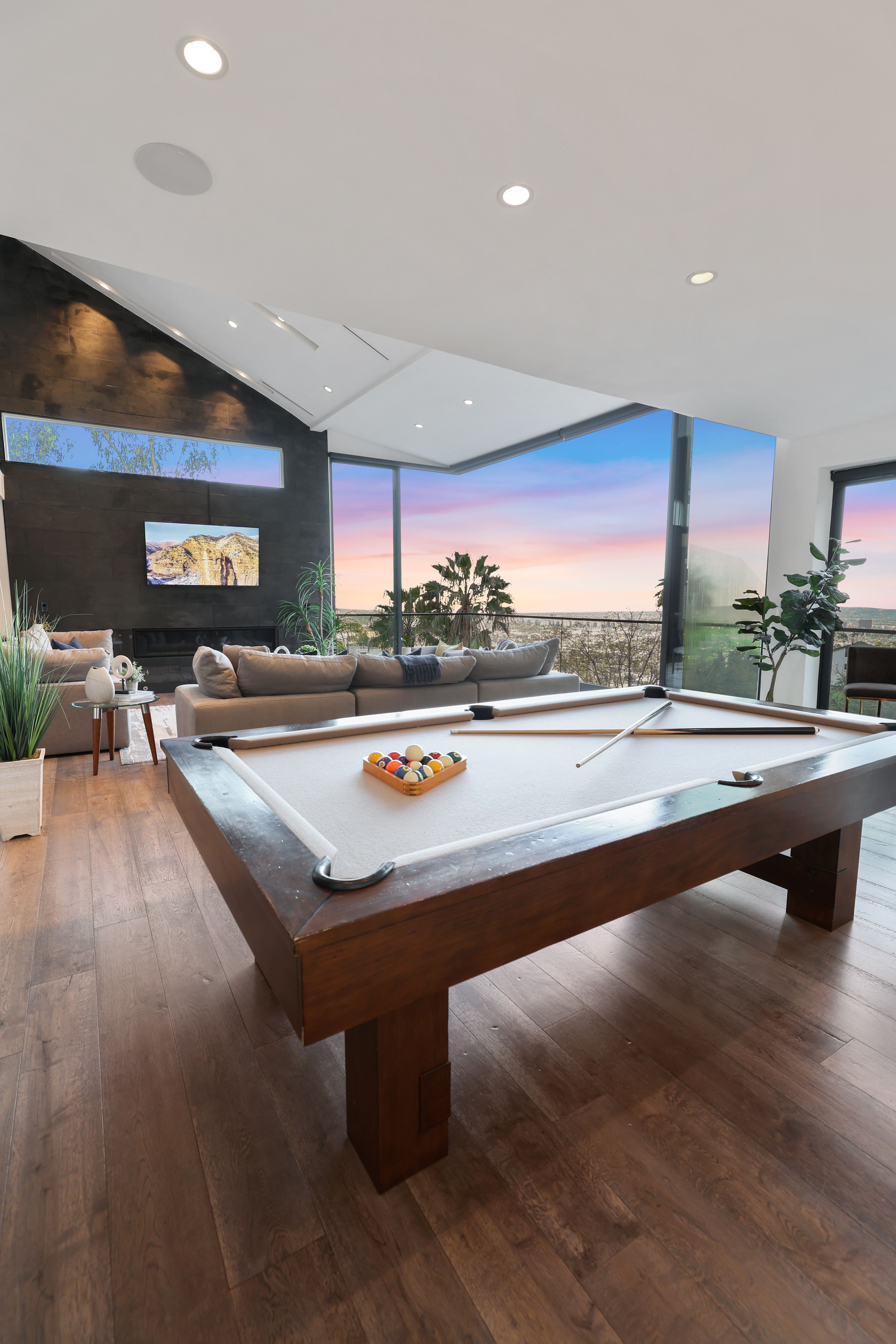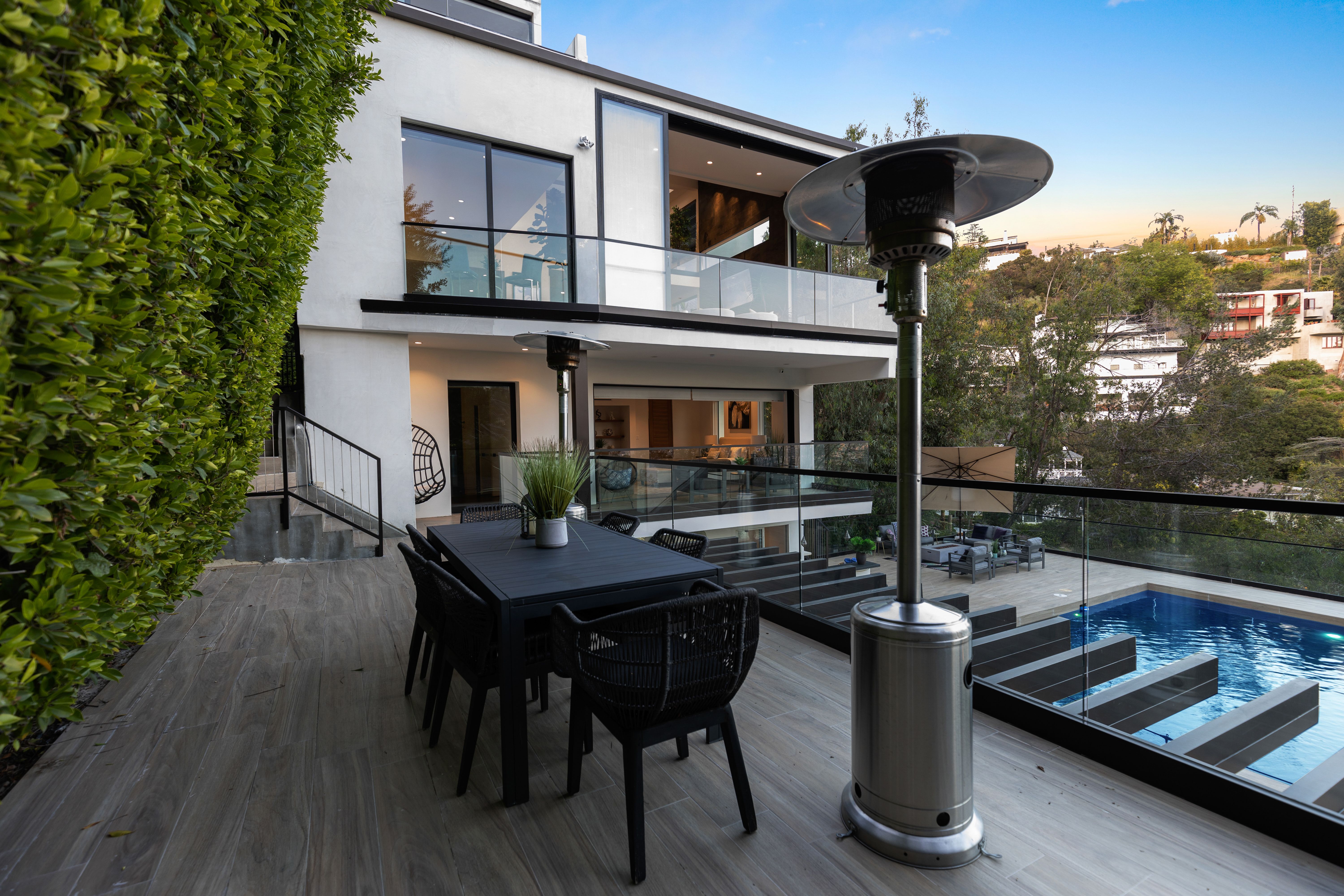Set above the Sunset Strip, this modern three-story estate showcases imitable style. This bold and innovative home displays unmatched quality and attention to detail throughout the open living space with its custom wine wall, a bespoke kitchen and a billiards table. On the backside of the house, walls of glass vanish into thin air, offering phenomenal indoor-outdoor living while showing off those breathtaking city views. Enter the grand master suite complete with a private balcony, sitting area, and a walk-in wardrobe. While no one will be left disappointed with the standard of the secondary bedrooms. The en-suite bathrooms exude a feeling of luxury with custom wooden cabinets, walk-in showers, and a free-standing tub. Step outside and take in those awe-inspiring city vistas from the dining terrace, pool and spa area – we promise they never get old. Leave the secluded haven of your hillside home and you can be in the heart of the action in no time at all. You're perfectly positioned to enjoy the vibrant melting pot that is West Hollywood, the raucous nightlife of Sunset Strip and the chic boutiques of Rodeo Drive – all within a ten-minute drive.