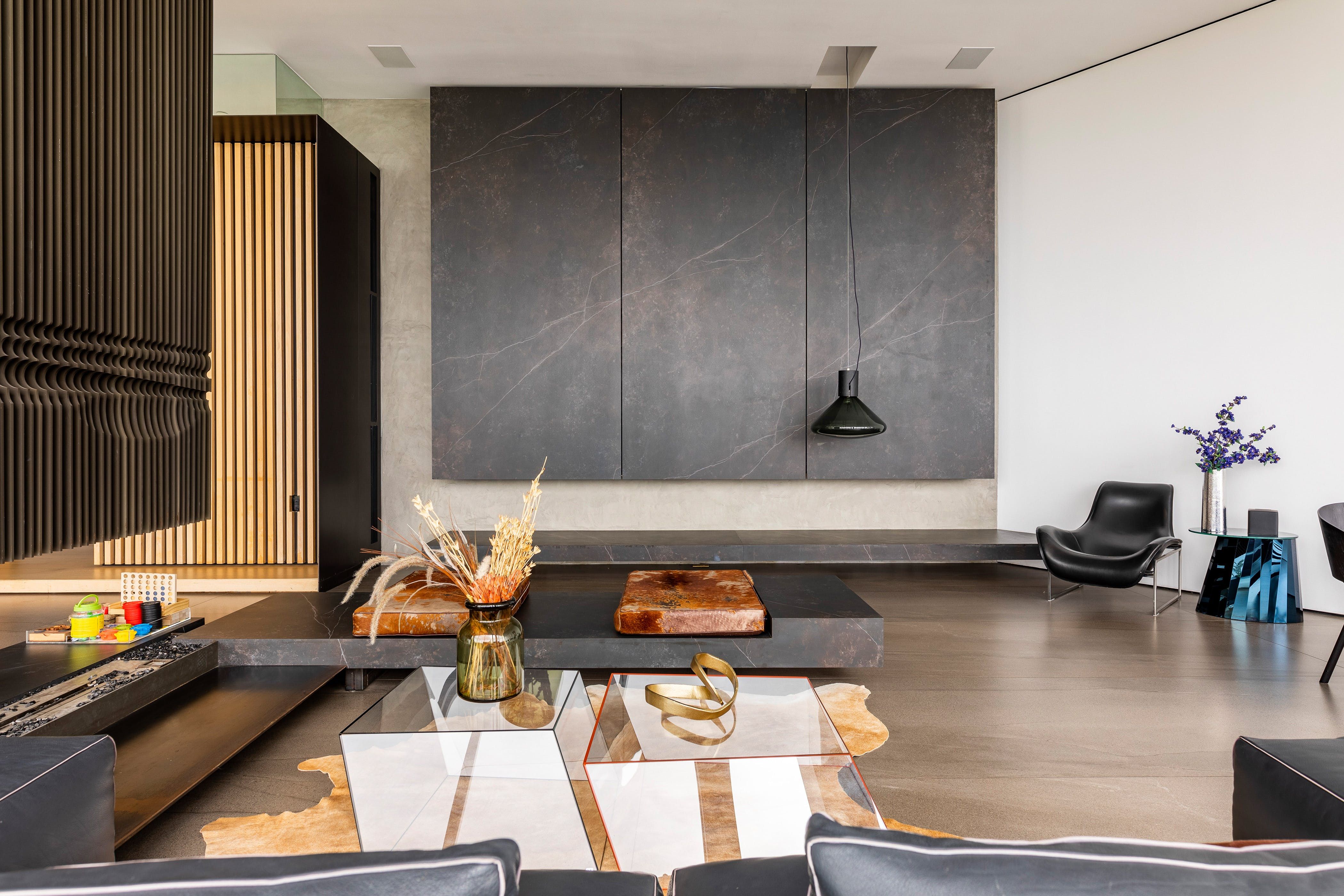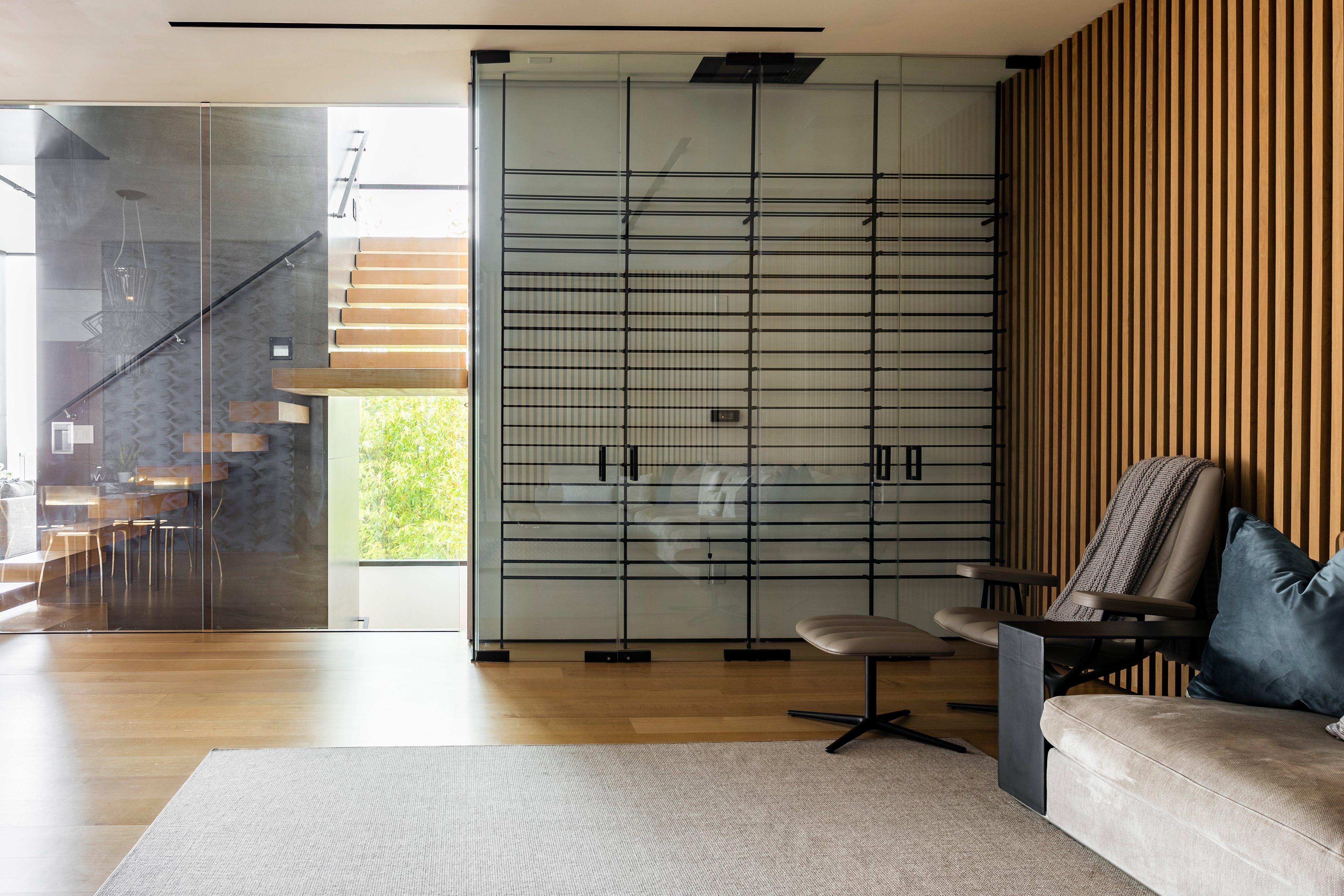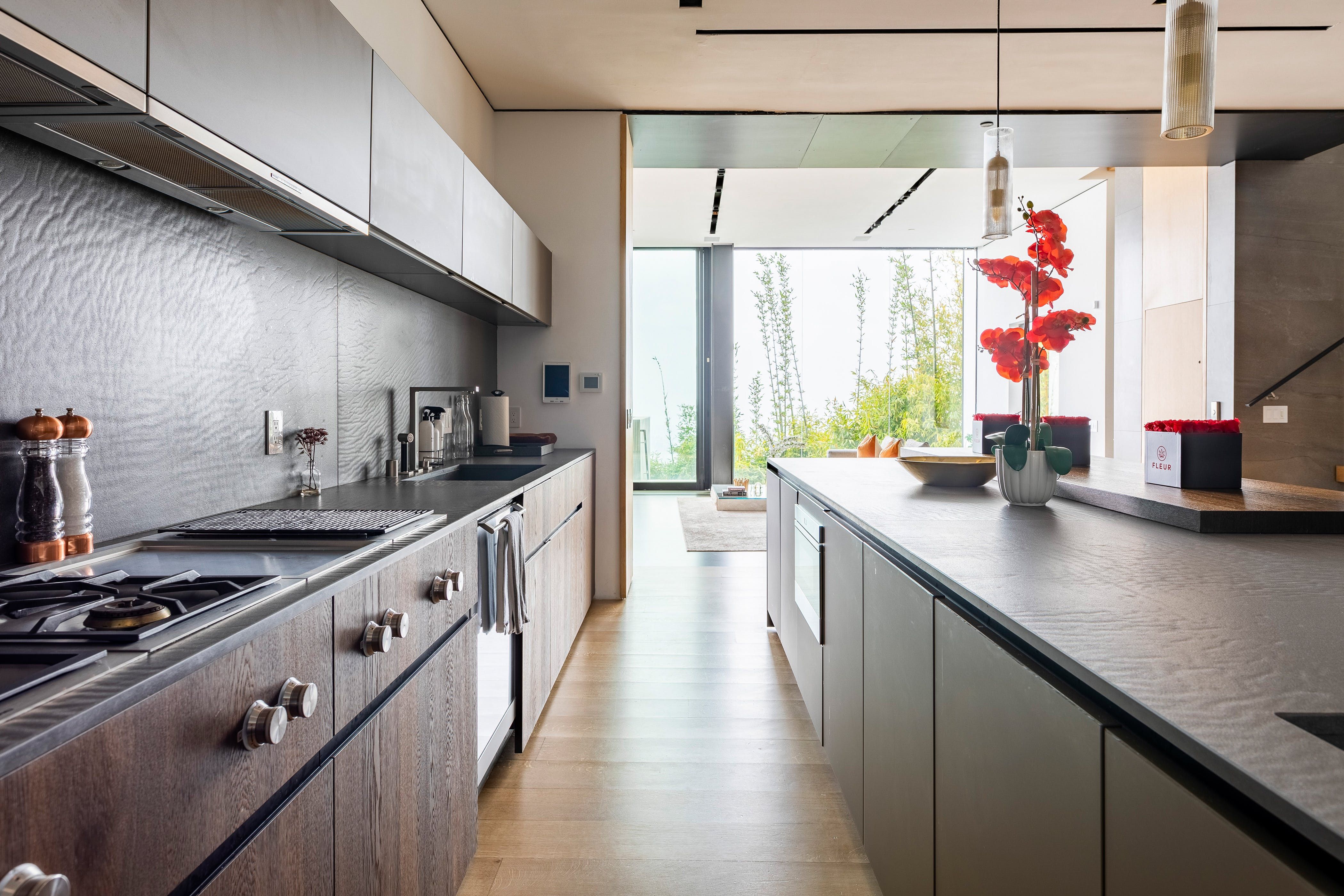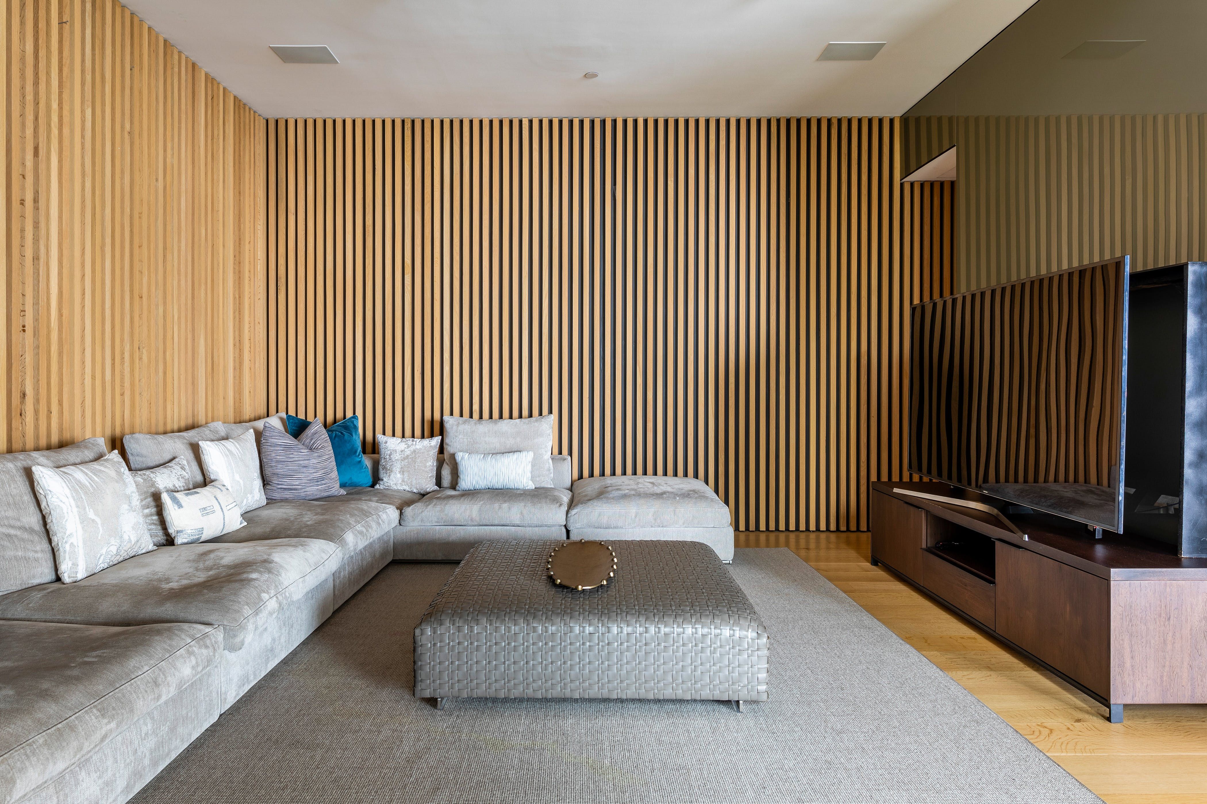 Inside, it’s sleek, open-plan and feels as though the living area was designed for lavish entertainment. A suspended fireplace in the living room draws the eye if you’re not too busy gazing at the view from floor-to-ceiling windows. We love the architectural details throughout – the sleek Scandi breakfast bar, floating lightwood staircase and raw wood room dividers. Then there’s the ultimate entertainment area with a home-cinema set-up and a wall of wine bottles for a plush evening in.