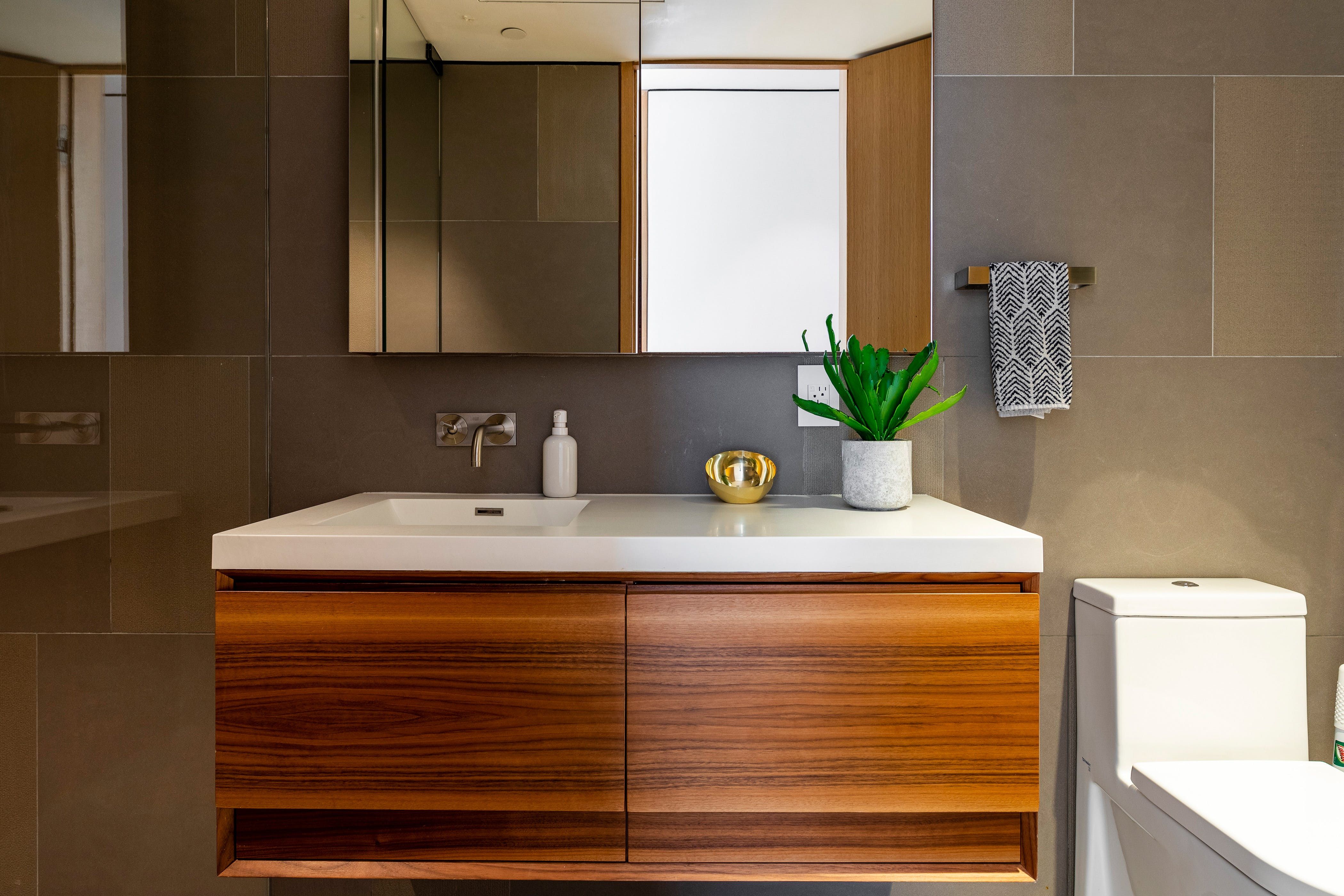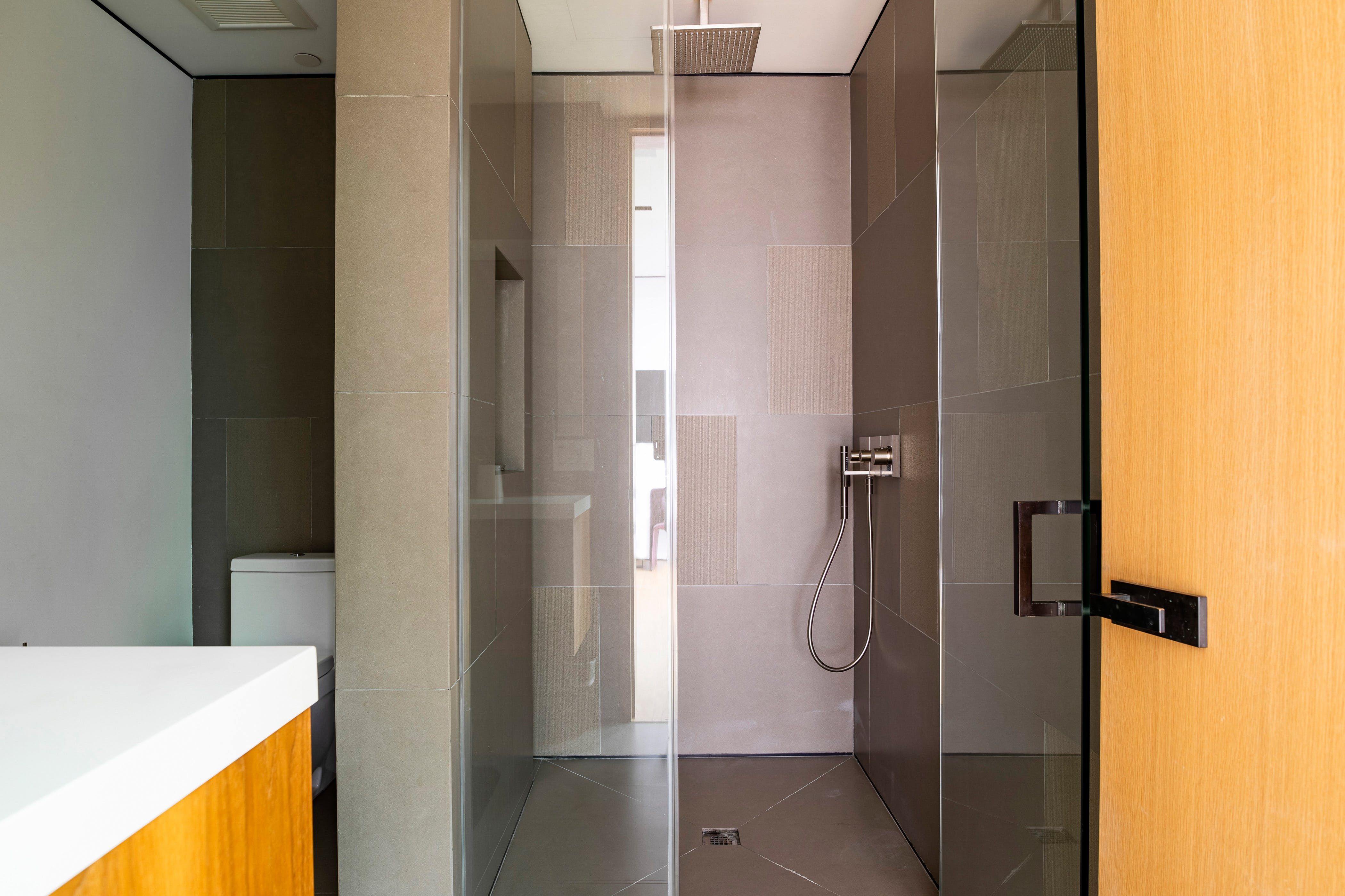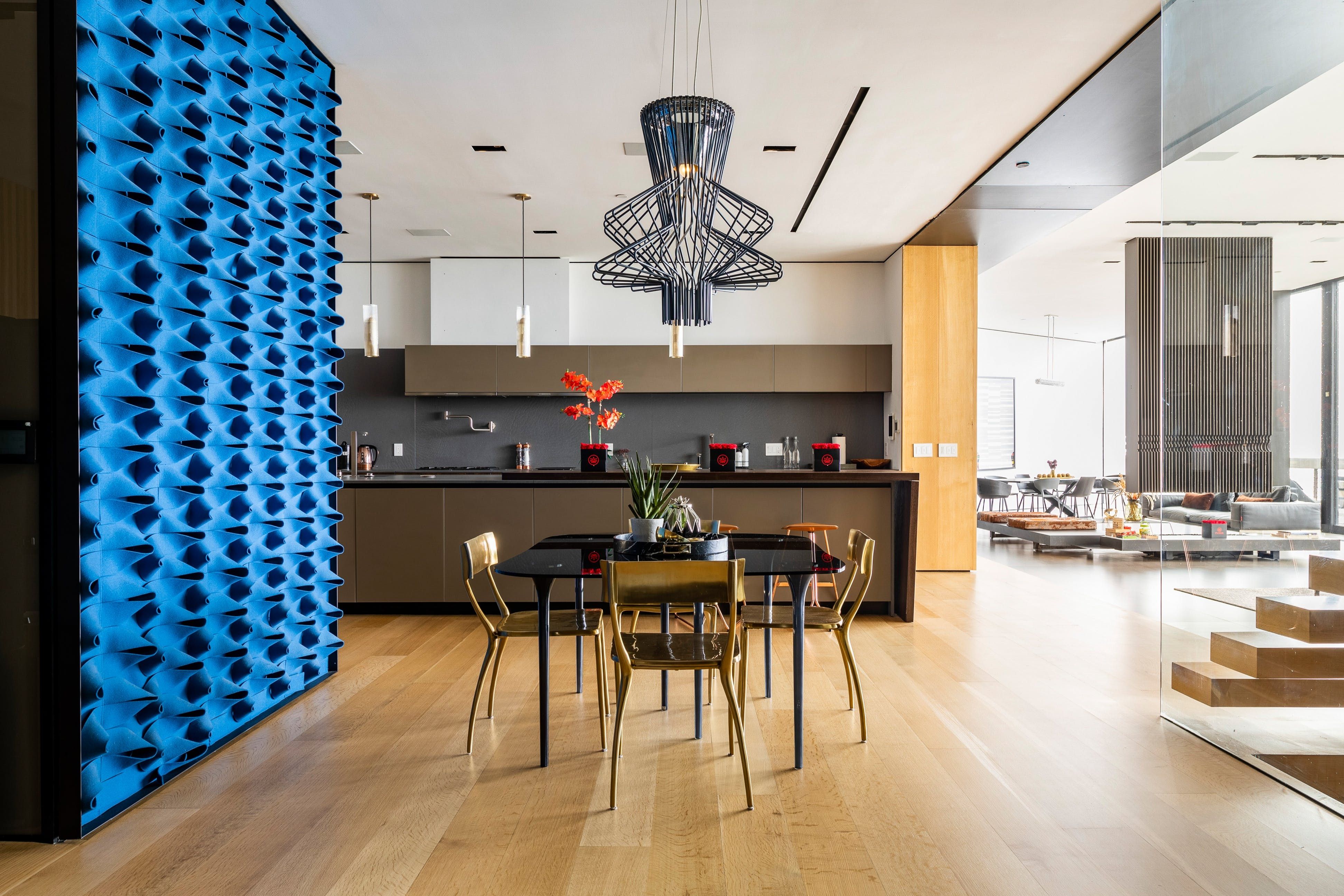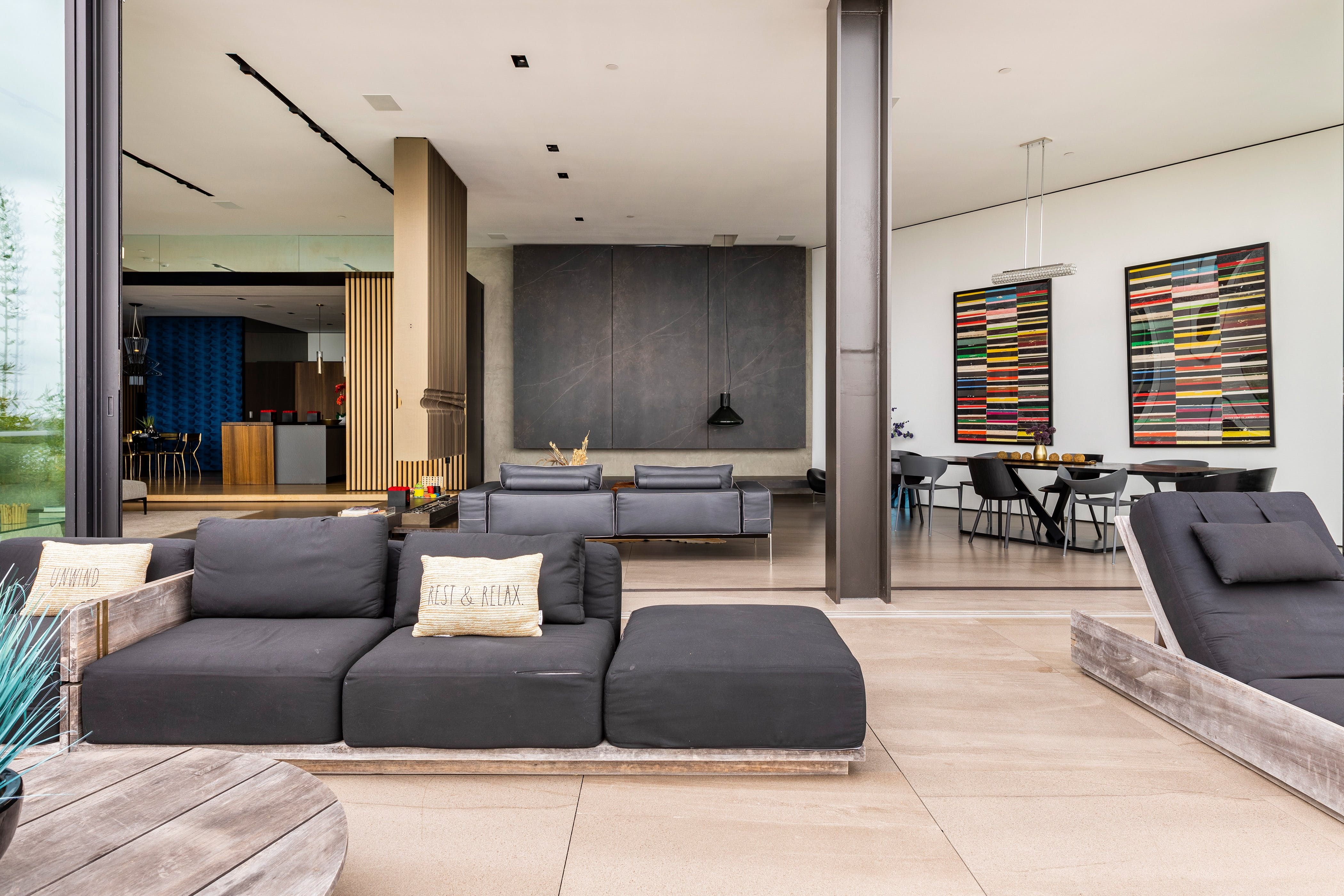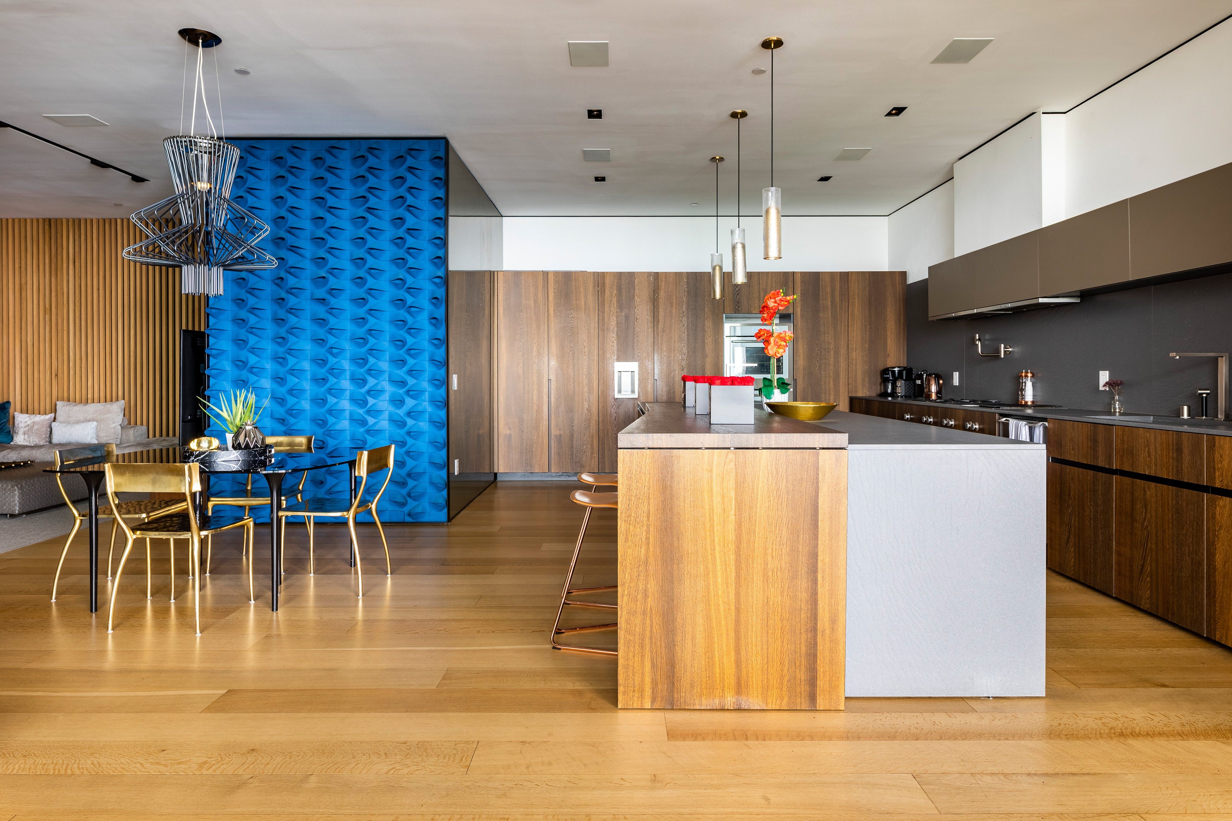 Inside, it’s sleek, open-plan and feels as though the living area was designed for lavish entertainment. A suspended fireplace in the living room draws the eye if you’re not too busy gazing at the view from floor-to-ceiling windows. We love the architectural details throughout – the sleek Scandi breakfast bar, floating lightwood staircase and raw wood room dividers. Then there’s the ultimate entertainment area with a home-cinema set-up and a wall of wine bottles for a plush evening in.