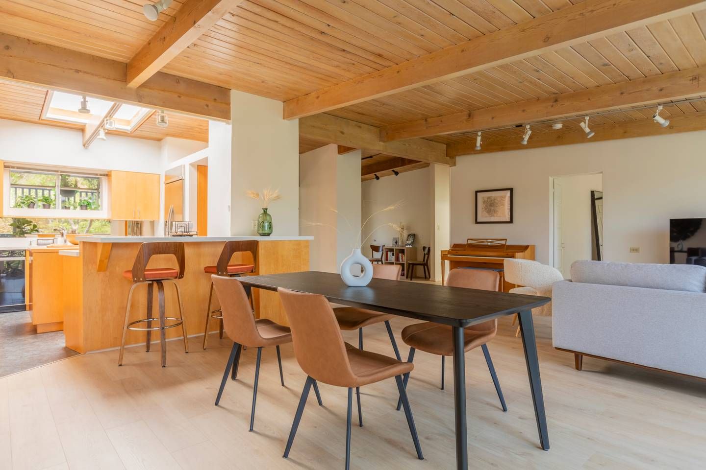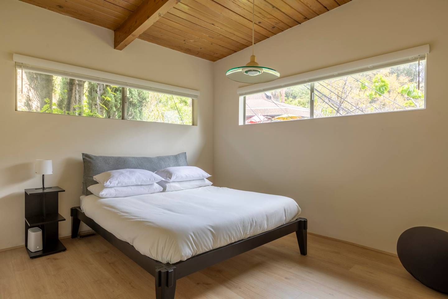 Nestled in the heart of the Hollywood Hills, this enchanting home feels like a treetop oasis. It offers a tranquil escape from the hustle and bustle of Los Angeles and allows you to experience a different side of Hollywood. Enjoy the scenery and hiking trails of nearby Griffith Park, or drive ten minutes to the Lake Hollywood Reservoir Trail. If you find yourself longing for classic LA glitz and glamour, you need only drive fifteen minutes to Sunset Boulevard. This home is warm and welcoming, with an open-plan layout and mid-century style. Floor-to-ceiling windows showcase the leafy surroundings of this peaceful hideaway.