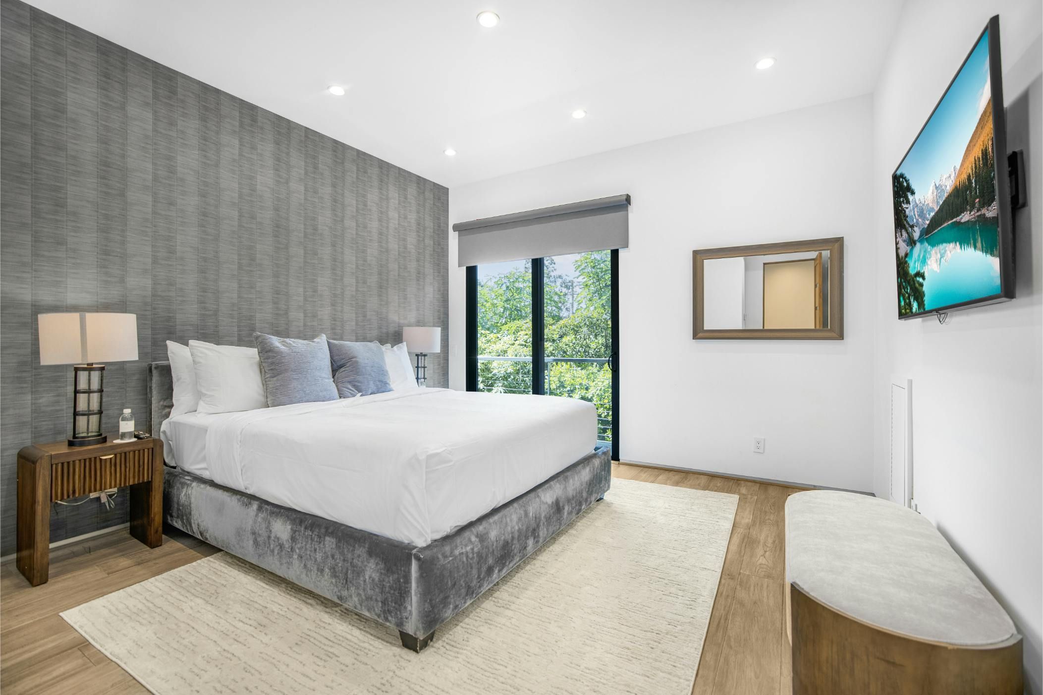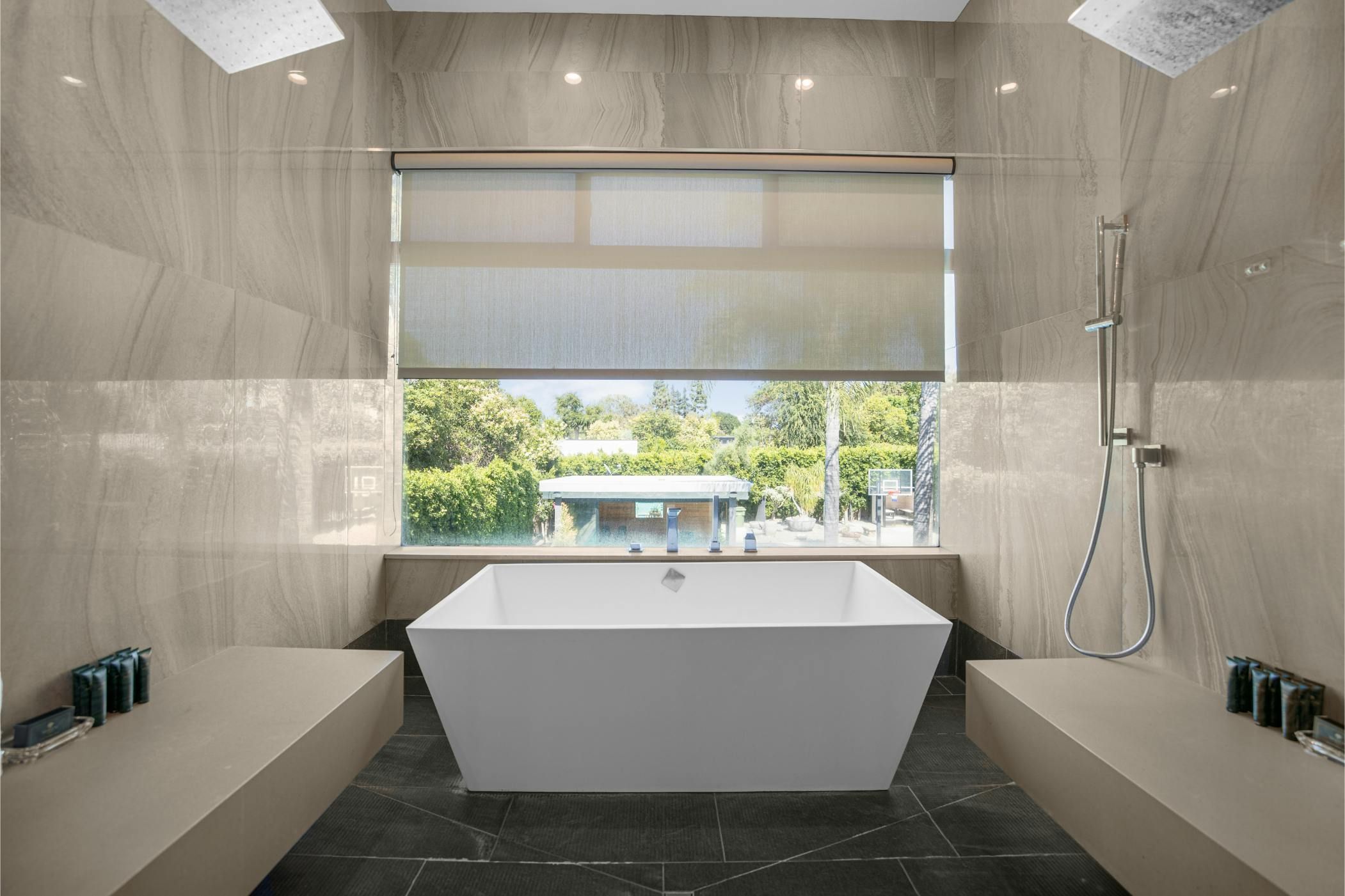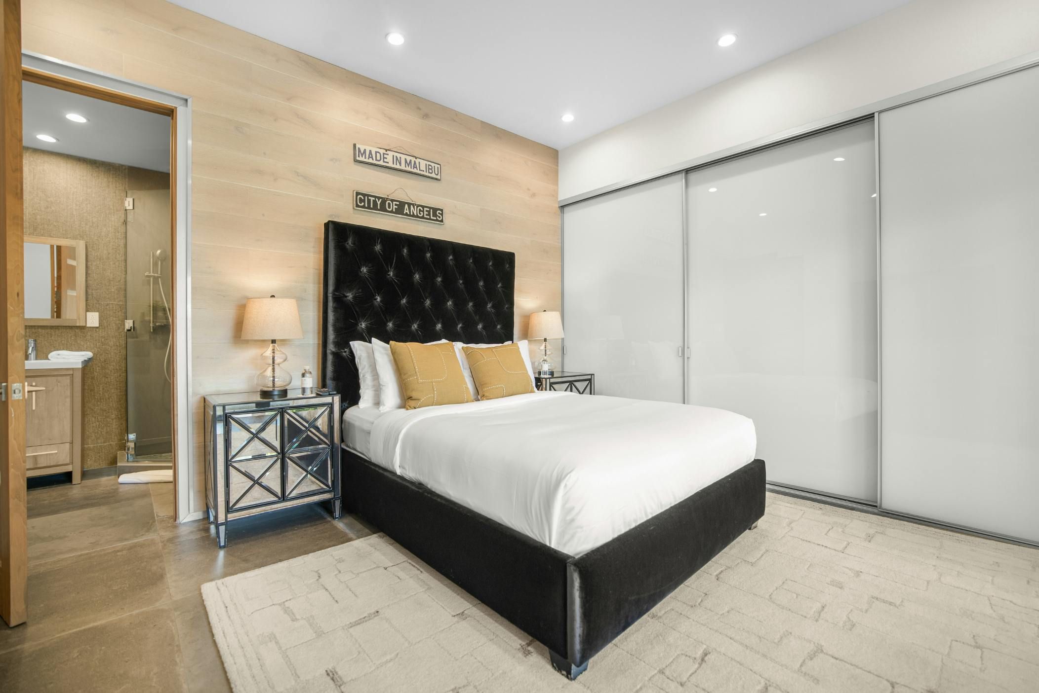 This LA home certainly has the wow factor. Perfect for a group getaway, the resort-style garden boasts a private pool, sauna, spa, cabana, barbecue station, and bar. And if you’re feeling active, the private gym, basketball net, and ping pong table await. While outside is well set up for outdoor living, inside has plenty to shout about too. Here you’ll find a choice of comfy seating areas, a high-end kitchen – your host can even arrange for a private chef to come and cook for you – and a main bedroom with a spa-style en-suite. For daytrips, the Getty Center is a ten-minute drive away, and Santa Monica Beach can be reached in twenty-two minutes.
