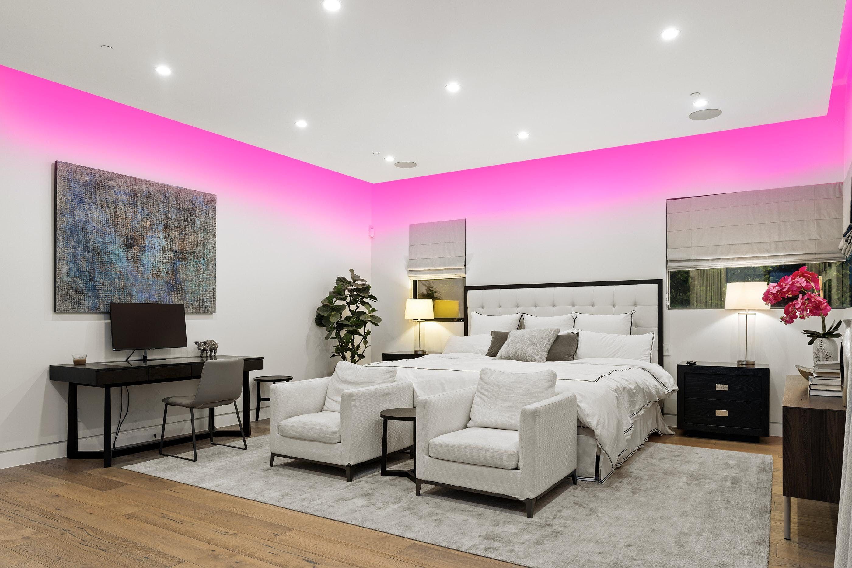 The kitchen flows seamlessly into the vast and contemporary living spaces, so you can float effortlessly between displaying your chef skills in the state-of-the-art kitchen to hosting an Instagram-worthy dinner next to the neon-blue-illuminated dining room. As the stars descend, there is a host of sundowner options that will compete for your attention – the combination pool and hot tub, the fire pit or the cabana lounge with a wide-screen TV.