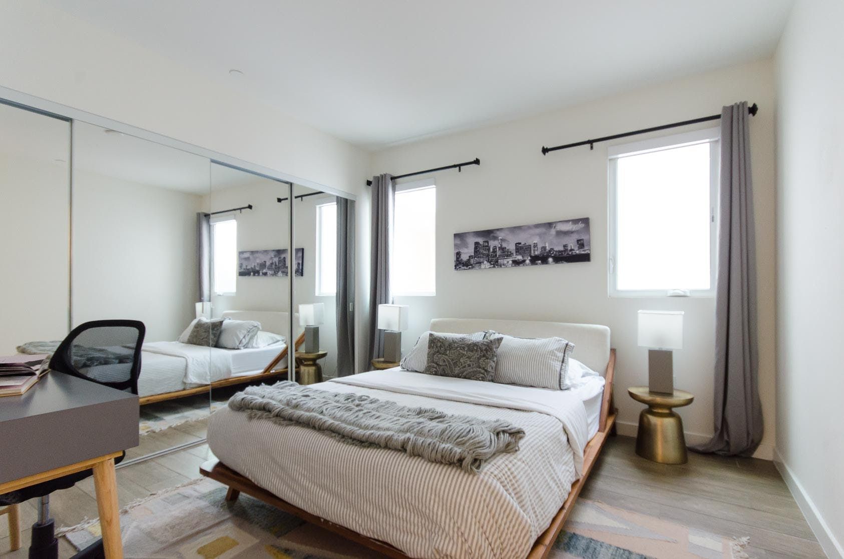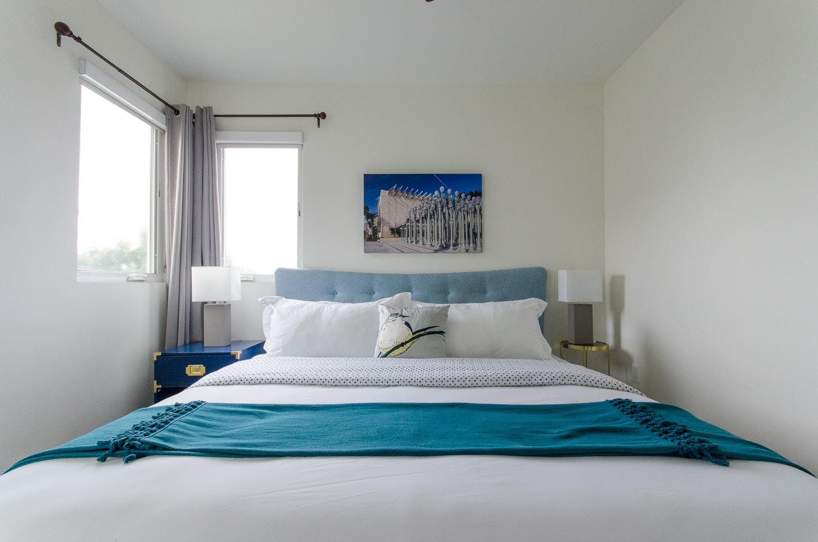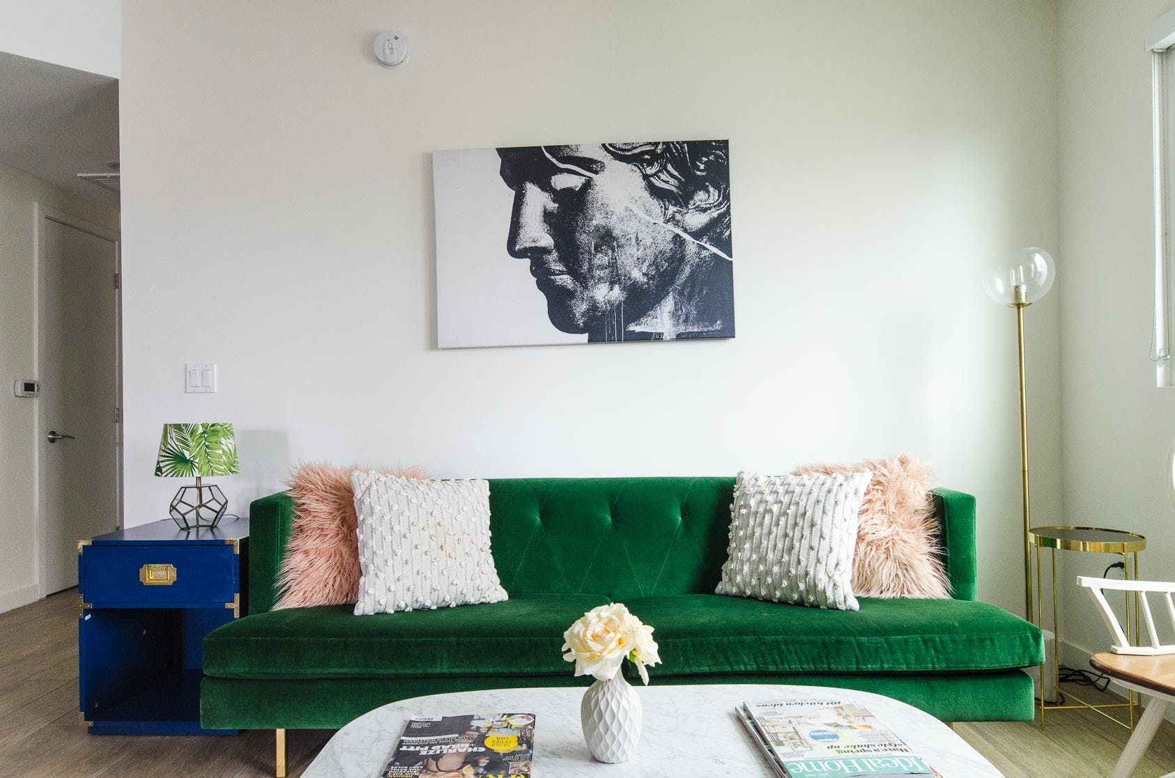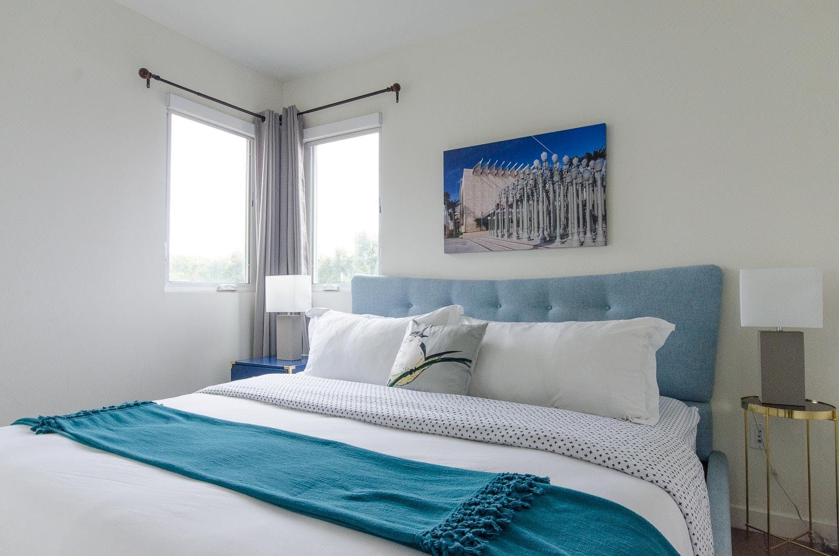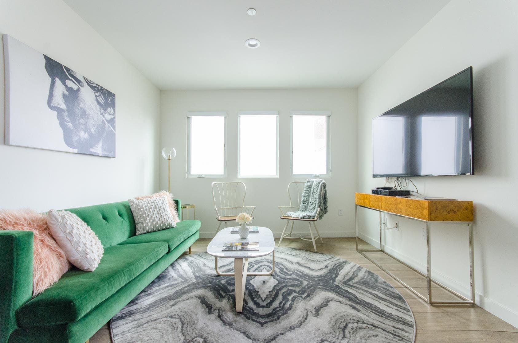 Welcome to a home with a playful and contemporary feel throughout, especially in the stylish living room, which features a striking green velvet sofa and a replica of Botticelli's Birth of Venus. The apartment has a more hotel-like feel and provides a well-maintained space with shared on-site amenities available for all building residents. Up on the shared rooftop deck, there are two barbecues, sun loungers and plenty of seating areas dotted around the building, which allow you to socialise or dine outside in the sunshine. The apartment itself ensures your creature comforts are catered for with its large modern kitchen, calming bedrooms and quality finishings in every room. If you're looking for a quiet but sociable spot in a desirable location with plenty of amenities to benefit from – then this is undoubtedly a solid choice. Located in the sought-after district of Miracle Mile in Los Angeles, you'll be just five minutes from the glamour of West Hollywood. And you'll be even closer to attractions such as the Los Angeles County Museum of Art as well as an array of fabulous eateries, boutiques and entertainment venues when staying in this part of town too.