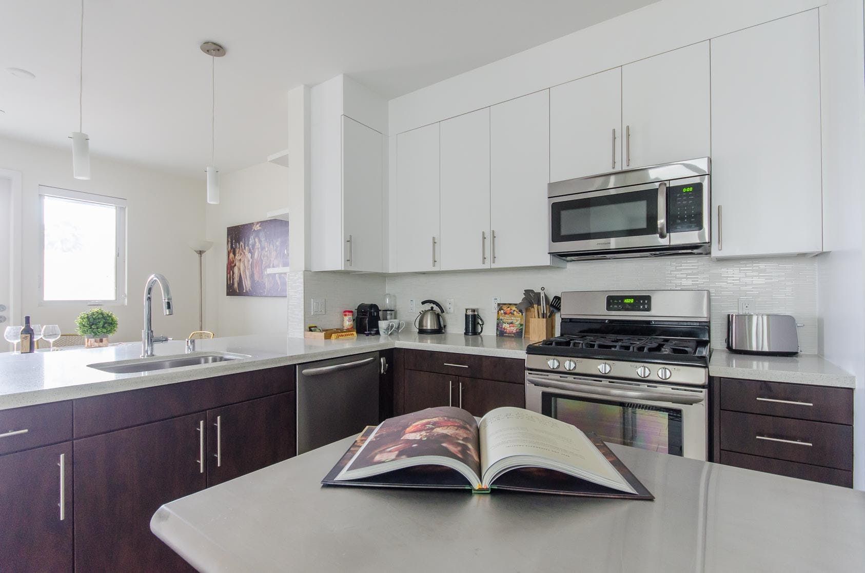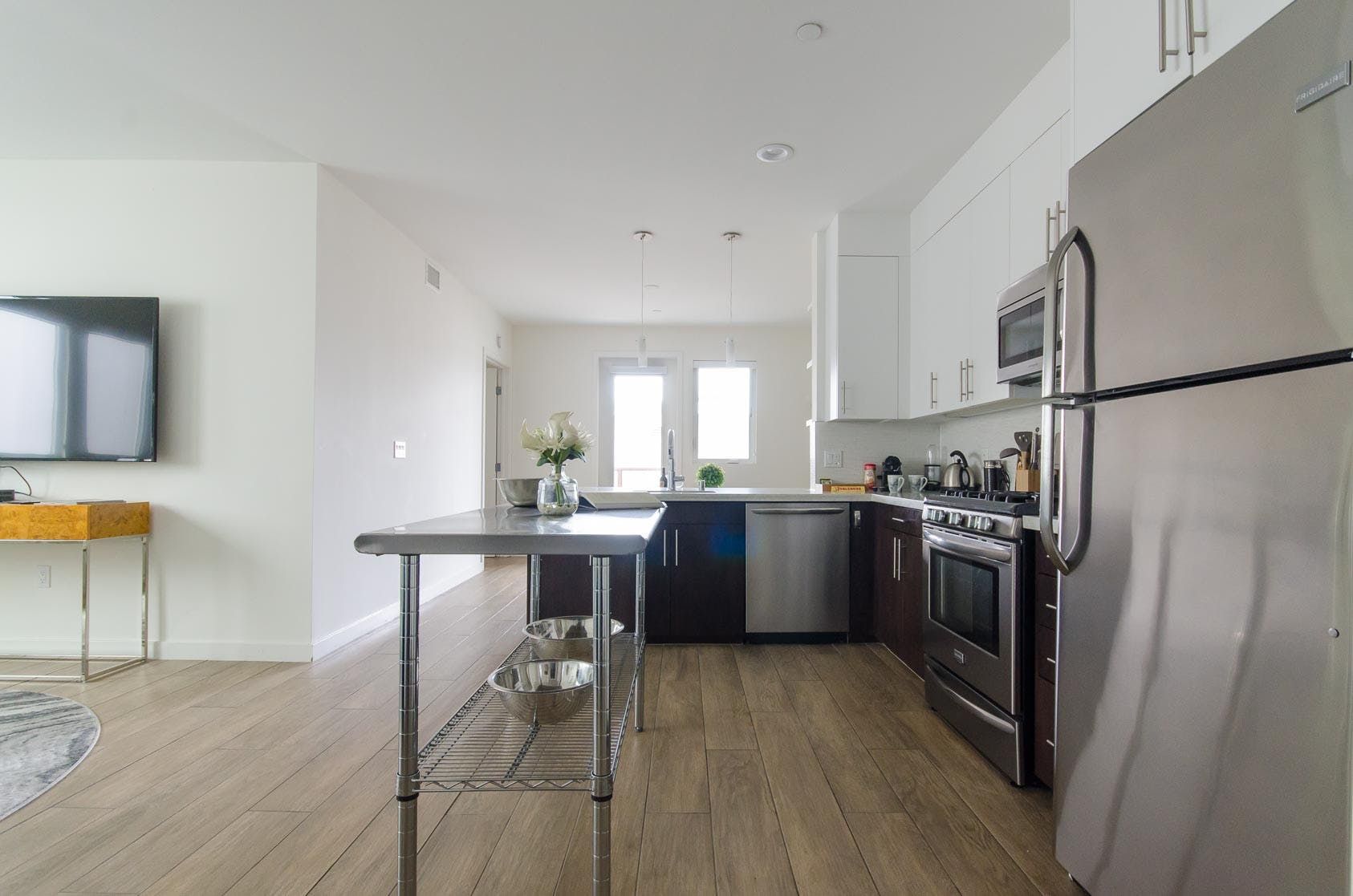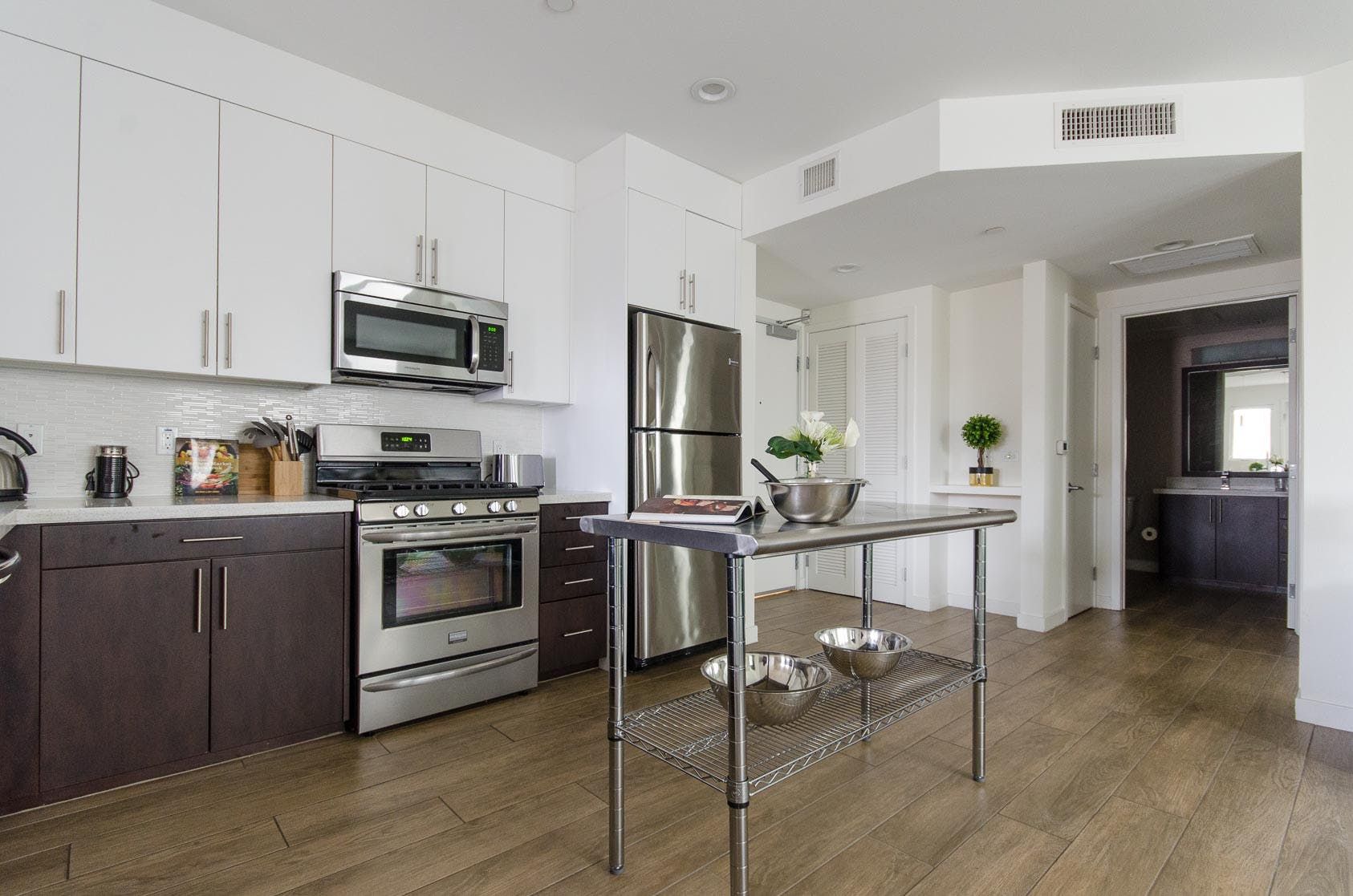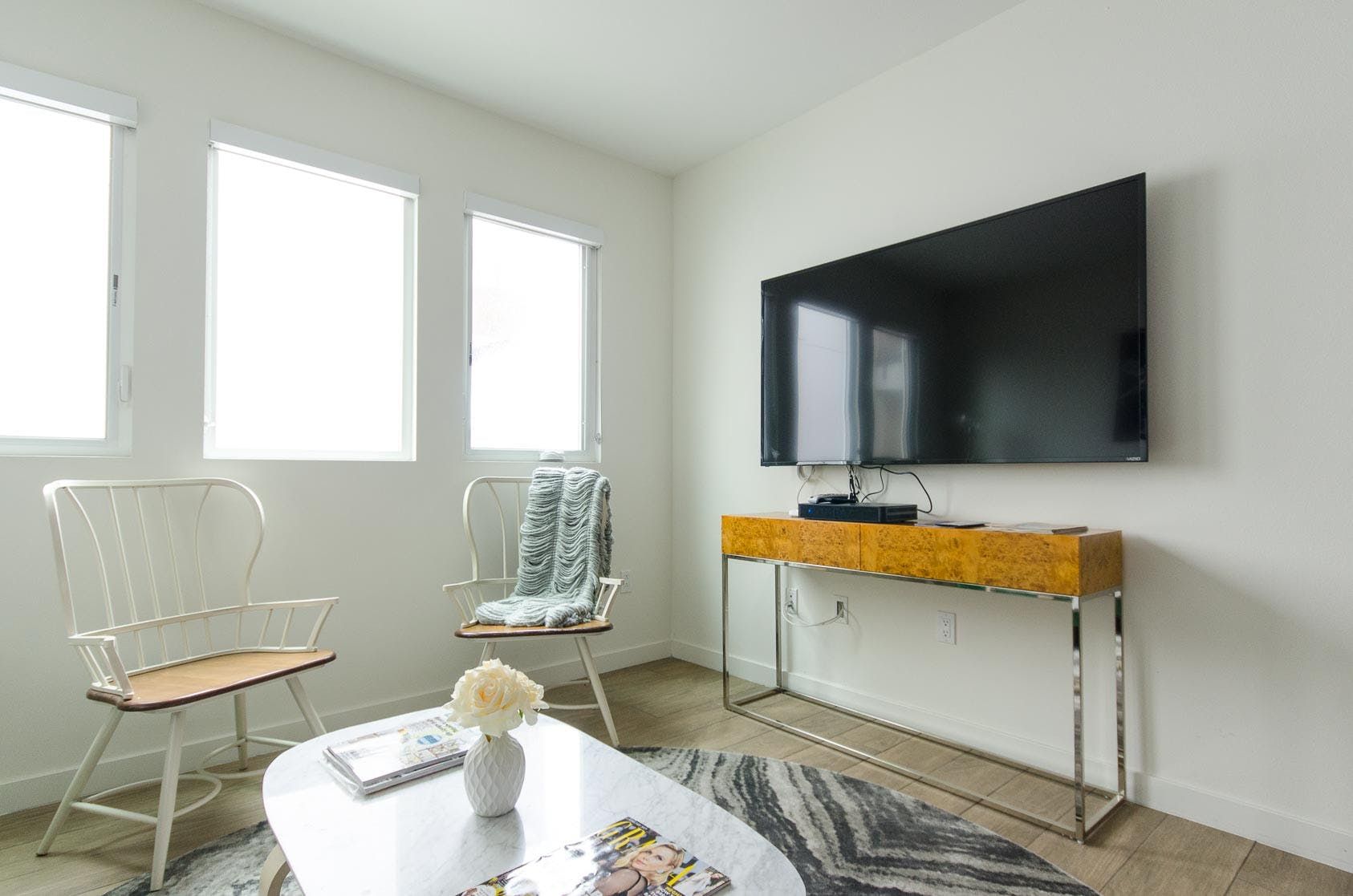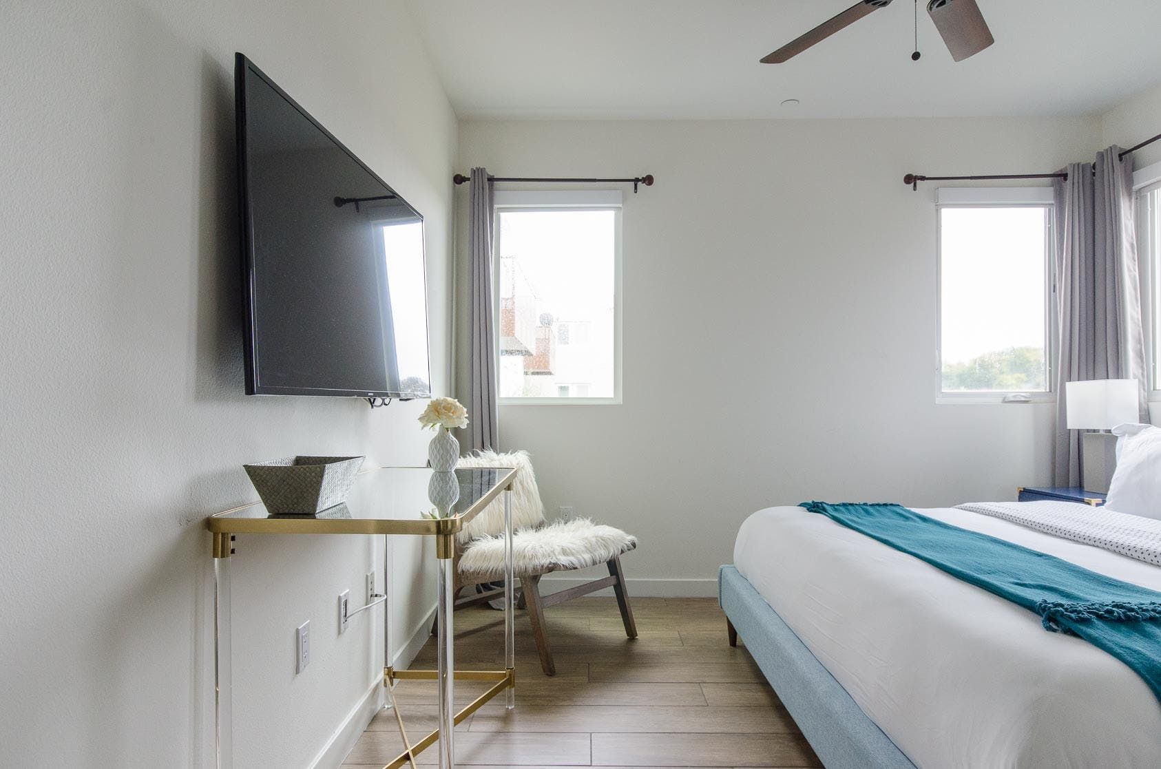 Welcome to a home with a playful and contemporary feel throughout, especially in the stylish living room, which features a striking green velvet sofa and a replica of Botticelli's Birth of Venus. The apartment has a more hotel-like feel and provides a well-maintained space with shared on-site amenities available for all building residents. Up on the shared rooftop deck, there are two barbecues, sun loungers and plenty of seating areas dotted around the building, which allow you to socialise or dine outside in the sunshine. The apartment itself ensures your creature comforts are catered for with its large modern kitchen, calming bedrooms and quality finishings in every room. If you're looking for a quiet but sociable spot in a desirable location with plenty of amenities to benefit from – then this is undoubtedly a solid choice. Located in the sought-after district of Miracle Mile in Los Angeles, you'll be just five minutes from the glamour of West Hollywood. And you'll be even closer to attractions such as the Los Angeles County Museum of Art as well as an array of fabulous eateries, boutiques and entertainment venues when staying in this part of town too.