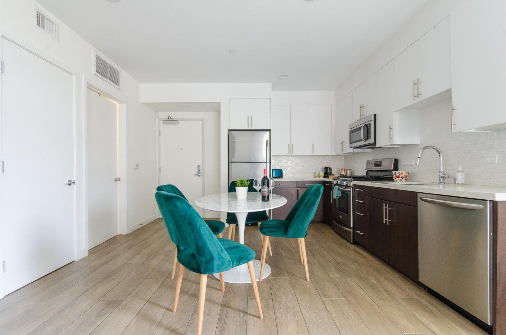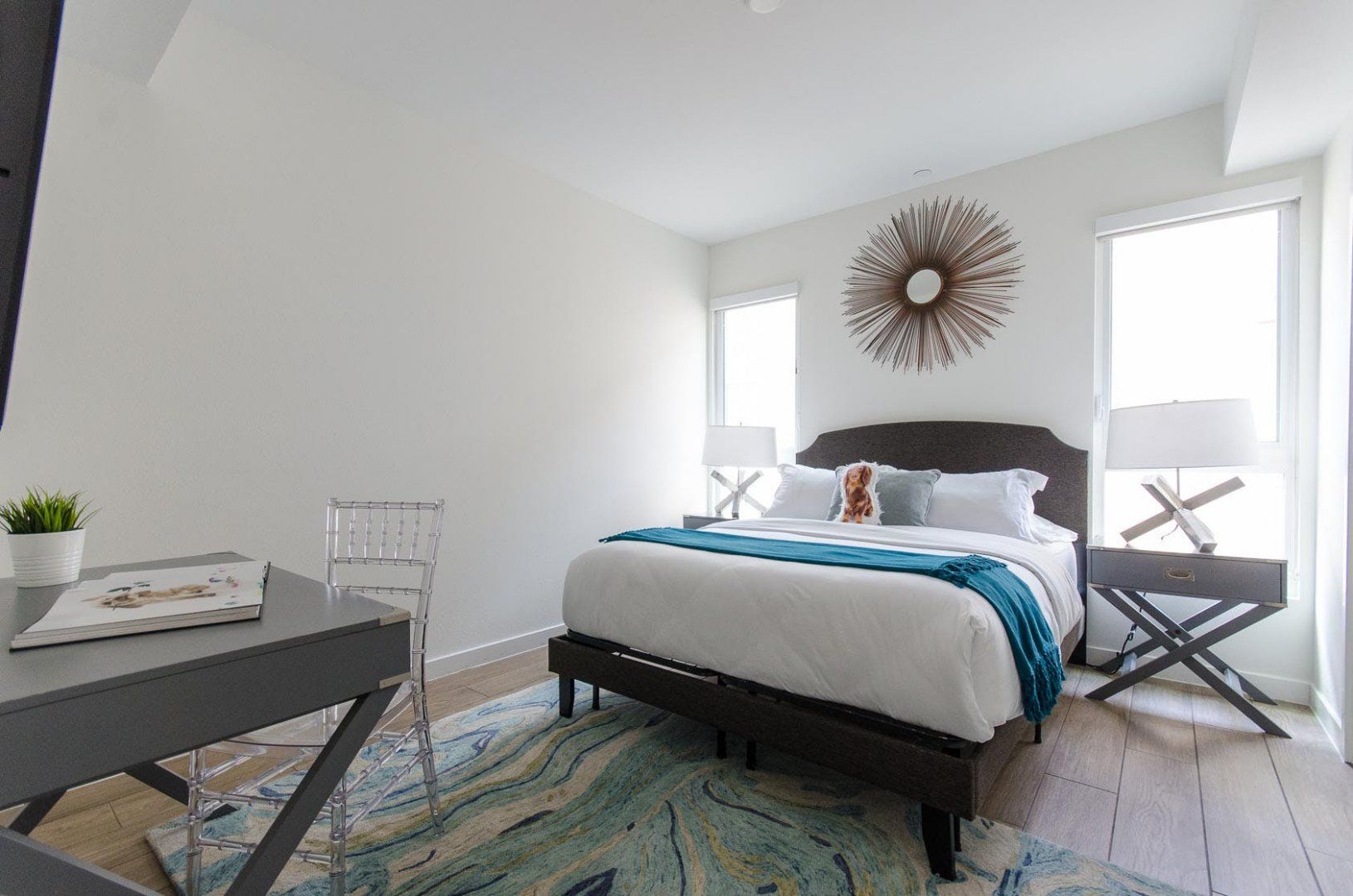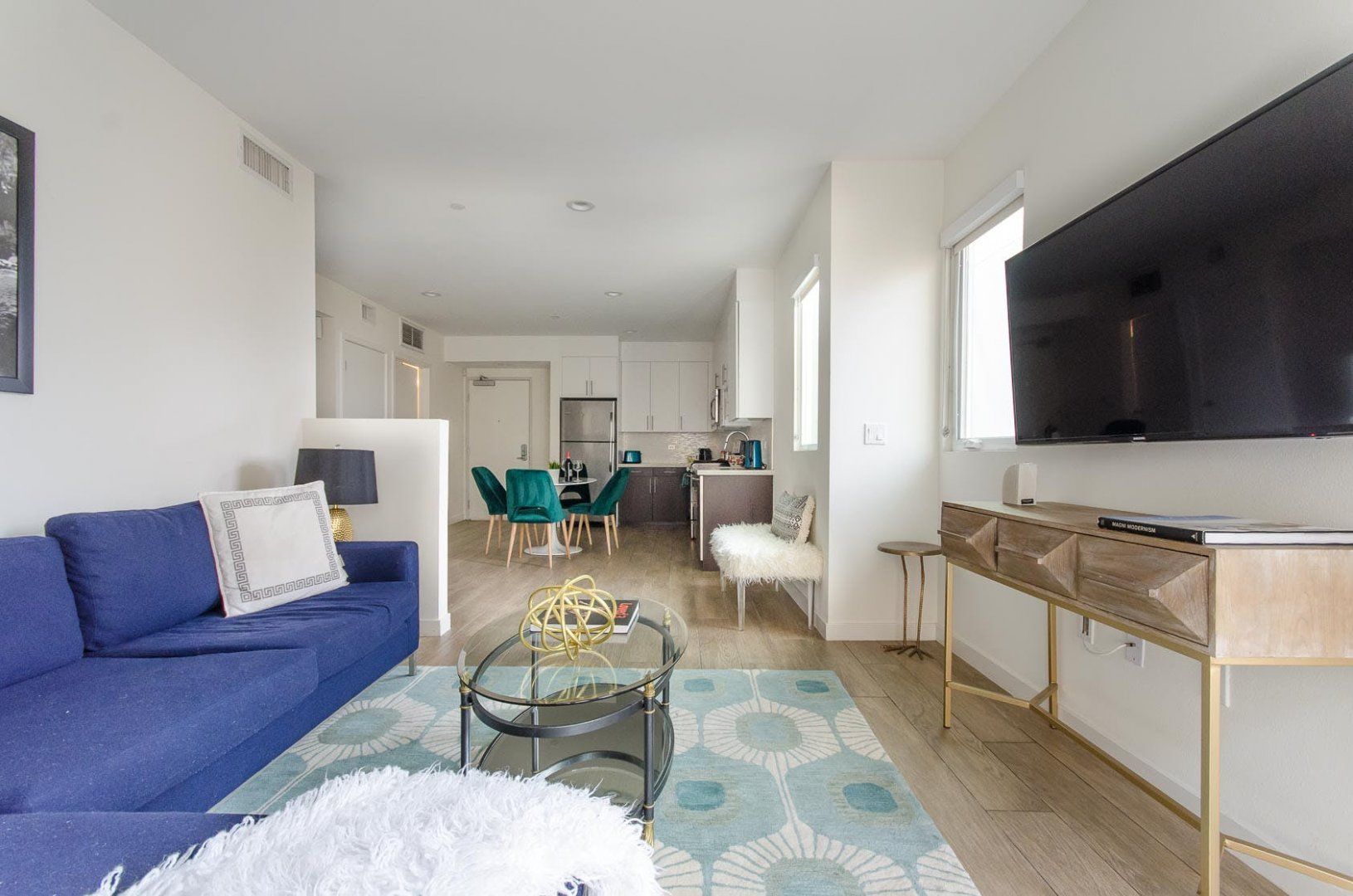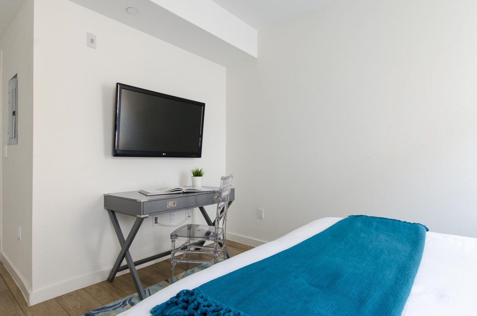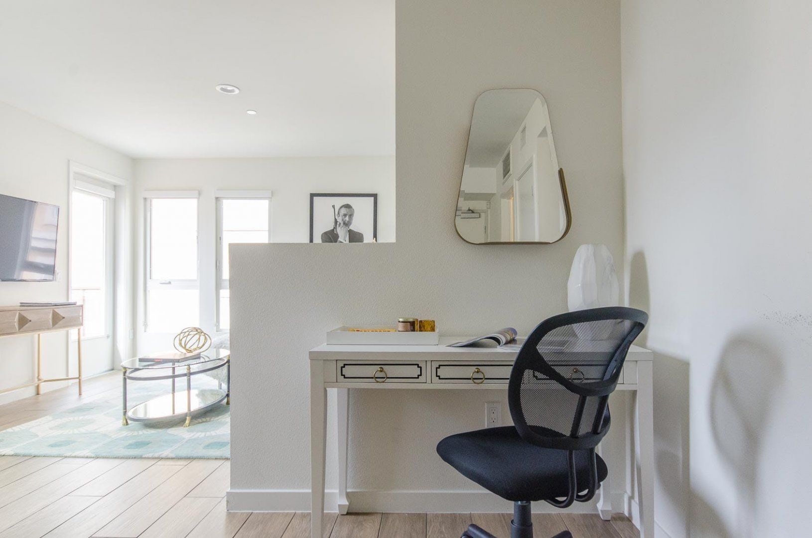 For a purpose-built apartment, this home is remarkably characterful owing to its colourful interior design and memorable artworks, like the large black and white poster of Roger Moore. The communal area feels bright and airy due to the open-plan layout that meets with the well-equipped kitchen and there's a peaceful spot to get some work done too. This won't be for those looking for something typically luxurious, but is great for those wanting a cheerful base in an exemplary location.