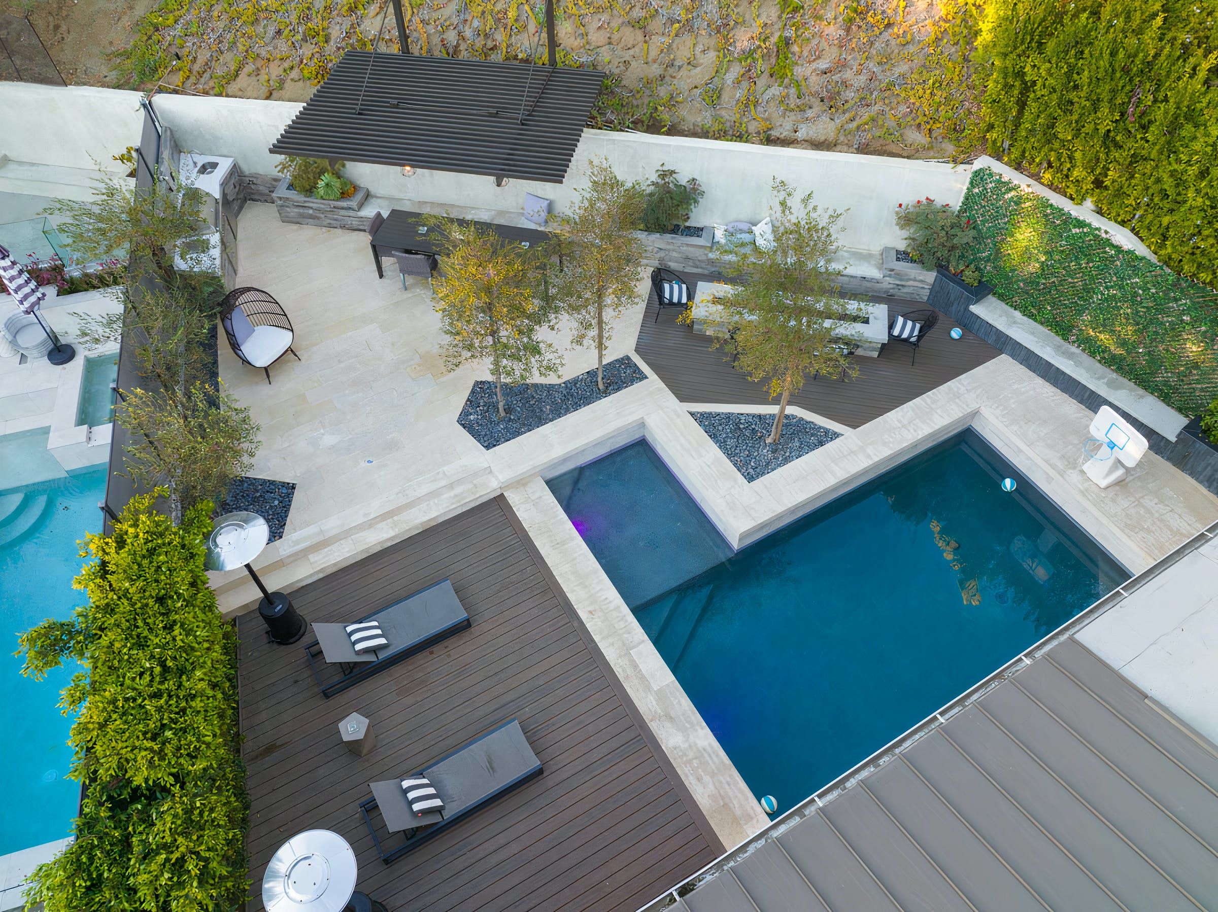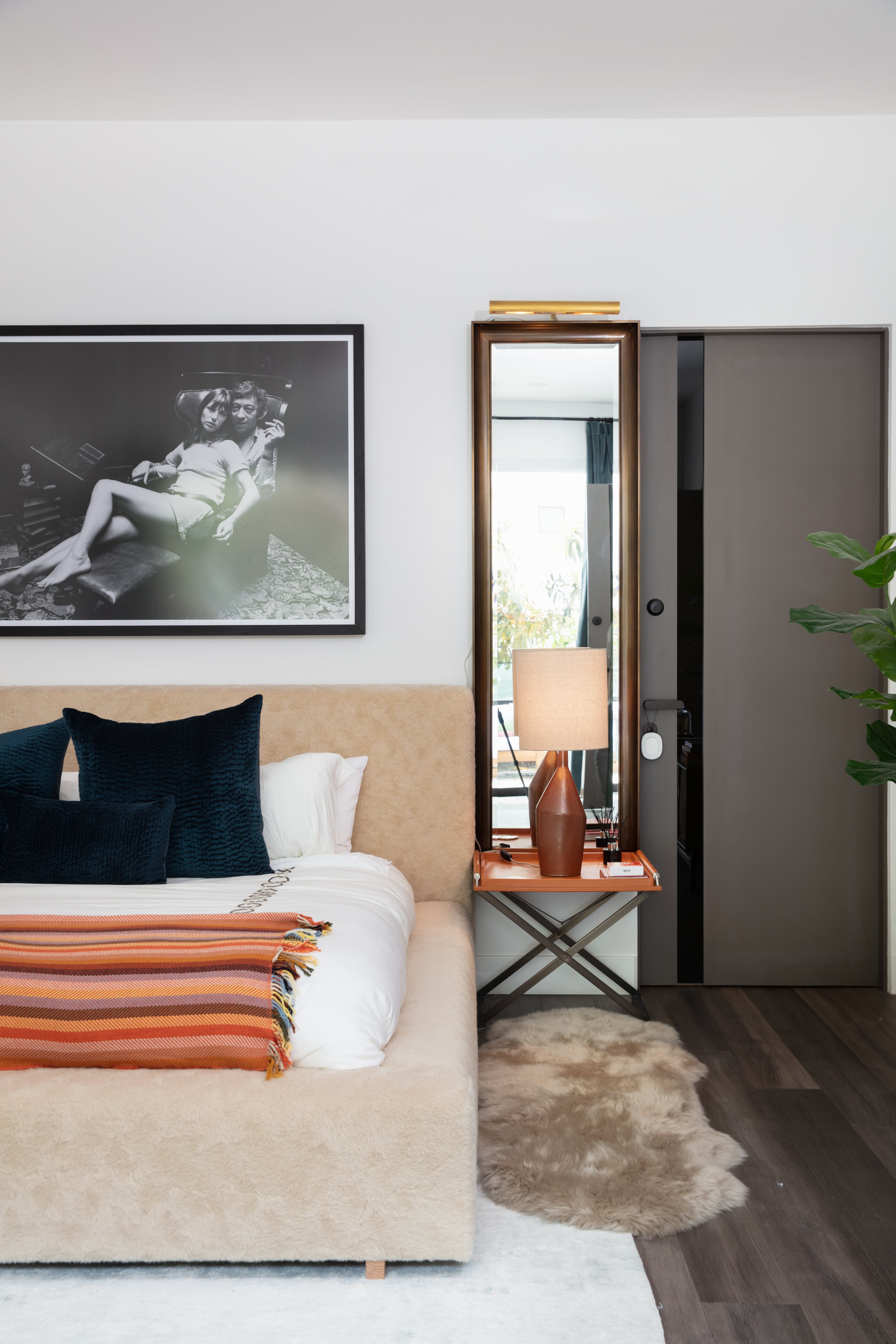 Inside, all-white walls, trendy wall art and floor-to-ceiling windows are matched with a luxury chef's kitchen, a cinema room, a wine cellar and six dreamy bedrooms. But our favourite room has to be the lounge with its striking fireplace, squashy velvet sofas in shades of rose and raspberry, and giant sliding glass doors opening to either side. Choose to step out onto the balcony for the best views or head out to the garden at the back for a swim in the Baja pool. In the evenings, heat up the grill for a barbecue on the covered dining terrace and then sit around one of the fire pits for drinks as the sun sets. Just a few minutes' drive from Hollywood Boulevard and Sunset, and around twenty from DTLA, it's a perfect location in the hills.