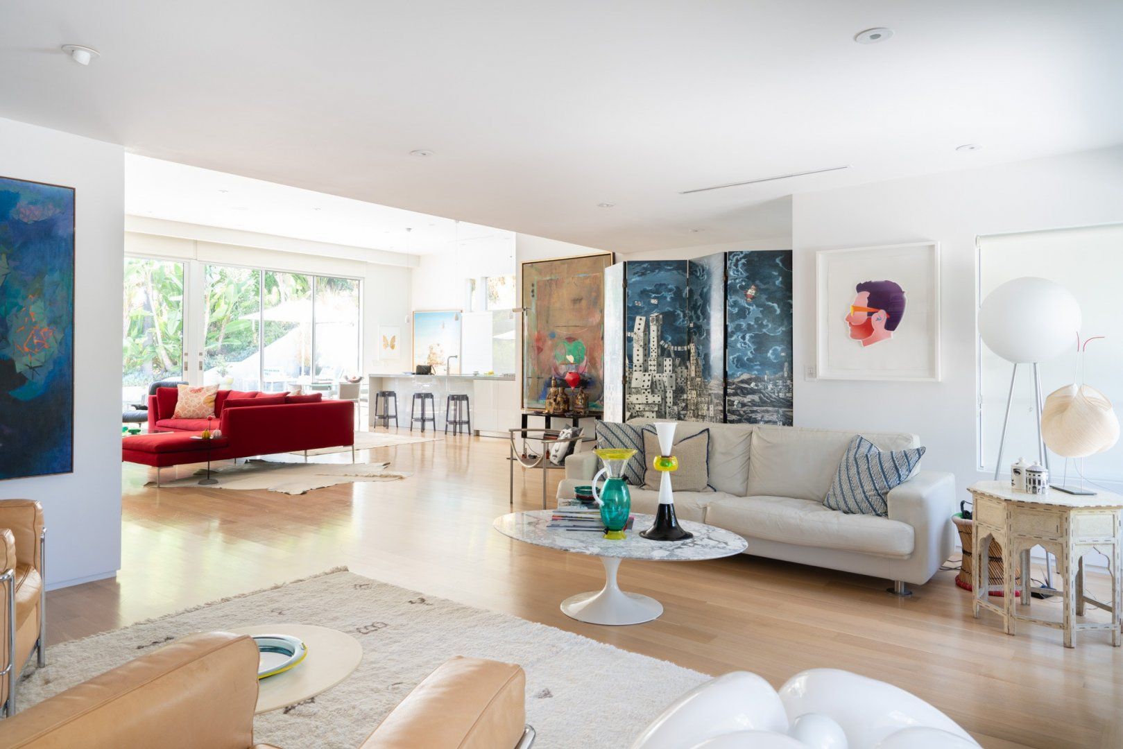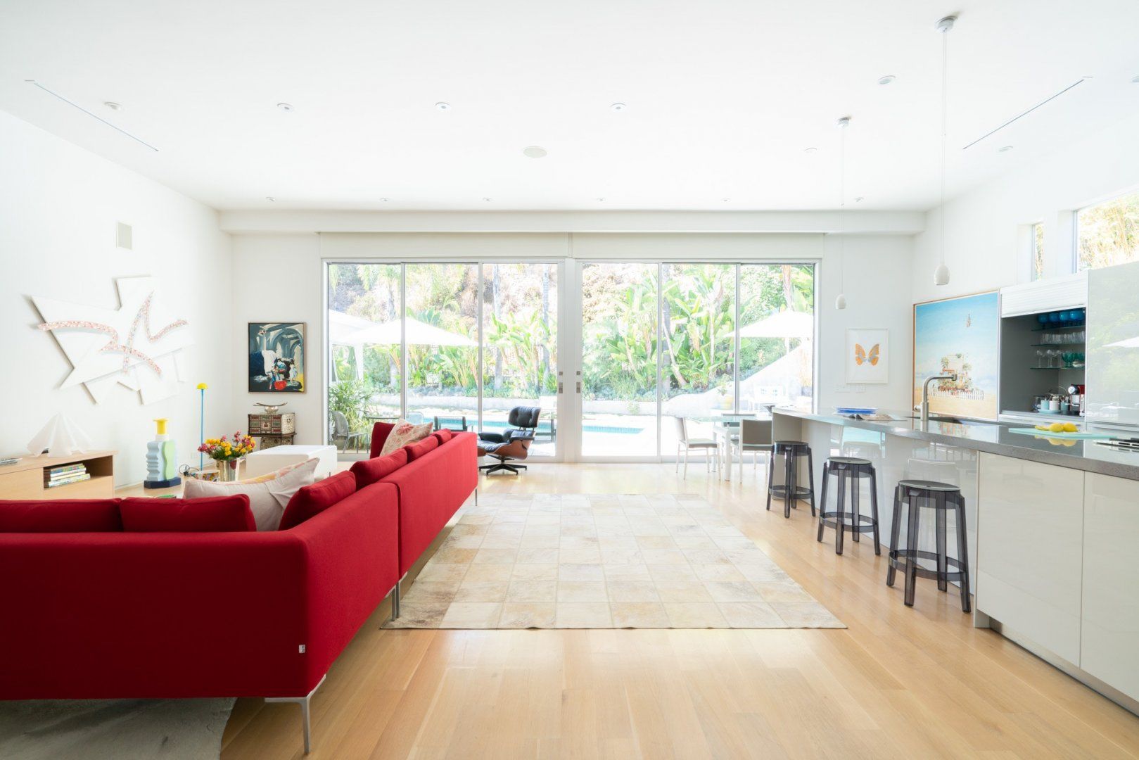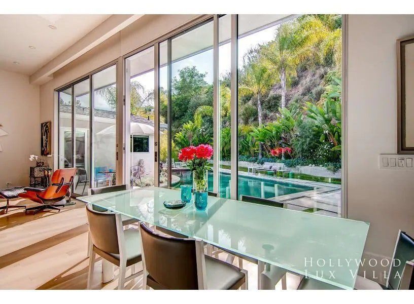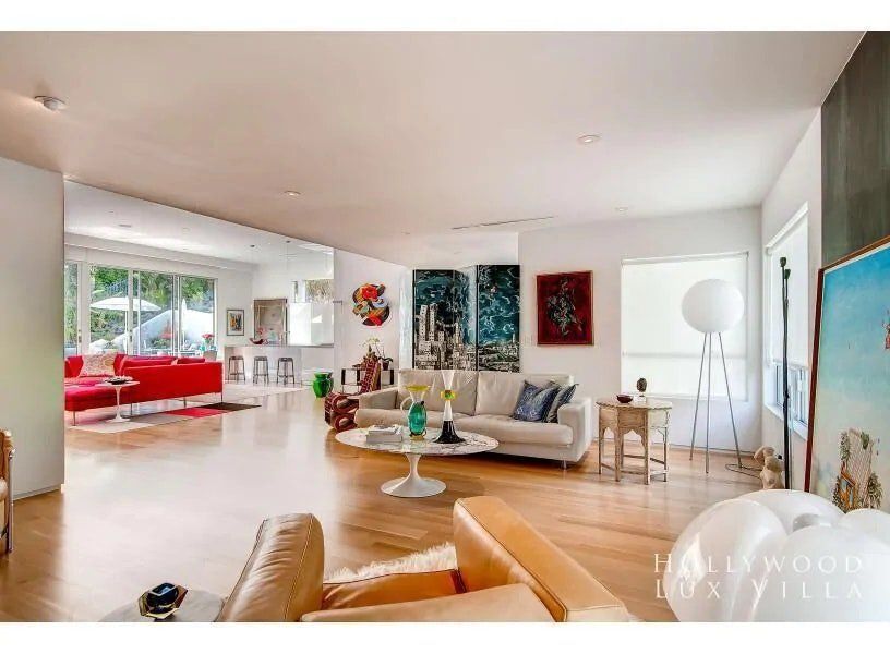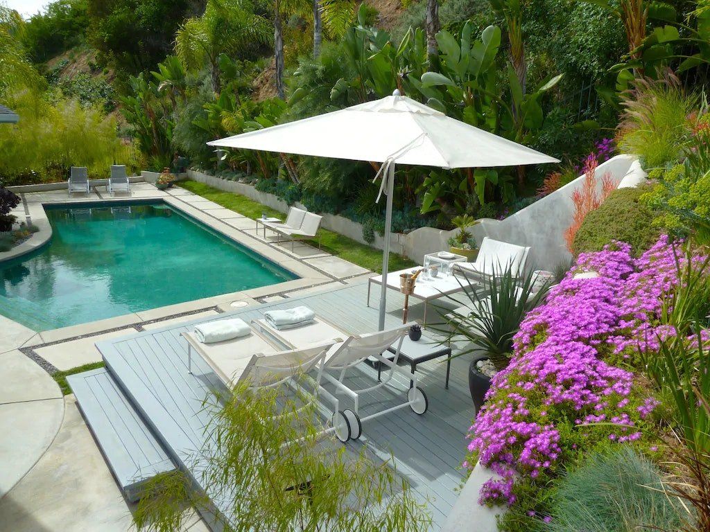 This fabulous, light-flooded home in the Hollywood Hills is positively brimming with style and character. It's filled with an eclectic collection of original art, Italian furniture and bookshelves aplenty. Modern art pops from the walls and the living room is separated by a striking feature screen. The open-plan kitchen and living room is a big and breezy space featuring a seating area in lipstick red and a library room with mid-century furniture around a fireplace. A wall of glass opens up directly onto the beautiful garden. Here you'll find a sparkling swimming pool surrounded by banana trees and ferns aplenty for that hidden oasis feel. Stretch out on a lounger or sip something bubbly on the sofas on the raised deck. When it comes to hitting the hay, bedrooms are boho-inspired and super spacious, ensuring a peaceful night's sleep.
