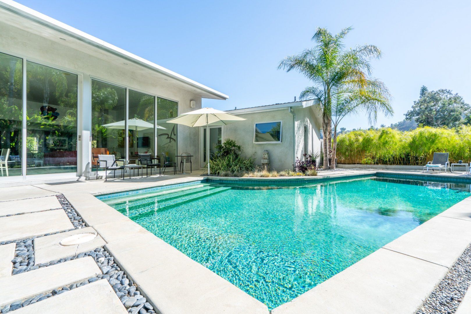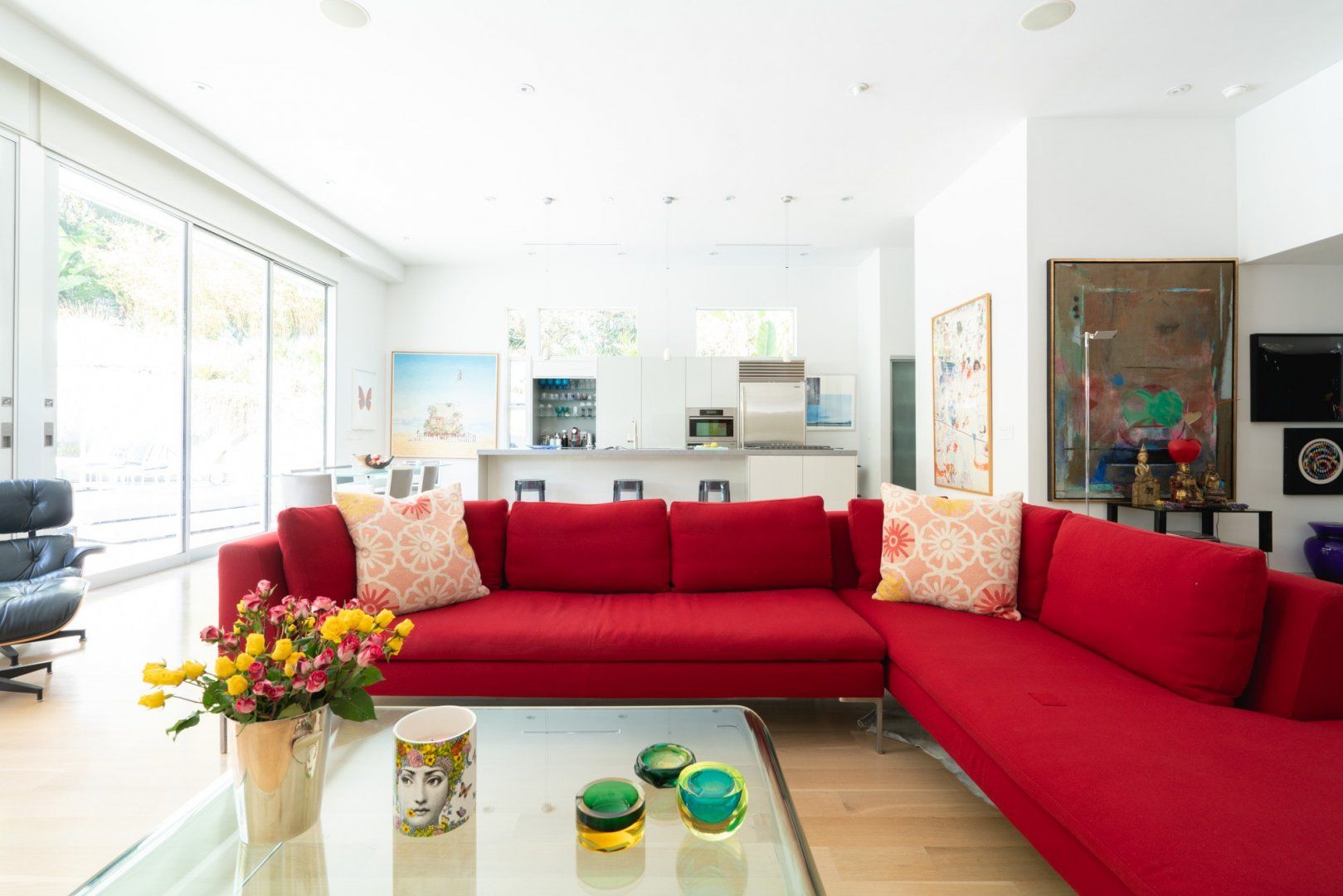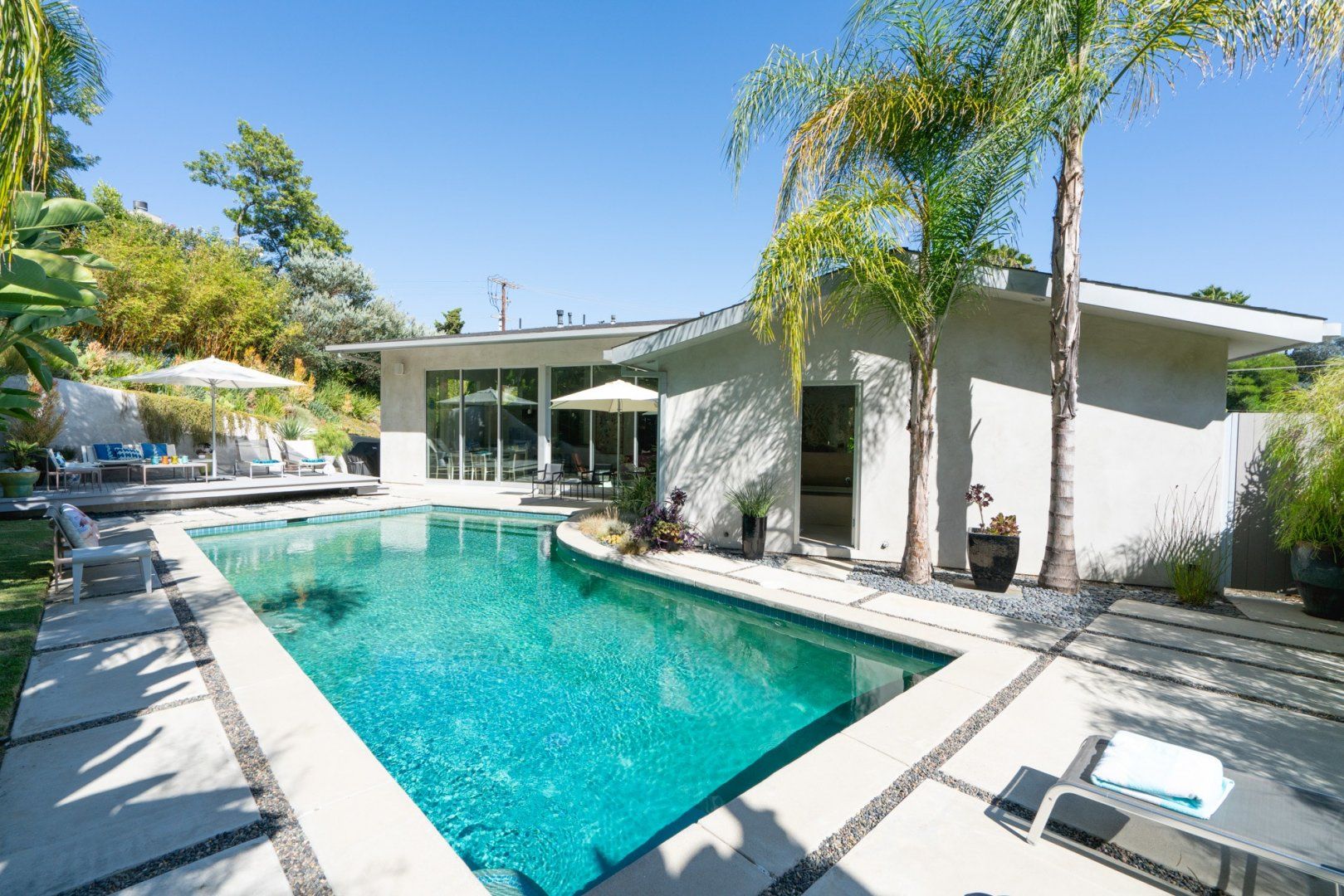 This fabulous, light-flooded home in the Hollywood Hills is positively brimming with style and character. It's filled with an eclectic collection of original art, Italian furniture and bookshelves aplenty. Modern art pops from the walls and the living room is separated by a striking feature screen. The open-plan kitchen and living room is a big and breezy space featuring a seating area in lipstick red and a library room with mid-century furniture around a fireplace. A wall of glass opens up directly onto the beautiful garden. Here you'll find a sparkling swimming pool surrounded by banana trees and ferns aplenty for that hidden oasis feel. Stretch out on a lounger or sip something bubbly on the sofas on the raised deck. When it comes to hitting the hay, bedrooms are boho-inspired and super spacious, ensuring a peaceful night's sleep.