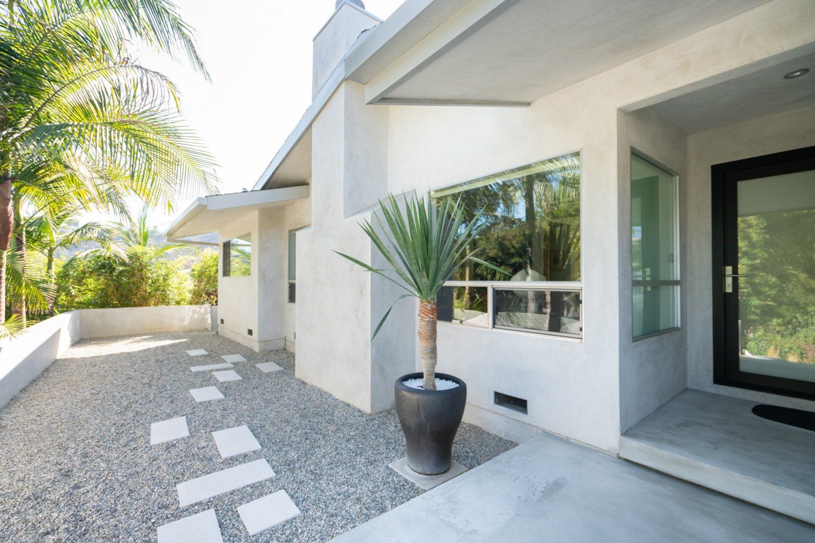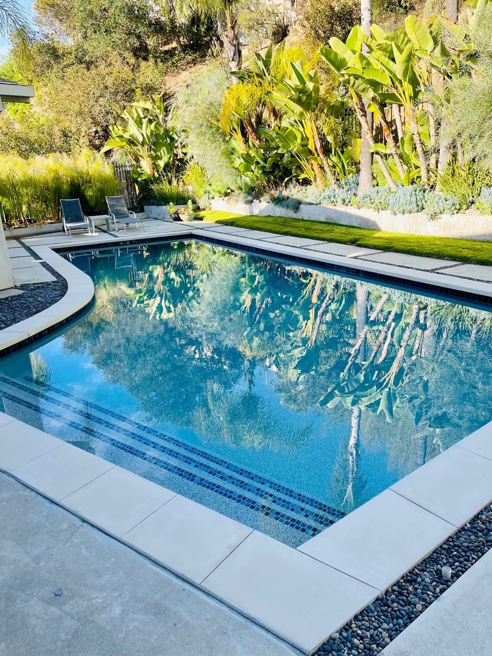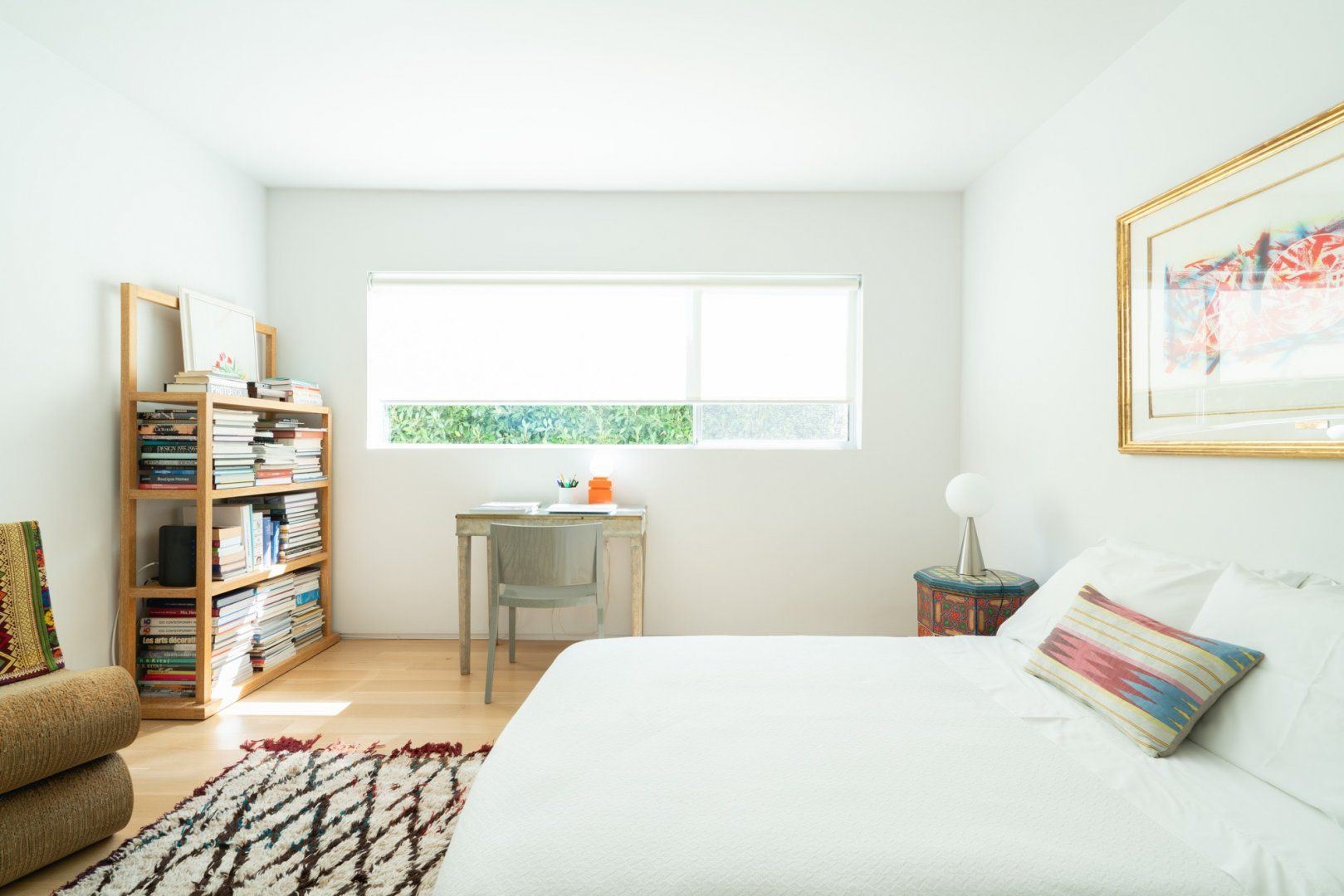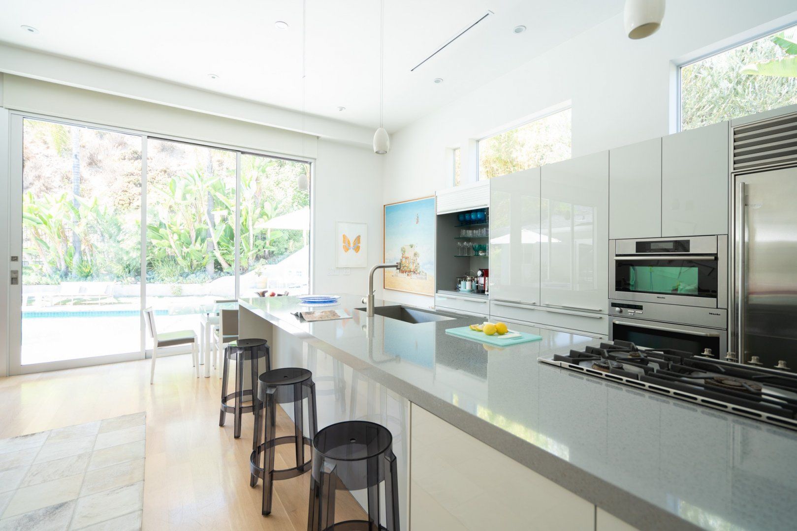 This fabulous, light-flooded home in the Hollywood Hills is positively brimming with style and character. It's filled with an eclectic collection of original art, Italian furniture and bookshelves aplenty. Modern art pops from the walls and the living room is separated by a striking feature screen. The open-plan kitchen and living room is a big and breezy space featuring a seating area in lipstick red and a library room with mid-century furniture around a fireplace. A wall of glass opens up directly onto the beautiful garden. Here you'll find a sparkling swimming pool surrounded by banana trees and ferns aplenty for that hidden oasis feel. Stretch out on a lounger or sip something bubbly on the sofas on the raised deck. When it comes to hitting the hay, bedrooms are boho-inspired and super spacious, ensuring a peaceful night's sleep.