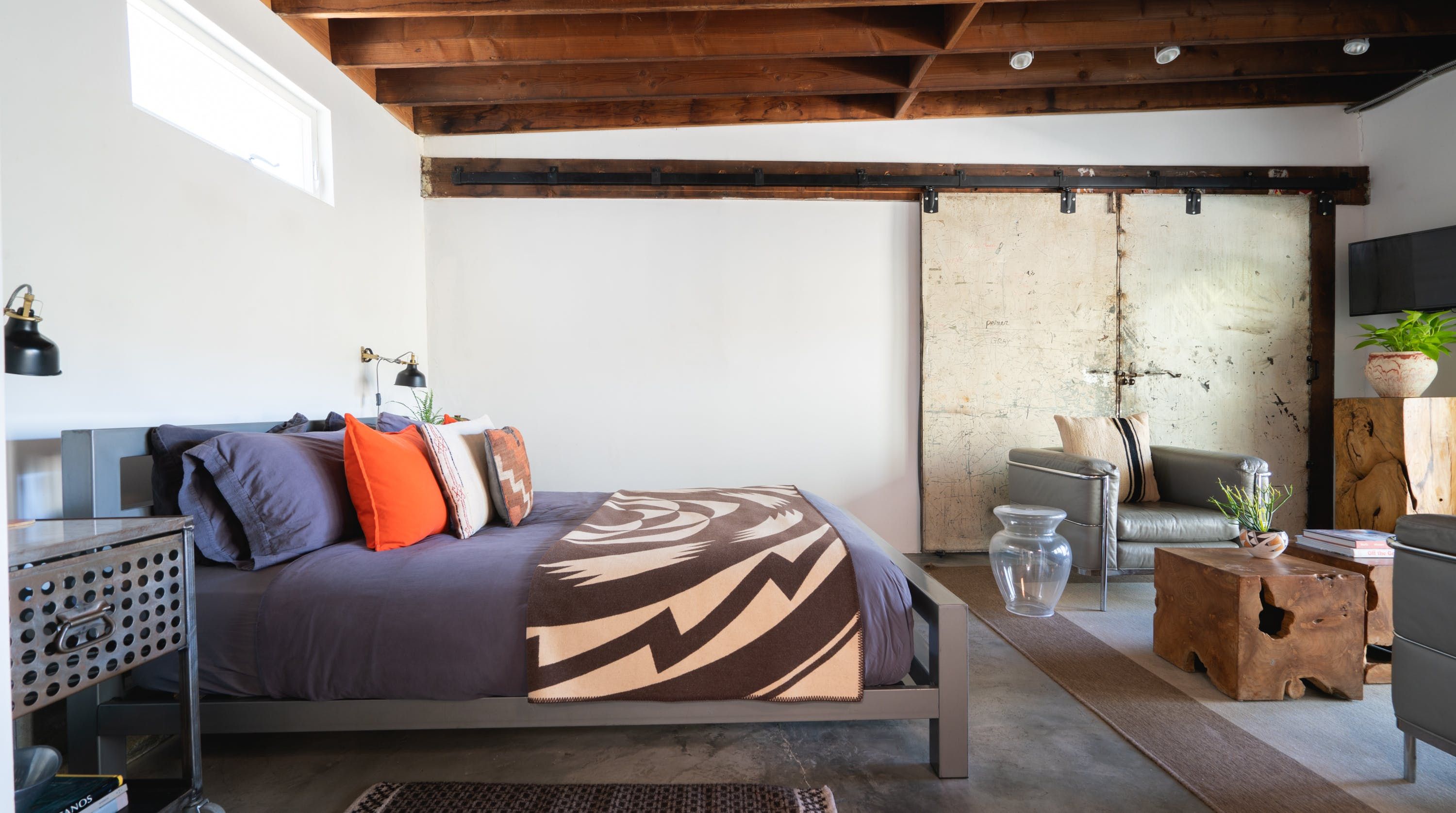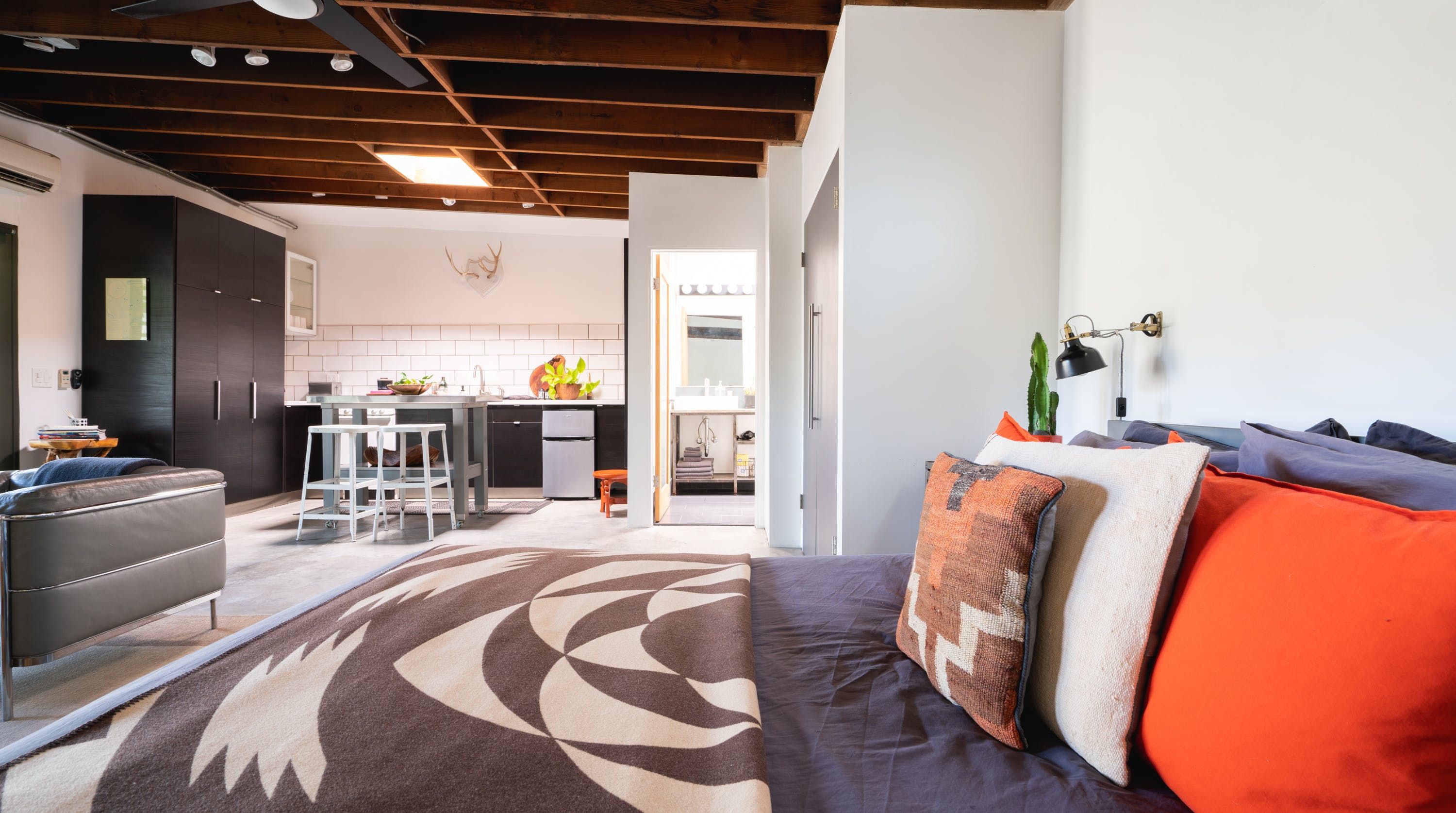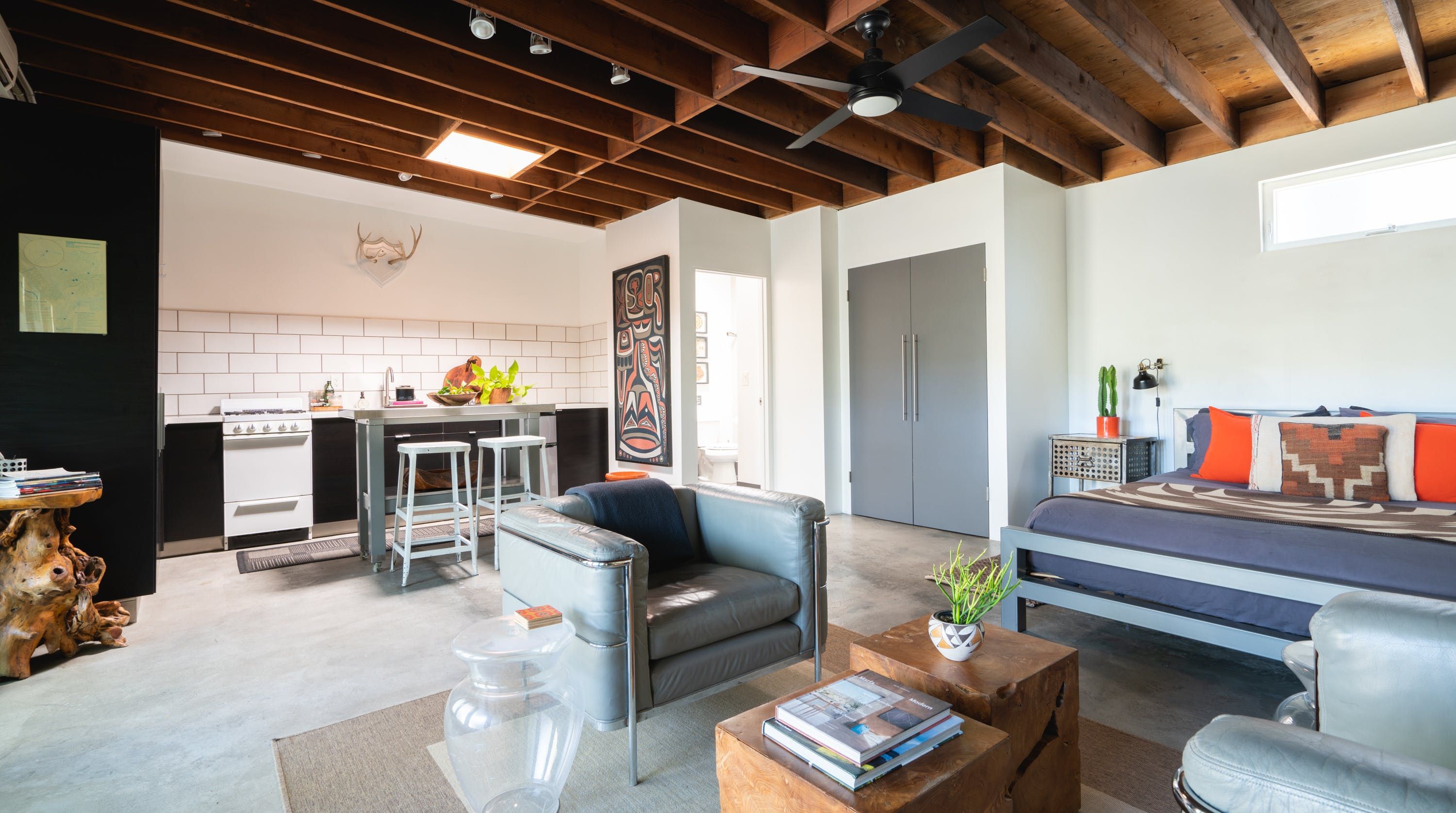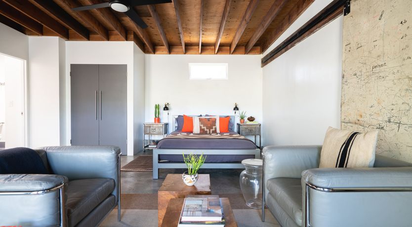 Combining the shell of an old industrial building with folk art and stylish mid-century modern furniture, this eclectic loft-style home provides the ideal base for a couple or solo traveller looking to be within easy reach of Los Angeles’ most exciting sights. Rustic charm meets snazzy sophistication in this open-plan space, with cool original features (think steel doors, beamed ceilings and concrete floors) giving it plenty of character. We love how the layout gives this home a real sense of largesse, while the soft furnishings and wooden accents lend it a sense of warmth and cosiness. Open up the large front doors to step out onto a communal patio where a fire pit and comfortable seating invite memorable nights beneath the stars. When you’re not hanging out in your chic pad, go out and explore the nearby sights. You’re just an eight-minute walk from Rose Hill Park and a fifteen-minute drive from Chinatown, while a twenty-minute car ride will take you to the Griffith Observatory and the bright lights of Hollywood.