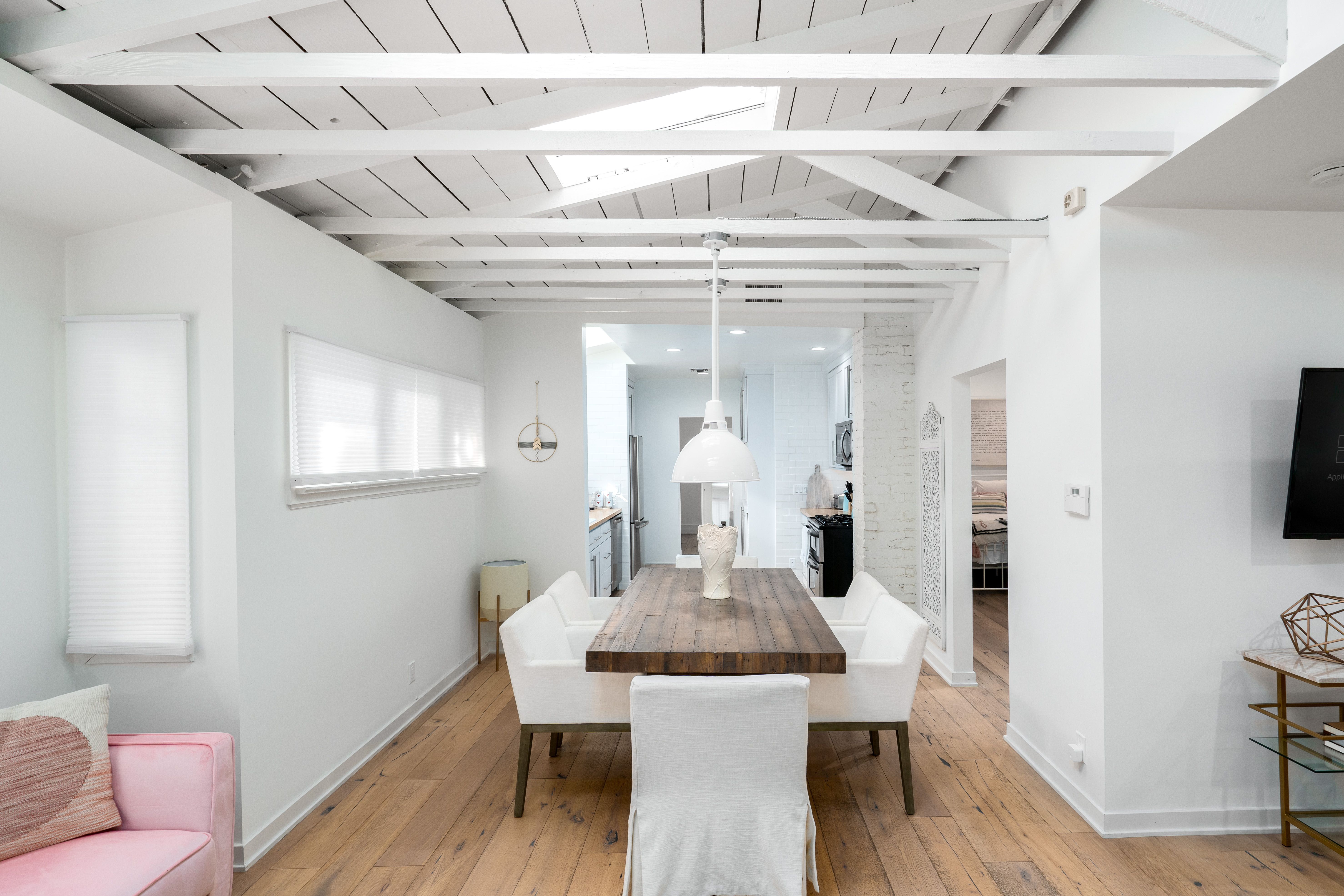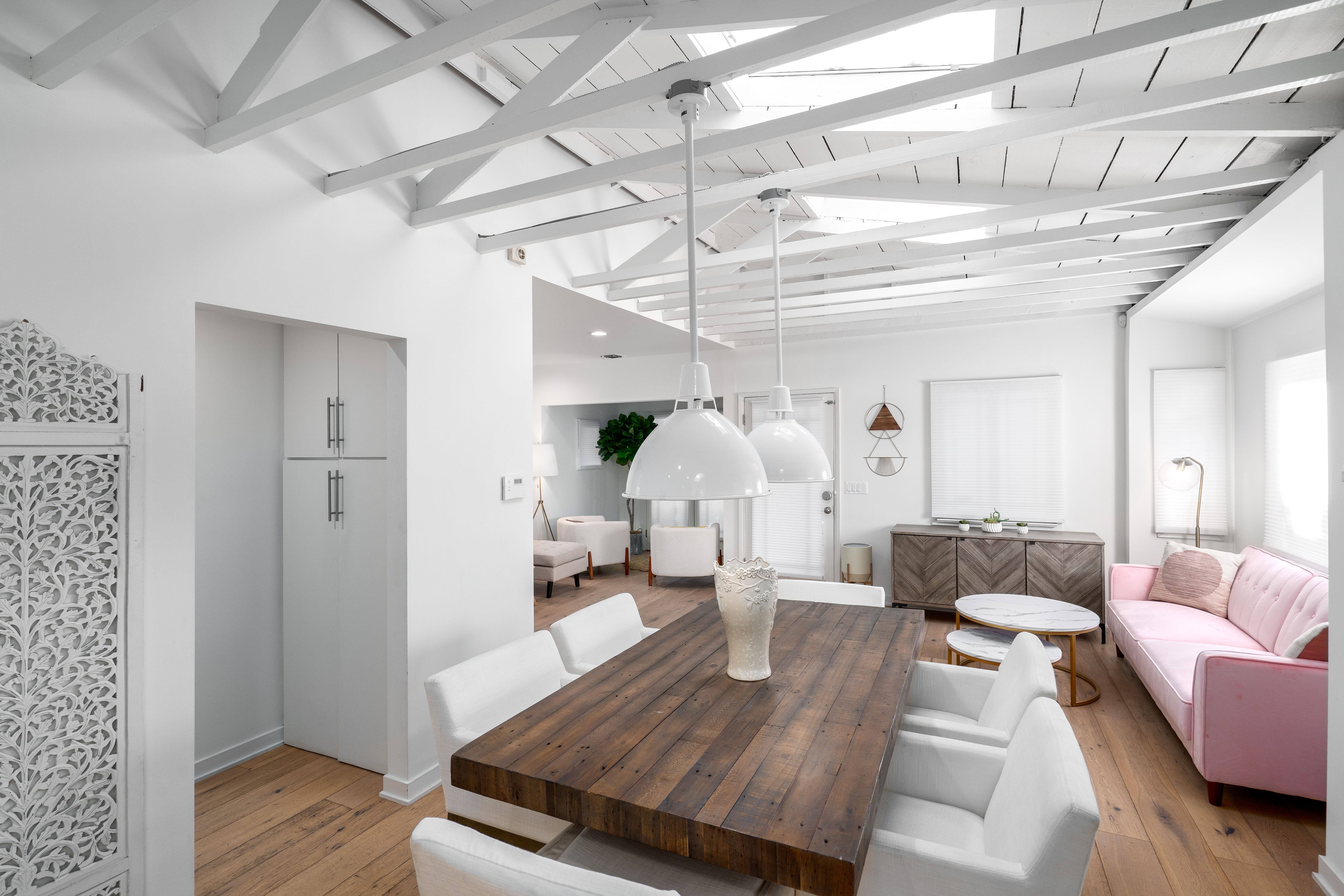 Right in the beating heart of Venice, yet situated on one of the quietest and most picturesque streets in the neighbourhood, this seaside home is a tranquil haven. Skylights illuminate the rooms, decorated in neutral tones with pleasing dusky pinks, soft blues and sandy tones to echo the coastal surroundings and unforgettable LA sunsets. Your host has made great use of small nooks and inaccessible corners to create mini sanctuaries within the larger seating area and by the doors into the courtyard garden. Wooden floors, jute rugs and an abundance of greenery all contribute to creating that all-important connection with nature and making you feel at peace.