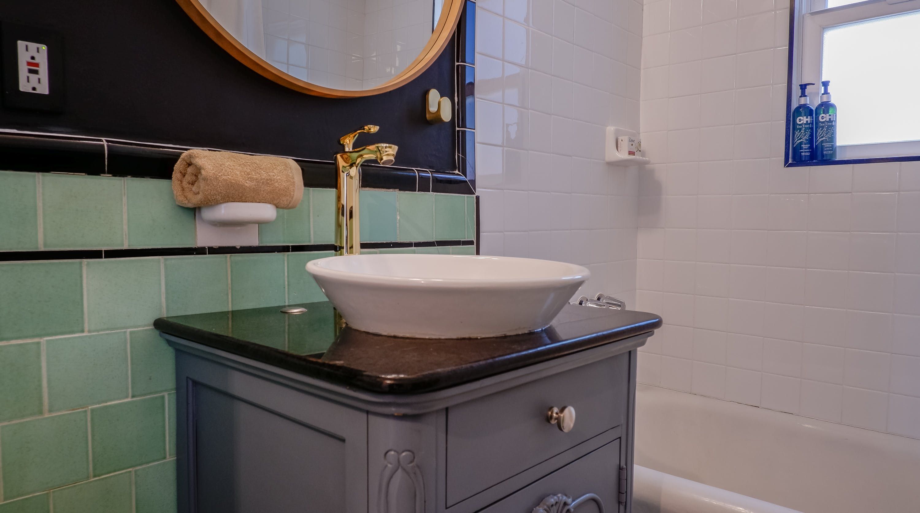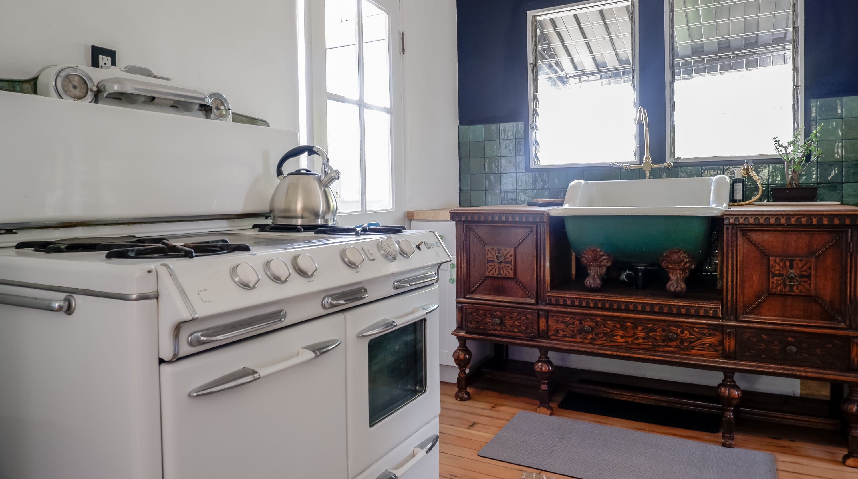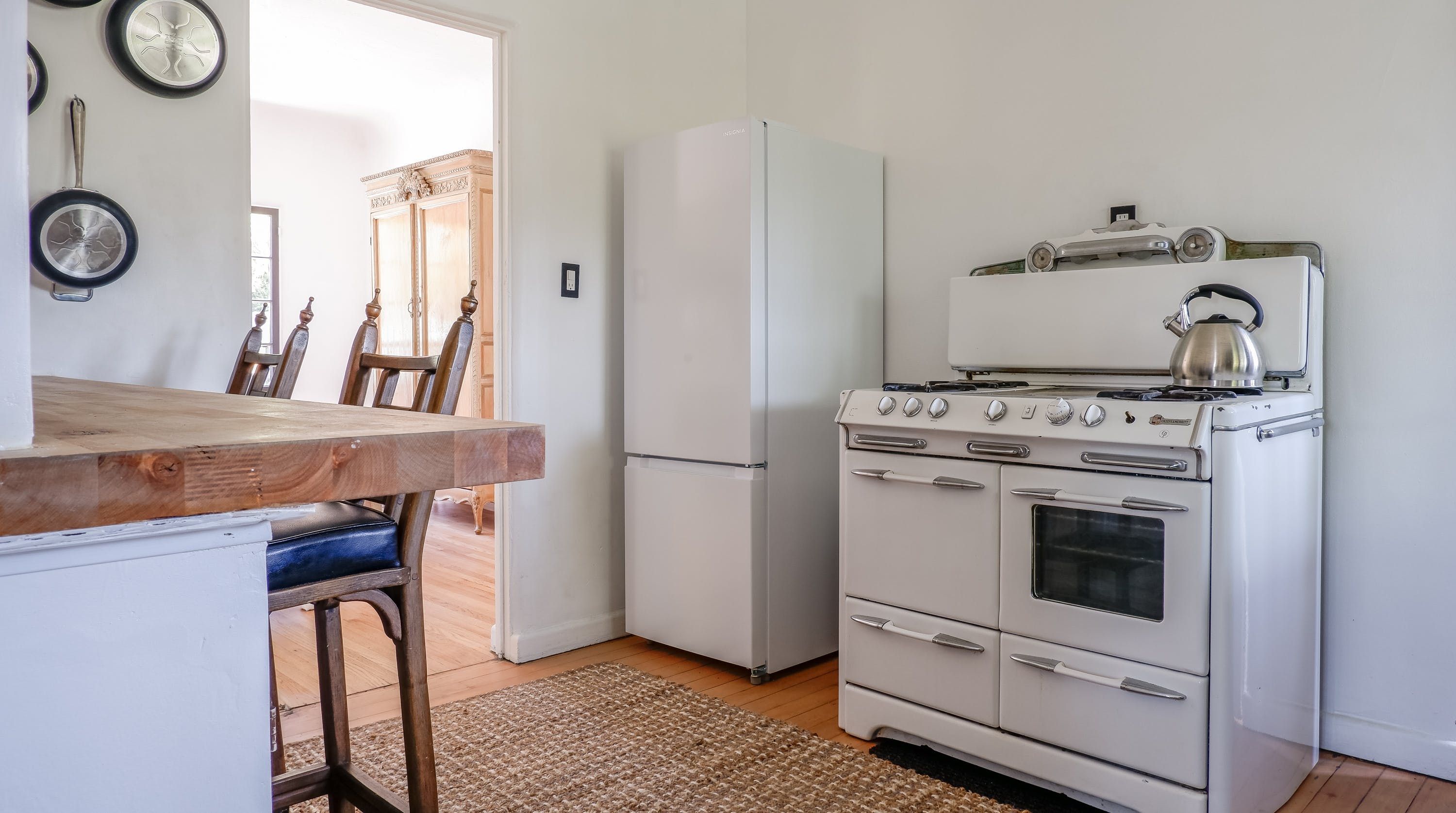 Furnished with mid-century style sofas and funky vintage pieces, this home is great for relaxing in the evening after a busy day. For dinner, you can choose to eat at one of the many local restaurants – reachable in as little as six minutes on foot, or take advantage of the home’s vintage Okeefe & Merritt oven and cook at home.