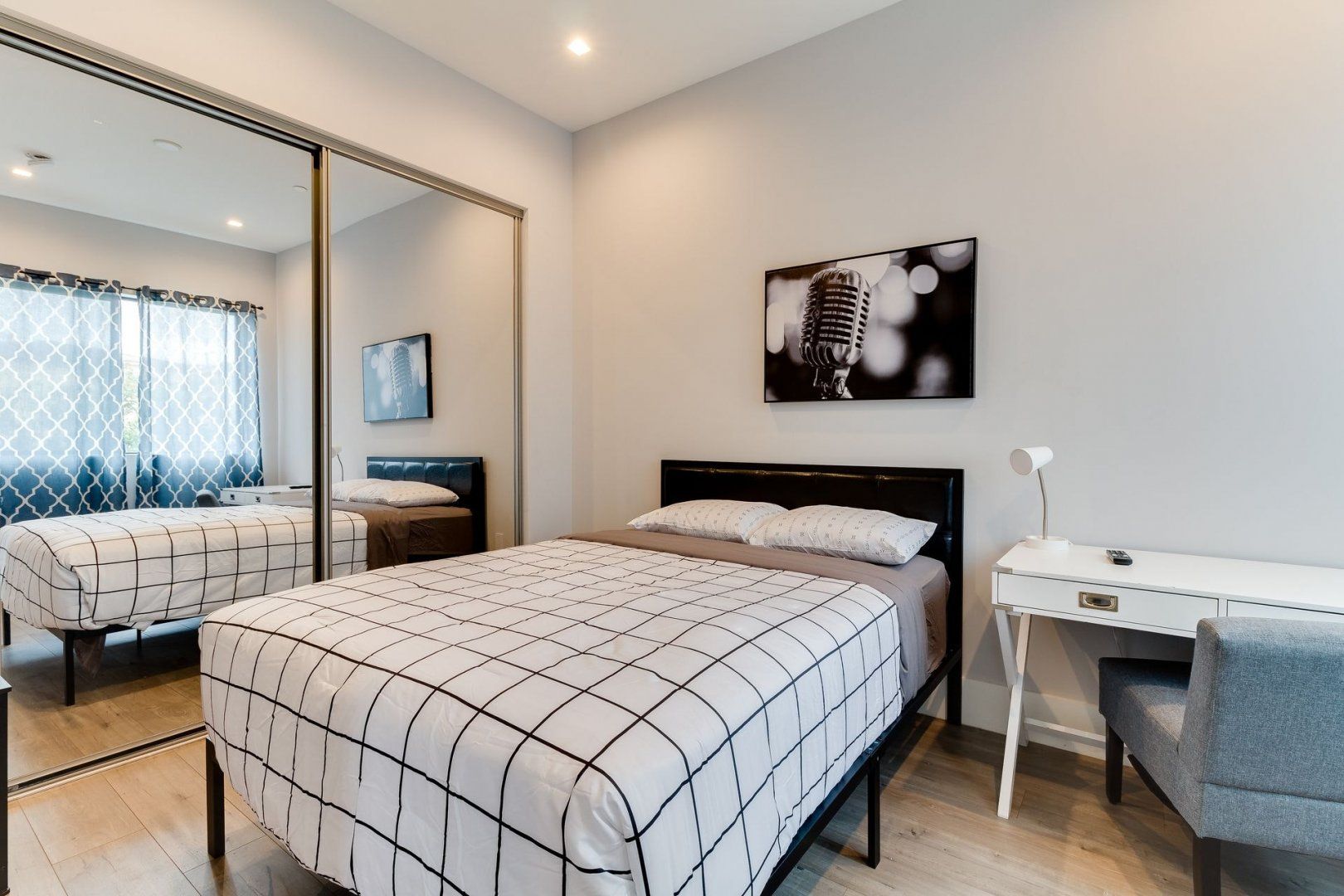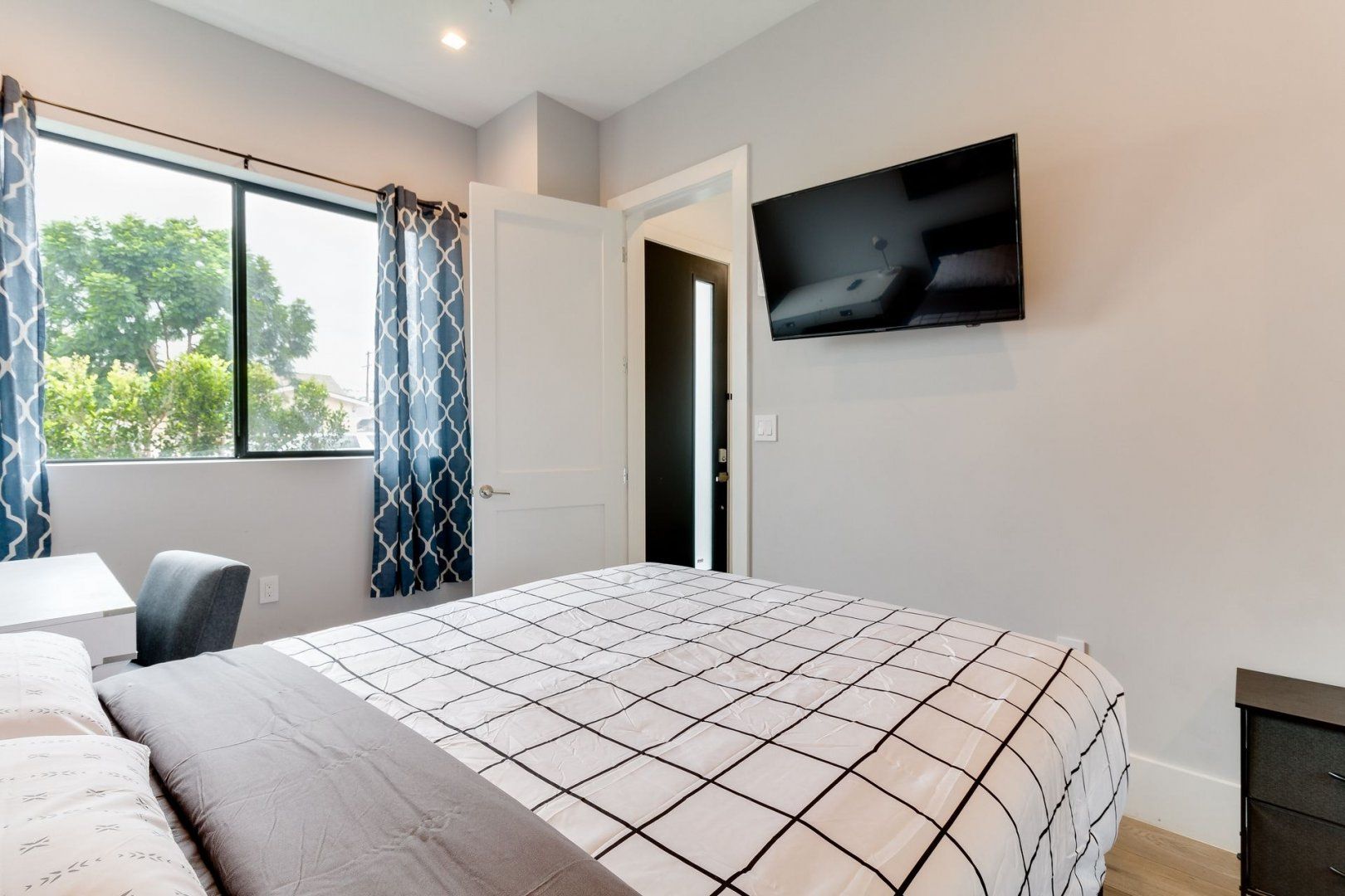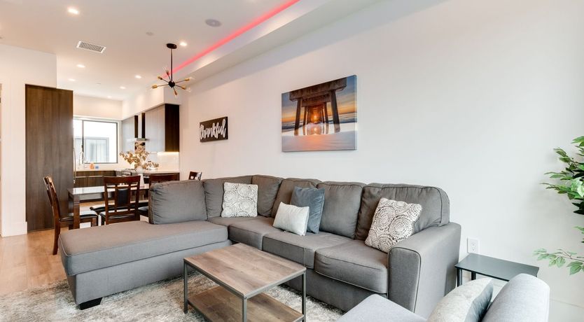 This bright and modern family home is the epitome of laidback living. Inside, a comfortable living space with turquoise accents and funky colour-changing recessed lights unfolds into a fully-equipped kitchen. After devouring home-cooked dishes in the dining space, head up to the roof terrace with a glass of wine in hand for endless views of LA and Hollywood.
