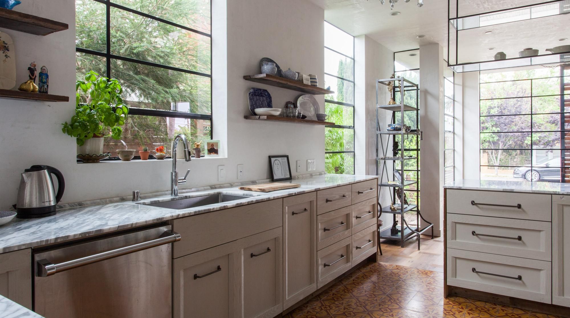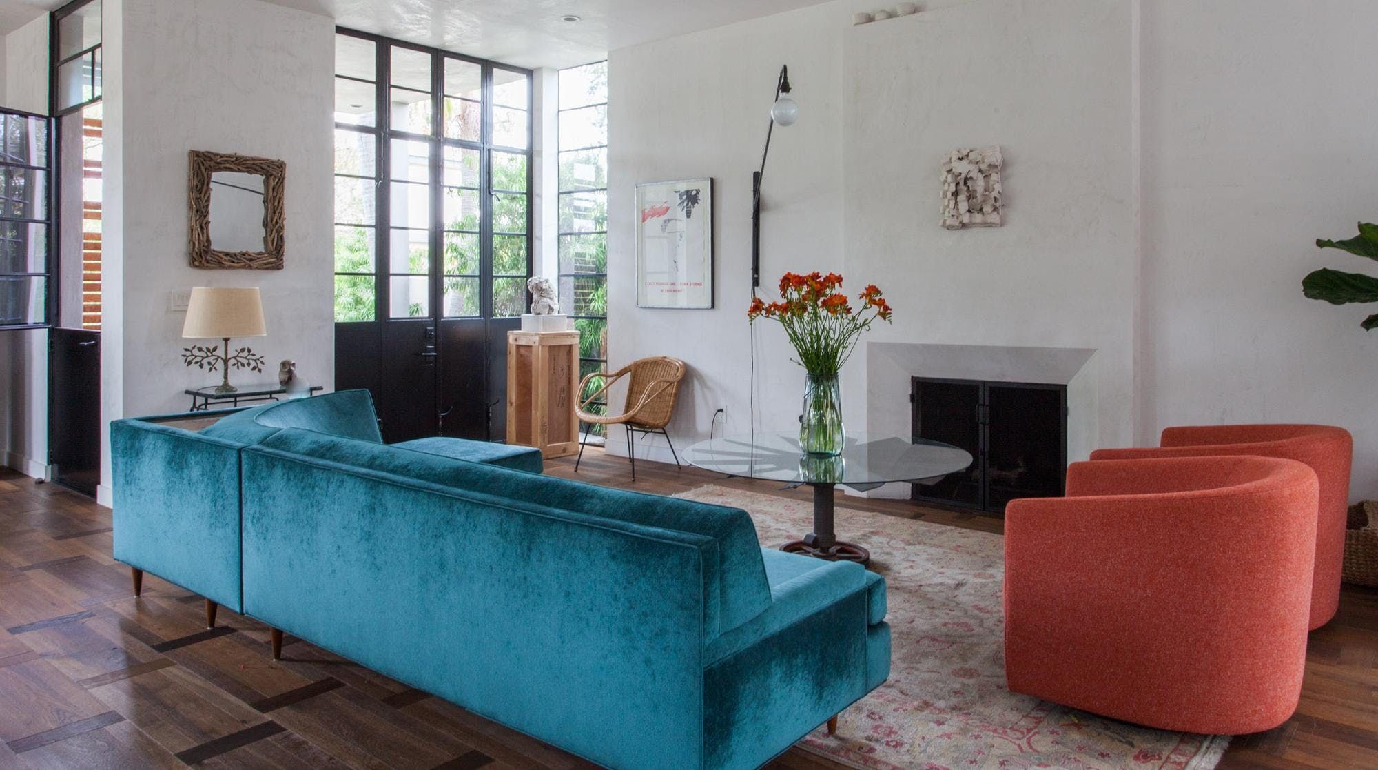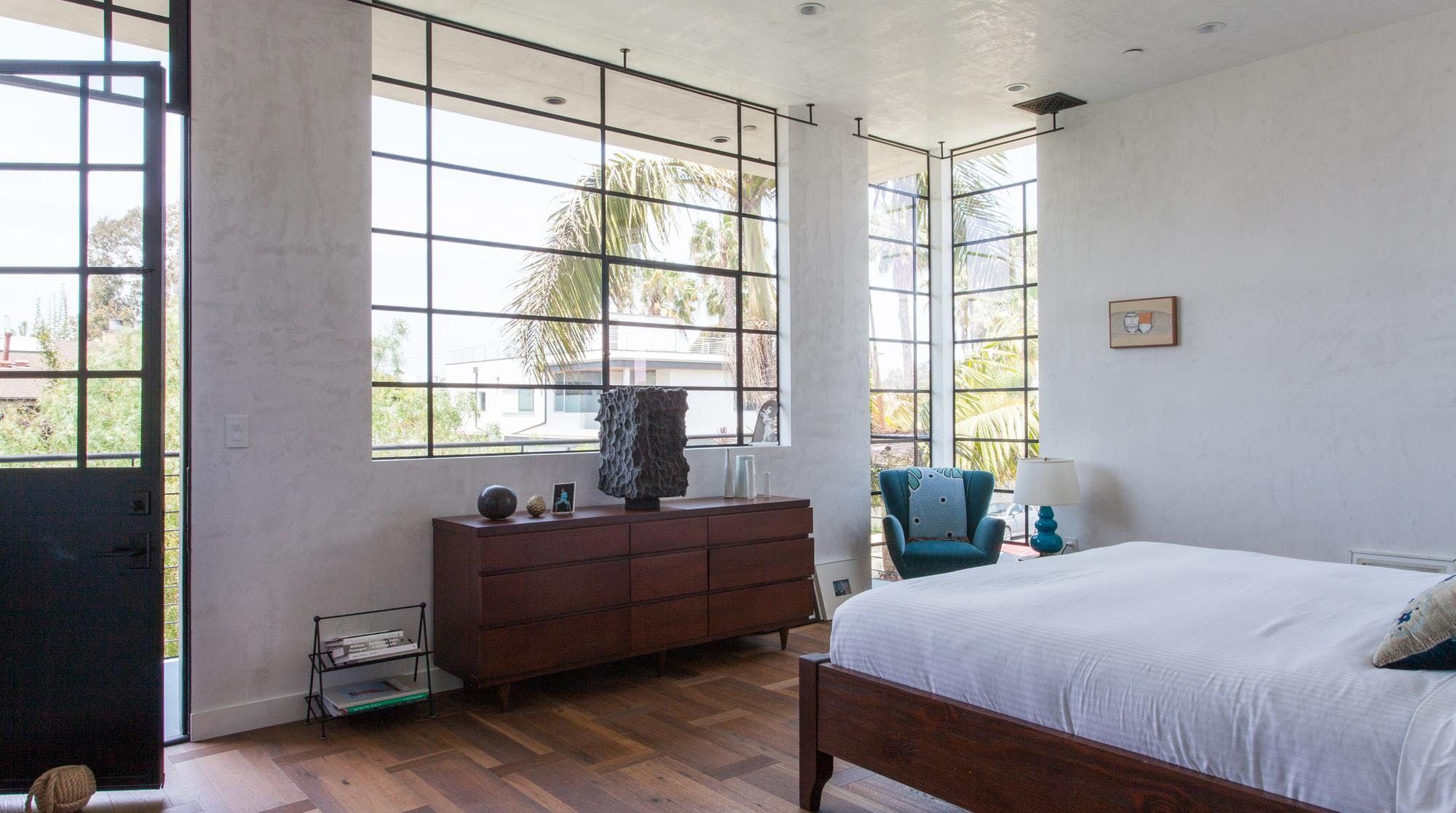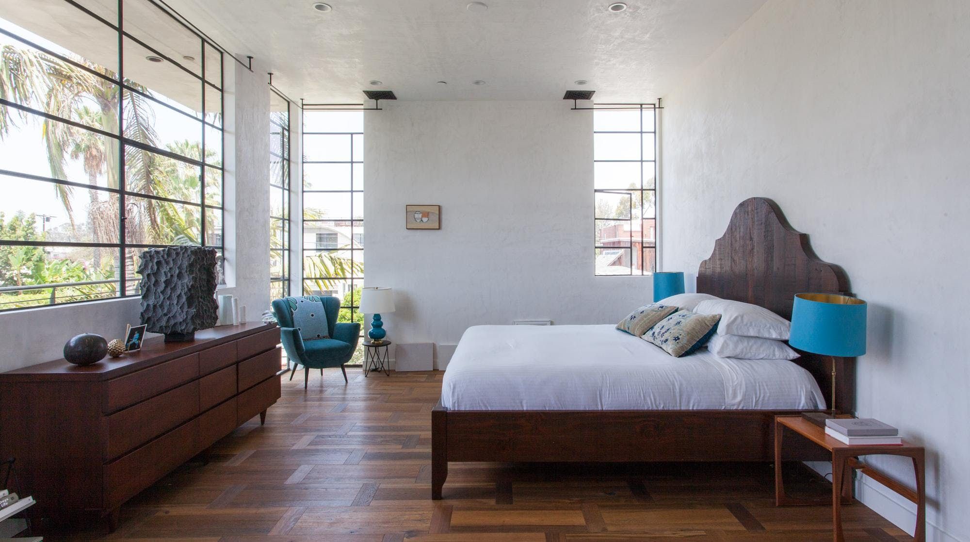 We love this home both for its incredible location and impeccable styling – your oasis will be just a five-minute walk from the canals, eight minutes from the dining and shopping of Abbot Kinney Boulevard and a fifteen-minute walk from the beach. Back at home, start your day with yoga or stretching on the beautifully green rooftop terrace with a view of the neighbourhood. Then head down to the kitchen, fix yourself some breakfast and coffee, ferrying it out to the chic garden to enjoy. Inside, the home has a beautiful modern design to it, with polished concrete walls and large grided windows. The space feels bright and clear-headed at the same time as it’s inviting and cosy – especially with the giant velvet blue velvet in the living area. Peruse the shelves lined with art books, before plopping down onto the sofa for an afternoon read. At the end of the day, comfortable, bright bedrooms await with the promise of restful sleep.