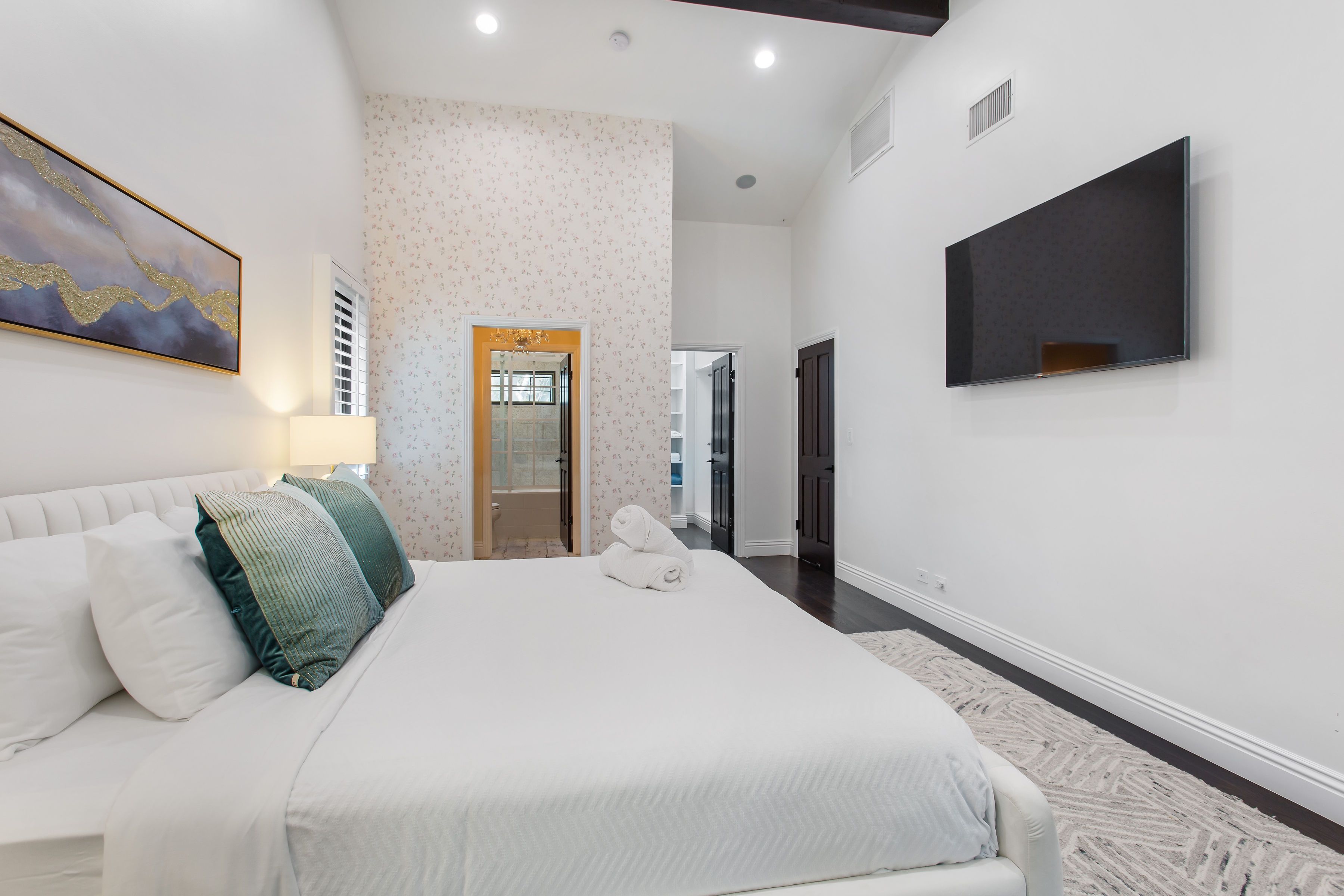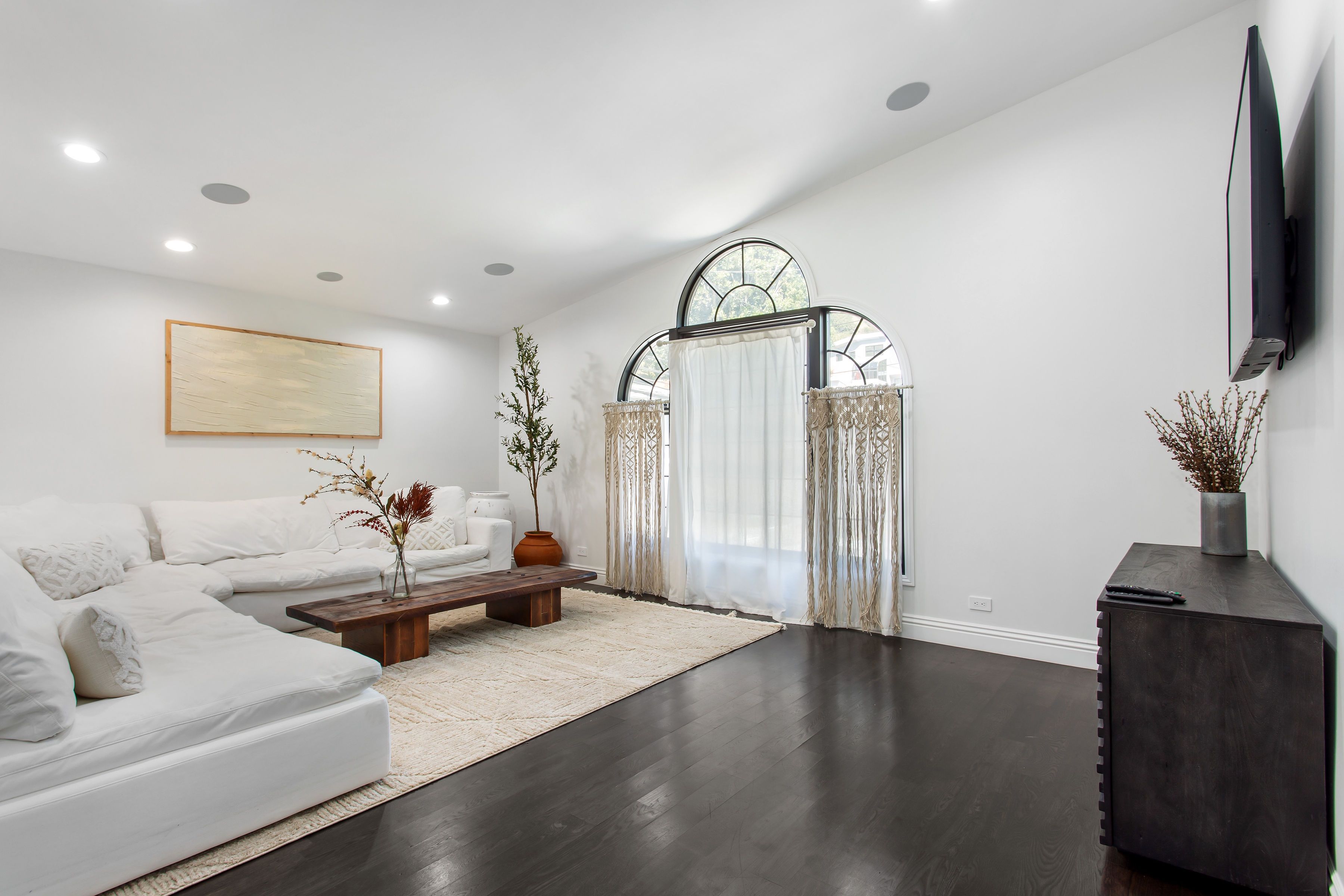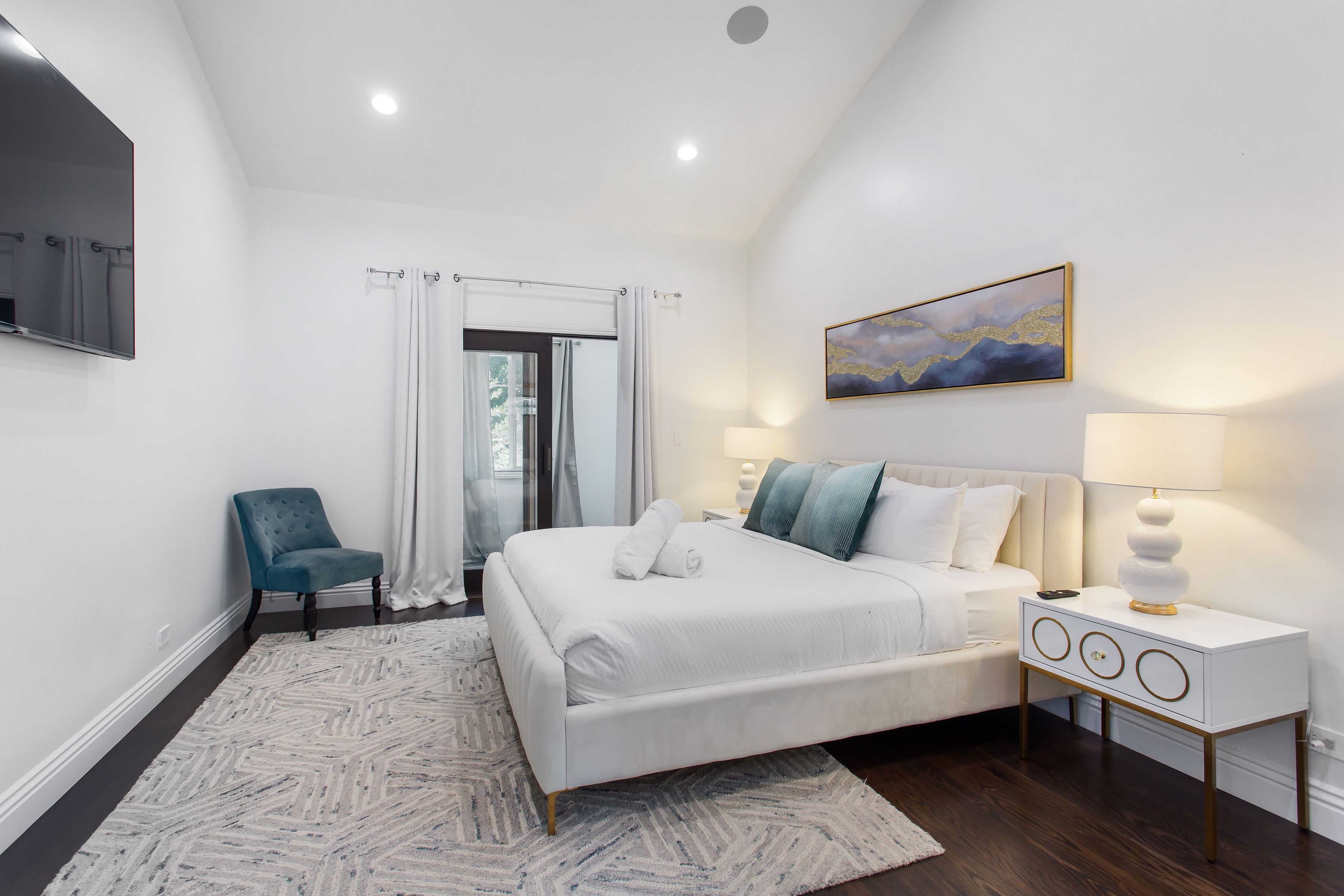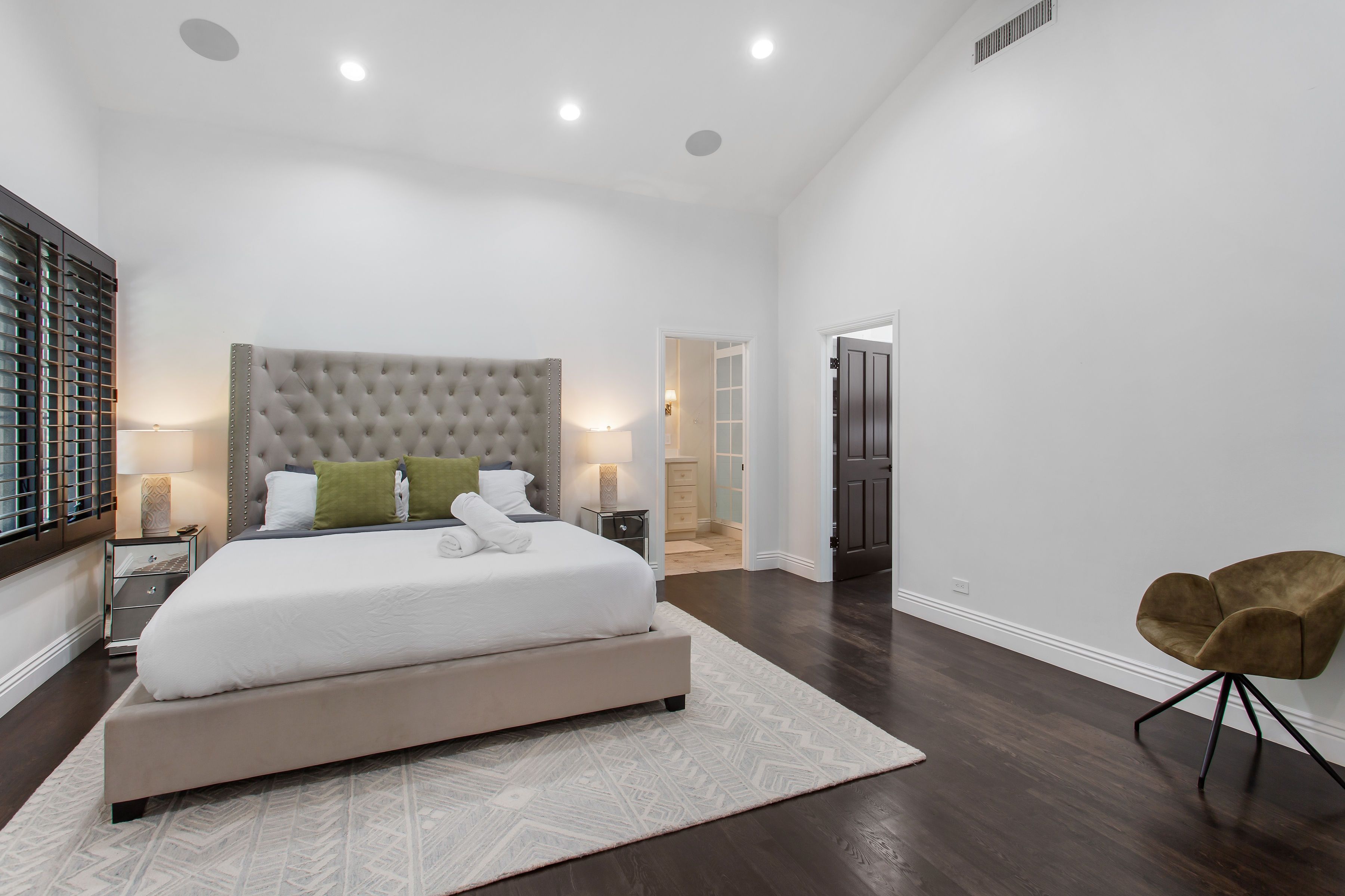 You can relax in the Los Angeles sun in this home’s garden in lower Belair. There’s an outdoor sofa next to the fire pit, a dining area, and a hot tub. Inside, the large arched windows in the living room create a light-filled space that feels serene. For further relaxation, there’s a yoga room or you can chill out playing a game of darts or pool in the games room. Another highlight for us is the main bedroom and its en-suite with its freestanding bathtub. When you want to explore, you’ll need a car or a cab to get around. There’s plenty to see and do, including a range of art galleries and museums or shopping in Beverly Hills.