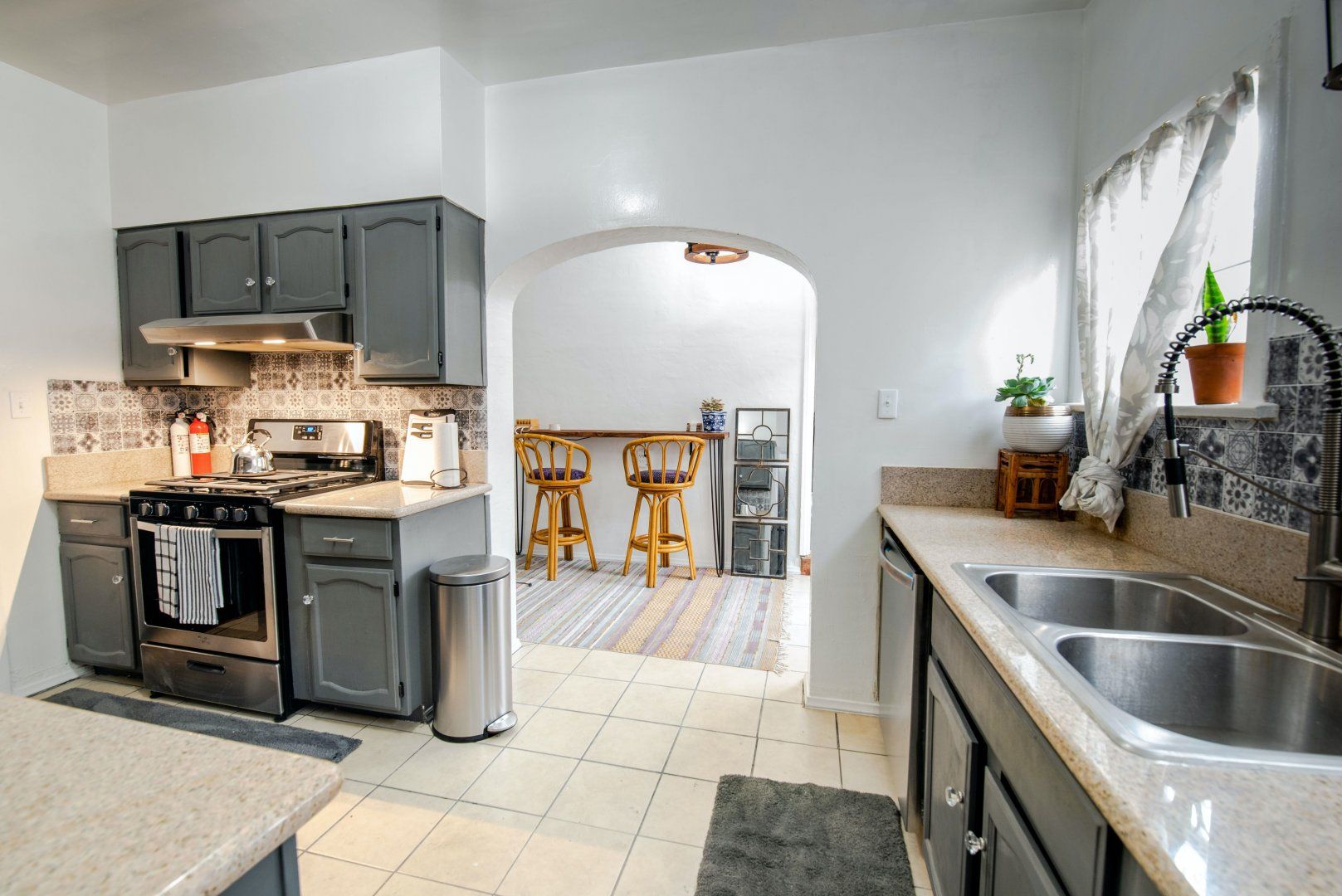 Inside, it's immediately clear that it's been designed by someone who cares about the home – there are warm tones like corals and purples throughout, and they fit right in with the Spanish style of the building. We love the huge arched window in the living room and the period fireplace. There's a really well-equipped kitchen making cooking at home a breeze, and a cosy dining nook (or why not eat outdoors on the patio?).