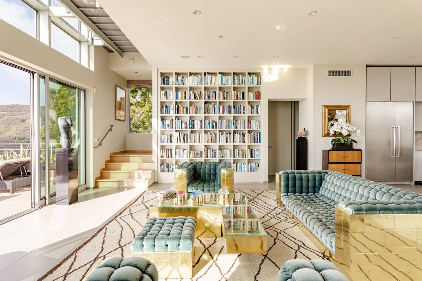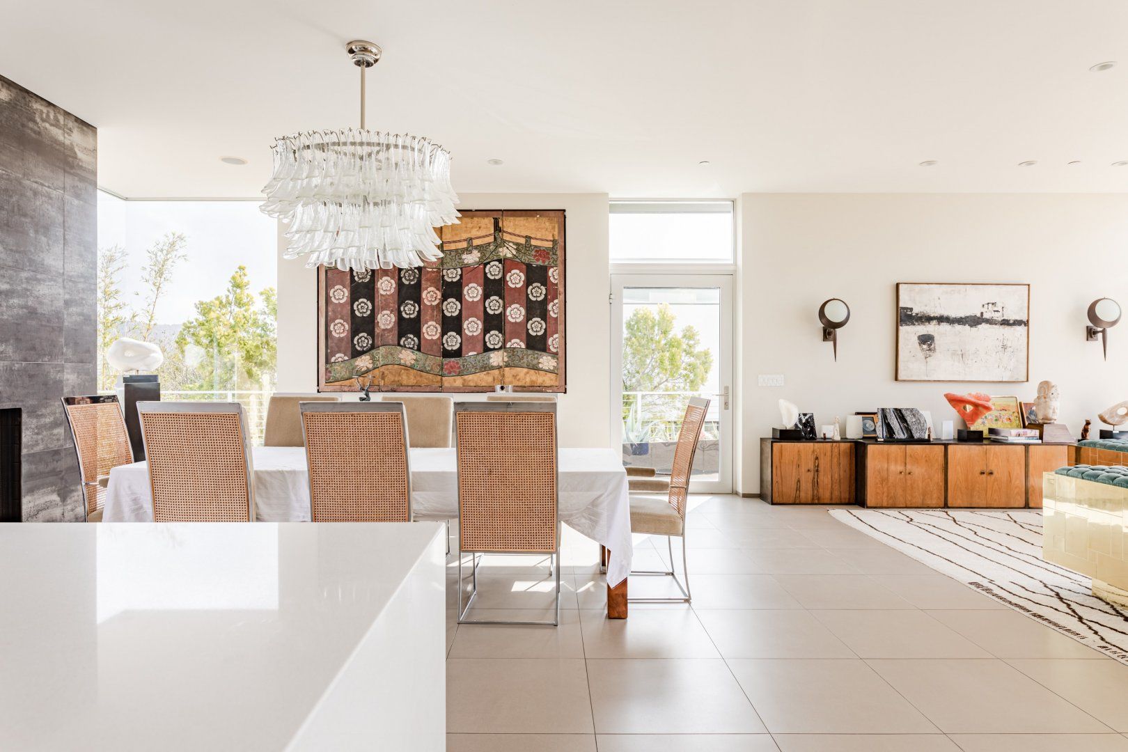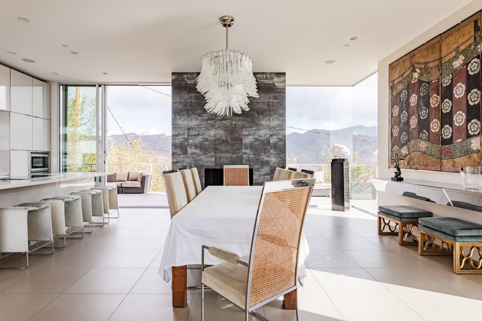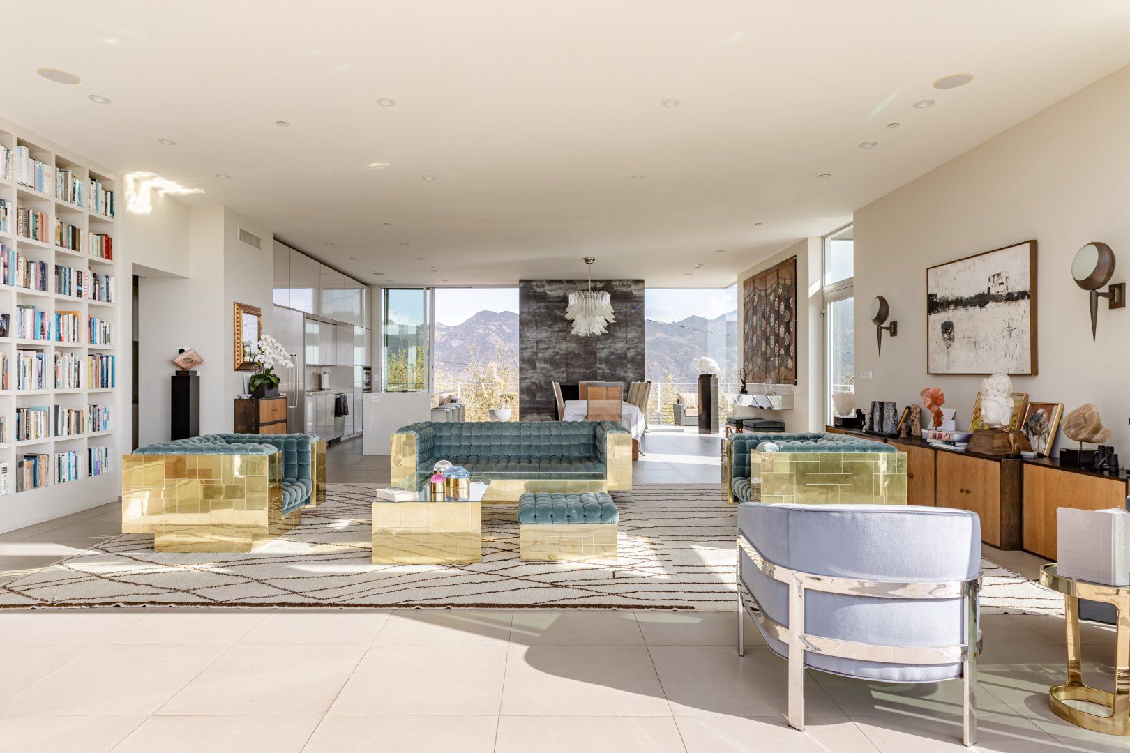 Radiating style, this architectural paradise is undoubtedly one of the more glamorous and unique homes in our Los Angeles edit. It's high above the Malibu surf, so you can soak up the sunshine while watching the changing moods of the Pacific. This home conquers indoor-outdoor living, with retracting glass doors opening up the interior to the elements, allowing you to feel the sea breeze while reading a good book from the floor-to-ceiling library. The open-concept kitchen, dining area and living room benefit from bespoke features like a marble fireplace, a dazzling chandelier, and an antique Asian wall screen.