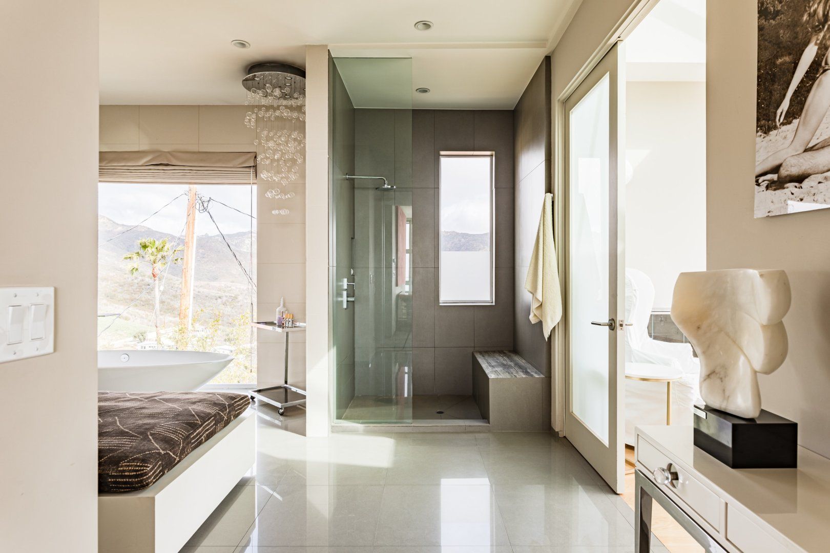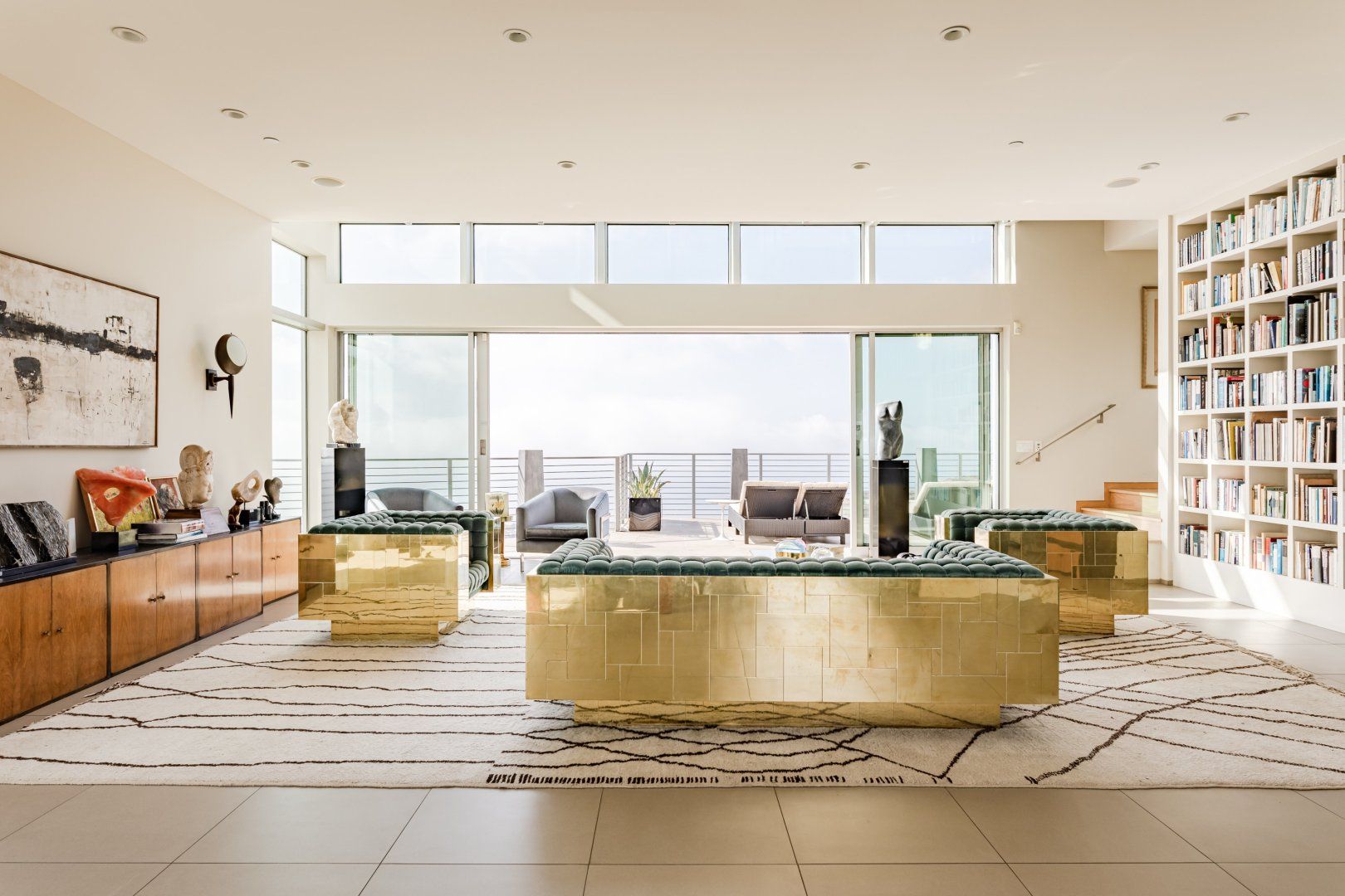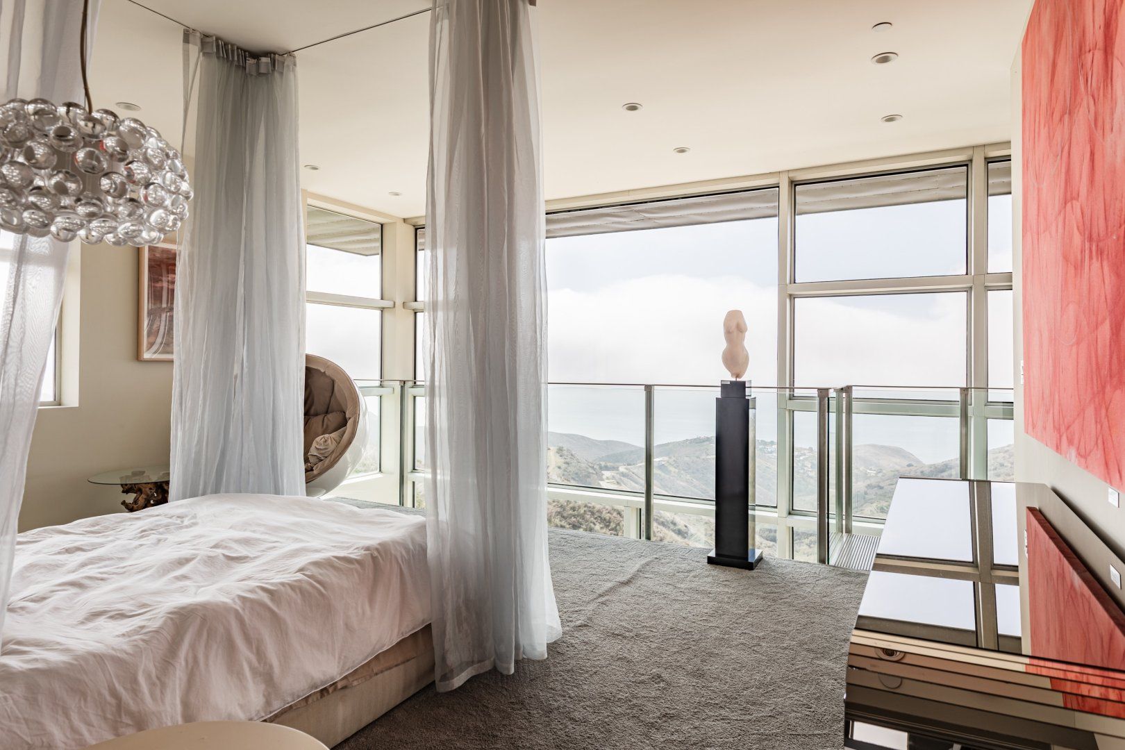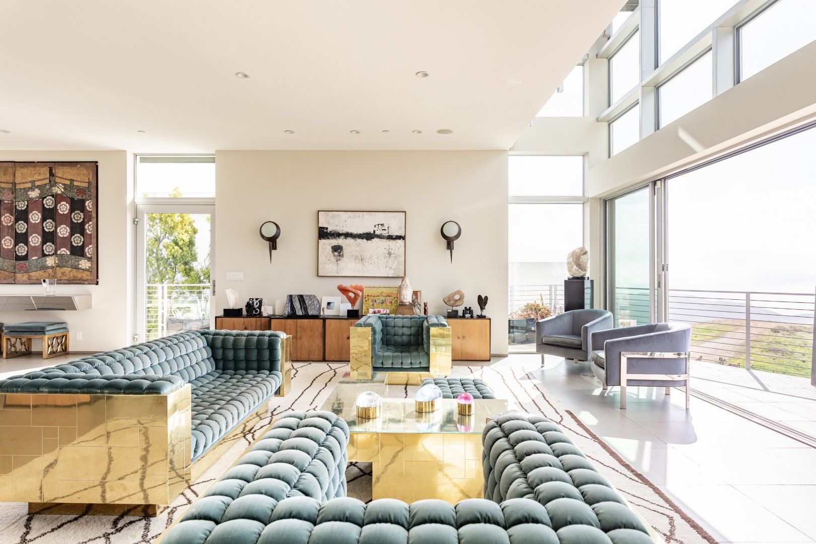 Radiating style, this architectural paradise is undoubtedly one of the more glamorous and unique homes in our Los Angeles edit. It's high above the Malibu surf, so you can soak up the sunshine while watching the changing moods of the Pacific. This home conquers indoor-outdoor living, with retracting glass doors opening up the interior to the elements, allowing you to feel the sea breeze while reading a good book from the floor-to-ceiling library. The open-concept kitchen, dining area and living room benefit from bespoke features like a marble fireplace, a dazzling chandelier, and an antique Asian wall screen.
