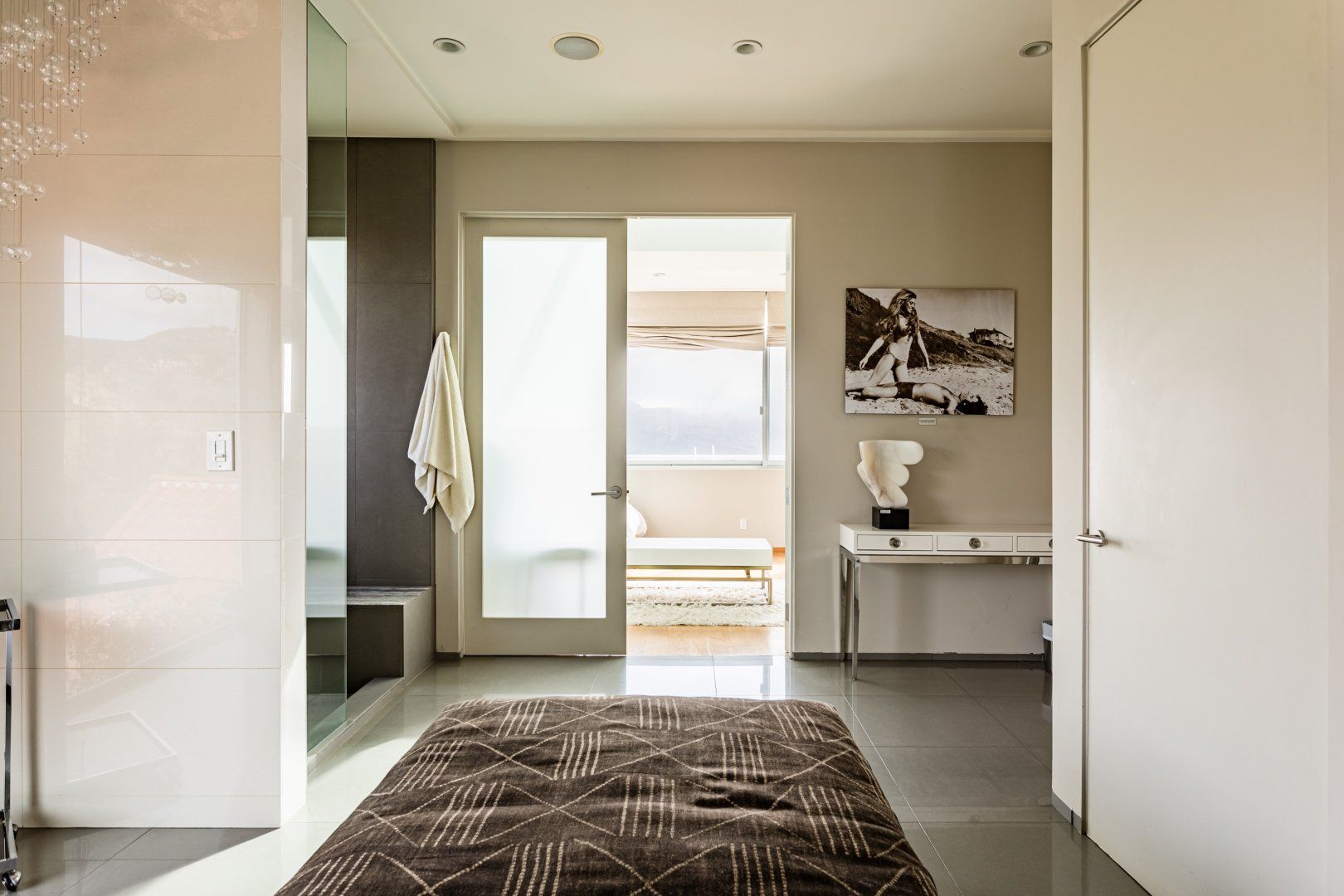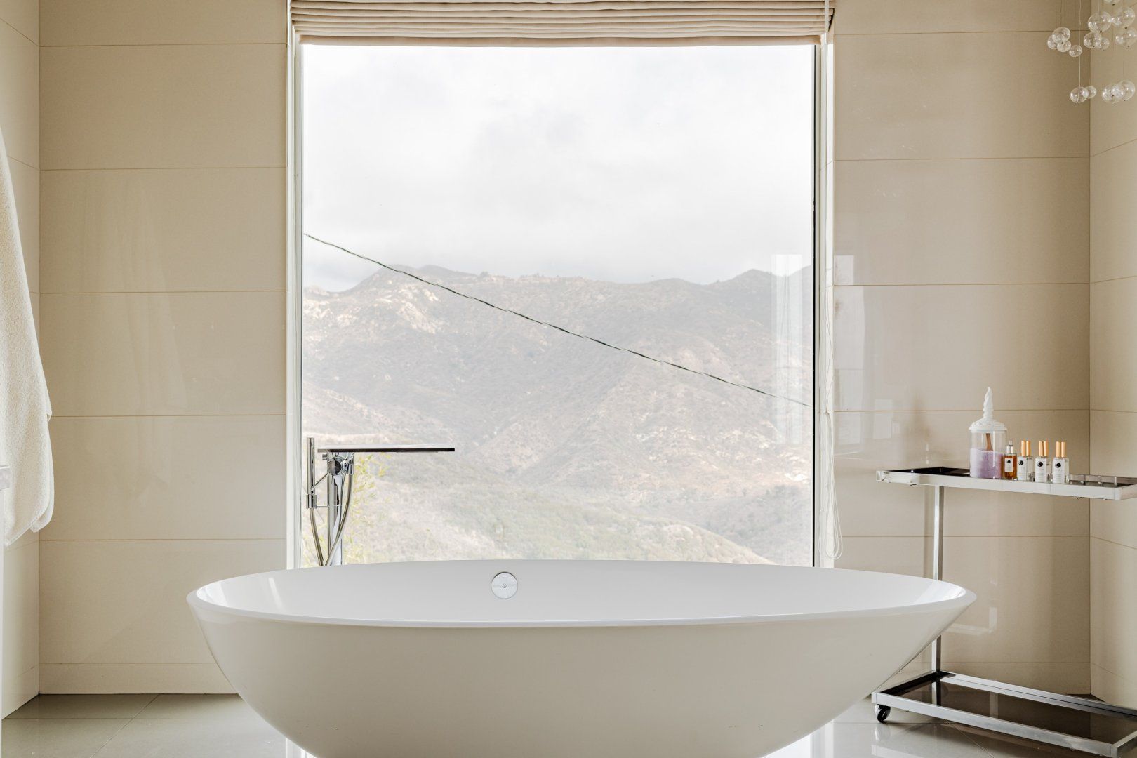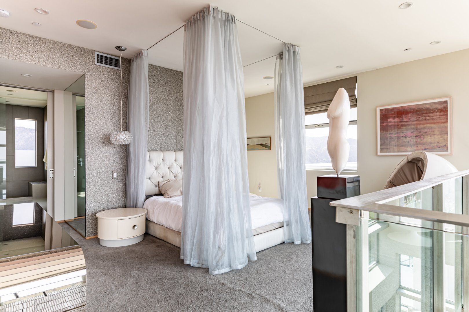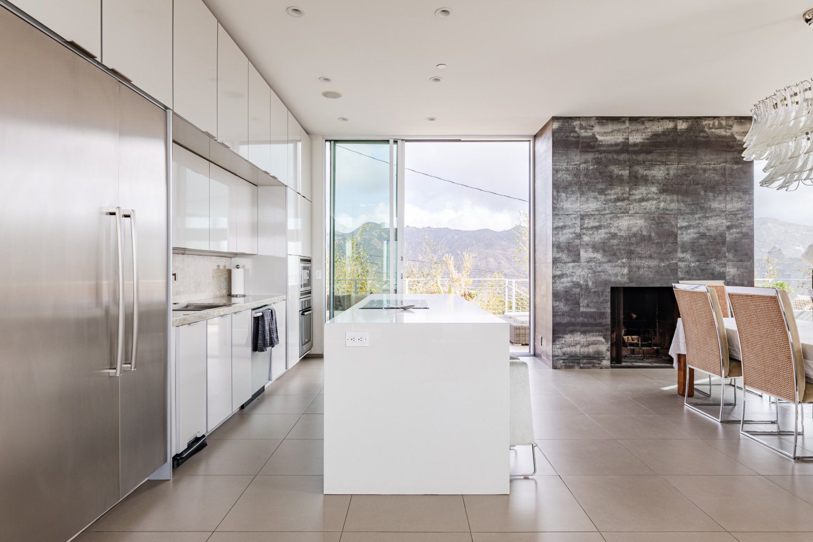 Radiating style, this architectural paradise is undoubtedly one of the more glamorous and unique homes in our Los Angeles edit. It's high above the Malibu surf, so you can soak up the sunshine while watching the changing moods of the Pacific. This home conquers indoor-outdoor living, with retracting glass doors opening up the interior to the elements, allowing you to feel the sea breeze while reading a good book from the floor-to-ceiling library. The open-concept kitchen, dining area and living room benefit from bespoke features like a marble fireplace, a dazzling chandelier, and an antique Asian wall screen.