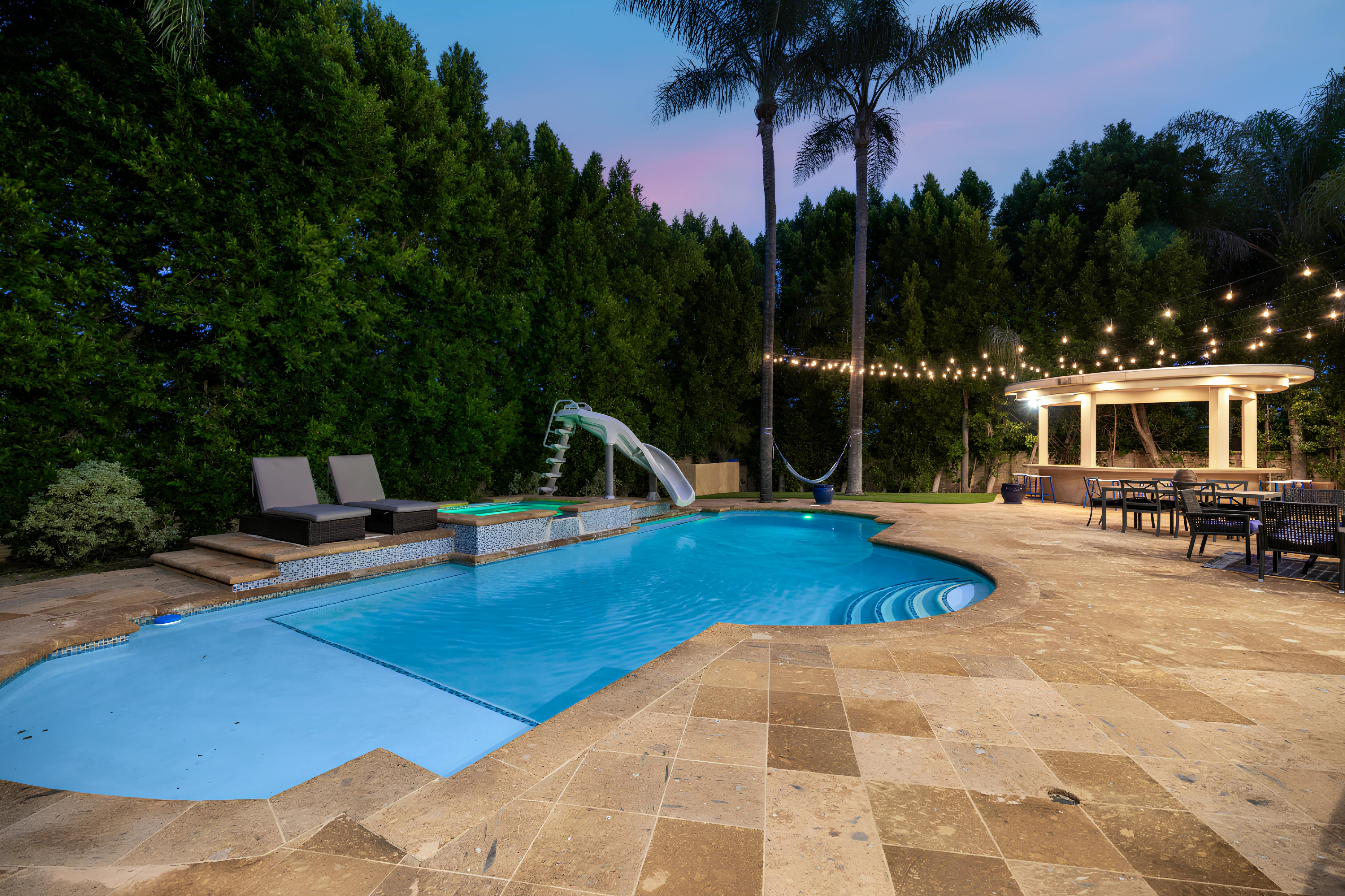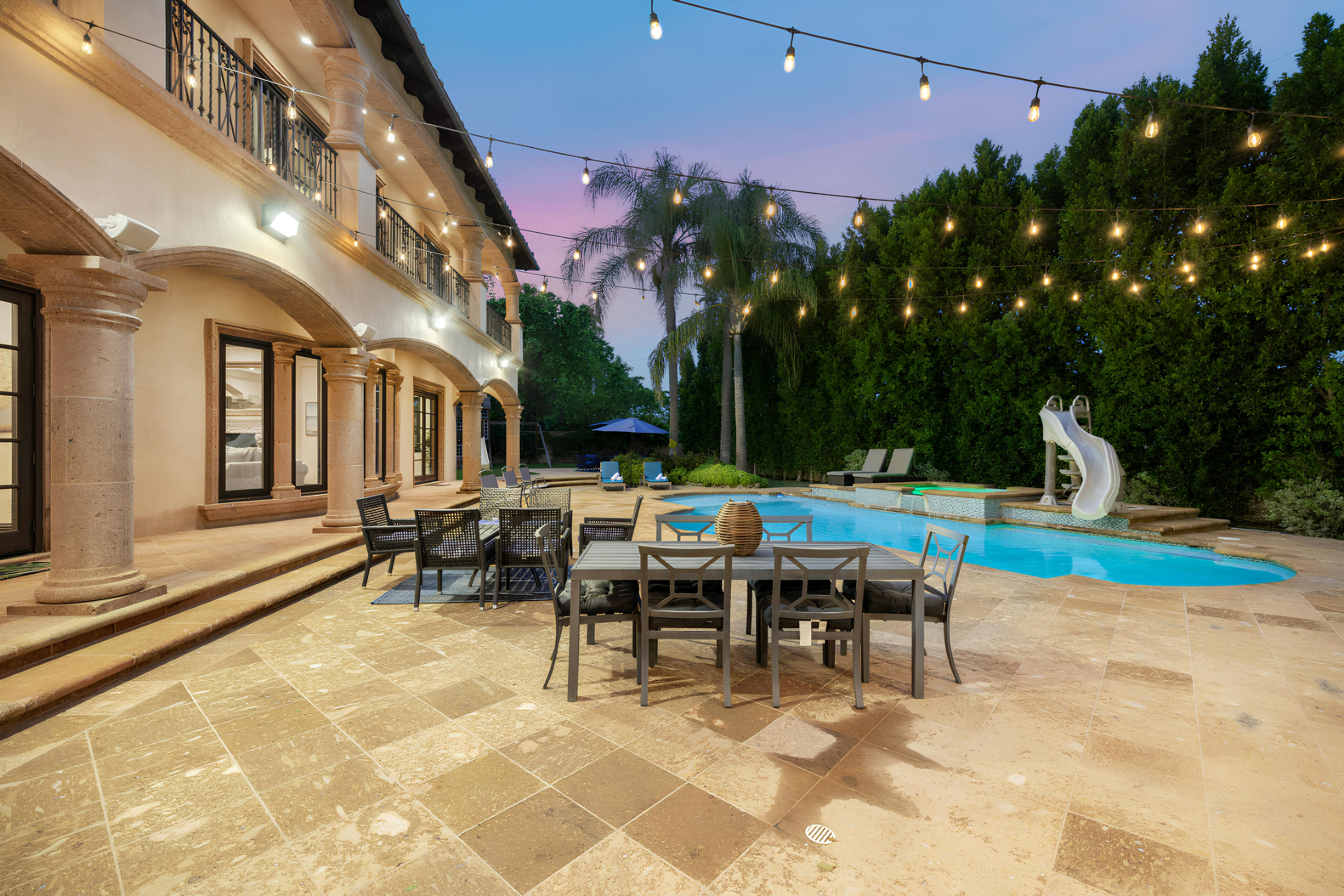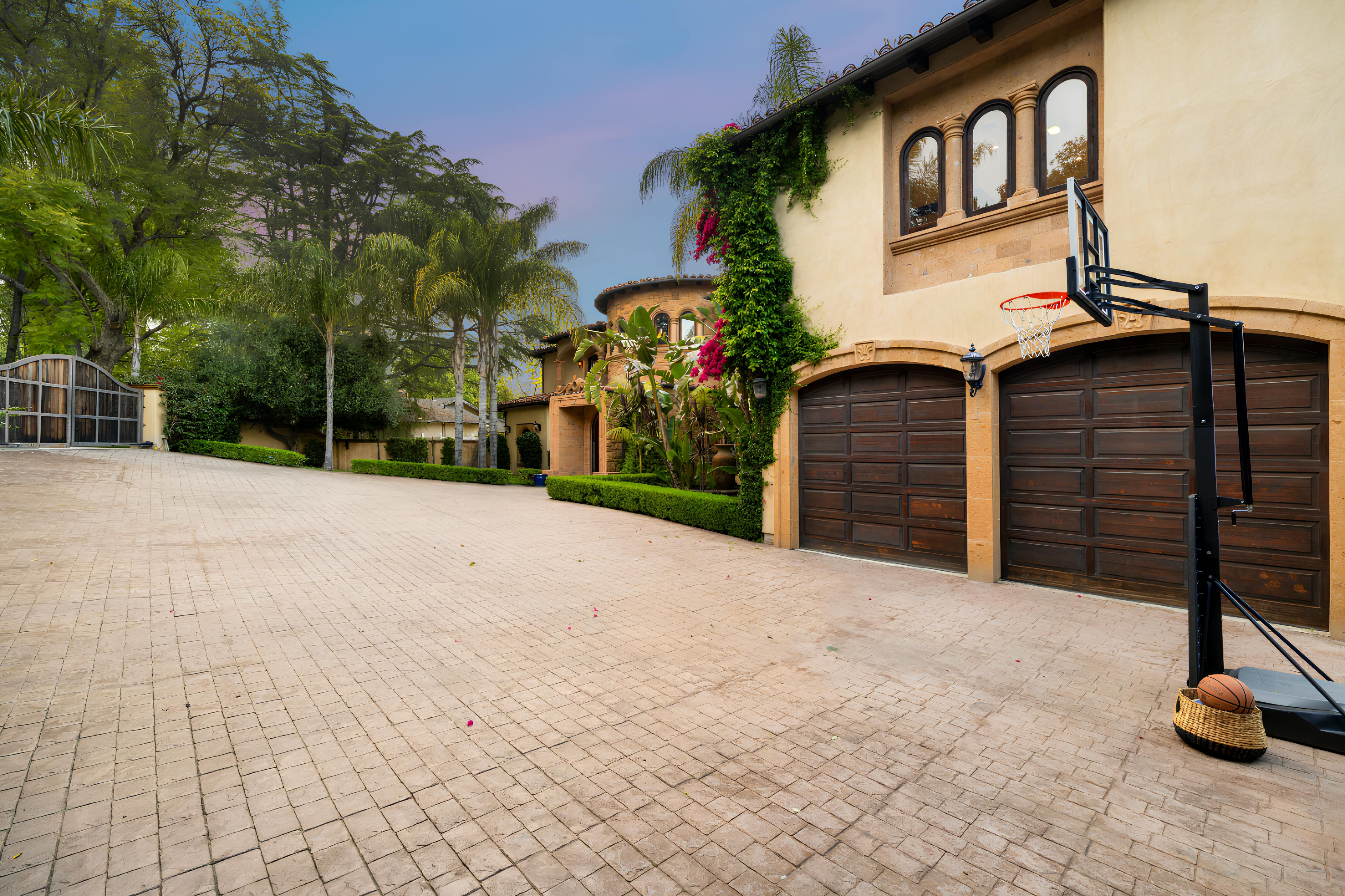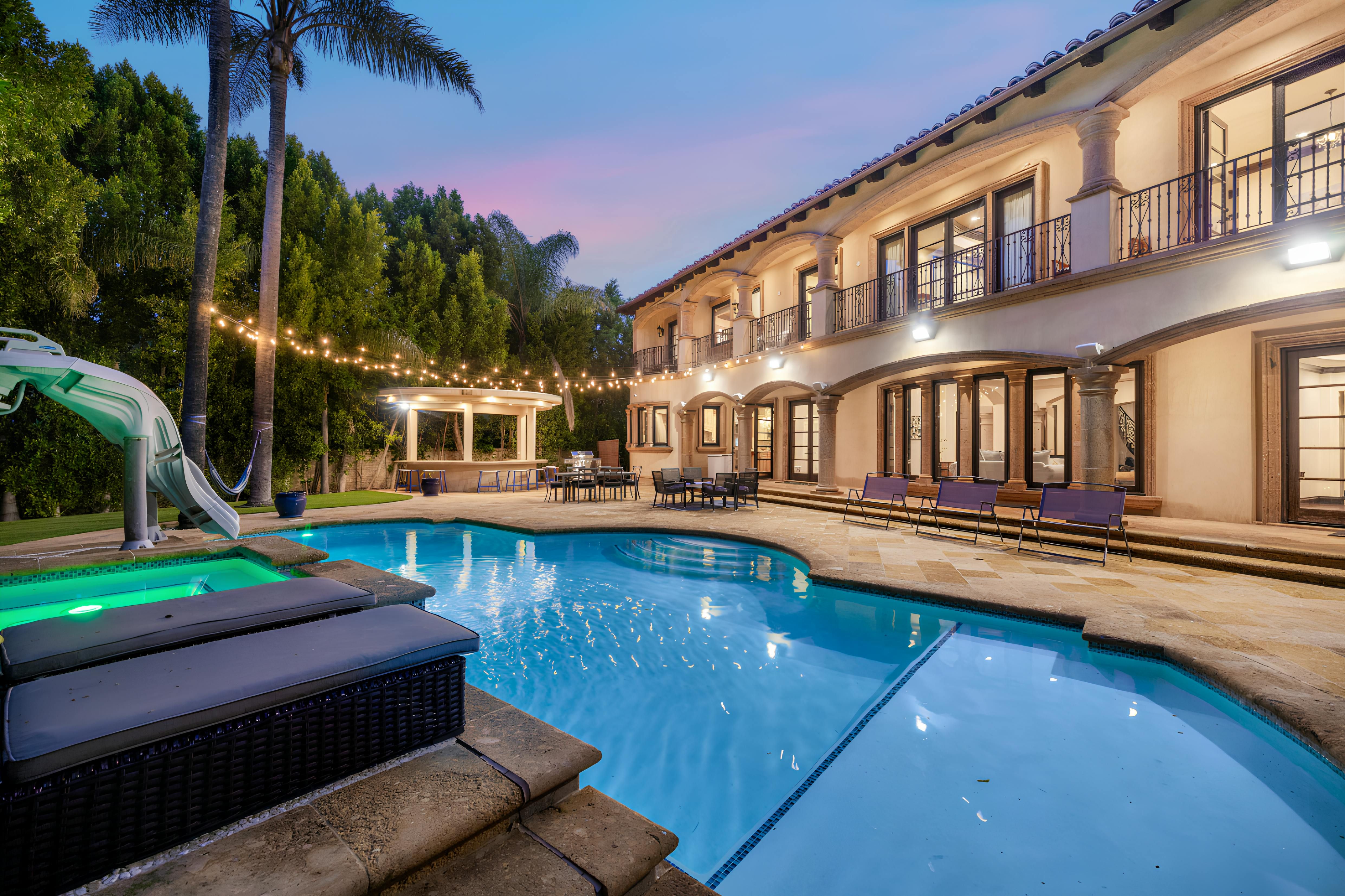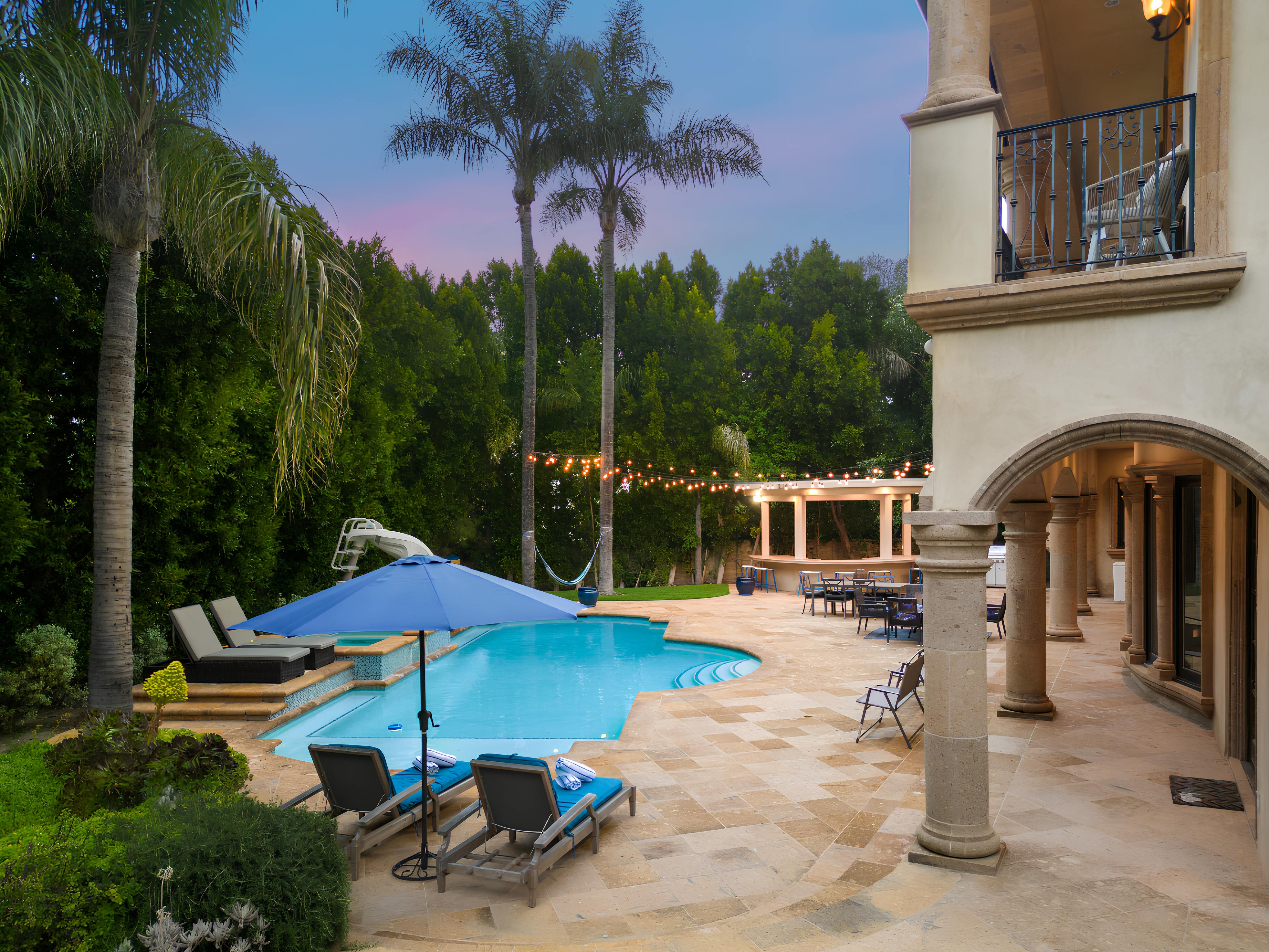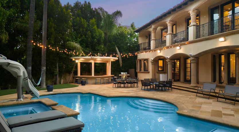 Taking inspiration from Tuscany and the Mediterranean, this home makes a tranquil retreat just a five-minute drive from Ventura Boulevard. Outside, the garden is decorated with fairy lights, creating the perfect atmosphere for summer barbecues and evening drinks. There's a private pool, a play area for children, and a basketball hoop out front if you're feeling sporty. Venture inside to unwind in front of the fire, or, better yet, cosy up in the home theatre for a movie night. With eight roomy bedrooms, including a sumptuous main suite, it's a great option for large families.