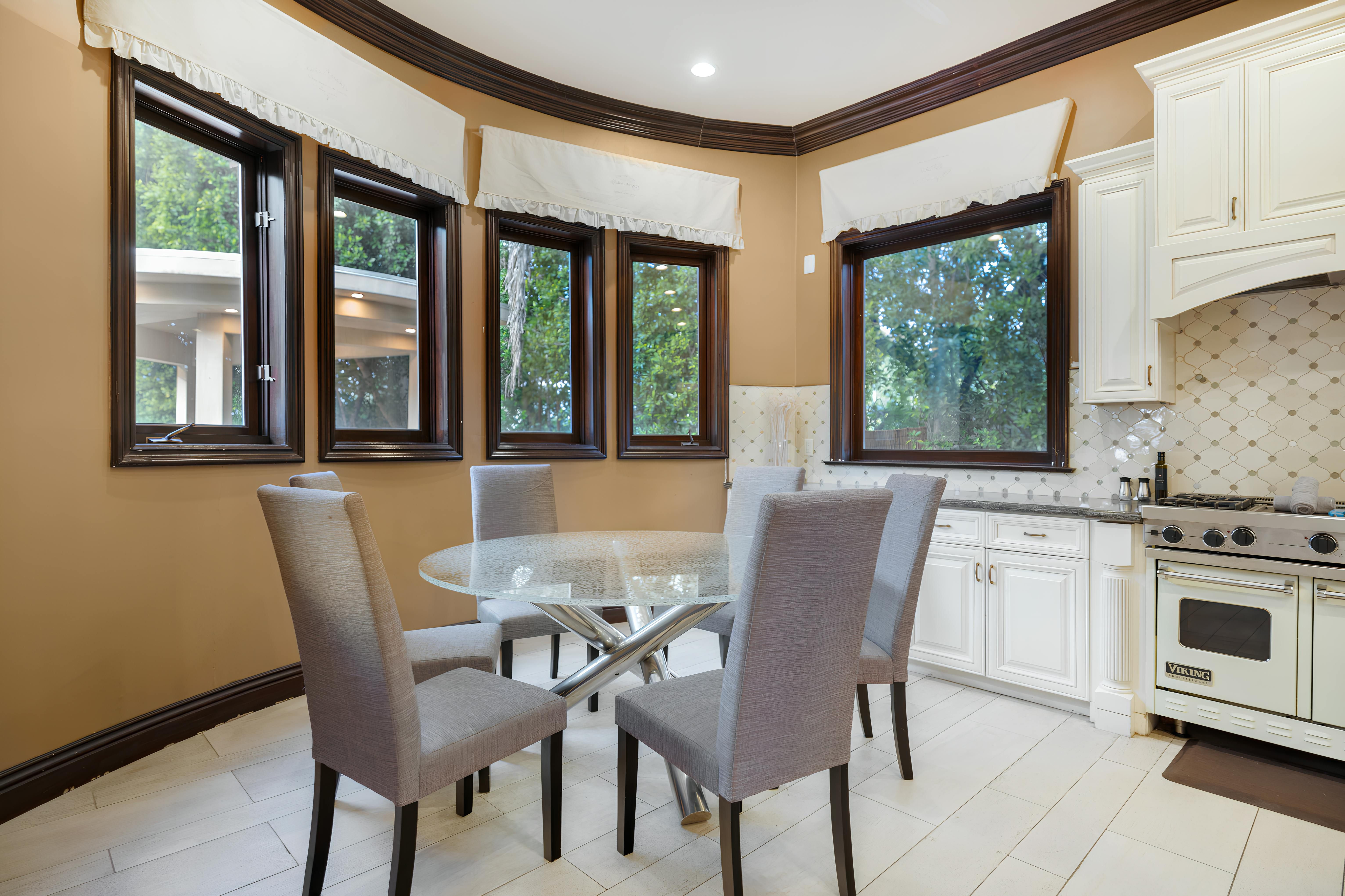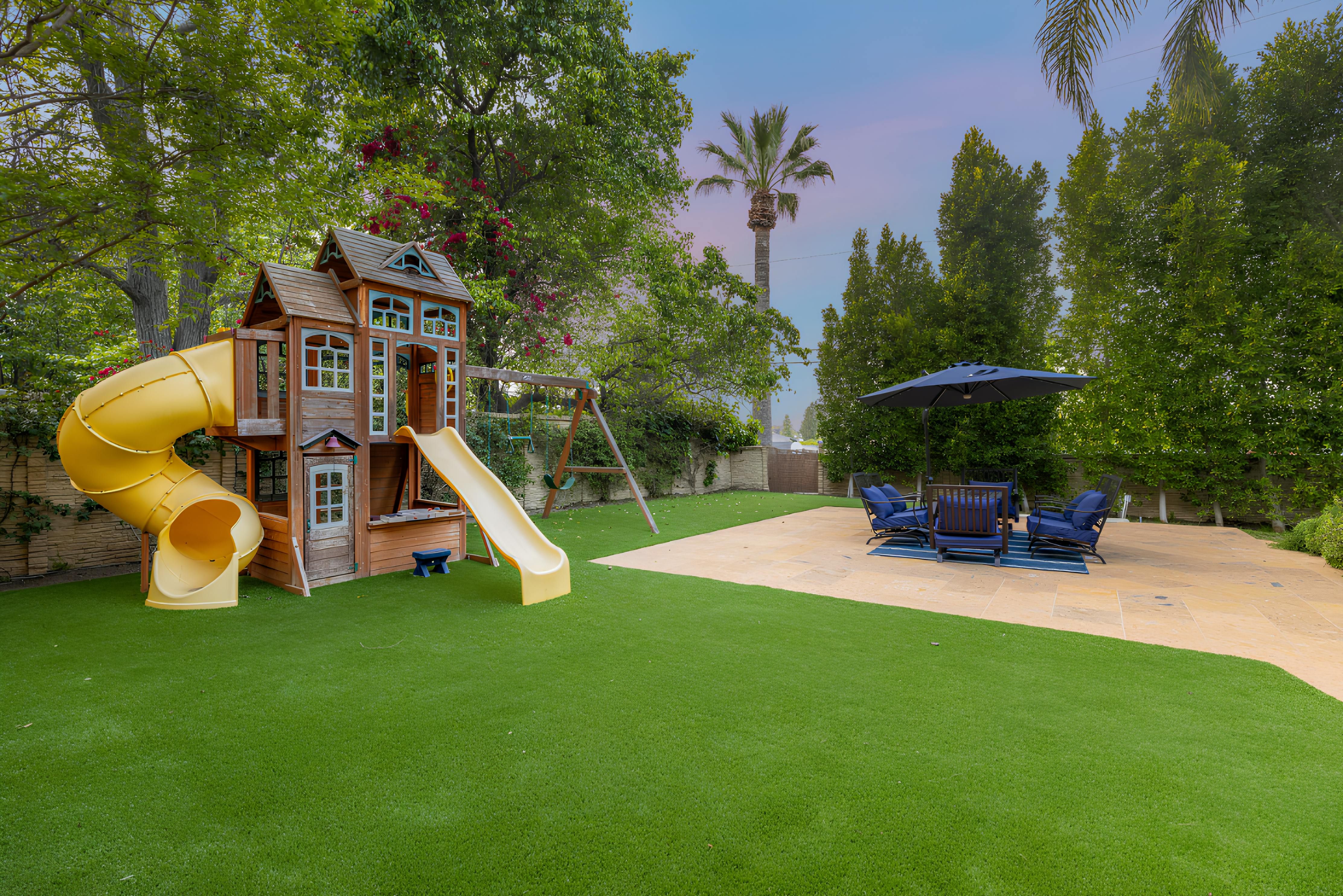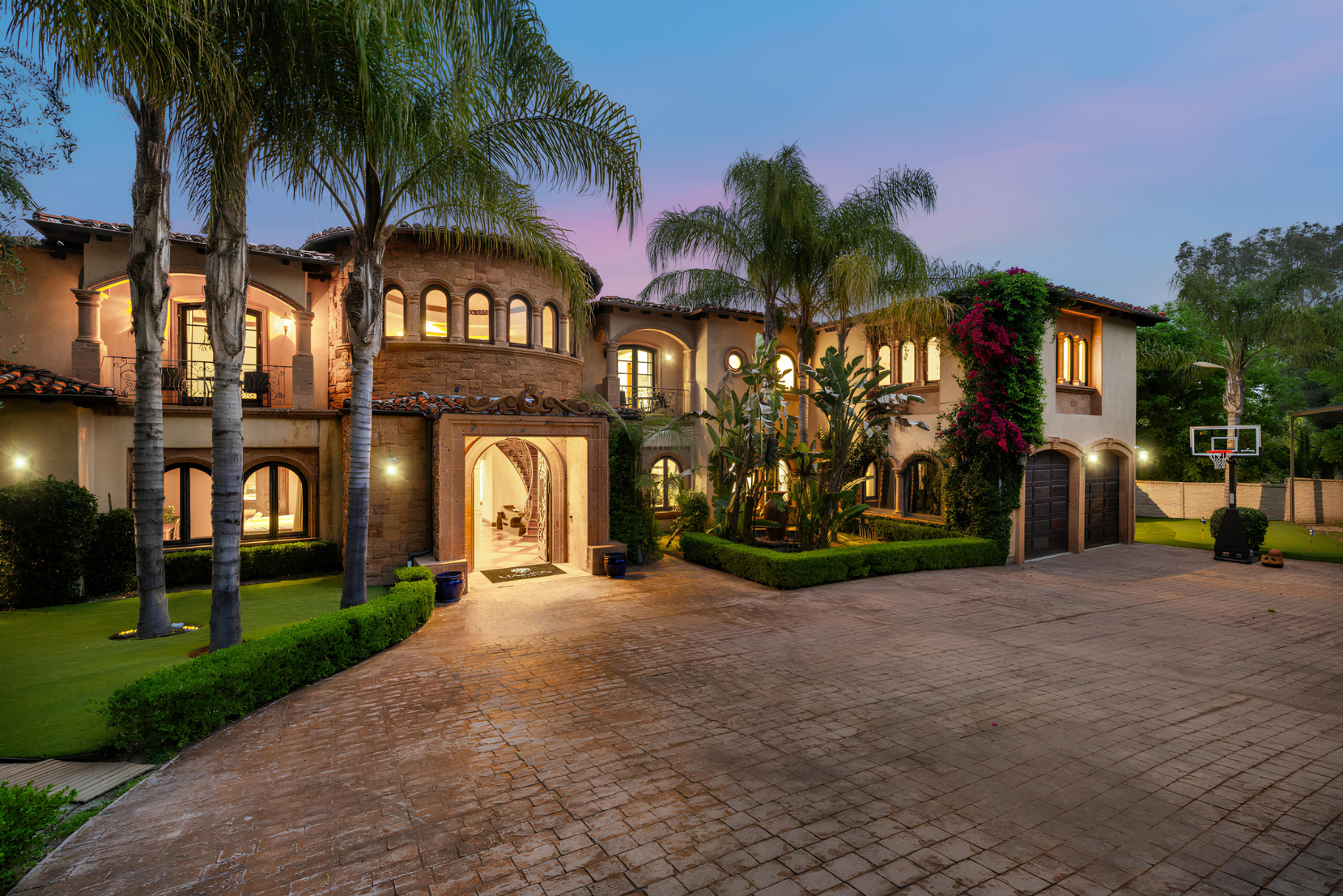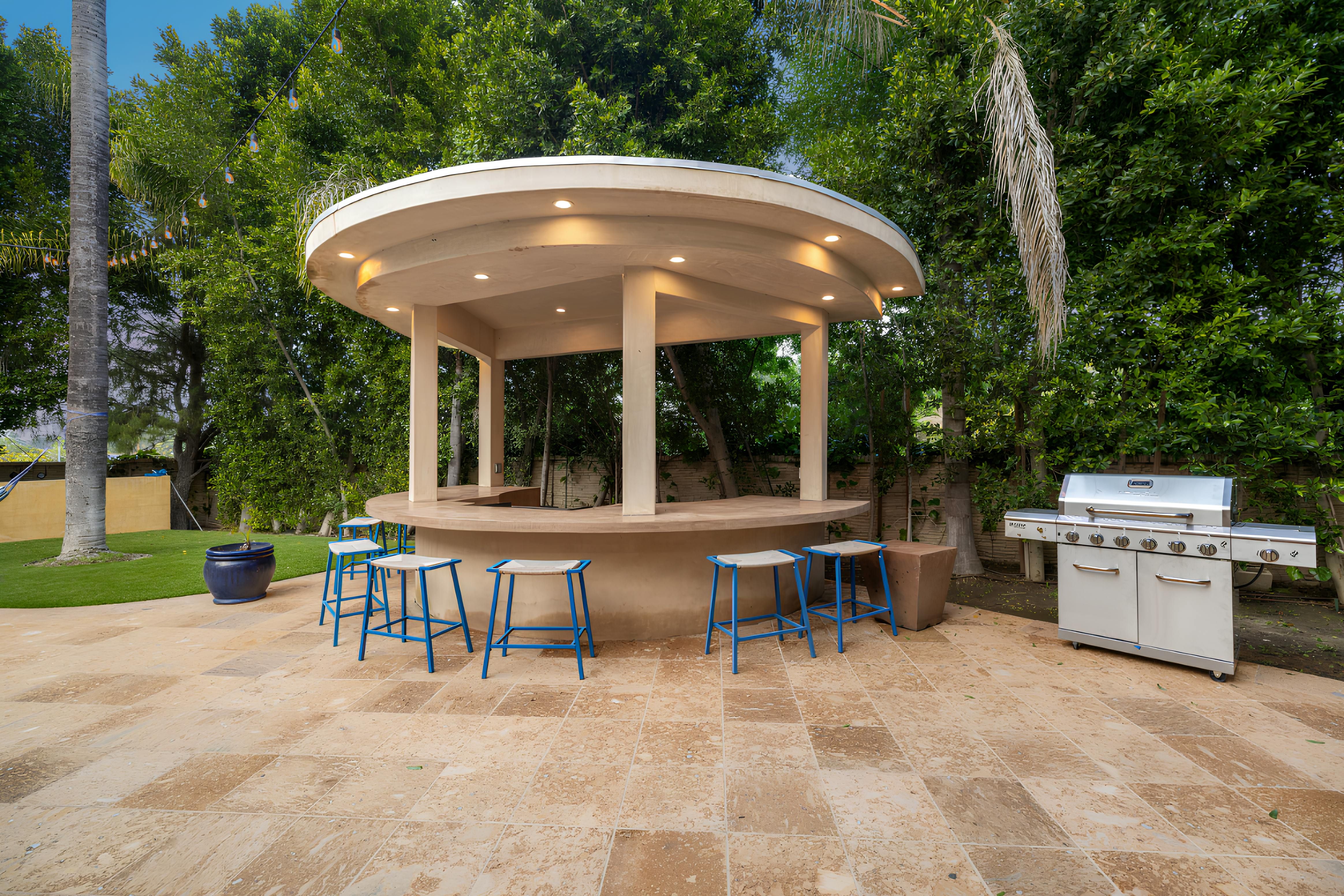 Taking inspiration from Tuscany and the Mediterranean, this home makes a tranquil retreat just a five-minute drive from Ventura Boulevard. Outside, the garden is decorated with fairy lights, creating the perfect atmosphere for summer barbecues and evening drinks. There's a private pool, a play area for children, and a basketball hoop out front if you're feeling sporty. Venture inside to unwind in front of the fire, or, better yet, cosy up in the home theatre for a movie night. With eight roomy bedrooms, including a sumptuous main suite, it's a great option for large families.