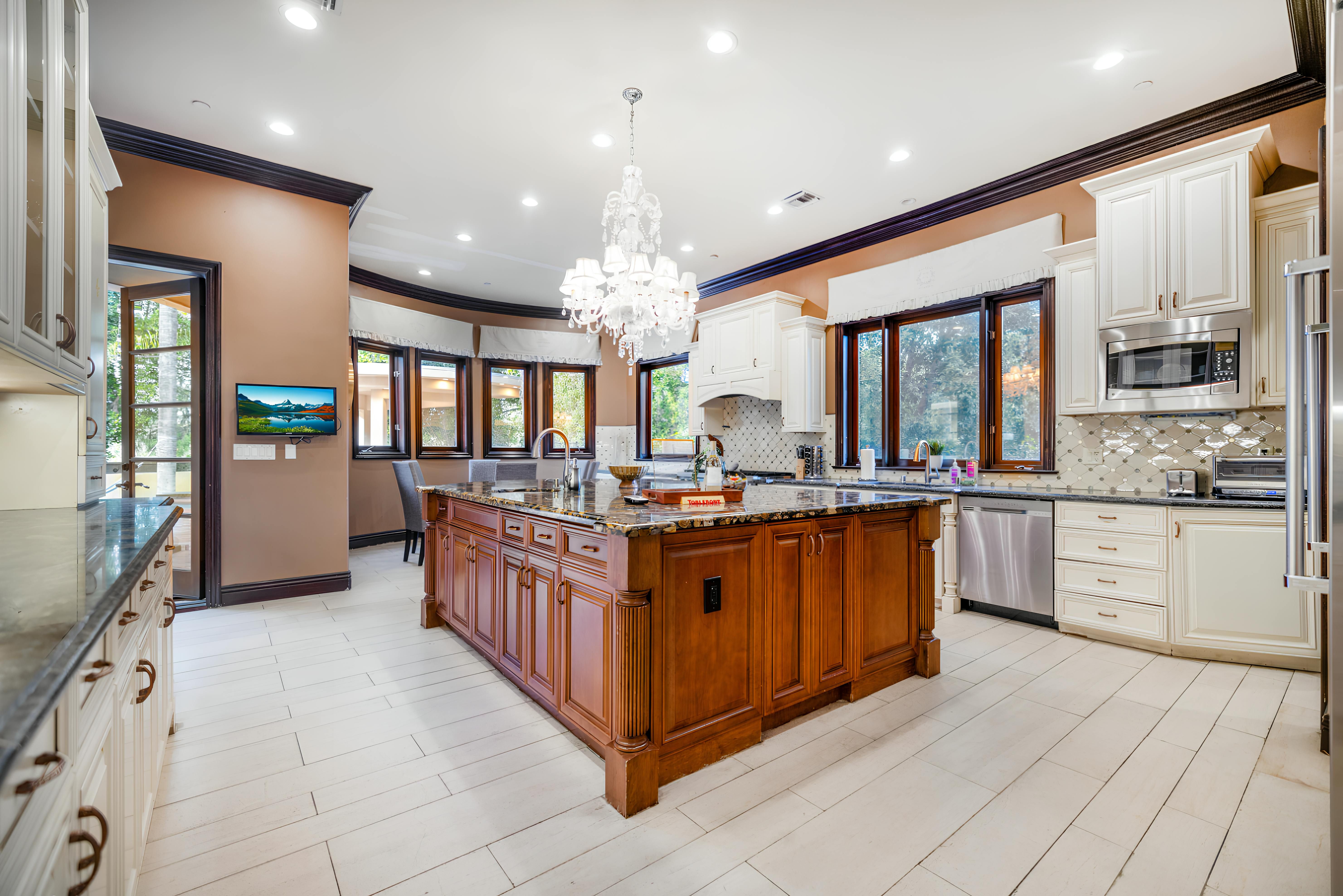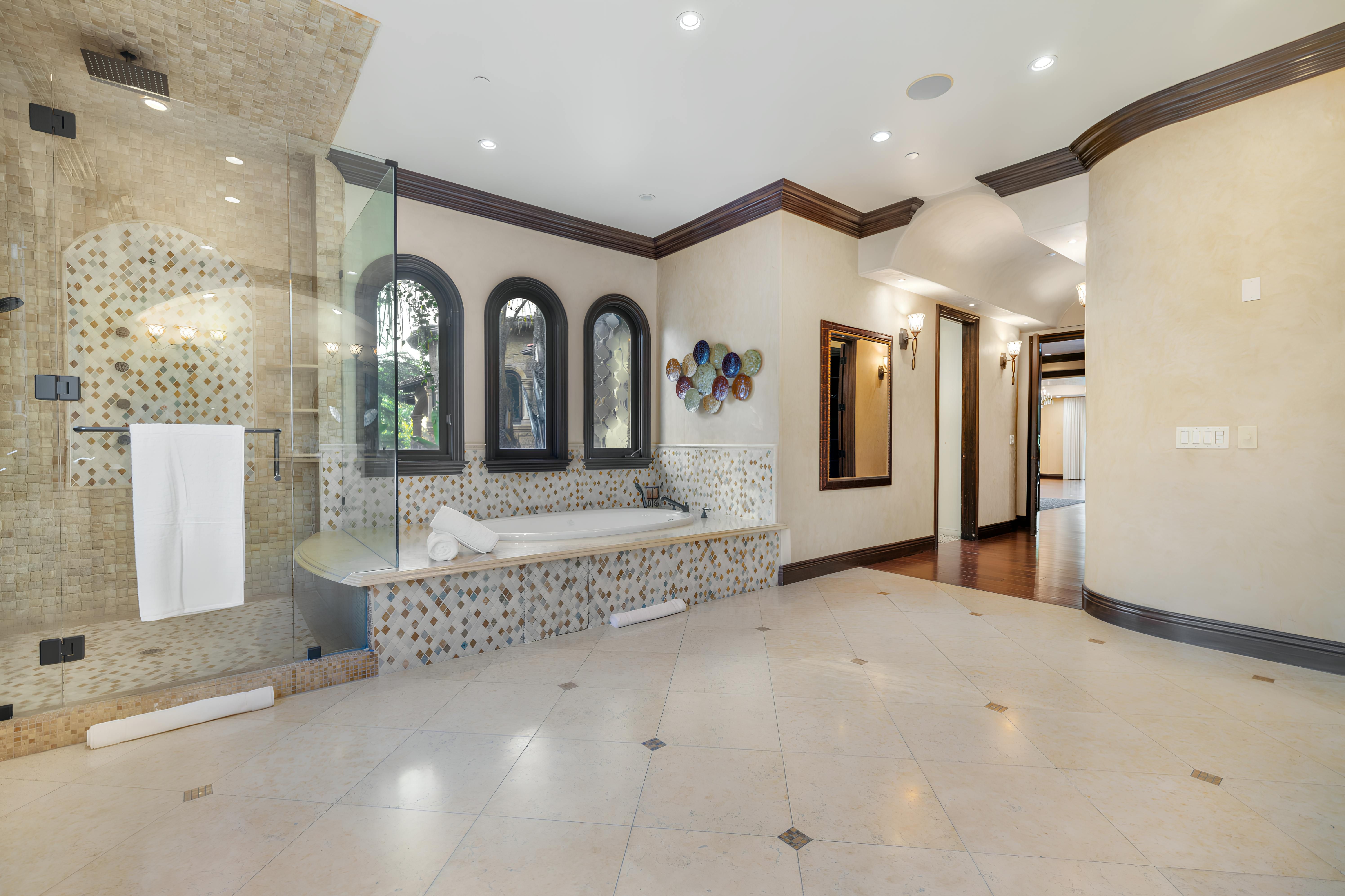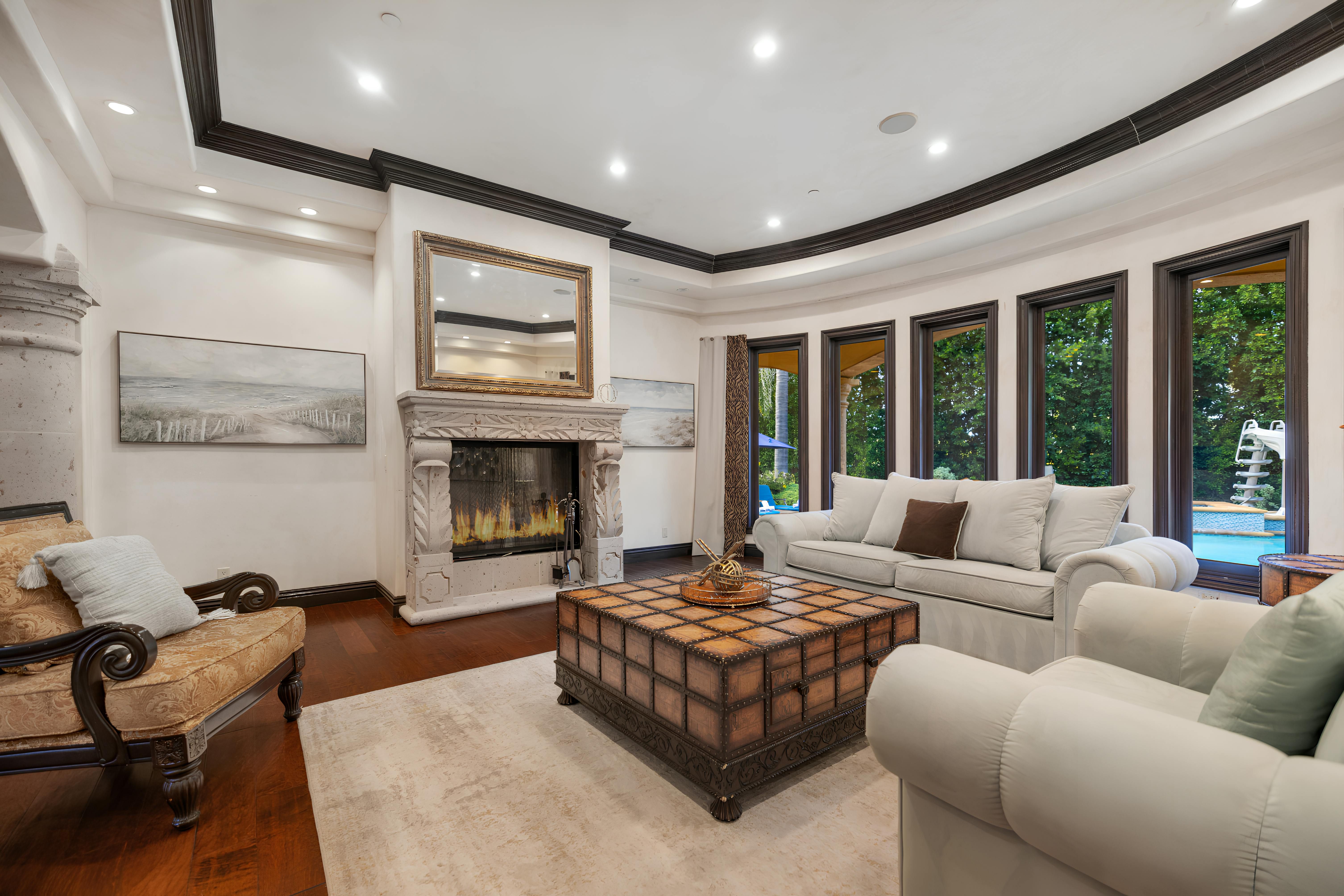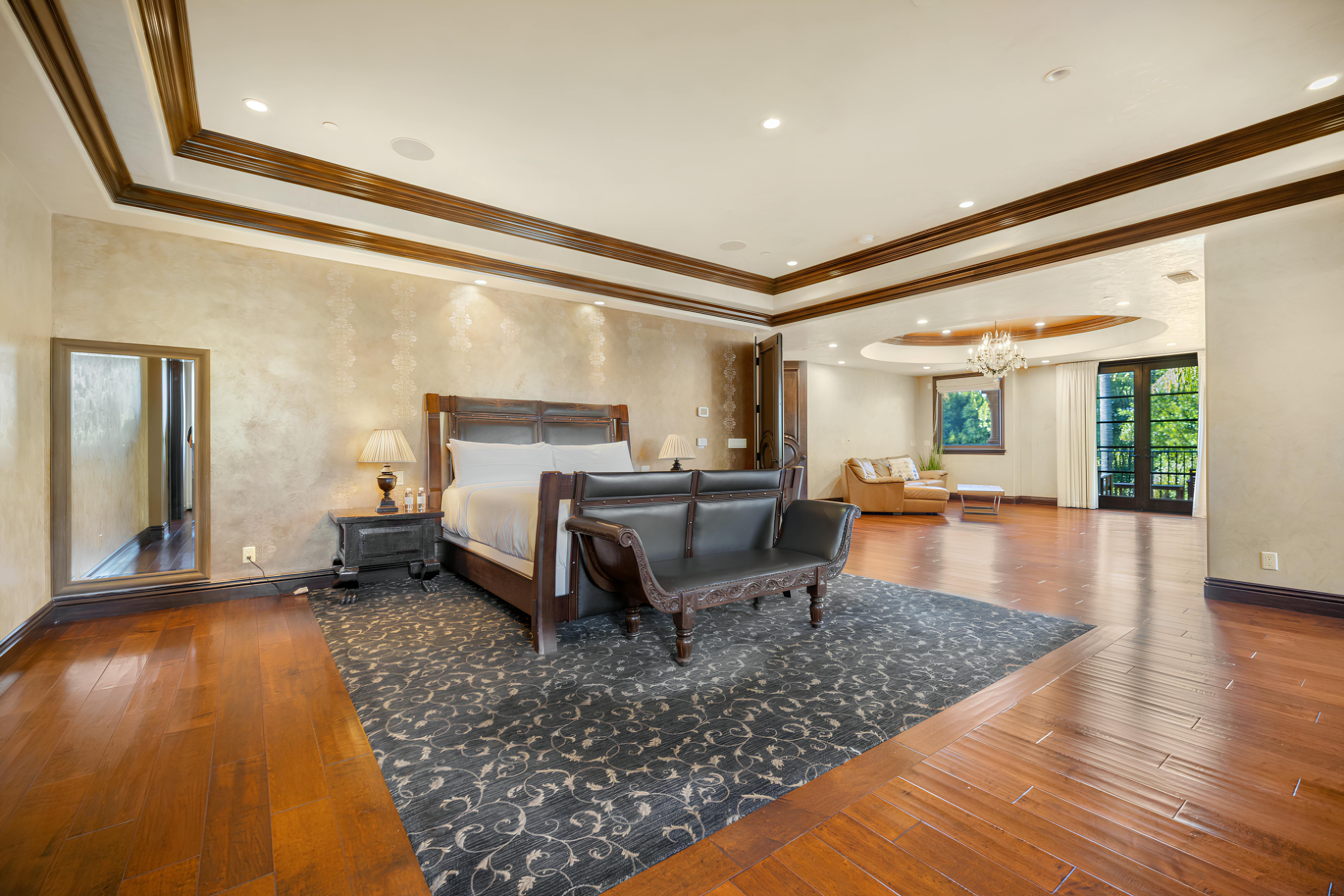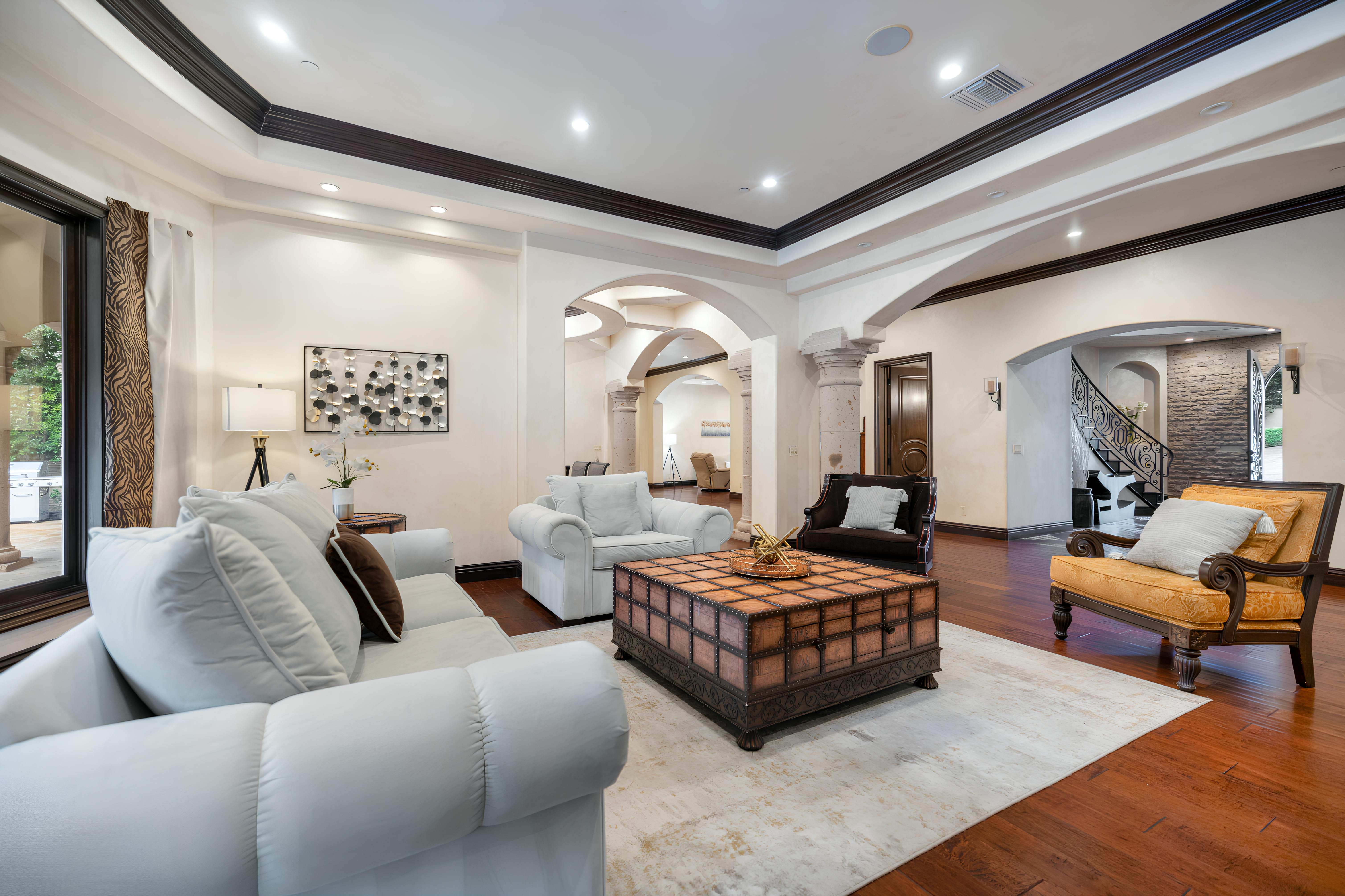Taking inspiration from Tuscany and the Mediterranean, this home makes a tranquil retreat just a five-minute drive from Ventura Boulevard. Outside, the garden is decorated with fairy lights, creating the perfect atmosphere for summer barbecues and evening drinks. There's a private pool, a play area for children, and a basketball hoop out front if you're feeling sporty. Venture inside to unwind in front of the fire, or, better yet, cosy up in the home theatre for a movie night. With eight roomy bedrooms, including a sumptuous main suite, it's a great option for large families.