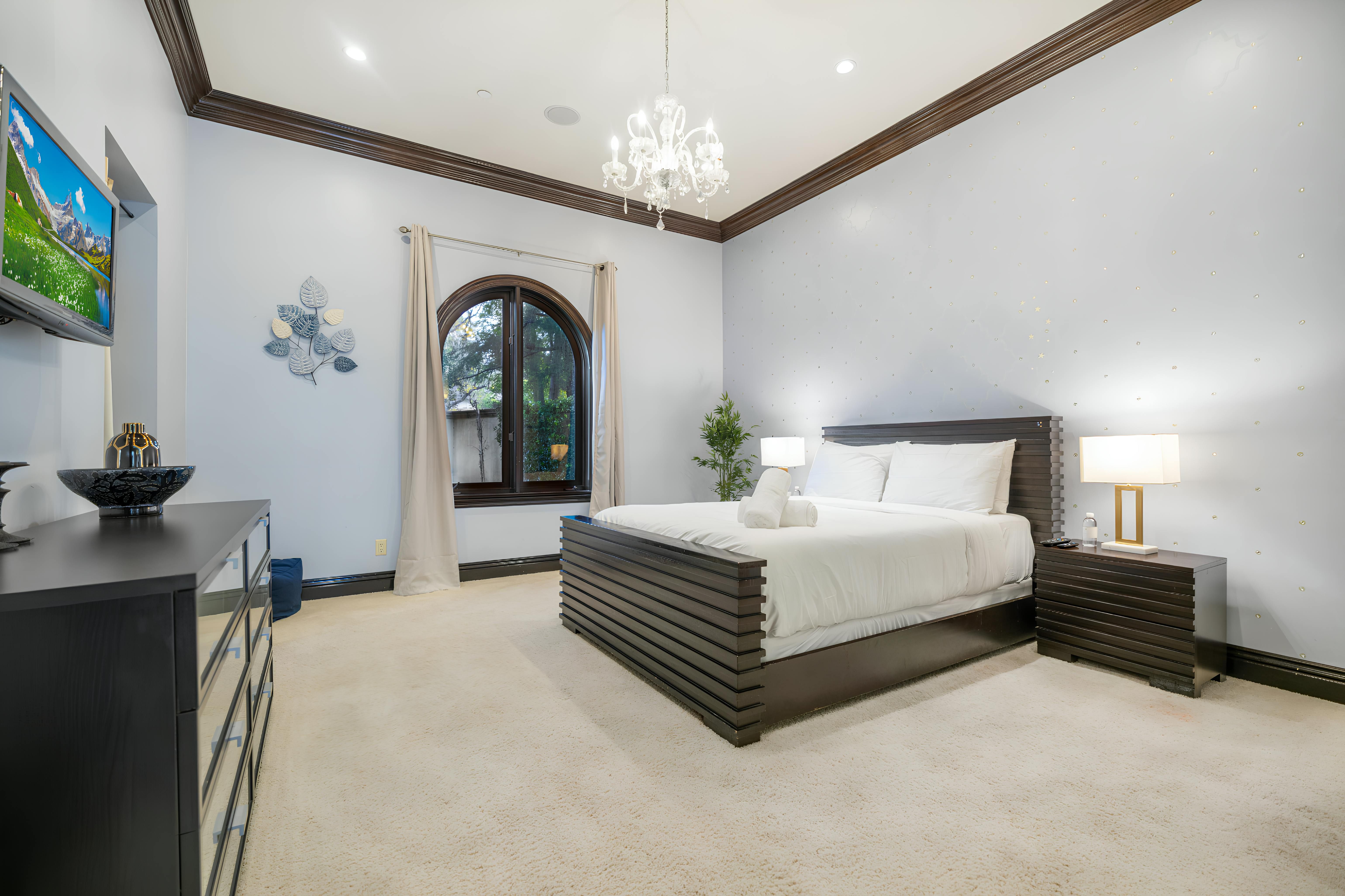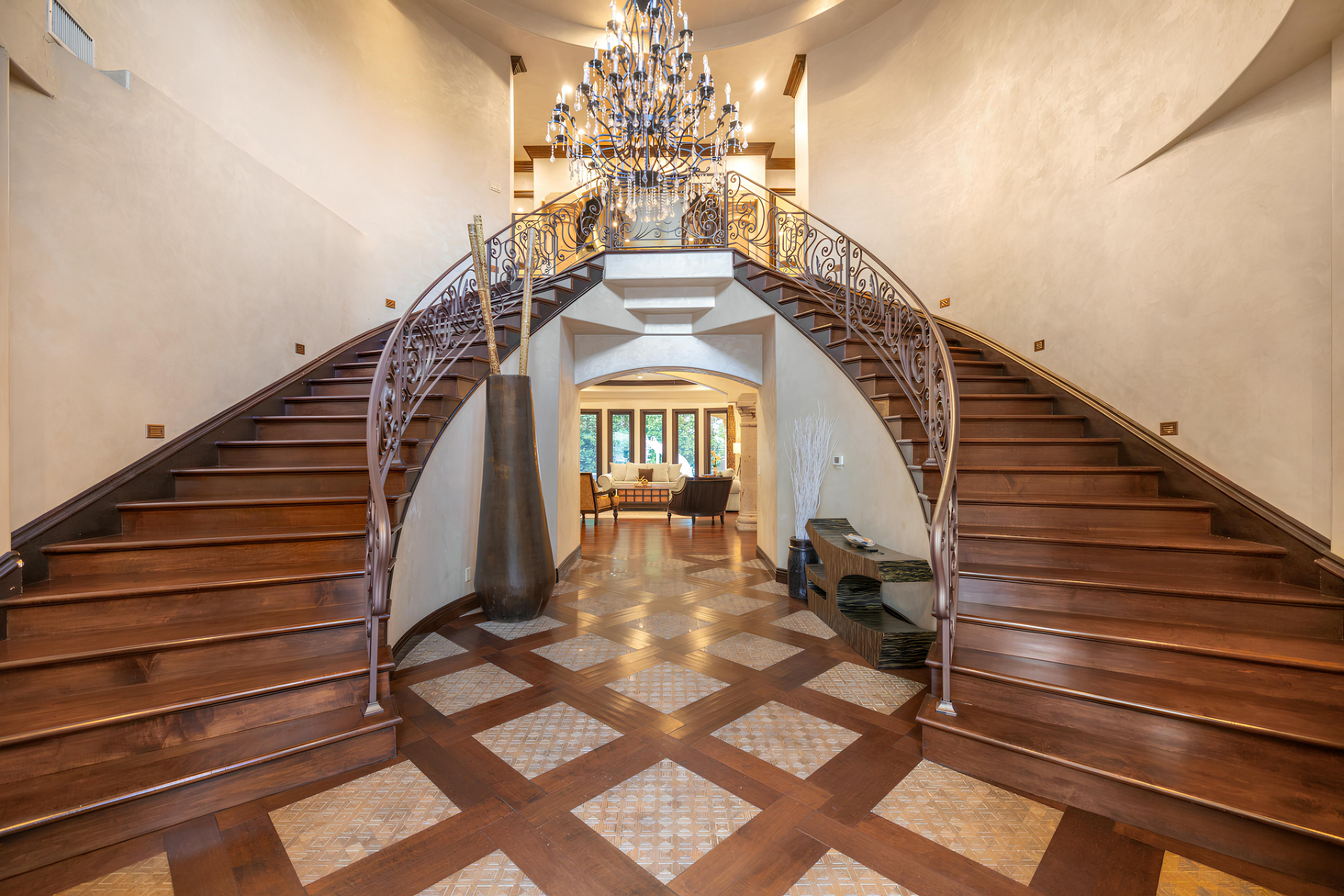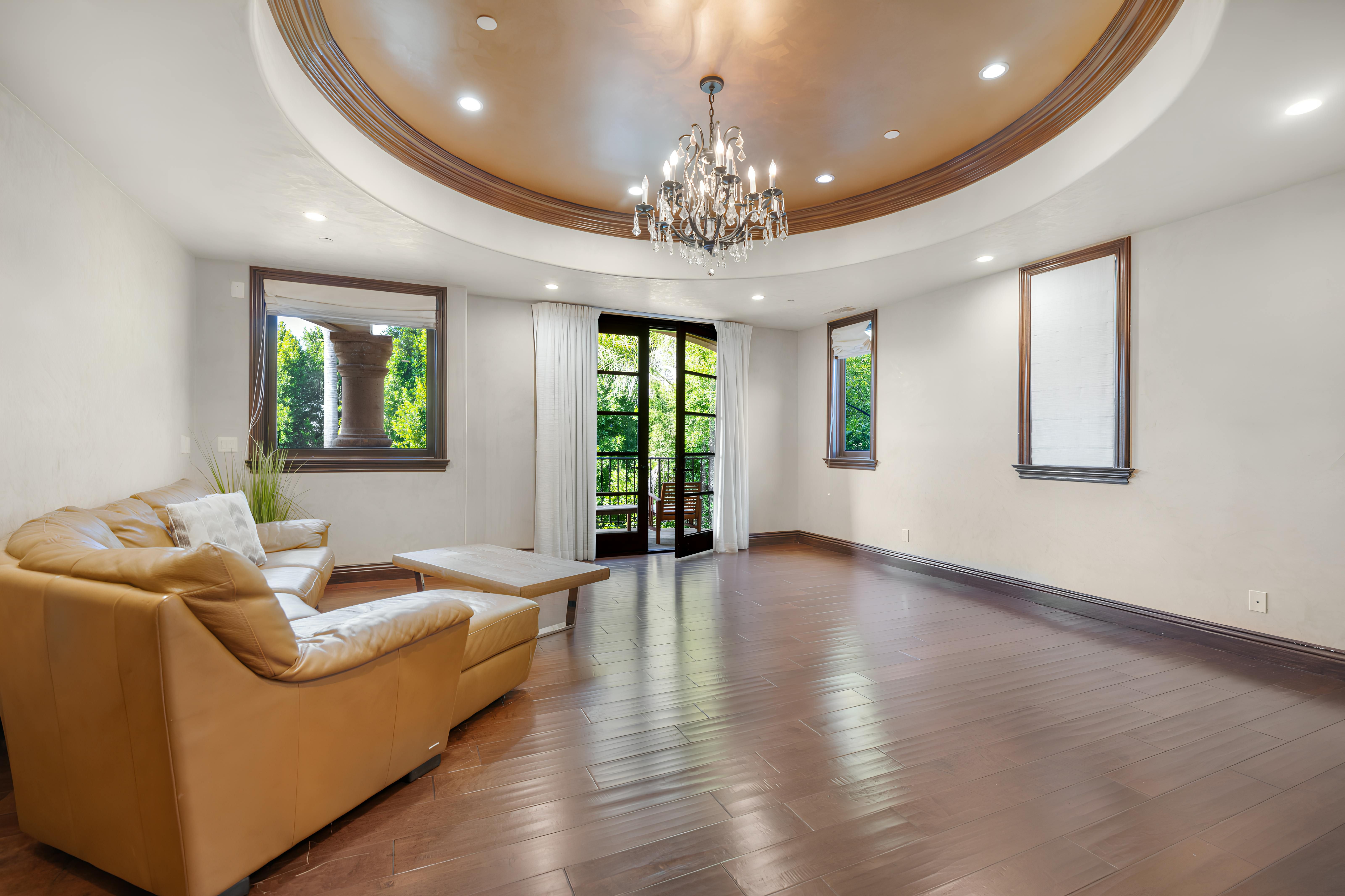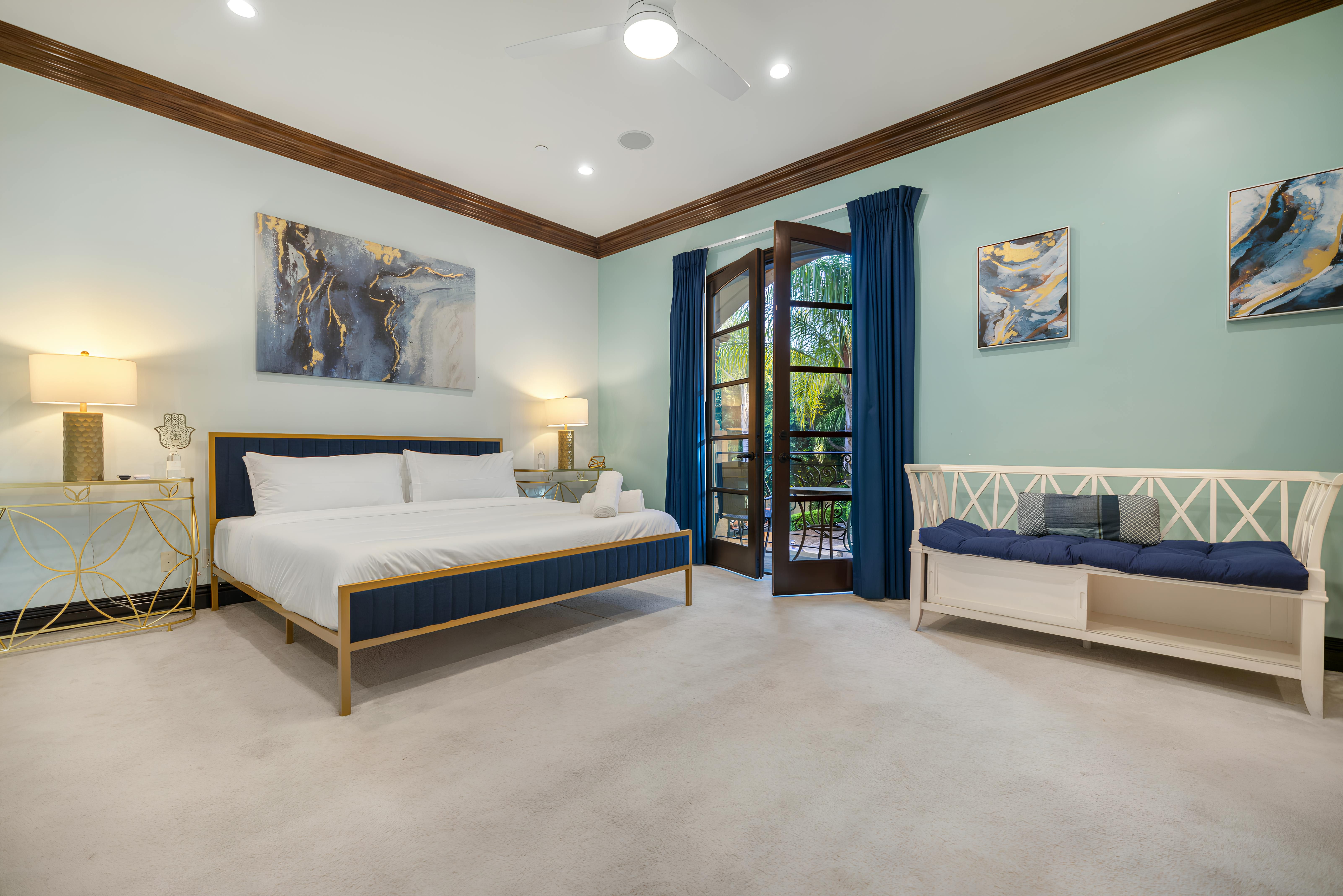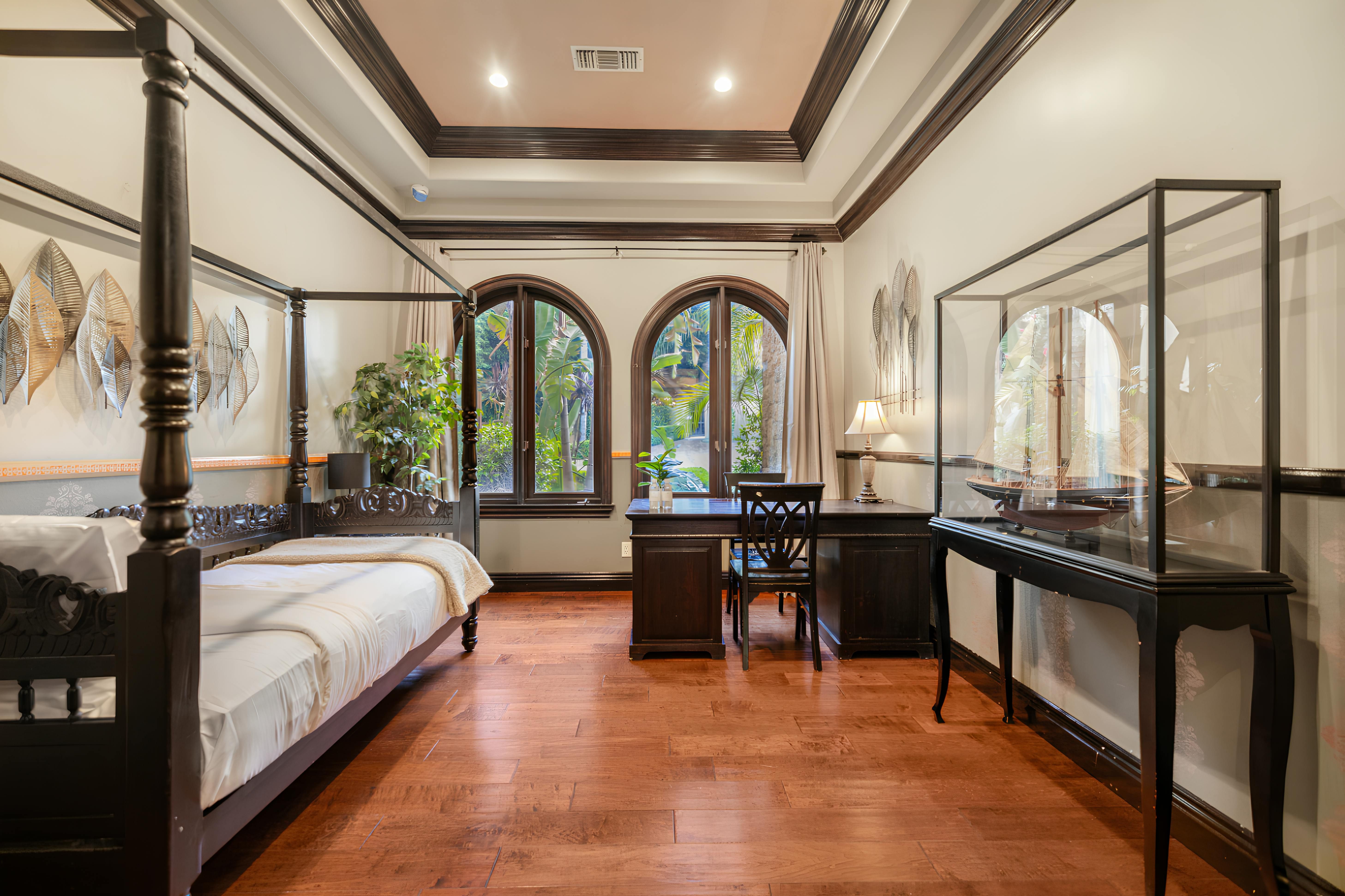 Taking inspiration from Tuscany and the Mediterranean, this home makes a tranquil retreat just a five-minute drive from Ventura Boulevard. Outside, the garden is decorated with fairy lights, creating the perfect atmosphere for summer barbecues and evening drinks. There's a private pool, a play area for children, and a basketball hoop out front if you're feeling sporty. Venture inside to unwind in front of the fire, or, better yet, cosy up in the home theatre for a movie night. With eight roomy bedrooms, including a sumptuous main suite, it's a great option for large families.