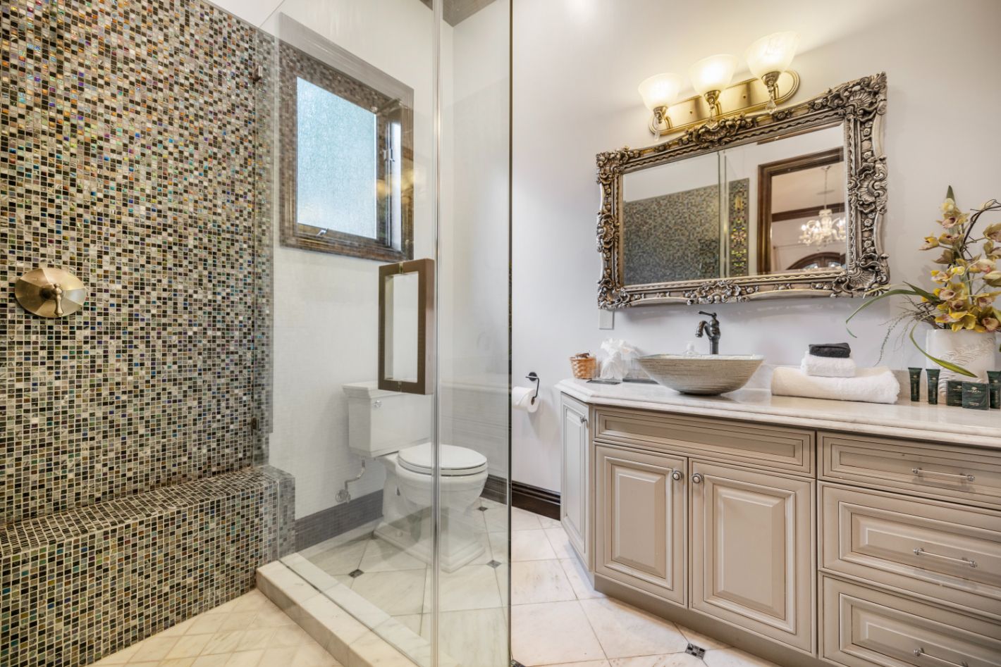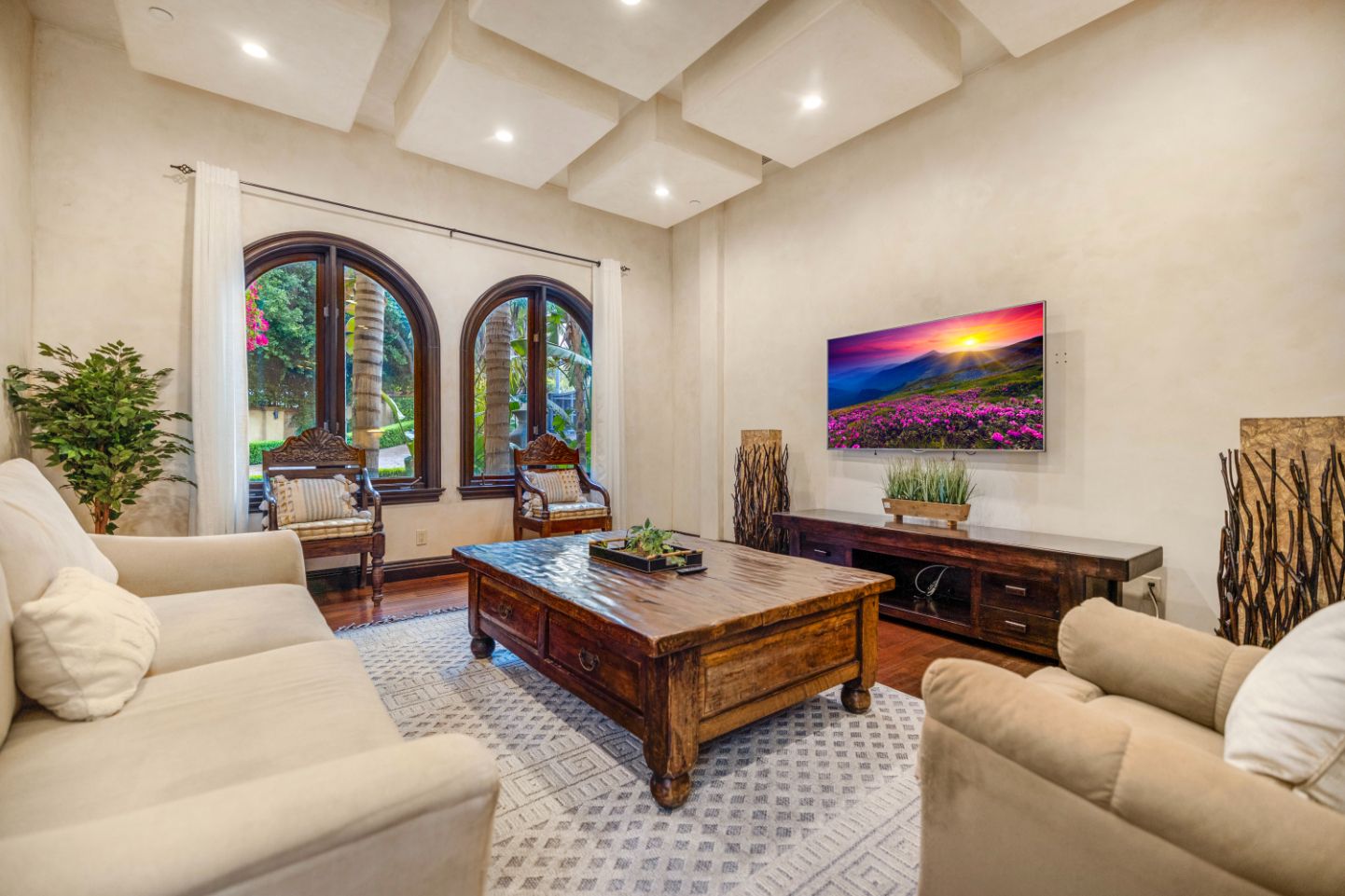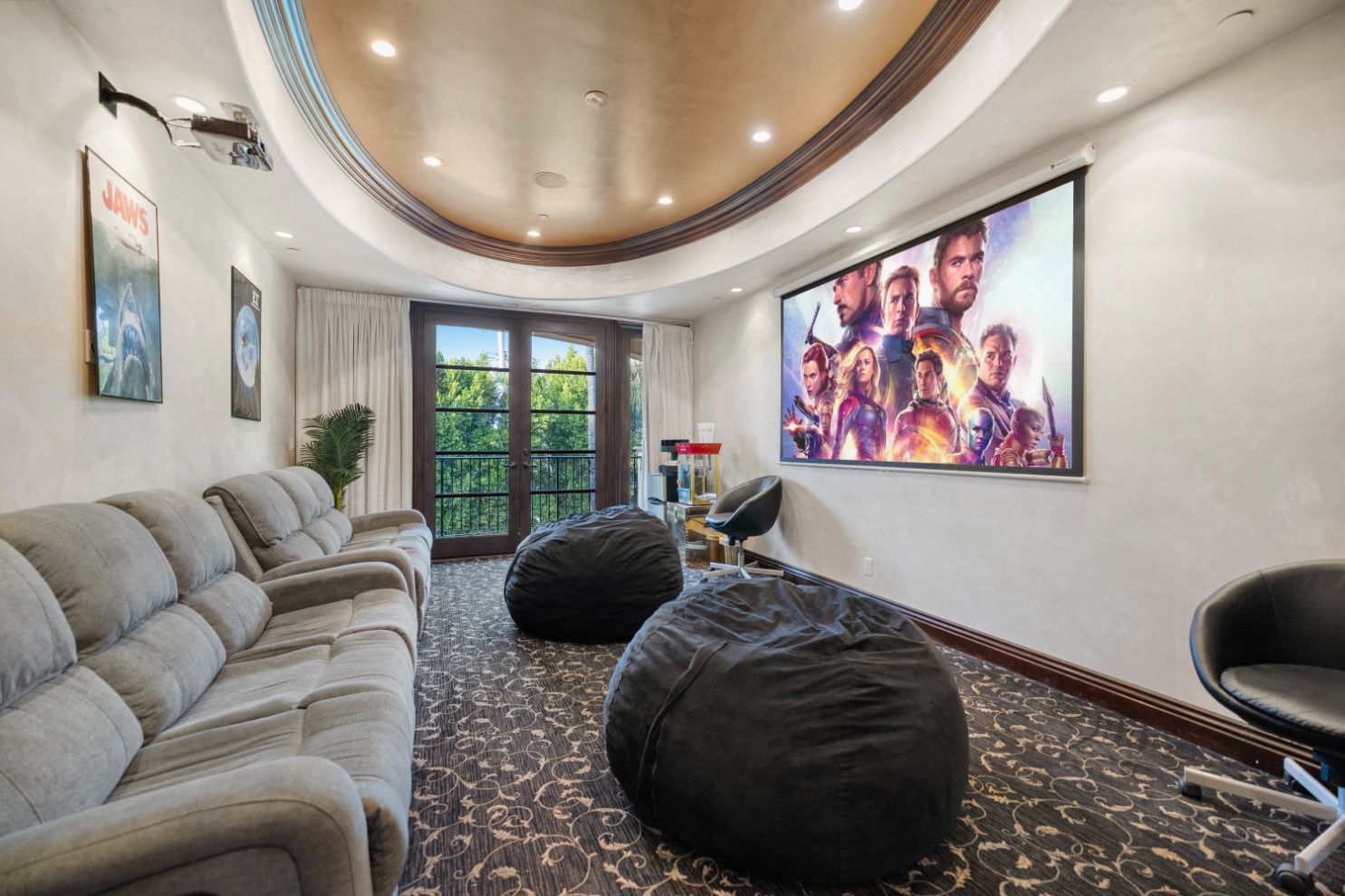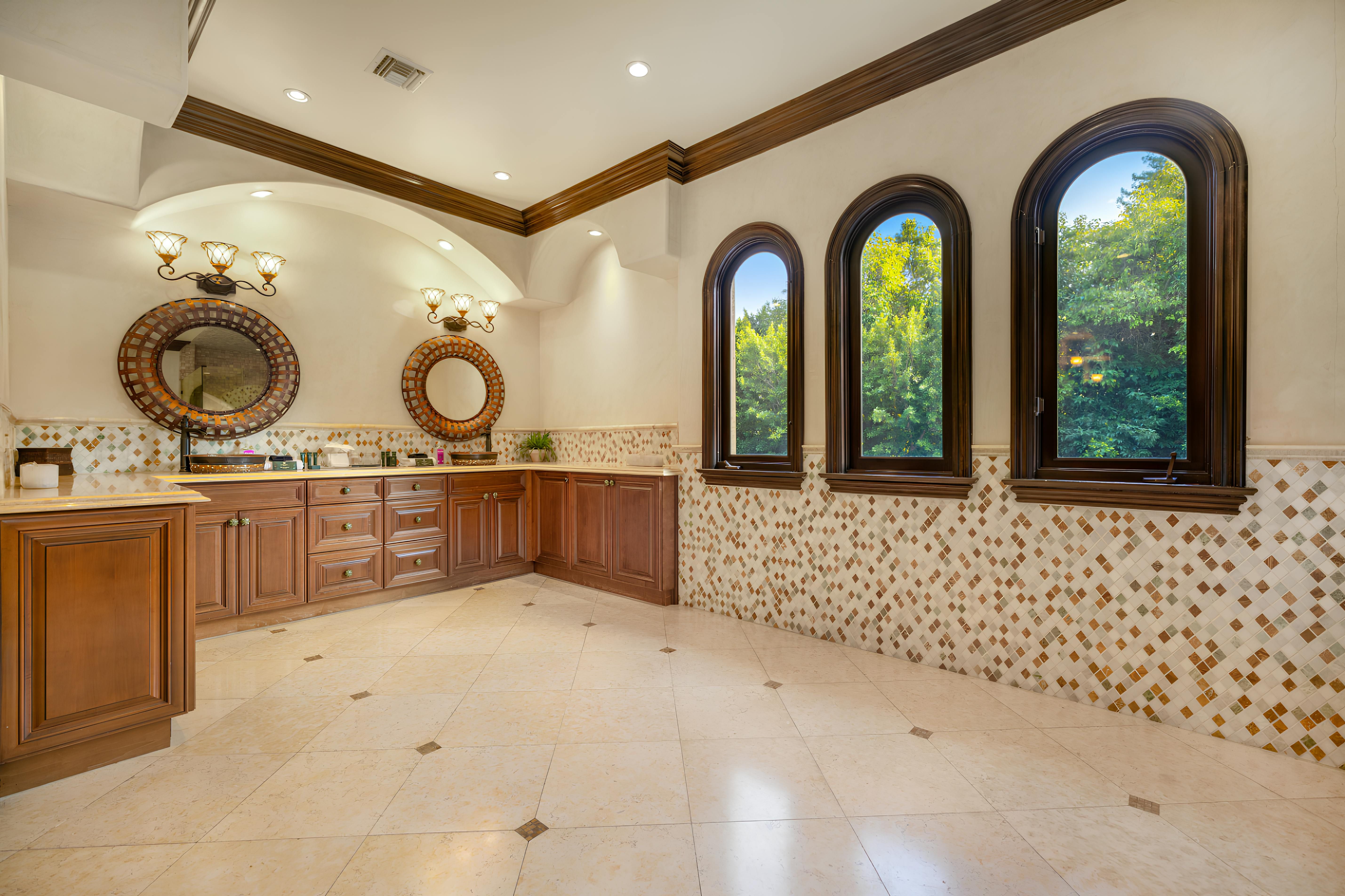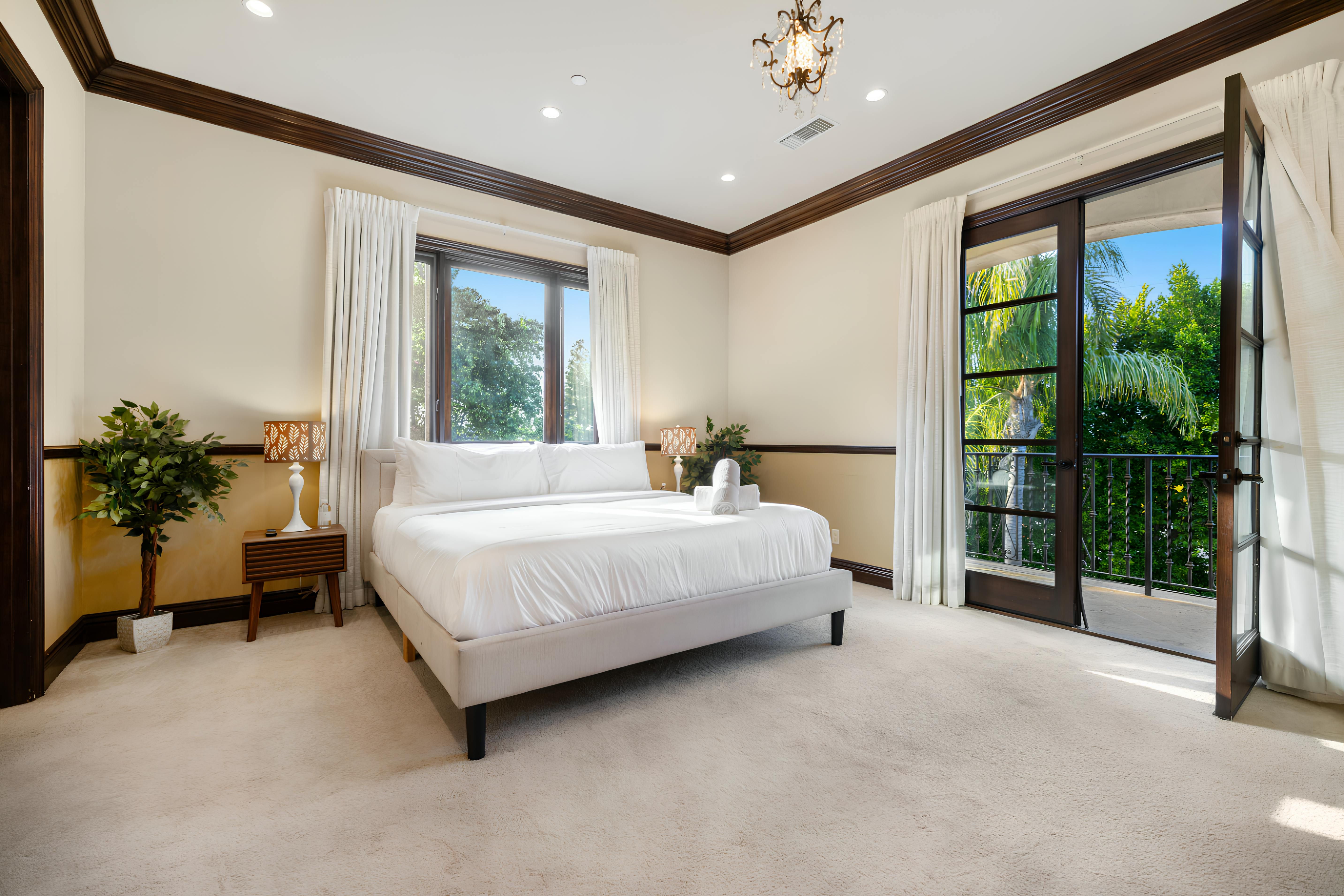 Taking inspiration from Tuscany and the Mediterranean, this home makes a tranquil retreat just a five-minute drive from Ventura Boulevard. Outside, the garden is decorated with fairy lights, creating the perfect atmosphere for summer barbecues and evening drinks. There's a private pool, a play area for children, and a basketball hoop out front if you're feeling sporty. Venture inside to unwind in front of the fire, or, better yet, cosy up in the home theatre for a movie night. With eight roomy bedrooms, including a sumptuous main suite, it's a great option for large families.
