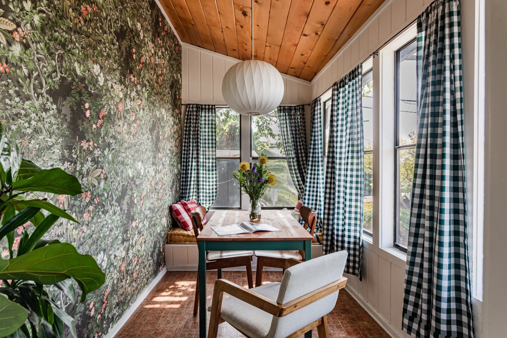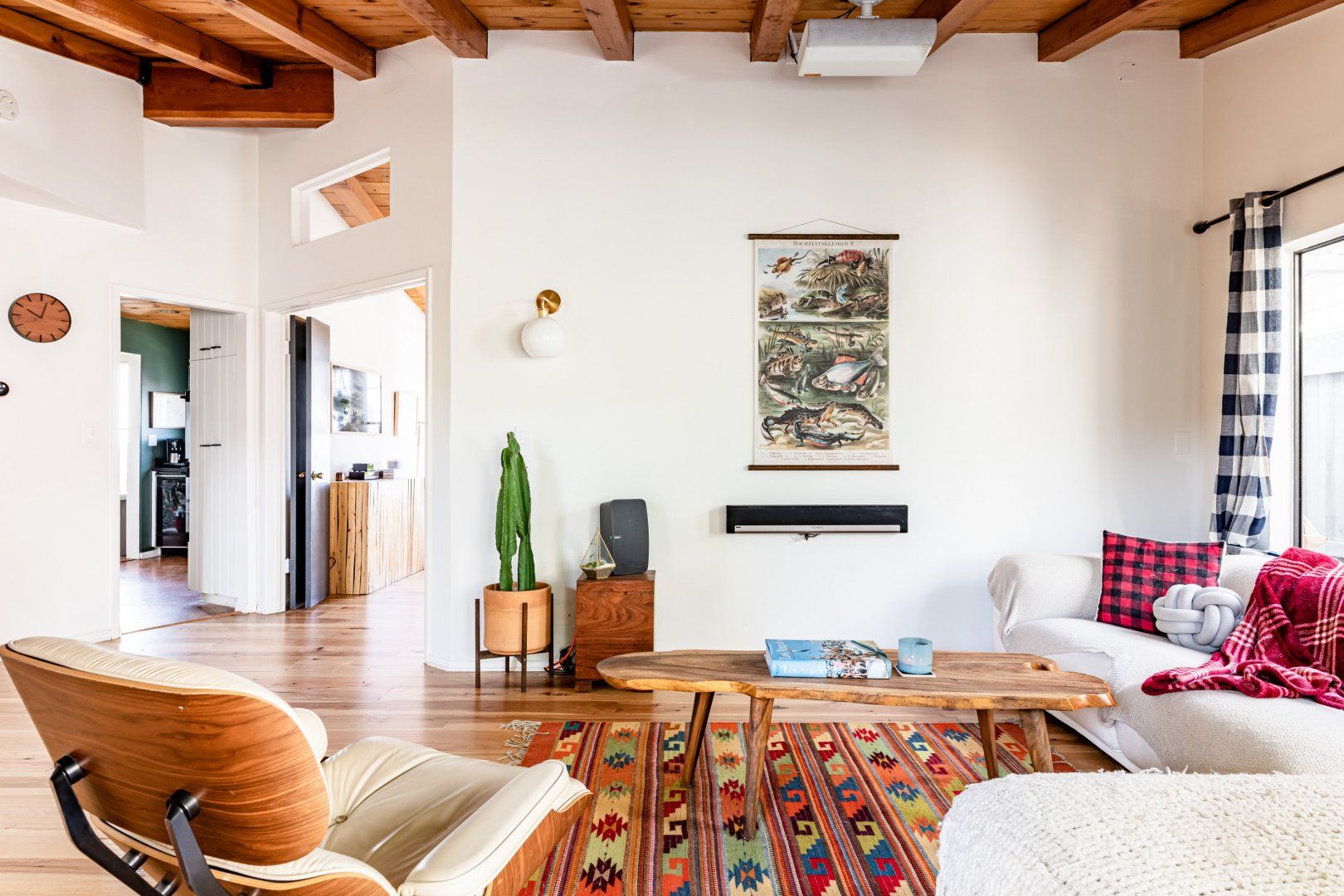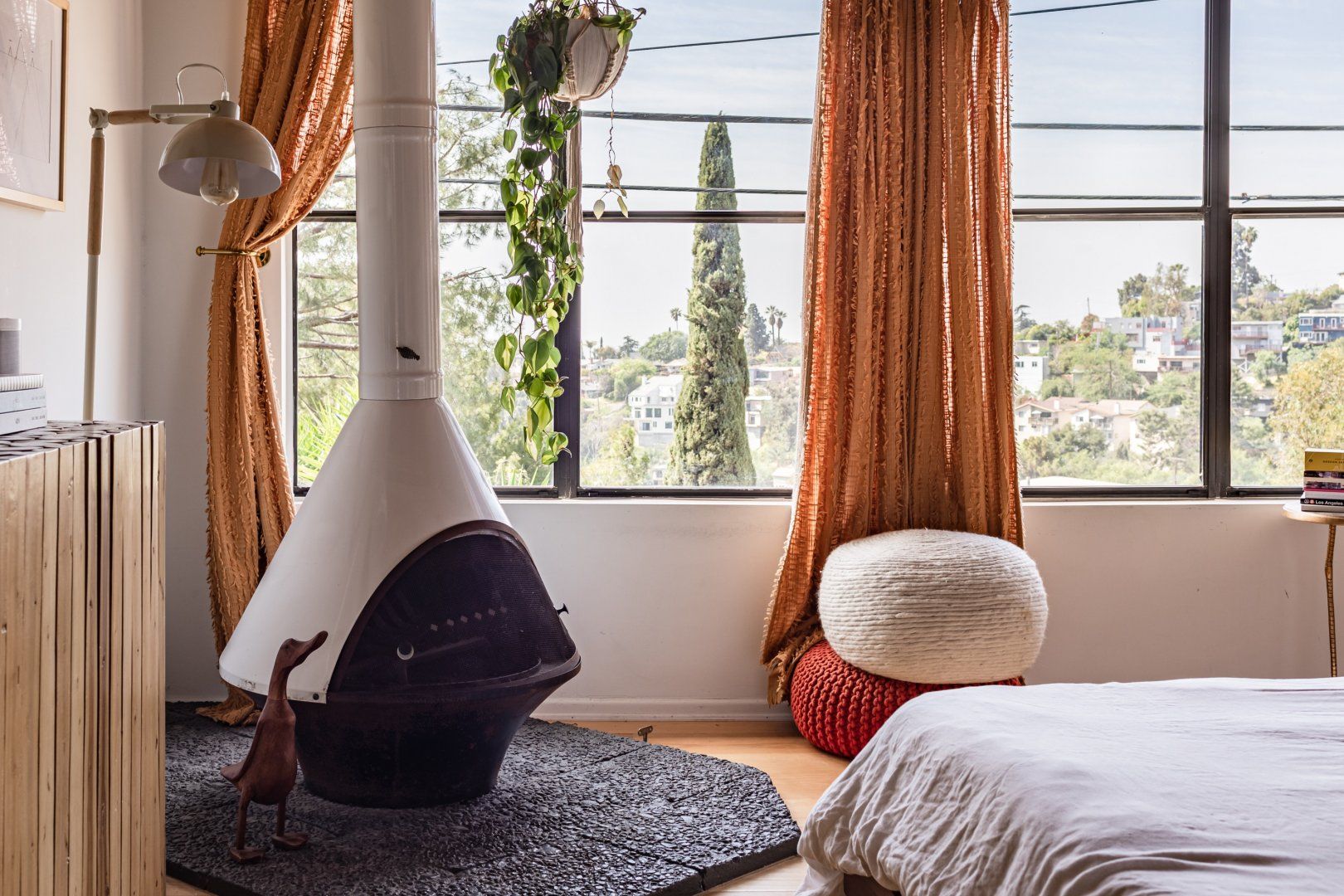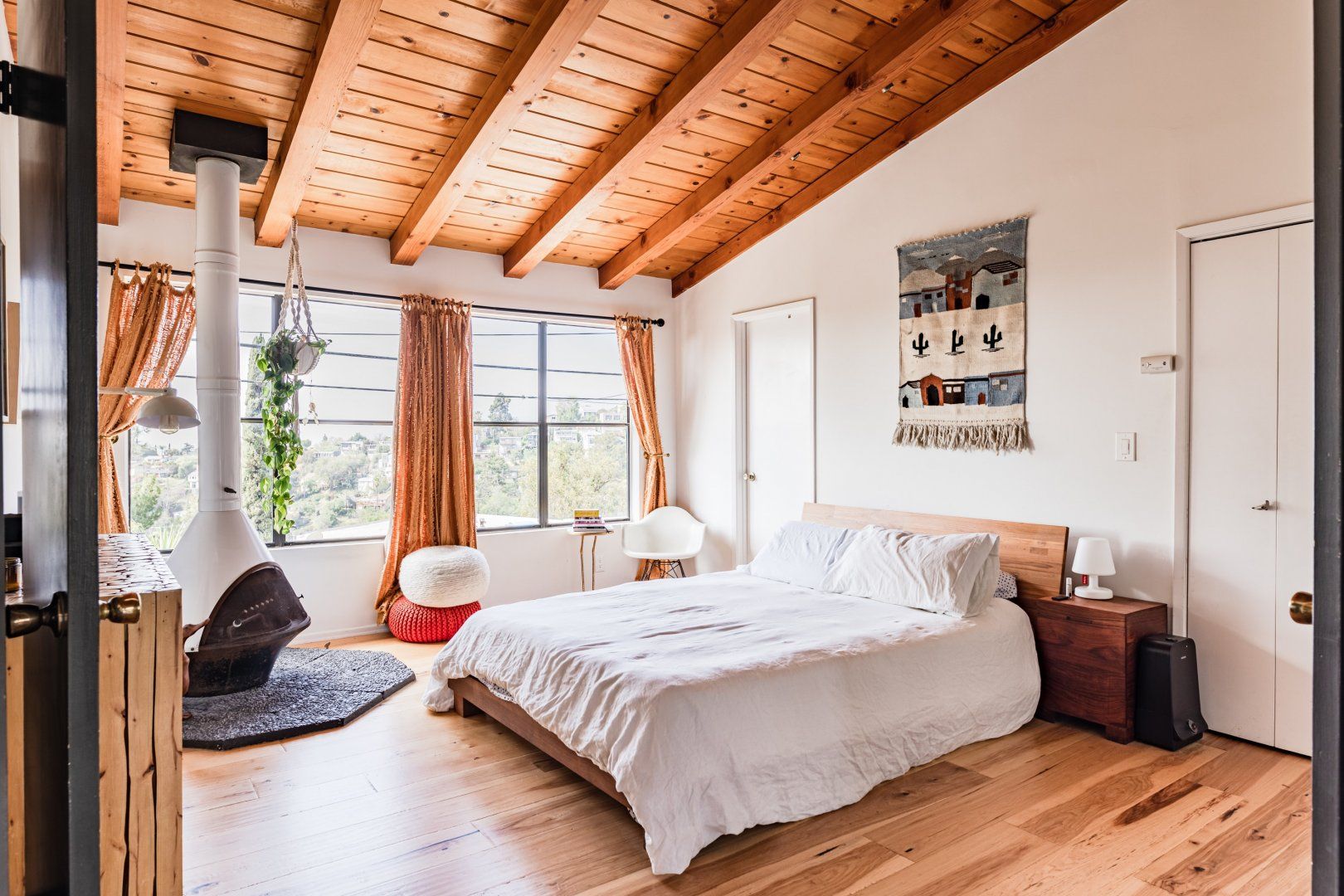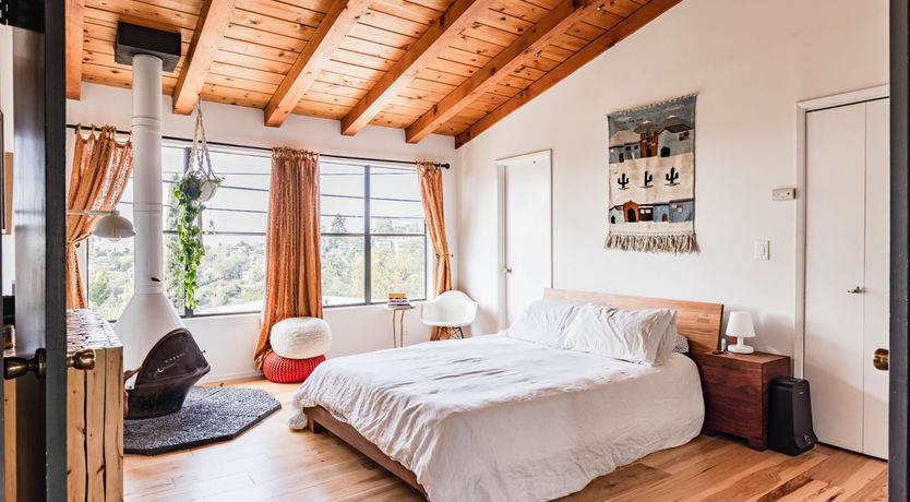 This cute-as-a-button LA Hills home has a comforting, cabin-like feel. With canyon views, homespun gingham curtains and timbered ceilings, it’s hard to believe you’re in one of the world’s great metropolises. Colourful kilim rugs, live-edge tables and a wood burner in one of the bedrooms all add to the urban-wilderness vibe. Walk through the well-kept garden of succulents and you’ll find the third bedroom in its own private cabin. In contemporary plywood, with a neat fold-away bed and its own workstation, it offers total privacy from the rest of your group, if you need it. While the look here may be rustic, the tech is anything but. After the sun goes down, pour a glass of Mezcal and put some Cali-soul tunes on the turntable, or enjoy your own private movie-theatre experience on the cinema-quality projector. When you’re ready to leave your slice of country in the city, Downtown LA is just fifteen minutes away by car.