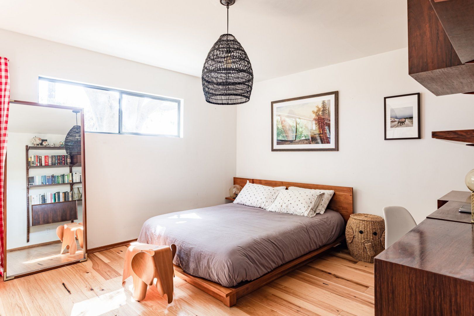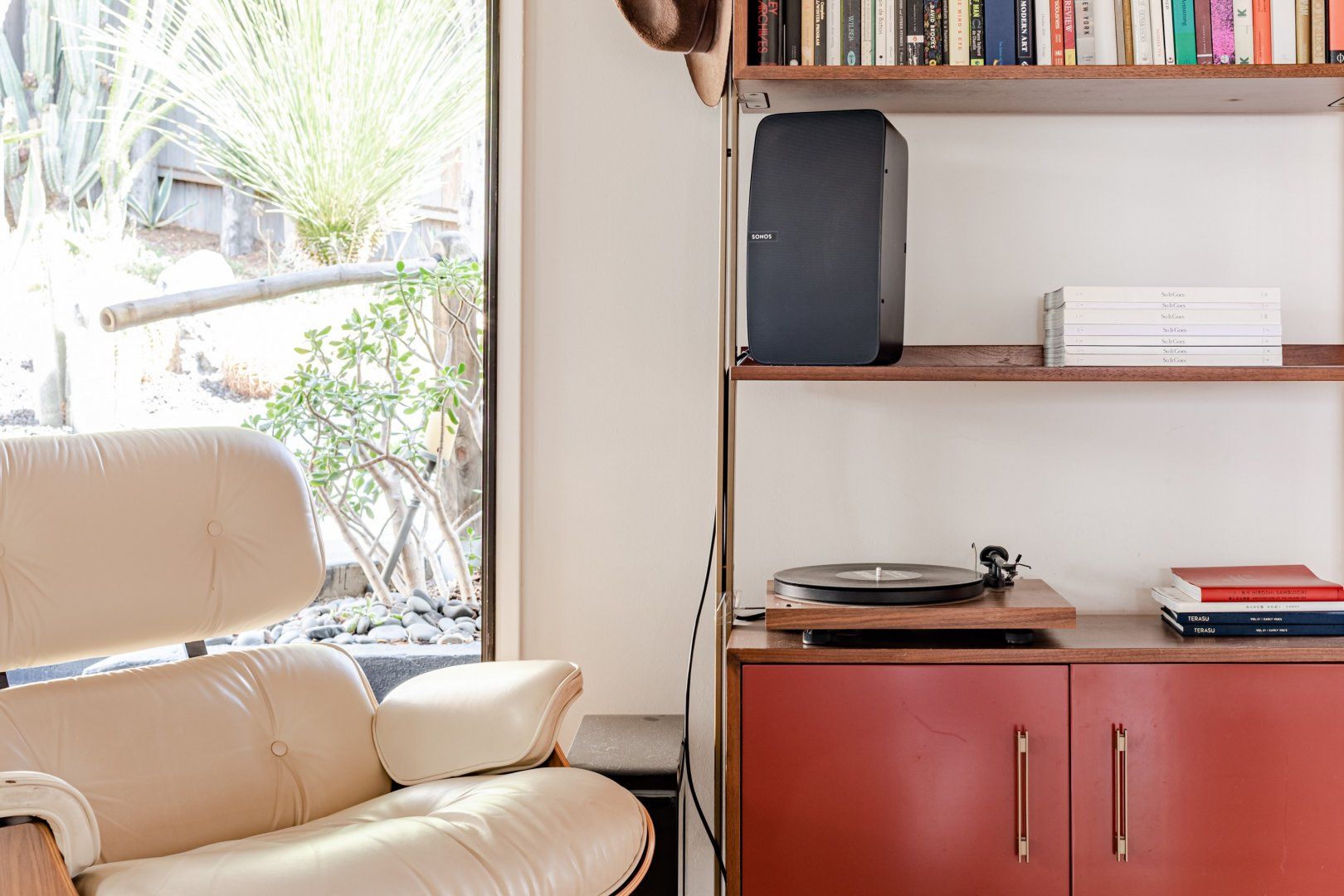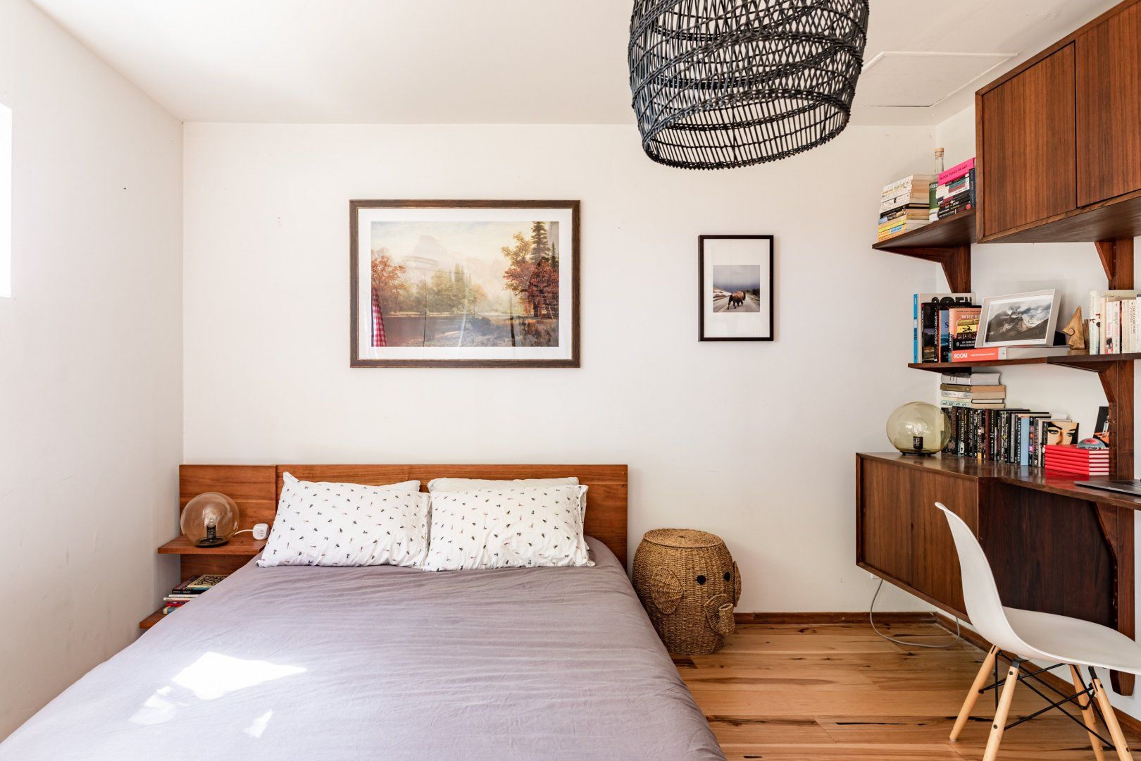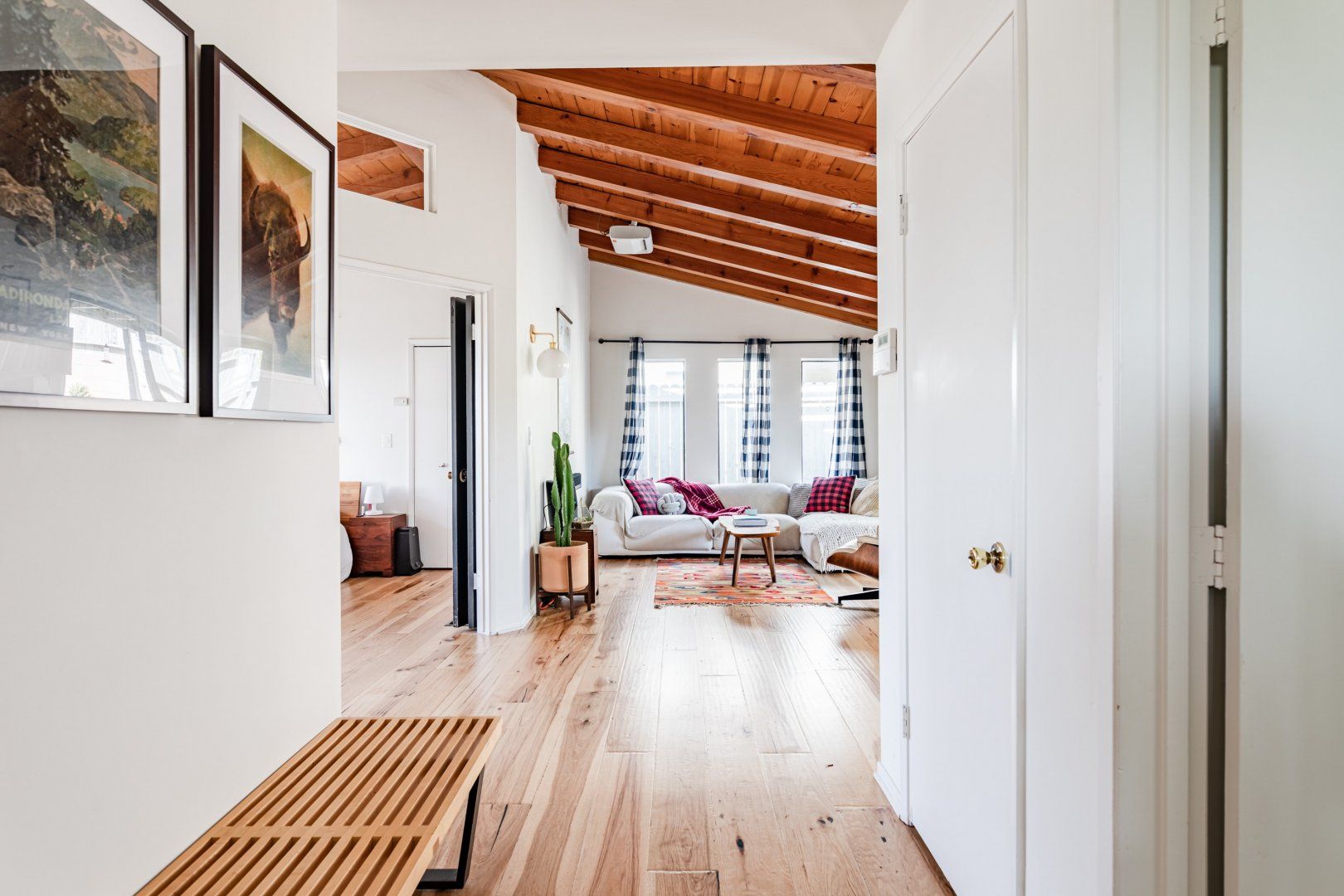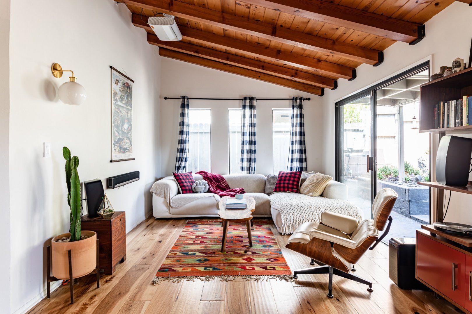 This cute-as-a-button LA Hills home has a comforting, cabin-like feel. With canyon views, homespun gingham curtains and timbered ceilings, it’s hard to believe you’re in one of the world’s great metropolises. Colourful kilim rugs, live-edge tables and a wood burner in one of the bedrooms all add to the urban-wilderness vibe. Walk through the well-kept garden of succulents and you’ll find the third bedroom in its own private cabin. In contemporary plywood, with a neat fold-away bed and its own workstation, it offers total privacy from the rest of your group, if you need it. While the look here may be rustic, the tech is anything but. After the sun goes down, pour a glass of Mezcal and put some Cali-soul tunes on the turntable, or enjoy your own private movie-theatre experience on the cinema-quality projector. When you’re ready to leave your slice of country in the city, Downtown LA is just fifteen minutes away by car.