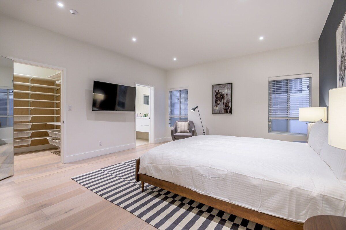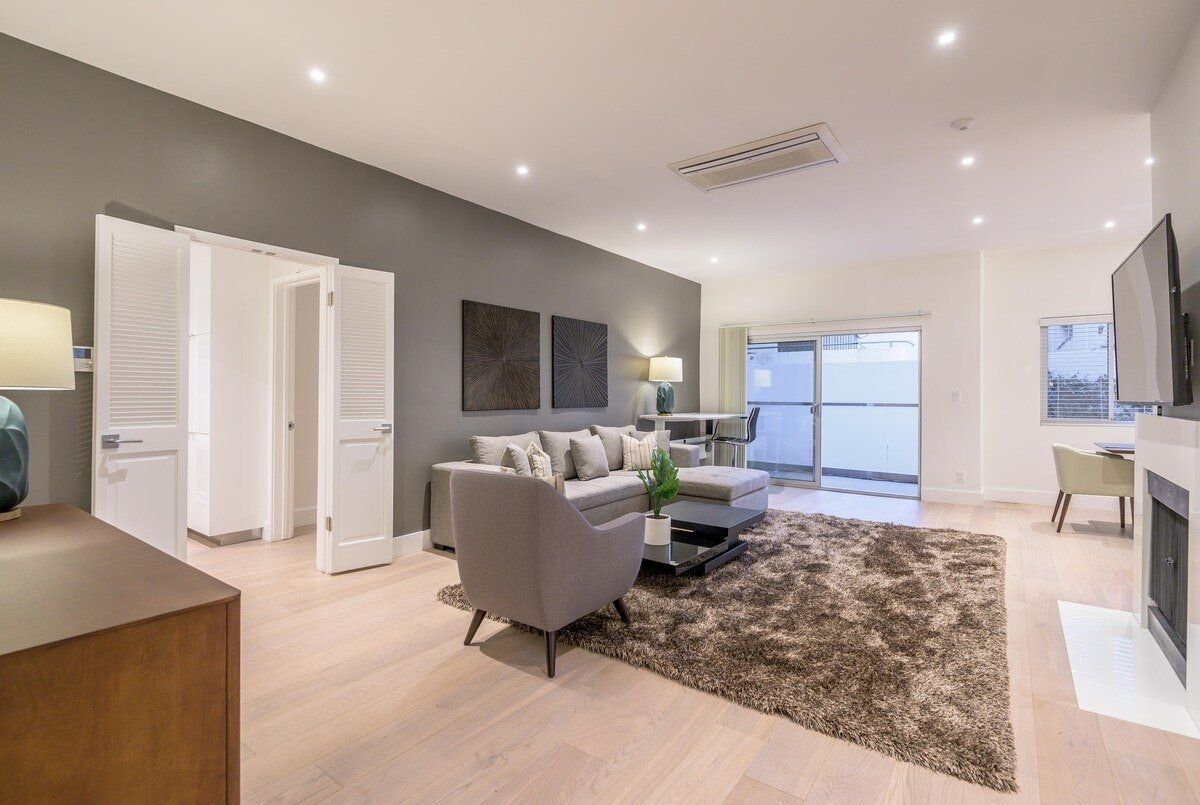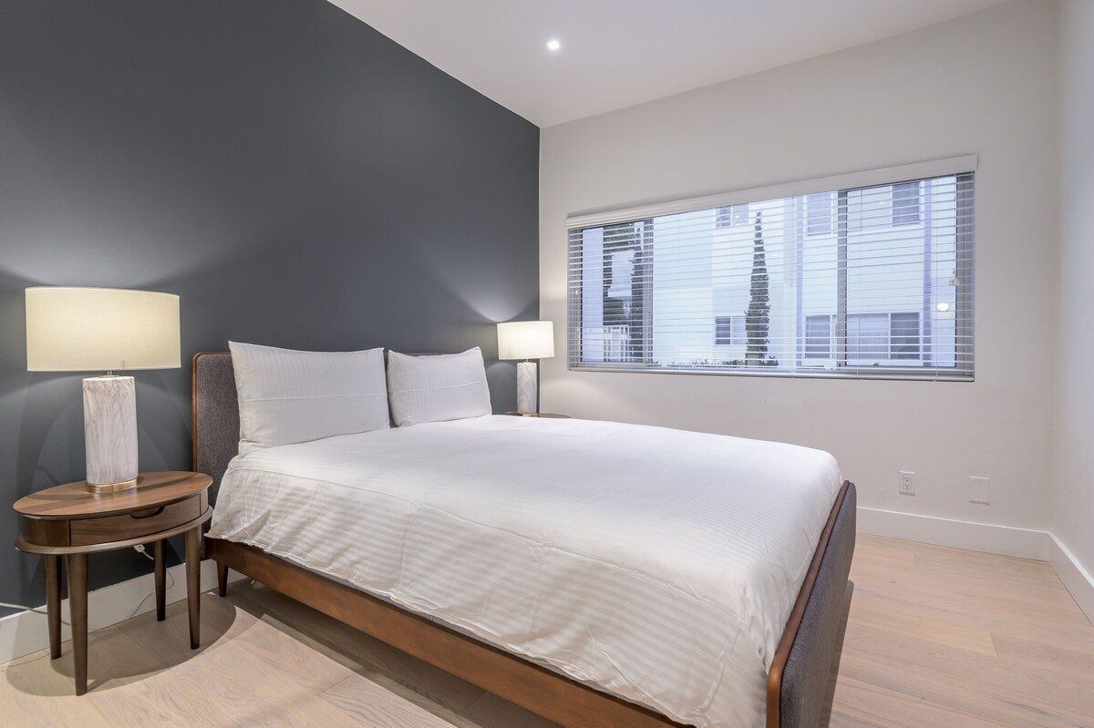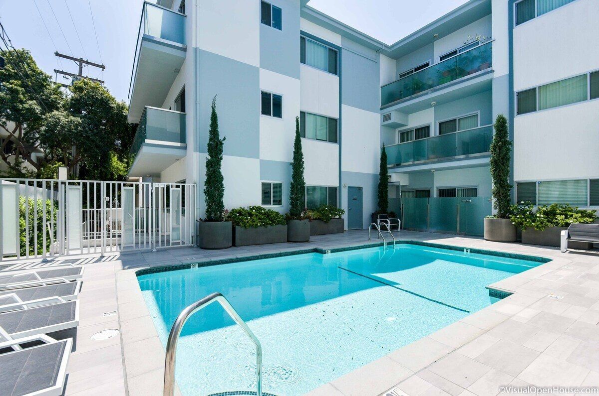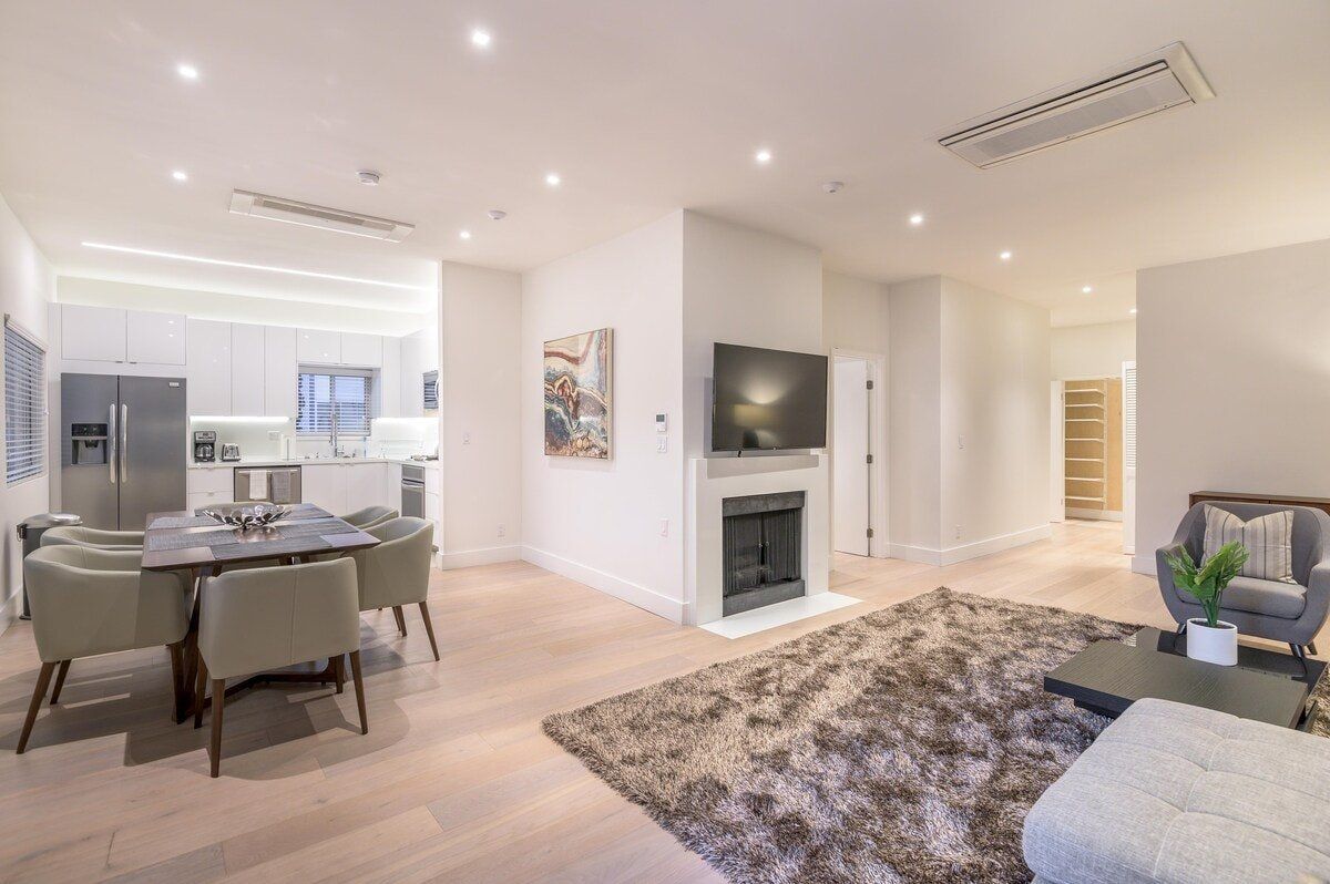 Sleek, stylish and upscale - this three-bedroom apartment is everything you imagine when you hear the words 'Beverly Hills'. Inside, the open-plan living room, dining area and kitchen is a picture of pristine white and grey elegance, with sophisticated furnishings, polished flooring, and the odd houseplant or two underneath a minimalist spotlight ceiling. Outside, the communal pool sparkles in the LA sun — with plenty of loungers and space to sprawl out, it's an ideal spot for topping up your tan away from the hustle and bustle of the city. Other lazy days are best spent on Santa Monica beach, just a twenty-minute drive away. Full of concession stands, amusement parks and quirky diners, the double-jointed pier is a memorable day out. When you return home, finish off the day by sipping cocktails on your private balcony, watching the sun dip behind the impressive cypress trees lining the outskirts of this address.