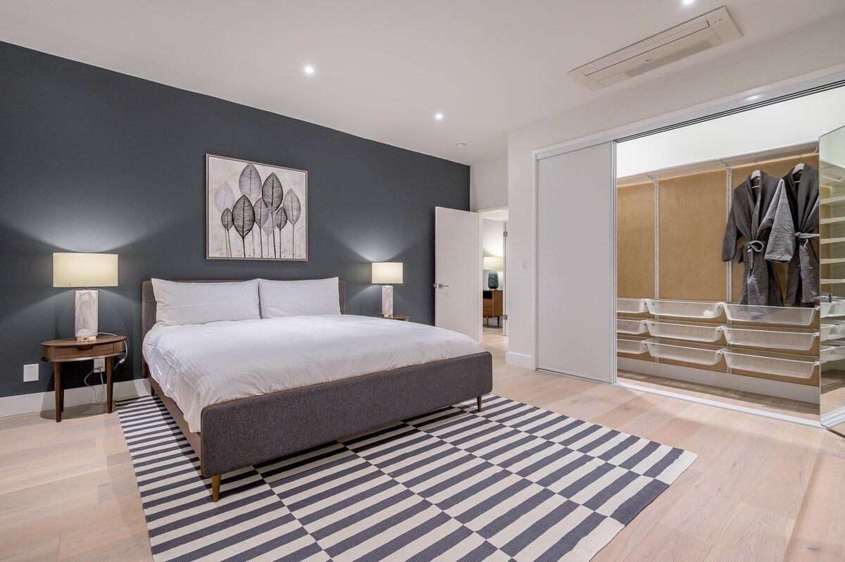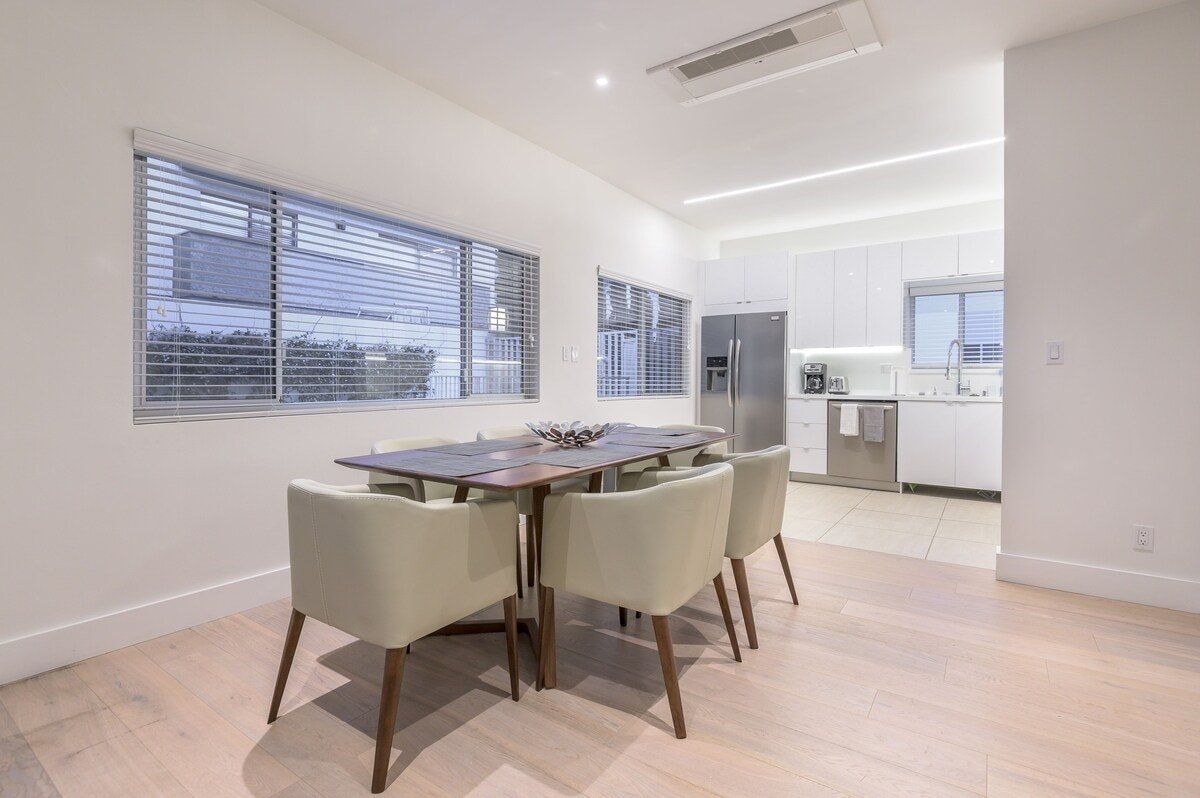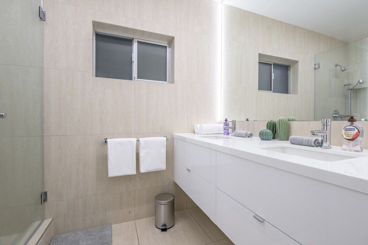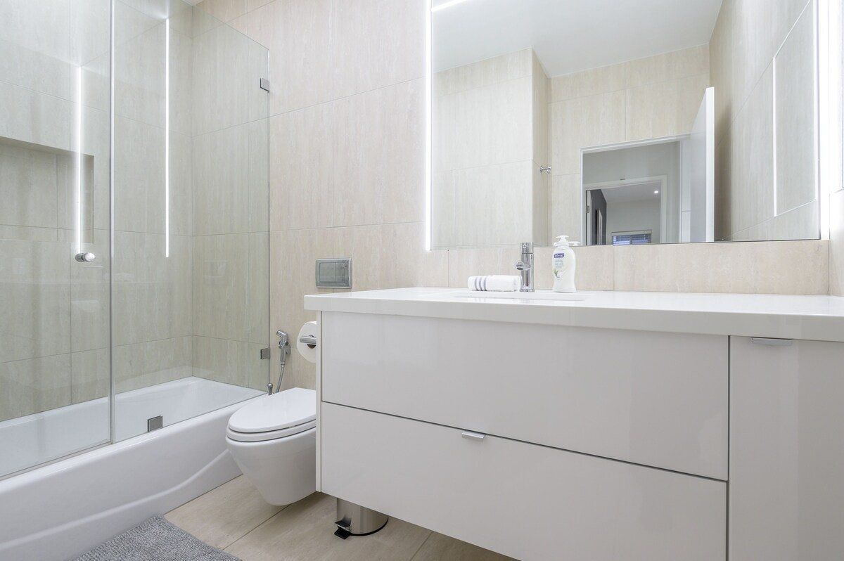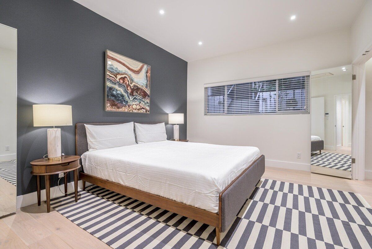 Sleek, stylish and upscale - this three-bedroom apartment is everything you imagine when you hear the words 'Beverly Hills'. Inside, the open-plan living room, dining area and kitchen is a picture of pristine white and grey elegance, with sophisticated furnishings, polished flooring, and the odd houseplant or two underneath a minimalist spotlight ceiling. Outside, the communal pool sparkles in the LA sun — with plenty of loungers and space to sprawl out, it's an ideal spot for topping up your tan away from the hustle and bustle of the city. Other lazy days are best spent on Santa Monica beach, just a twenty-minute drive away. Full of concession stands, amusement parks and quirky diners, the double-jointed pier is a memorable day out. When you return home, finish off the day by sipping cocktails on your private balcony, watching the sun dip behind the impressive cypress trees lining the outskirts of this address.