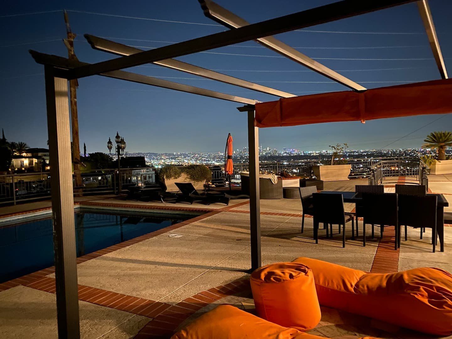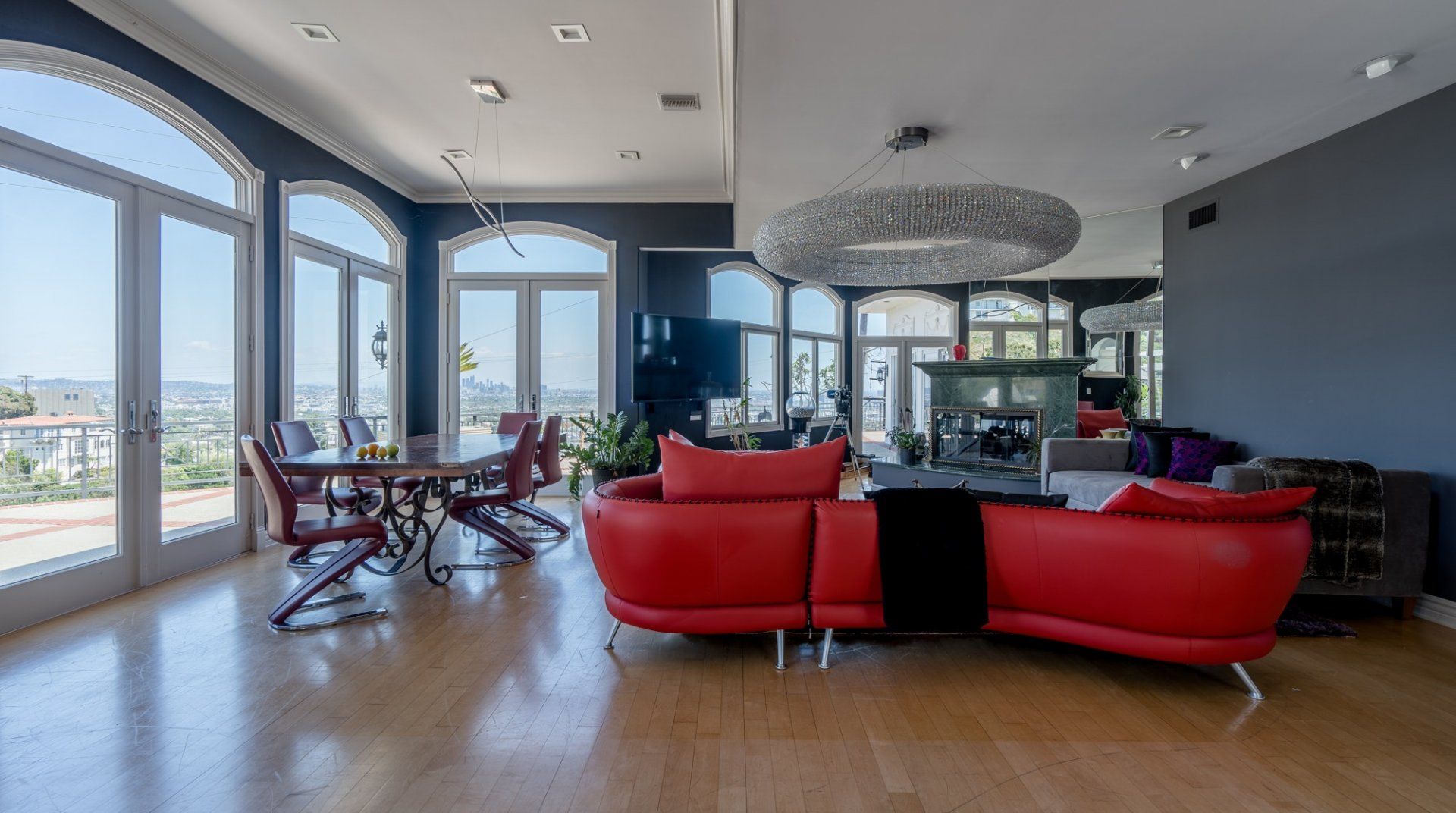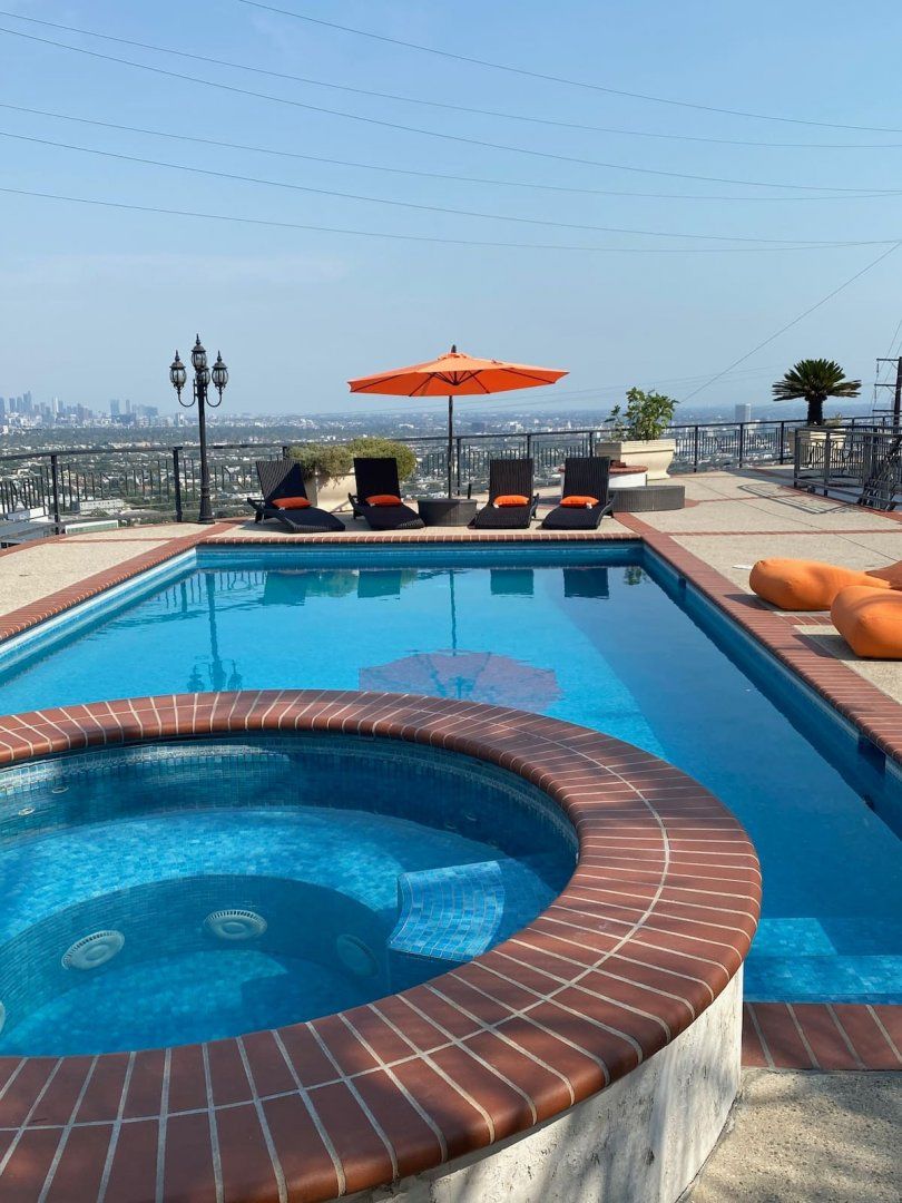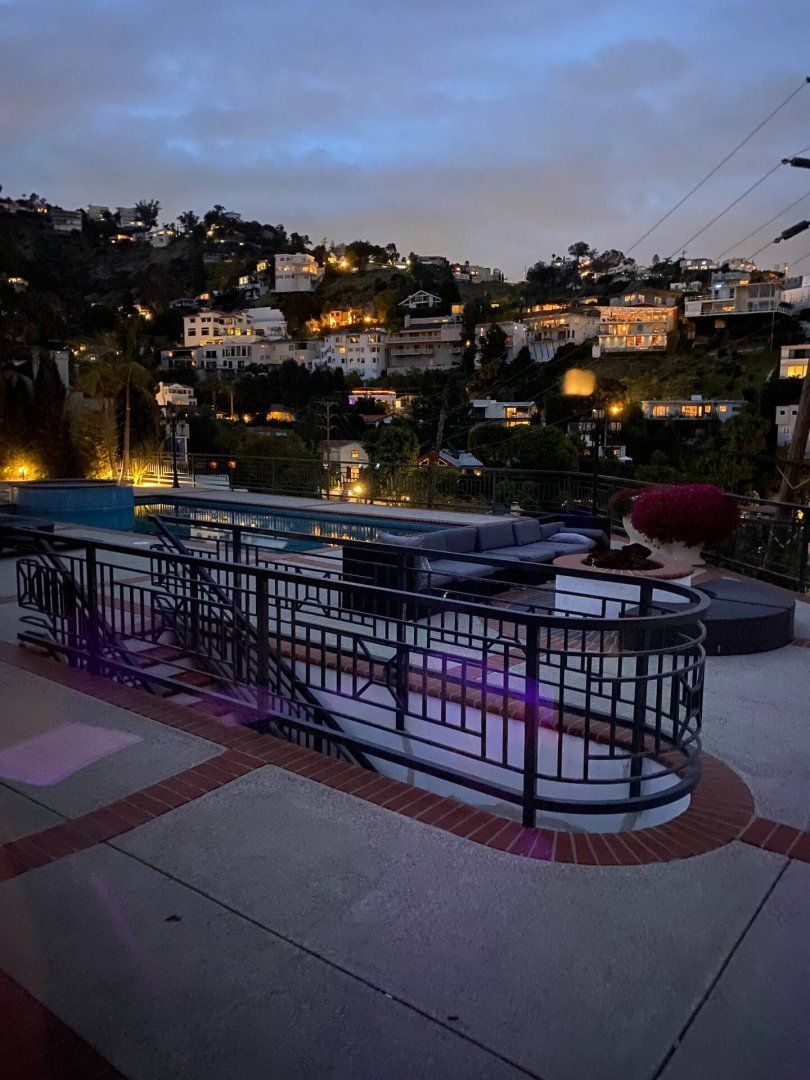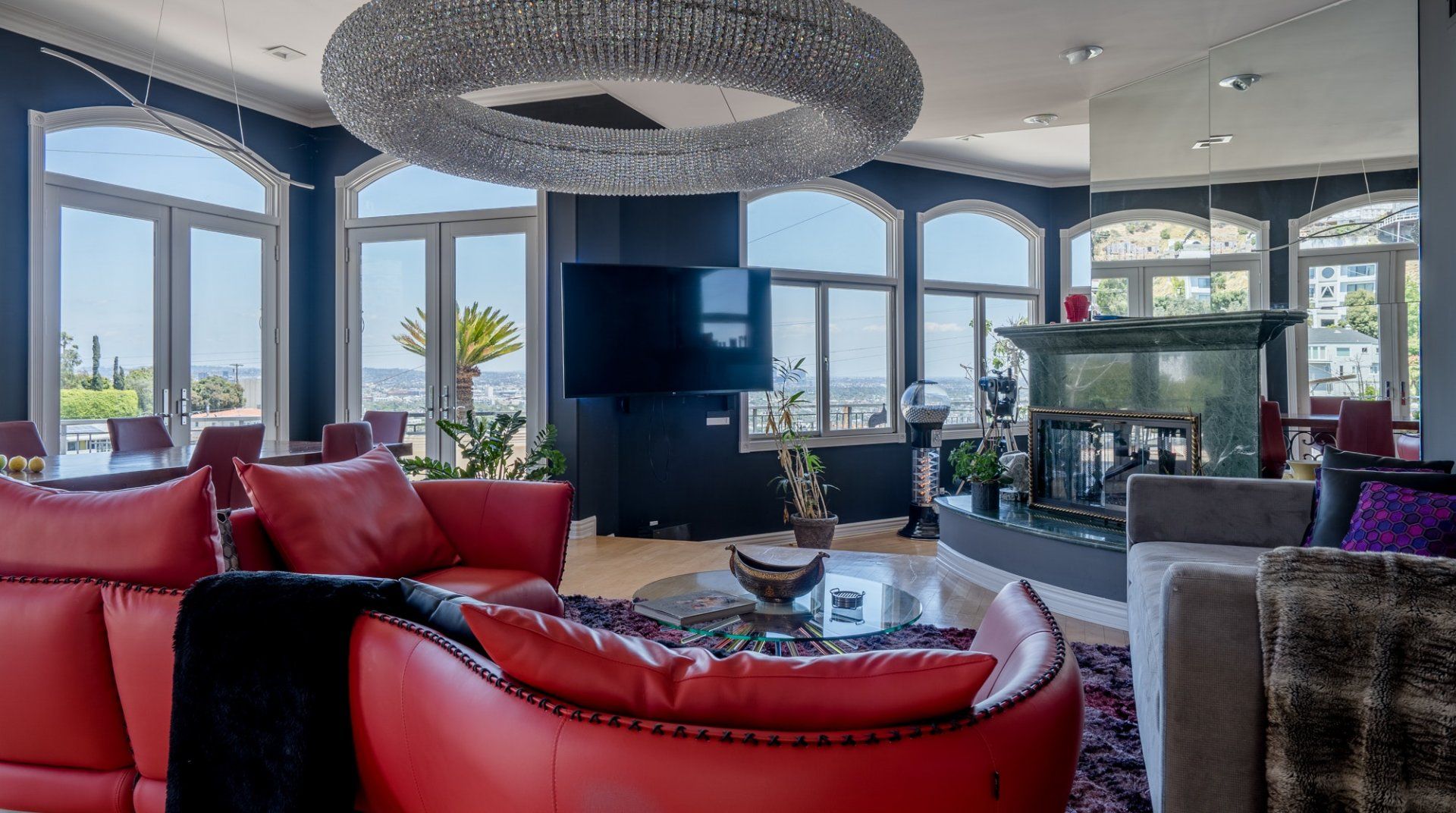 Like something out of a Bond movie, this home on a hillside is the height of luxury, with a home cinema setup, a hot tub and pool, floor-to-ceiling windows, even a rowing machine and a popcorn machine. A dream bachelor pad, there's a glamorous style to everything from the red sofas and glitzy light fitting in the living room to the black-painted bathroom and the outdoor furniture. Speaking of the terrace, this home has plenty of scope to enjoy the California sunshine, with doors opening to a vast outdoor space with unbeatable views all the way to Downtown LA, Century City and – on a clear day – the ocean. There's a fabulous pool and at night you can swim alongside the glittering city lights while someone lights up the fire pit and grills an evening meal on the impressive barbecue. Location-wise, it doesn't get much better. In a great neighbourhood, you're just a ten-minute drive from Hollywood.