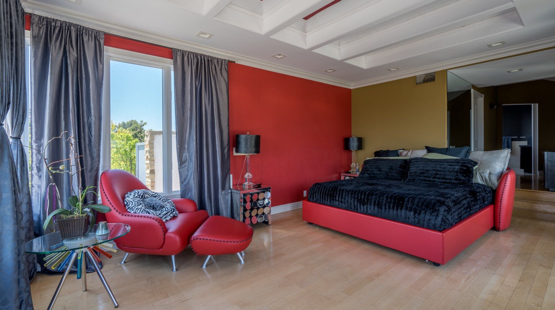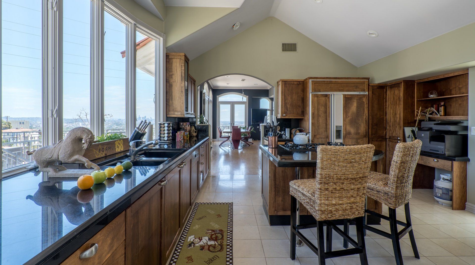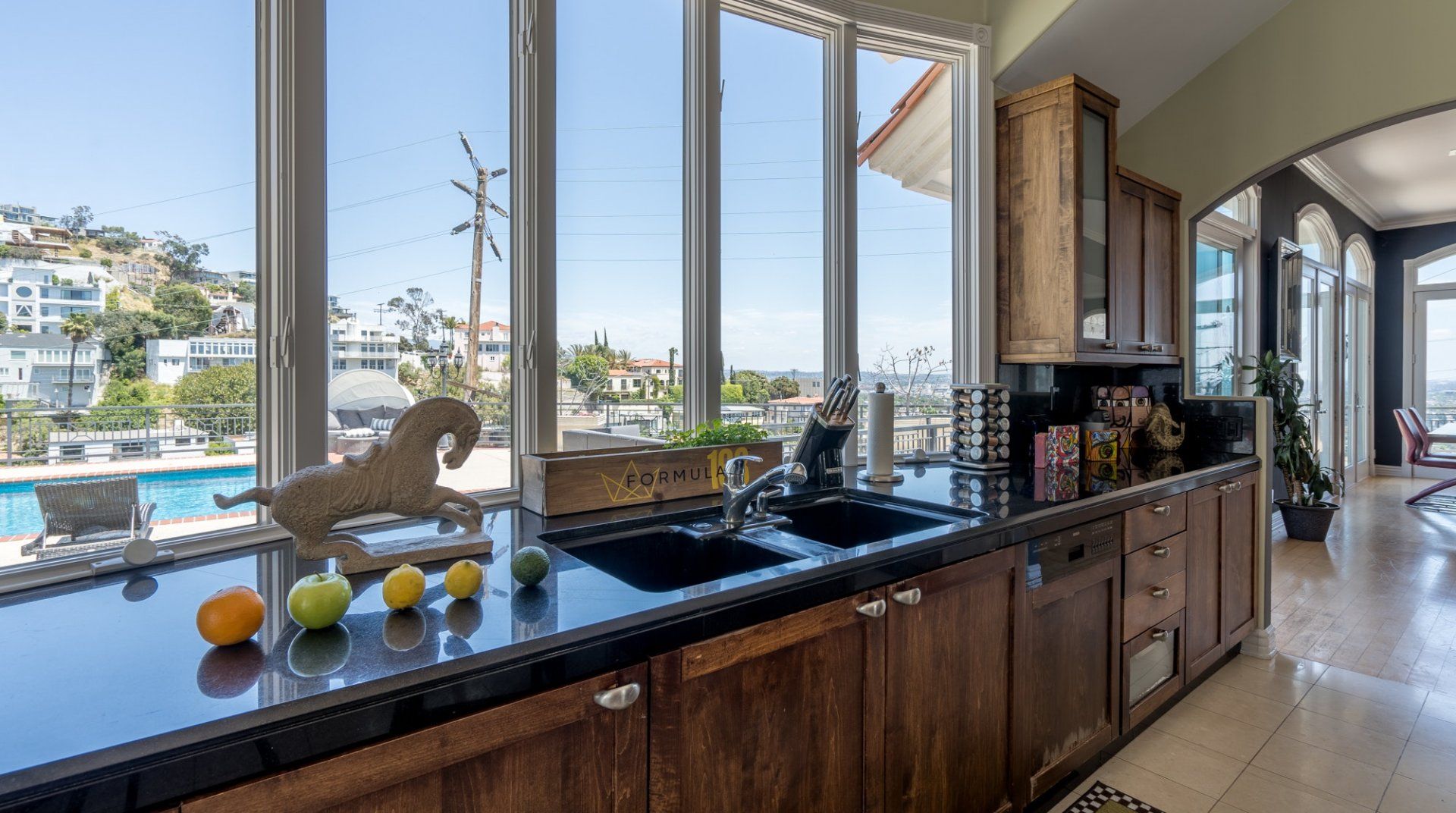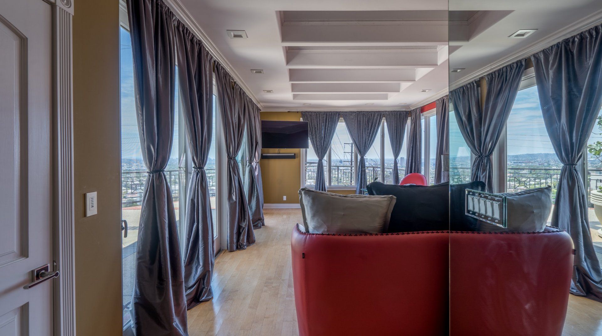 Like something out of a Bond movie, this home on a hillside is the height of luxury, with a home cinema setup, a hot tub and pool, floor-to-ceiling windows, even a rowing machine and a popcorn machine. A dream bachelor pad, there's a glamorous style to everything from the red sofas and glitzy light fitting in the living room to the black-painted bathroom and the outdoor furniture. Speaking of the terrace, this home has plenty of scope to enjoy the California sunshine, with doors opening to a vast outdoor space with unbeatable views all the way to Downtown LA, Century City and – on a clear day – the ocean. There's a fabulous pool and at night you can swim alongside the glittering city lights while someone lights up the fire pit and grills an evening meal on the impressive barbecue. Location-wise, it doesn't get much better. In a great neighbourhood, you're just a ten-minute drive from Hollywood.