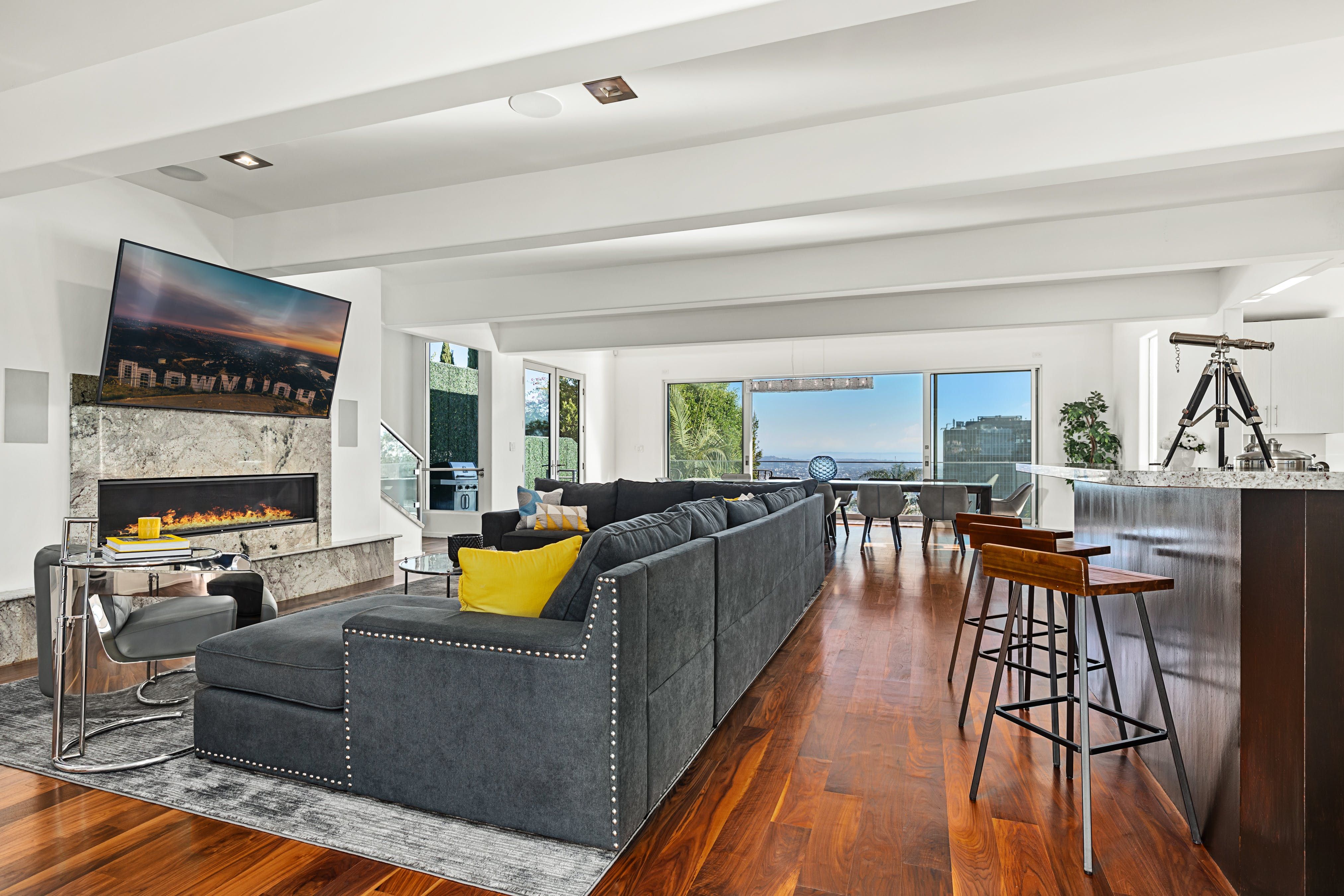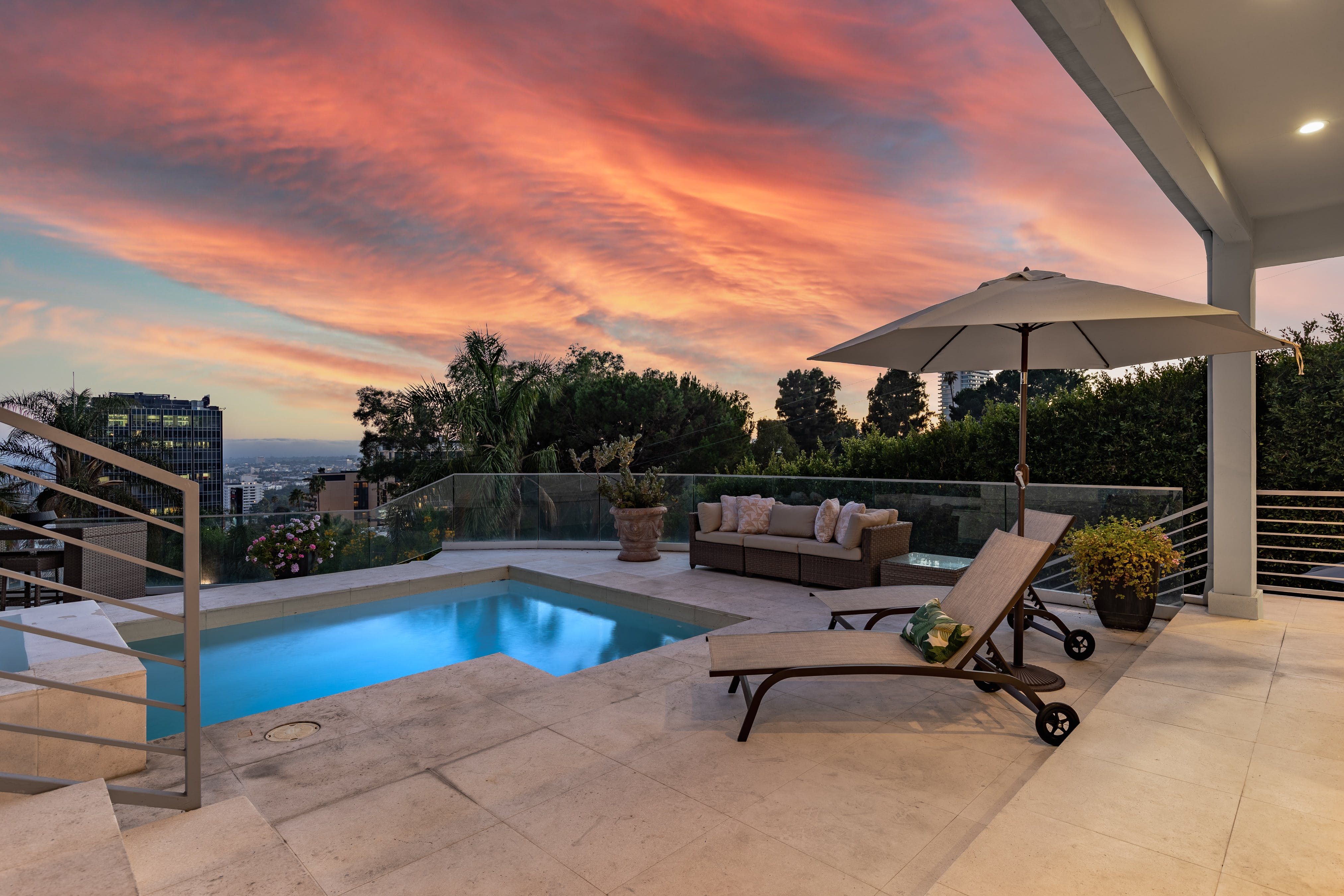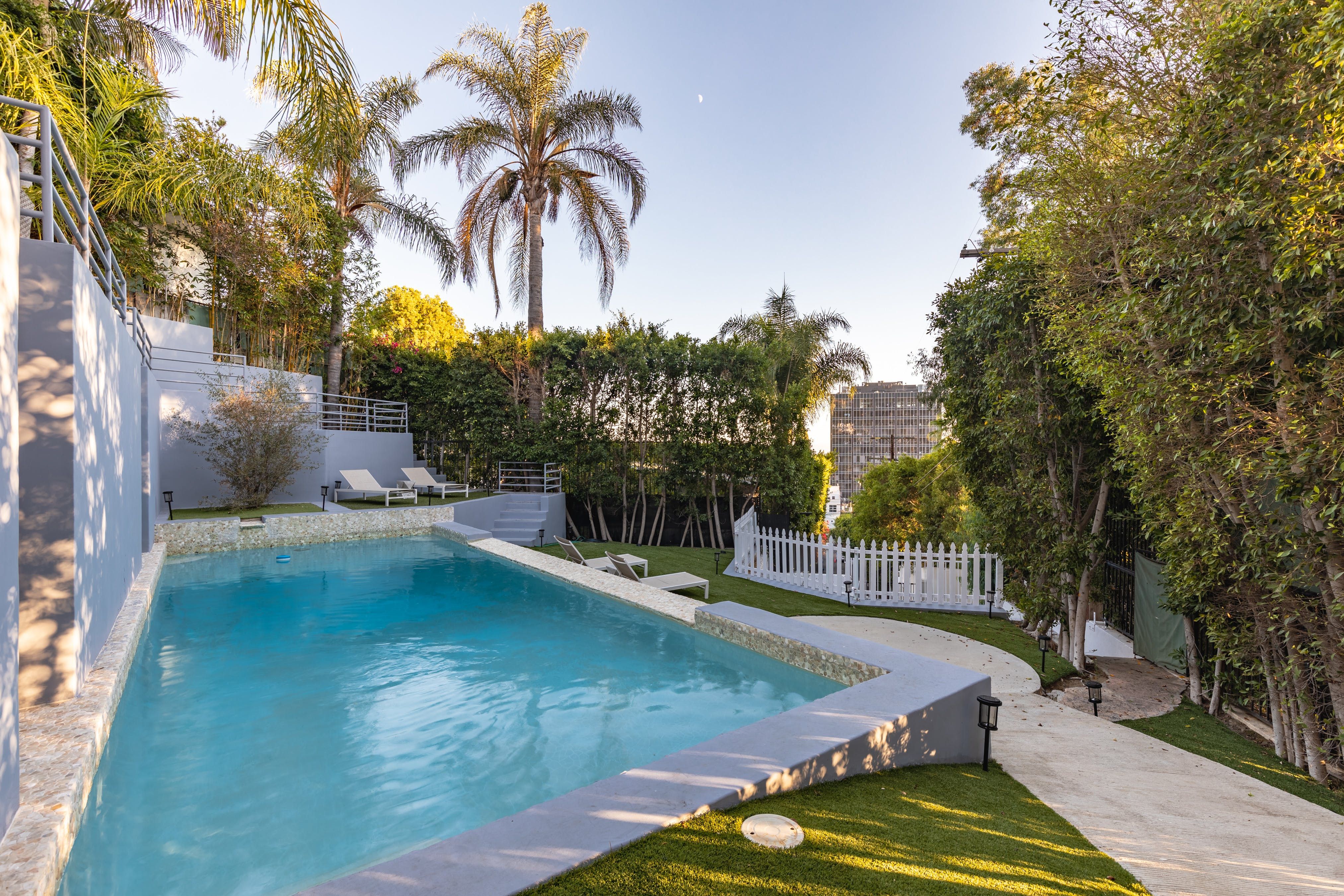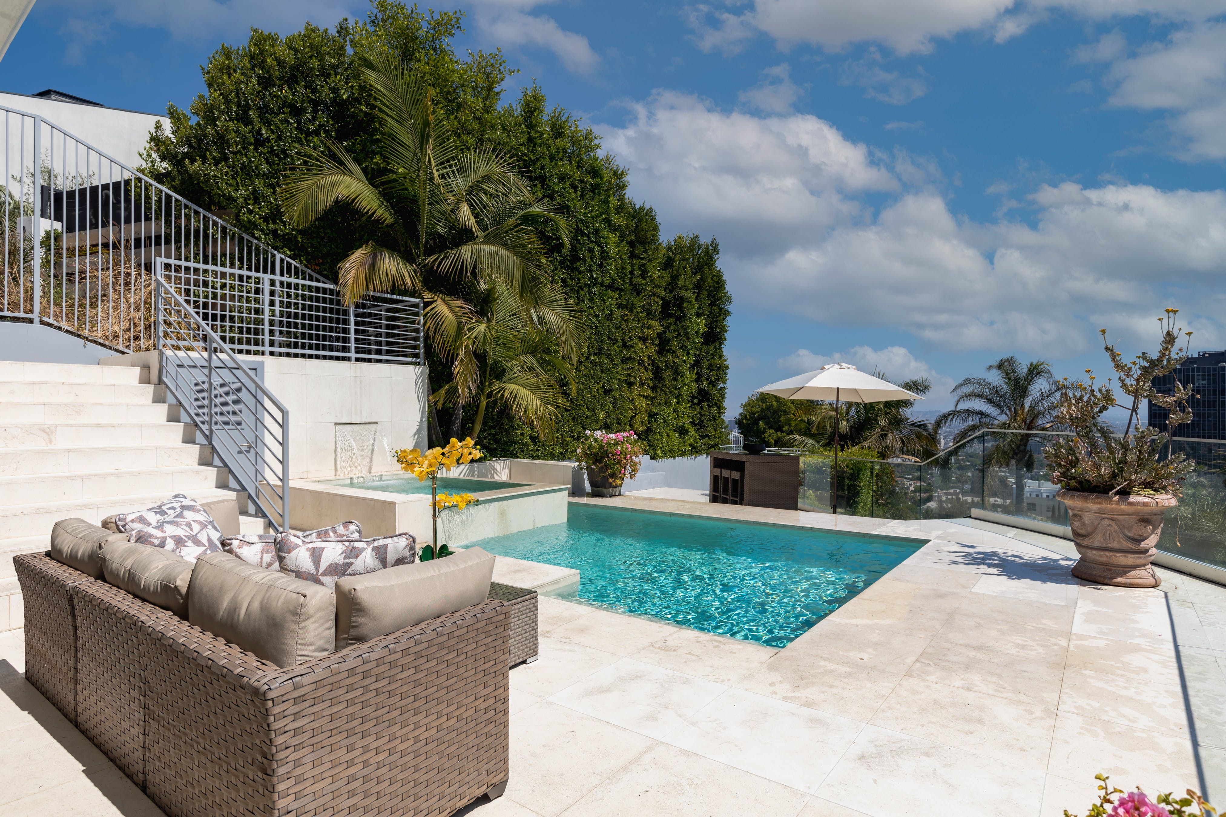 You’ll find this LA home in the Bird Streets, just above Sunset Strip. A ten-minute walk (or two-minute drive) sees you on Sunset Boulevard where boutiques and restaurants sit between theatres and live music venues. Though you may not need to leave the comfort of your home as there’s plenty to entertain you on-site. The garden is a series of stepped terraces, hanging off the hillside and offering a beautiful cityscape view. An infinity pool is shaded by palms and surrounded by loungers and you’ll find plenty of secluded seating spots with parasols and outdoor fireplaces. The real surprise is a second swimming pool, crowned with a Jacuzzi, on the upper terrace with a fab sunset view. Inside the feel is old Hollywood entertainment with a long fireplace in the lounge and a wet bar for evening cocktails. The long dining table is big enough to fit the whole group and sits in front of sliding glass doors with a panoramic city view. If you’re looking for a lavish spot to entertain a big group of friends or family, this is the home for you.
