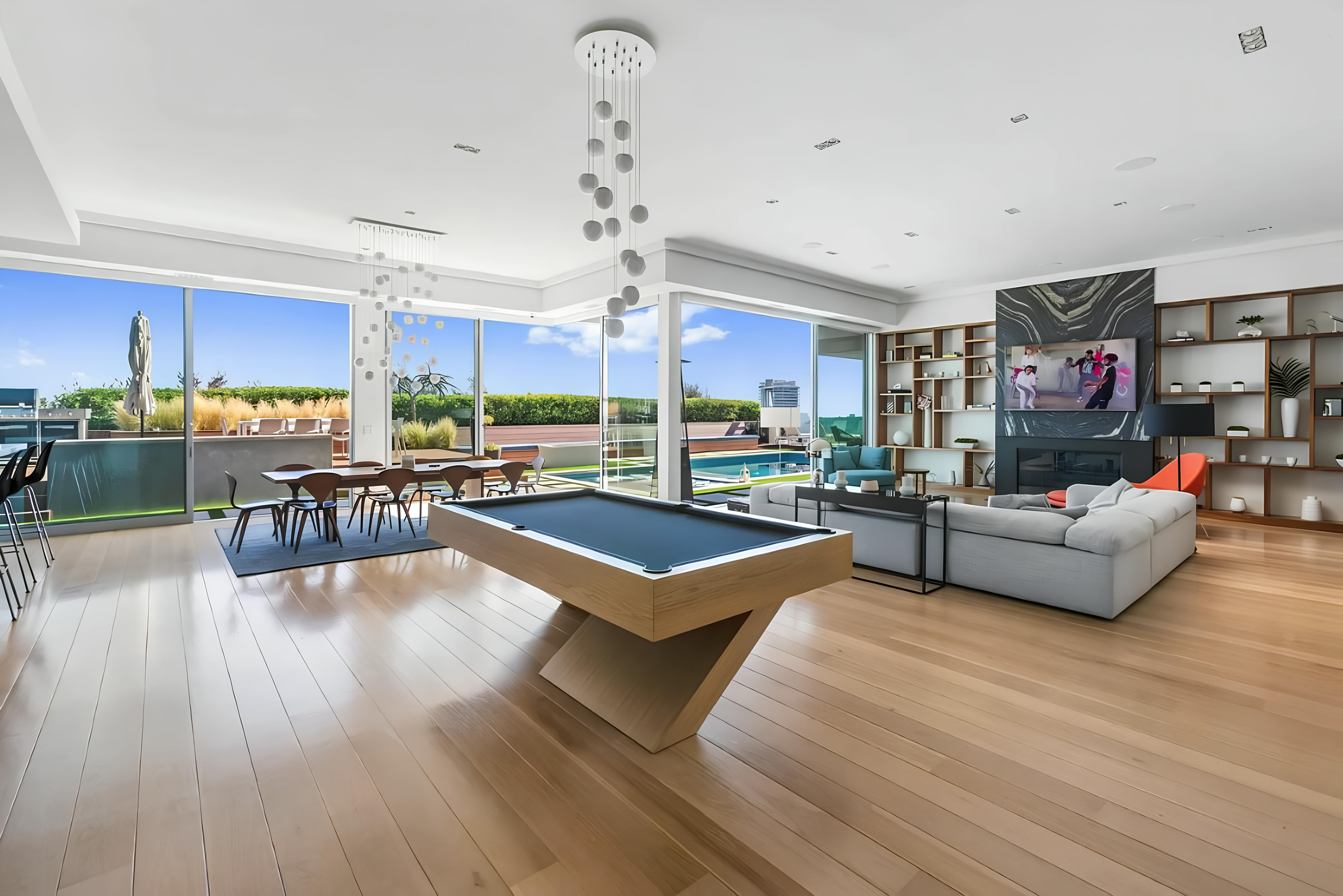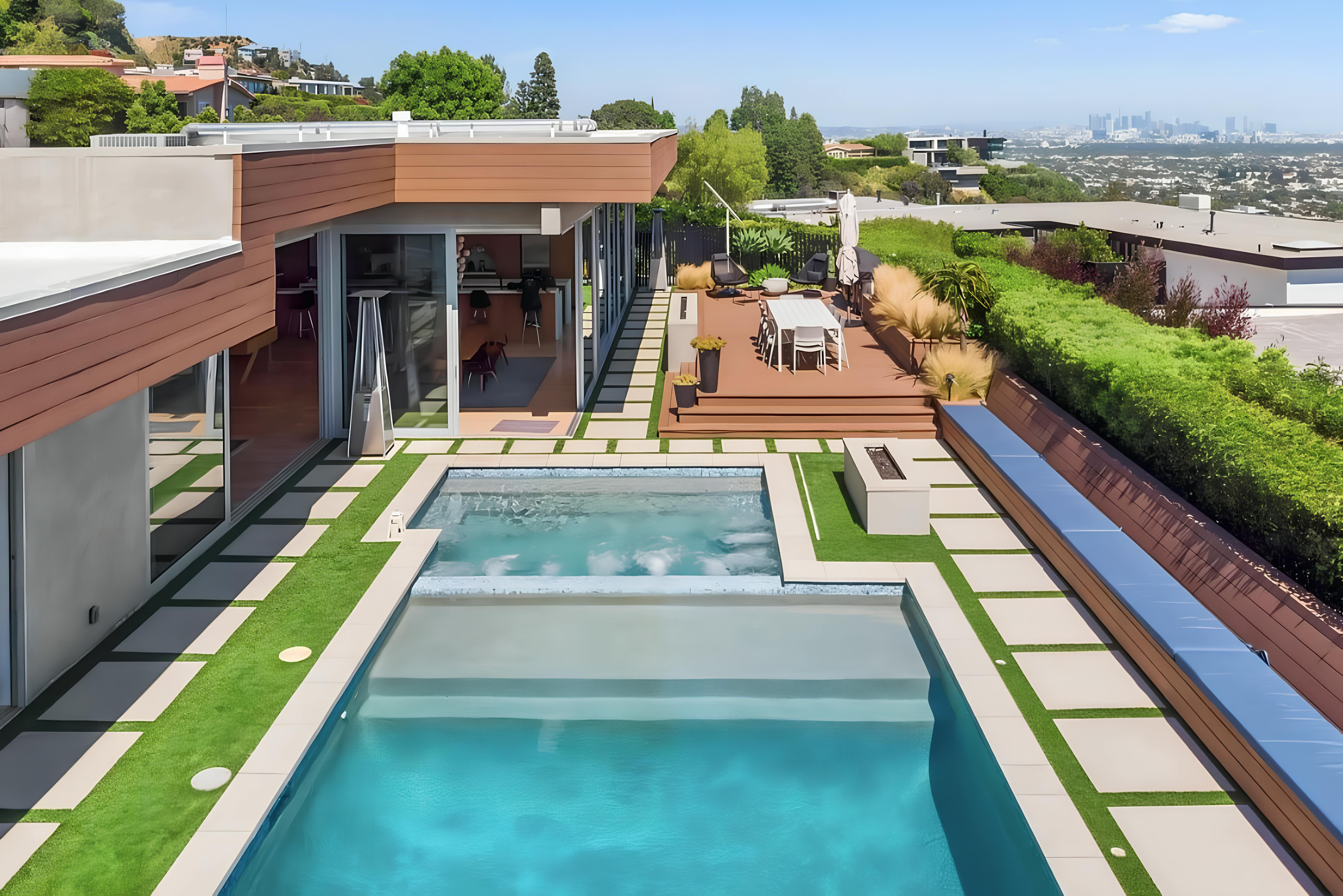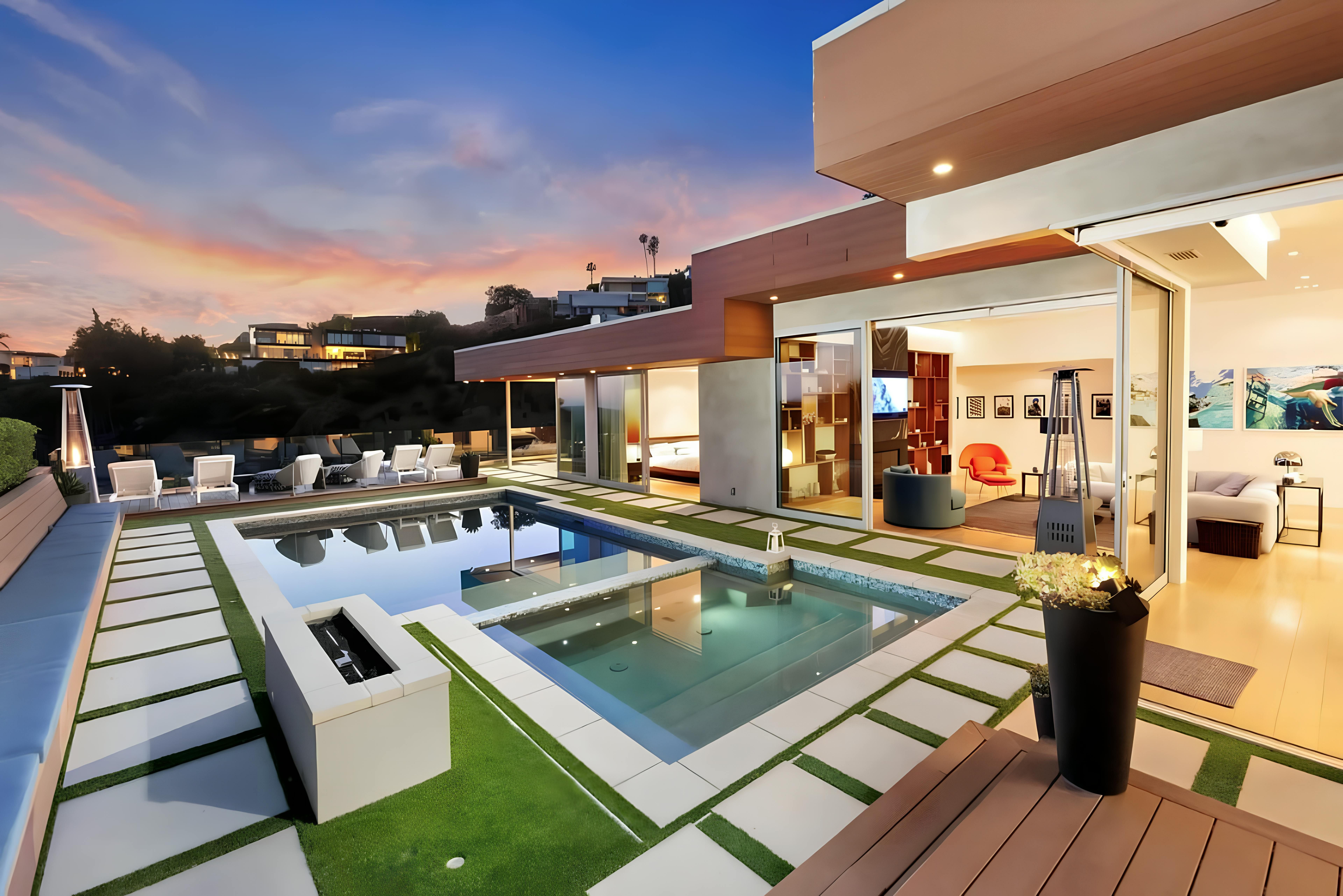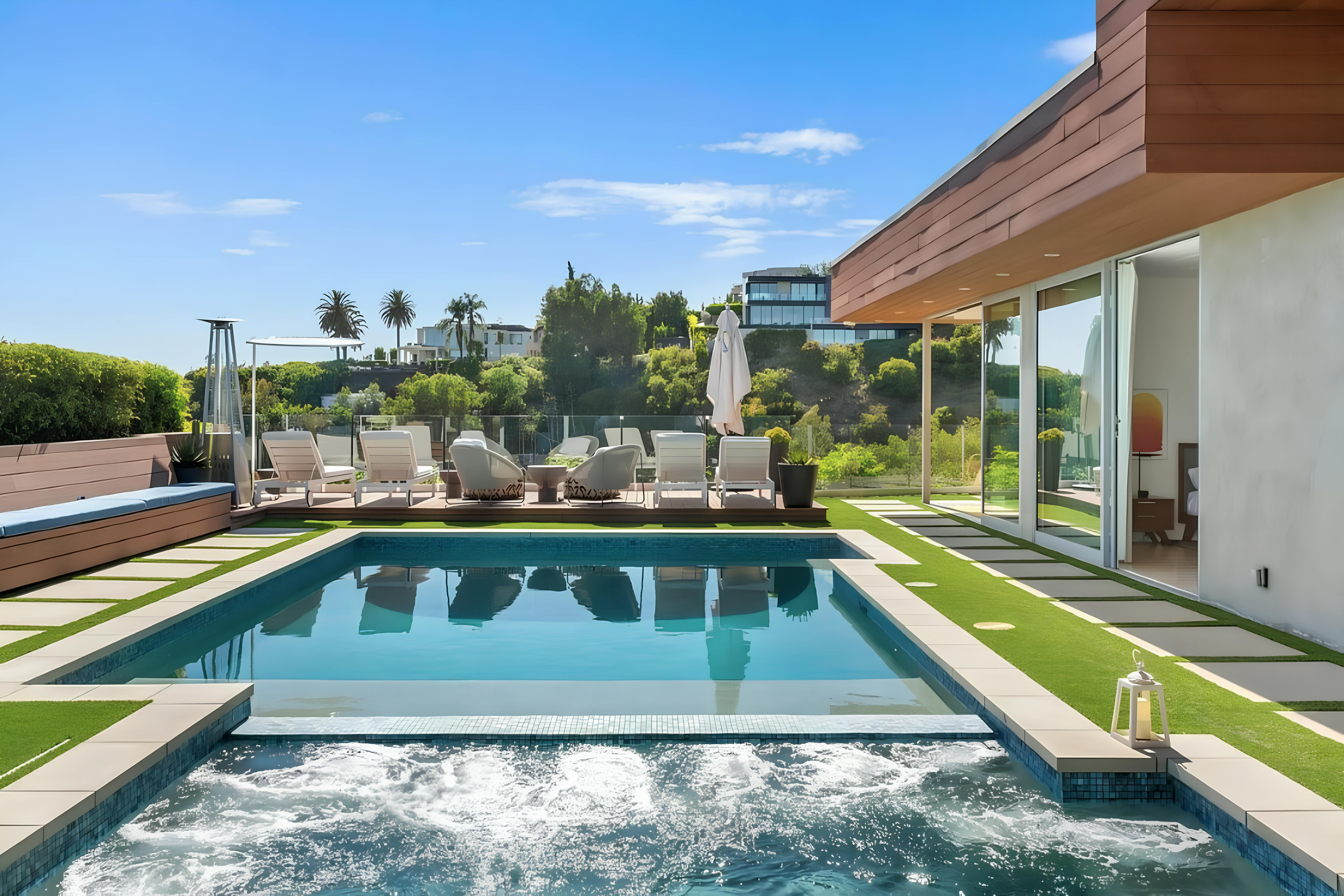 This home is a great pick for an LA stay – it's tucked away on a quiet cul-de-sac but still close to the action. You can walk to Sunset Boulevard and the Sunset Strip, while Beverly Hills is only about ten minutes away by car. Set on one level, the open floor plan features a gourmet kitchen for entertaining, and floor-to-ceiling glass doors that open onto the private pool and landscaped grounds, with city views. Plus, you can take in ocean views from the main bedroom, which comes complete with a fireplace and spa-inspired bath for the ultimate cosy night in.