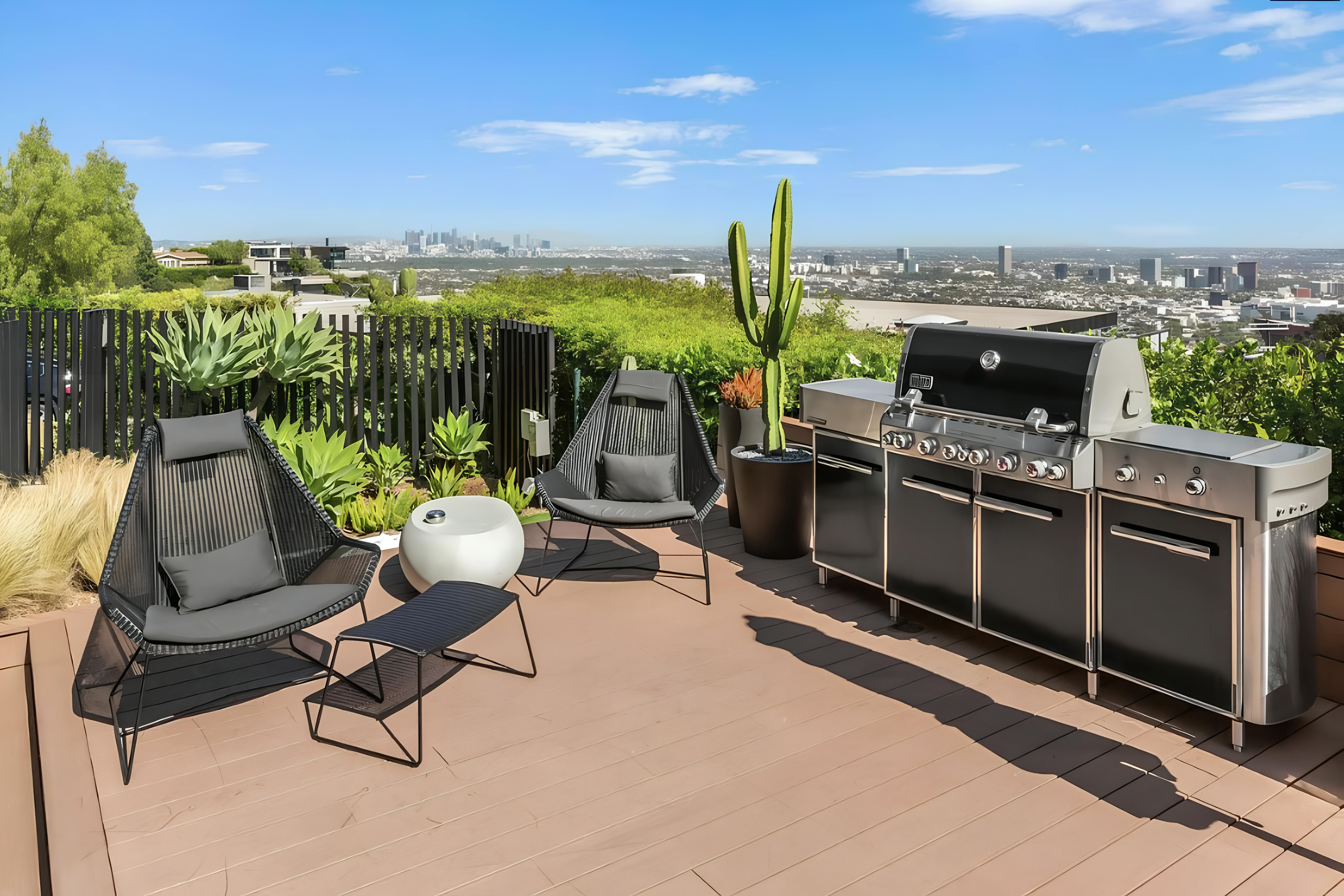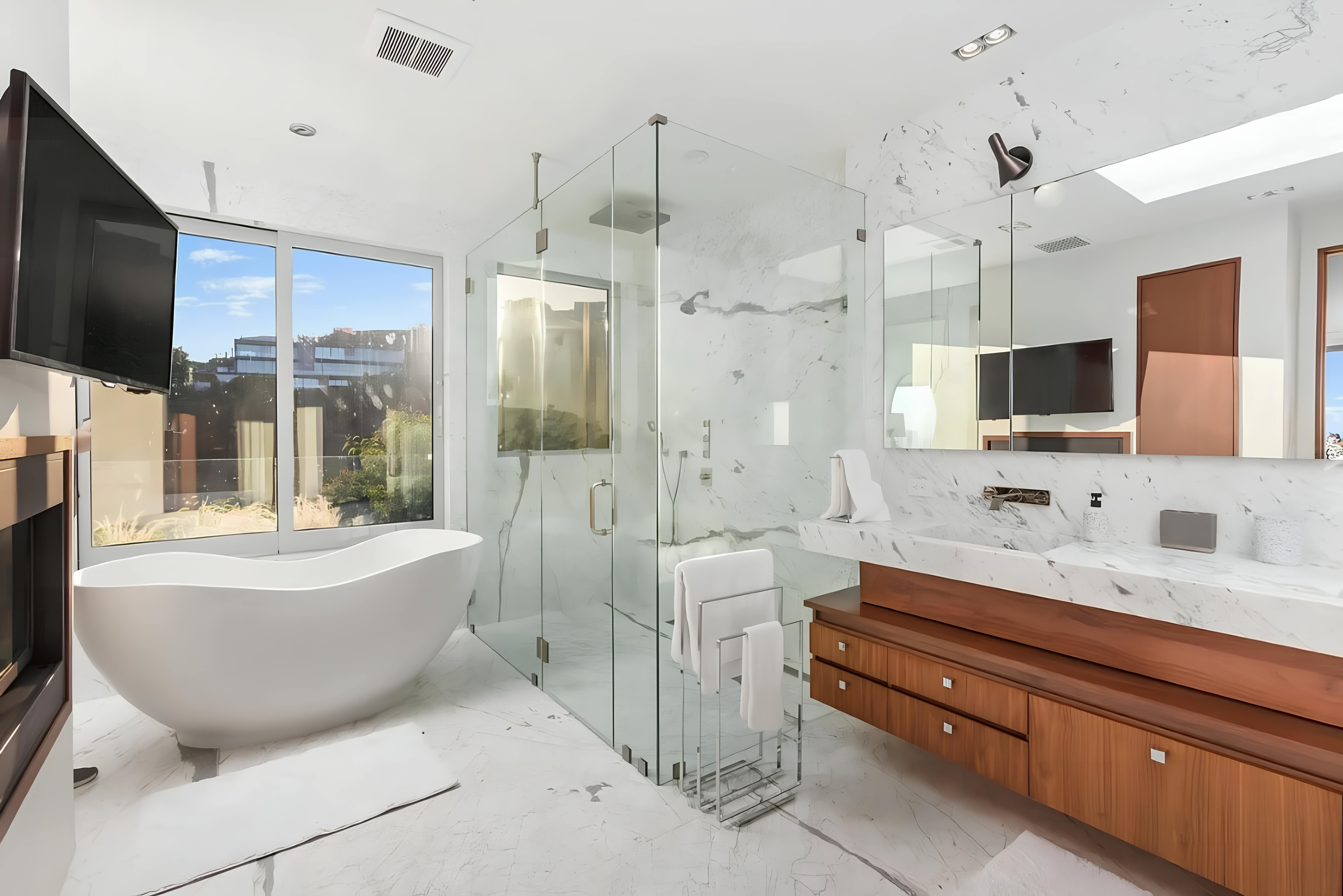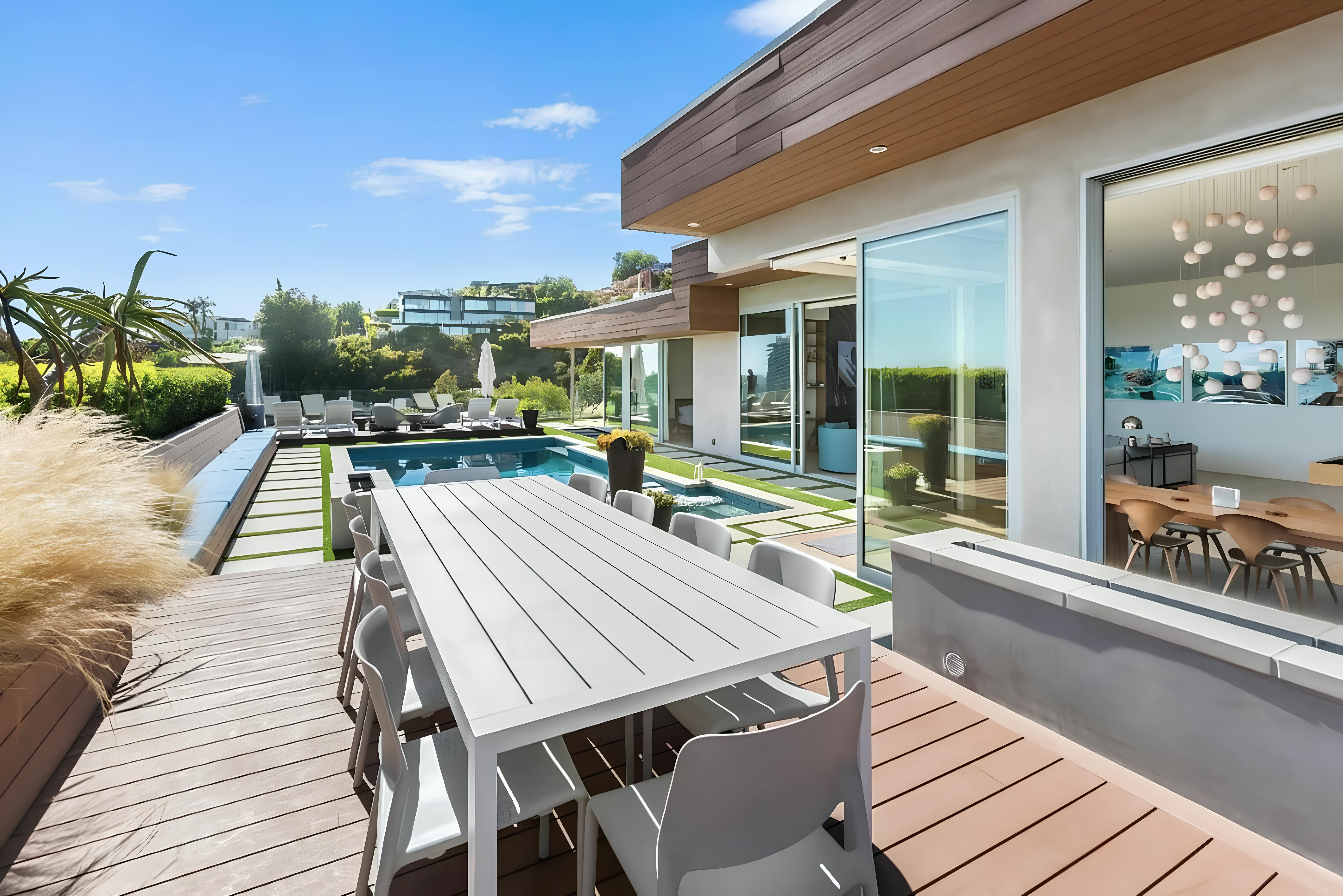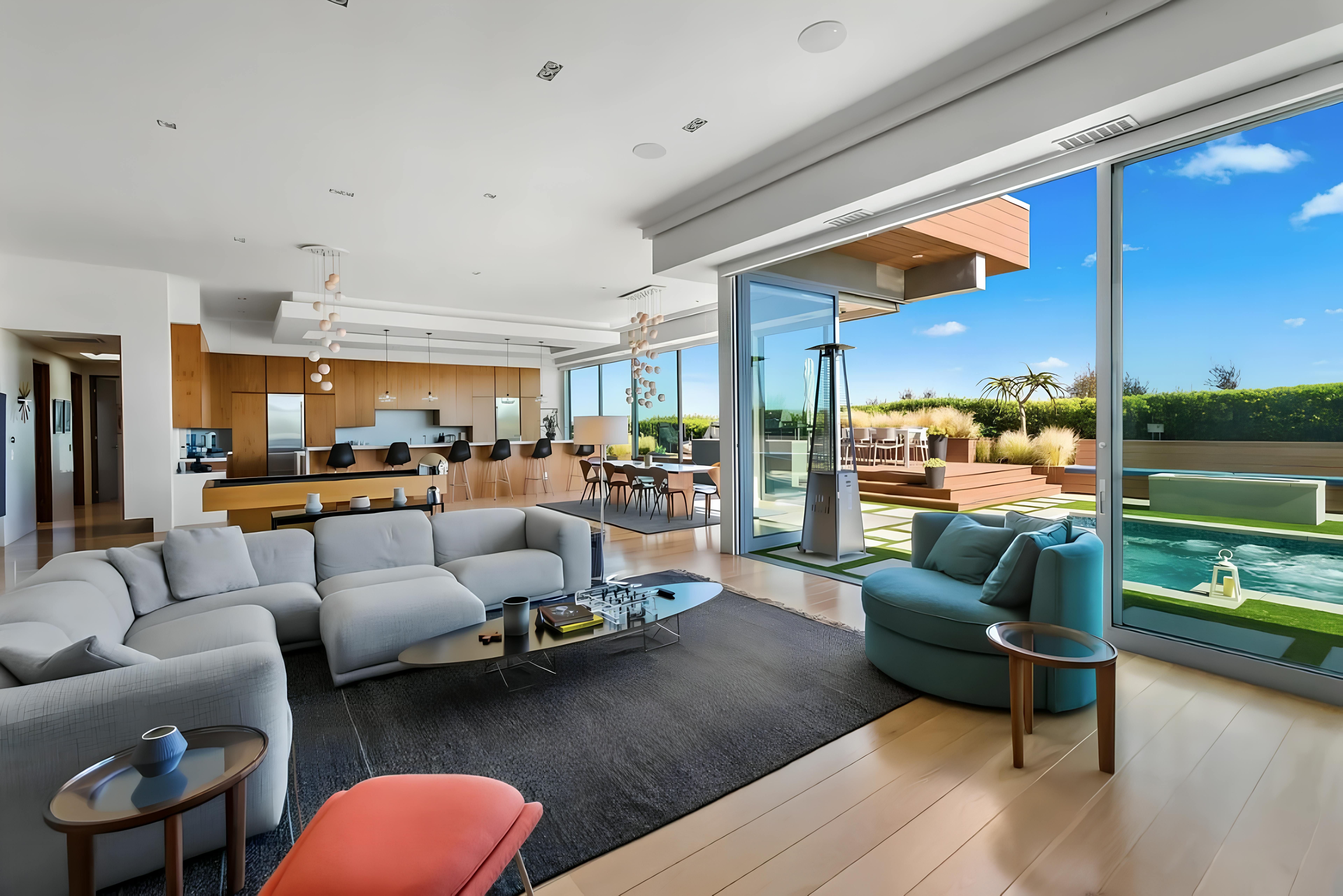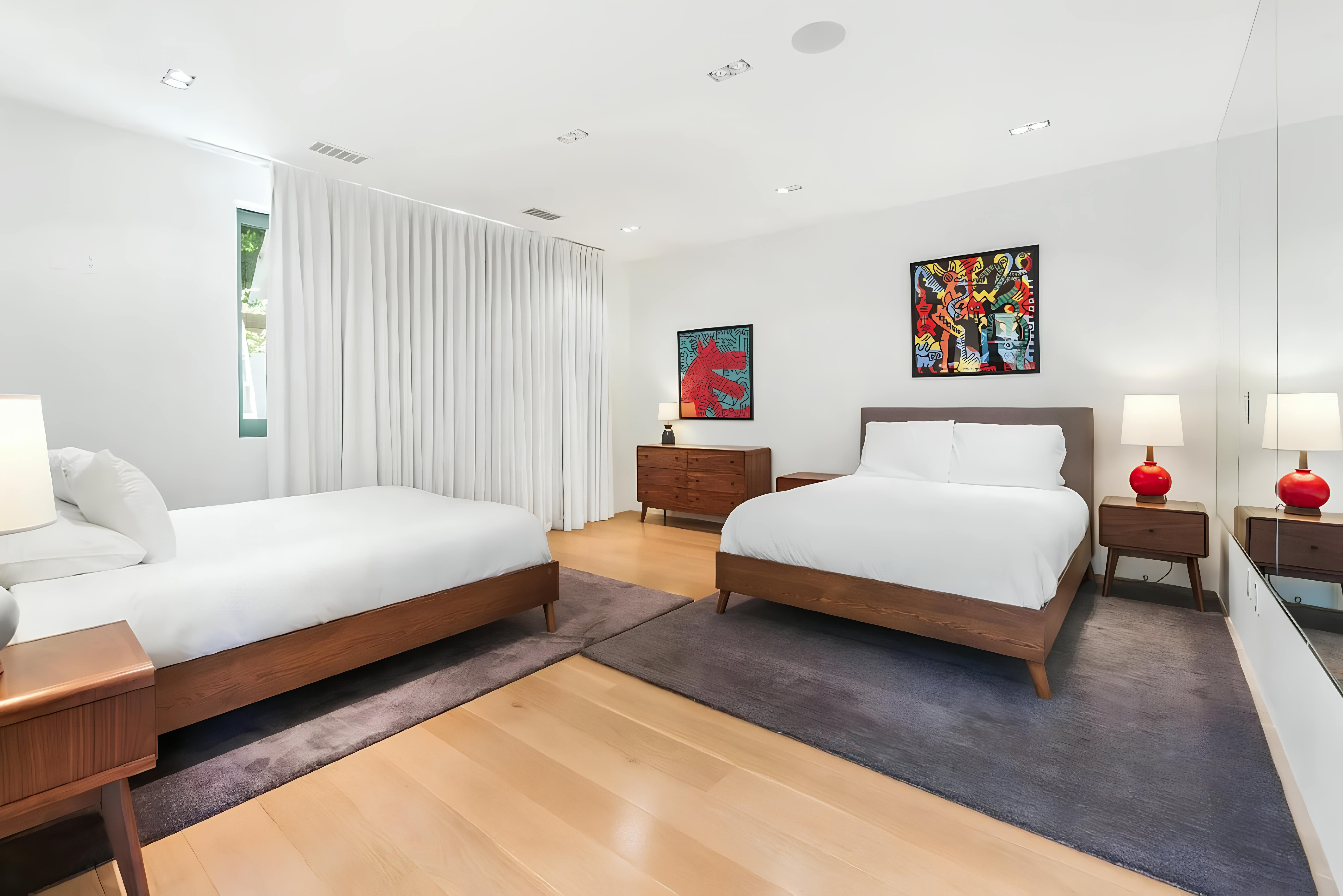 This home is a great pick for an LA stay – it's tucked away on a quiet cul-de-sac but still close to the action. You can walk to Sunset Boulevard and the Sunset Strip, while Beverly Hills is only about ten minutes away by car. Set on one level, the open floor plan features a gourmet kitchen for entertaining, and floor-to-ceiling glass doors that open onto the private pool and landscaped grounds, with city views. Plus, you can take in ocean views from the main bedroom, which comes complete with a fireplace and spa-inspired bath for the ultimate cosy night in.