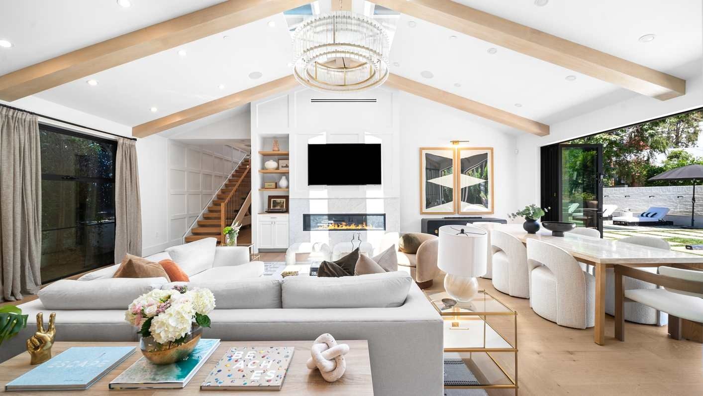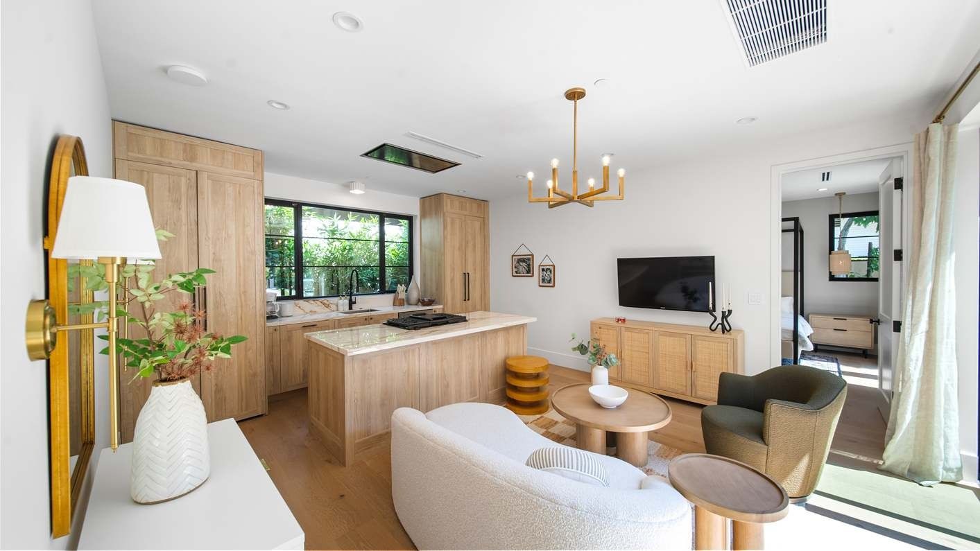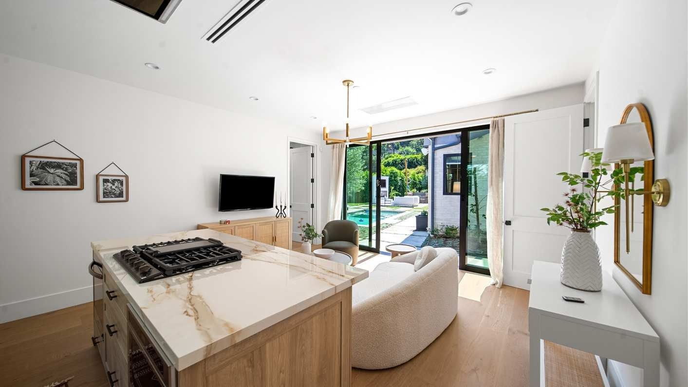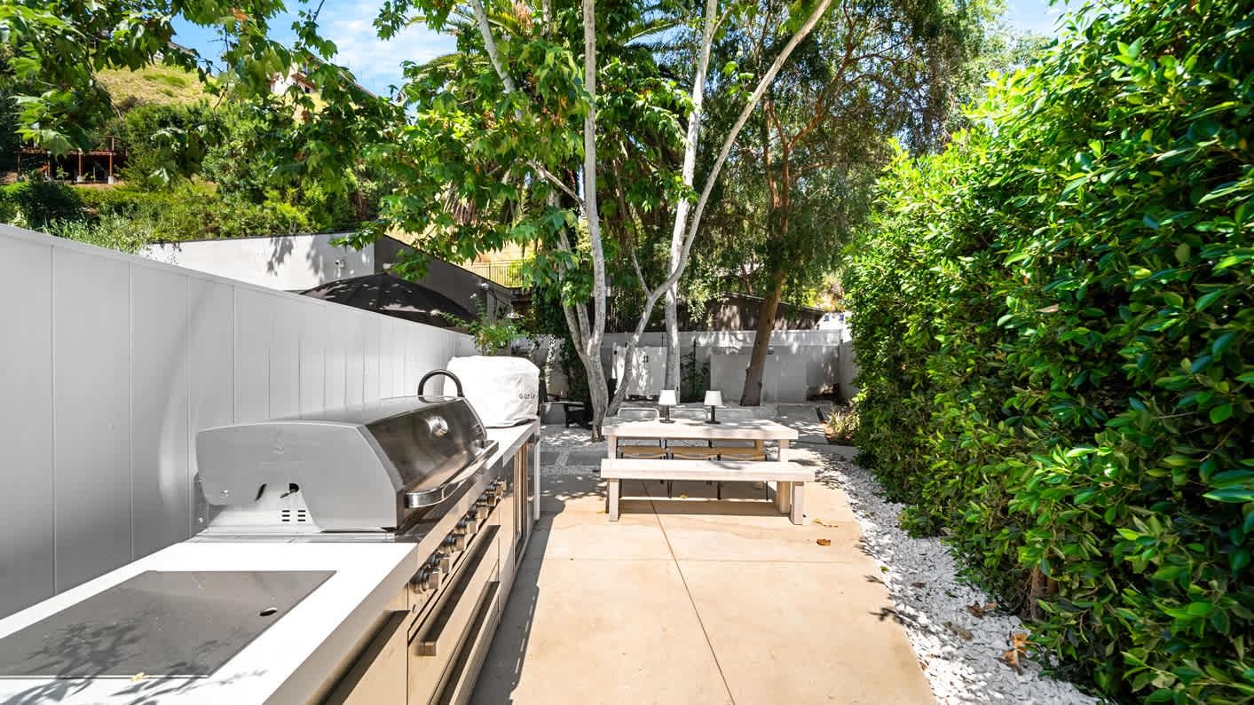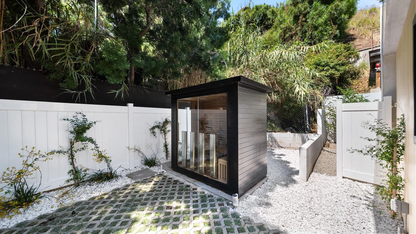 A ten-minute drive from the Sunset Strip, this house offers a true taste of the Hollywood lifestyle. The space feels bright and open, with almost every room opening directly to the outdoors. There are four bedrooms in the main house and two more in a self-contained guest house – ideal for hosting visiting family or friends. Days here are best spent lounging by the pool, recharging in the sauna or hot tub, and firing up the grill for alfresco feasts beneath the palms. Come nightfall, an outdoor cinema and lounge set the scene for movie nights and starlit conversations. Location-wise, there are restaurants, shops and cafes right outside the door, while hiking trails wind through Laurel Canyon.
