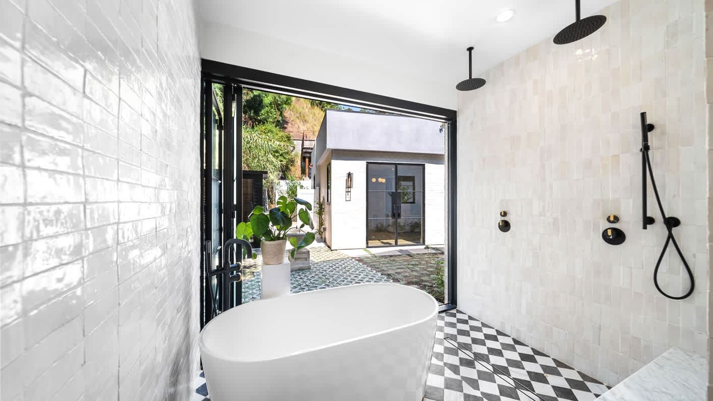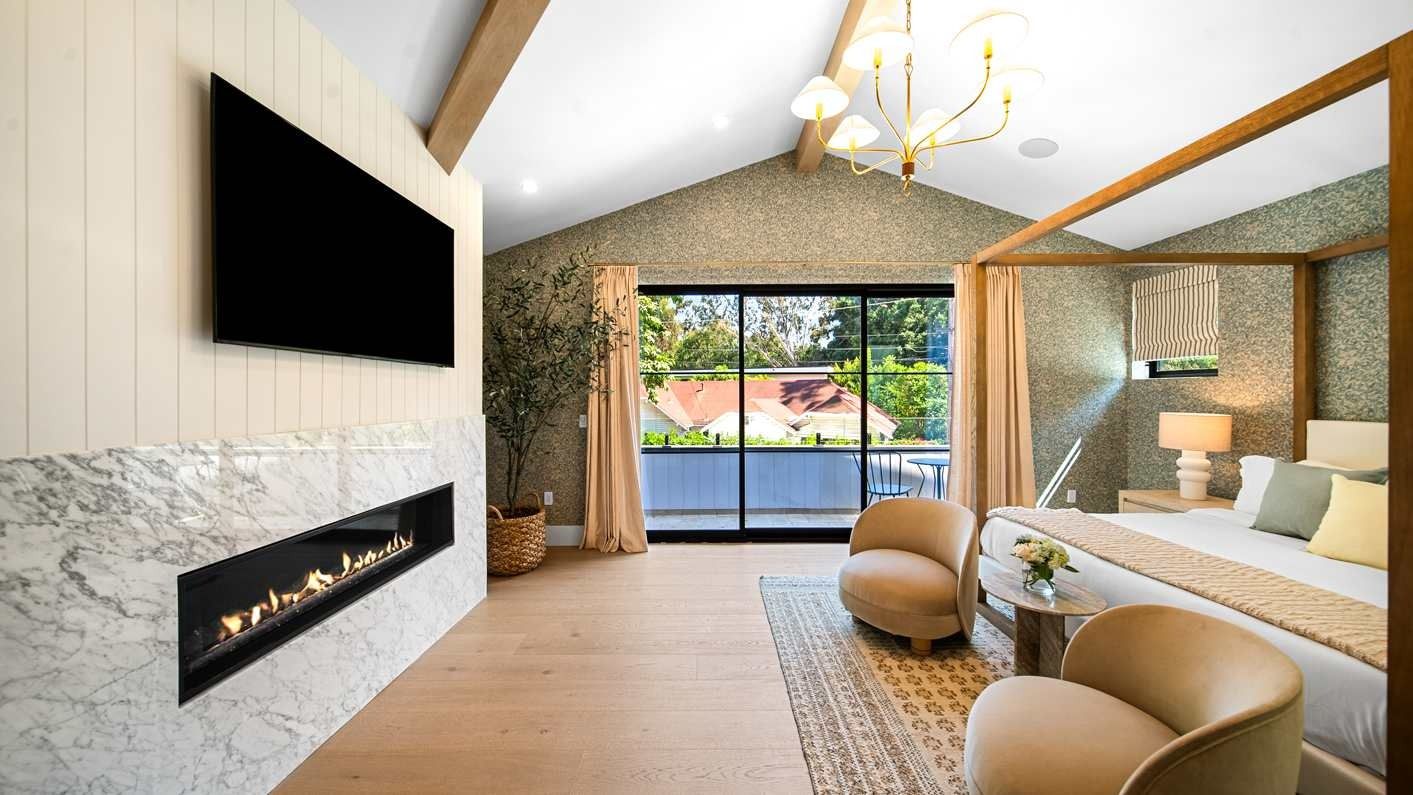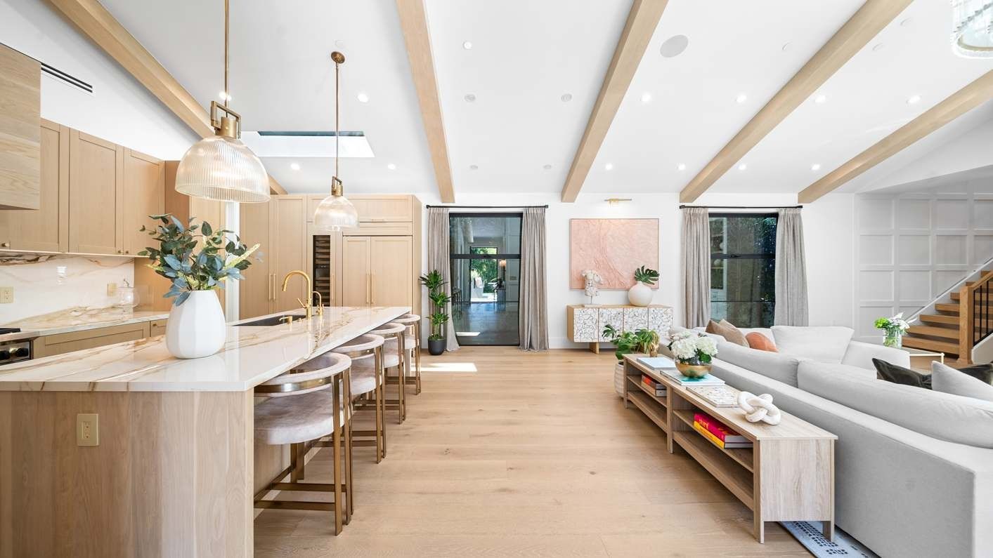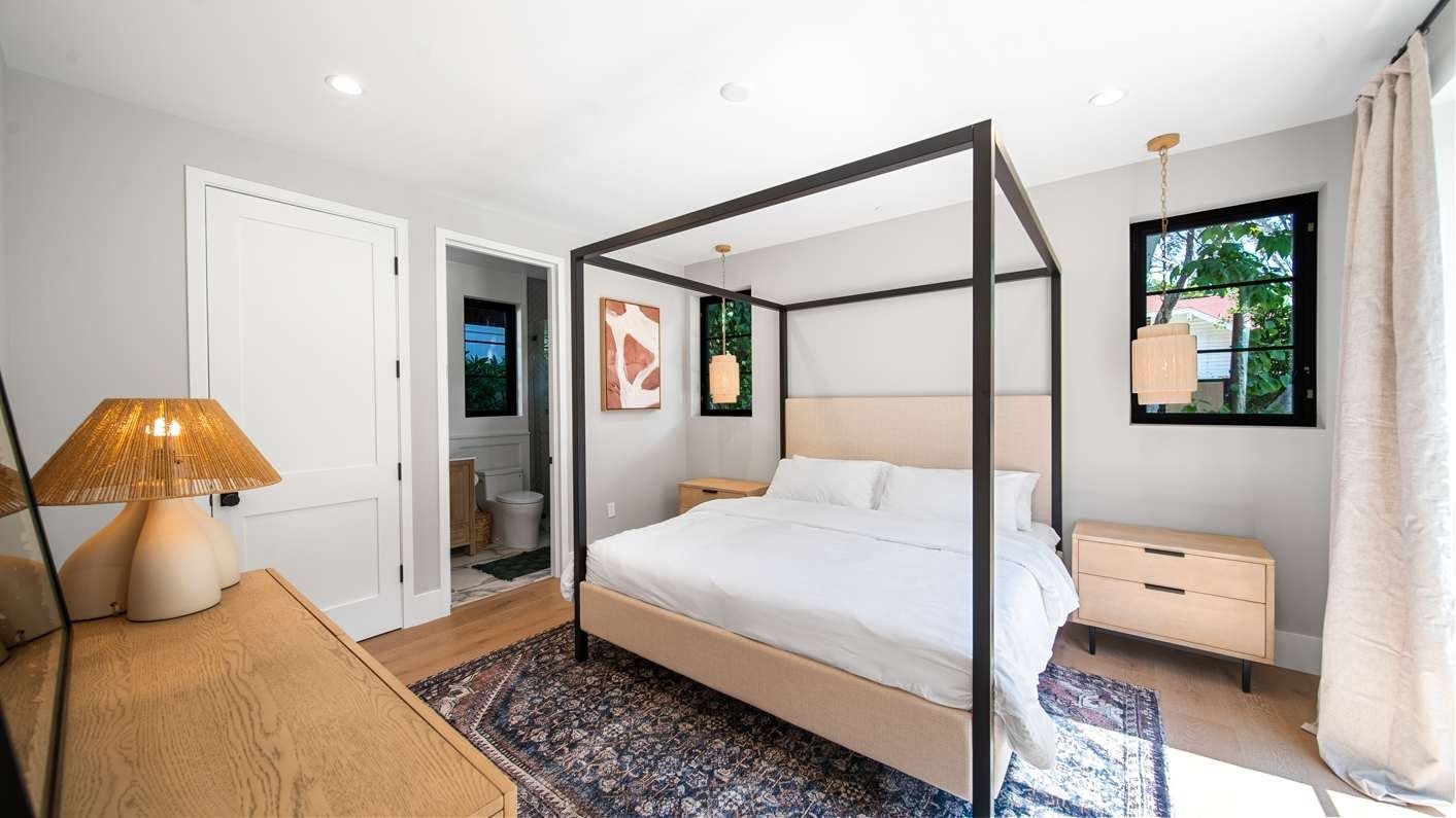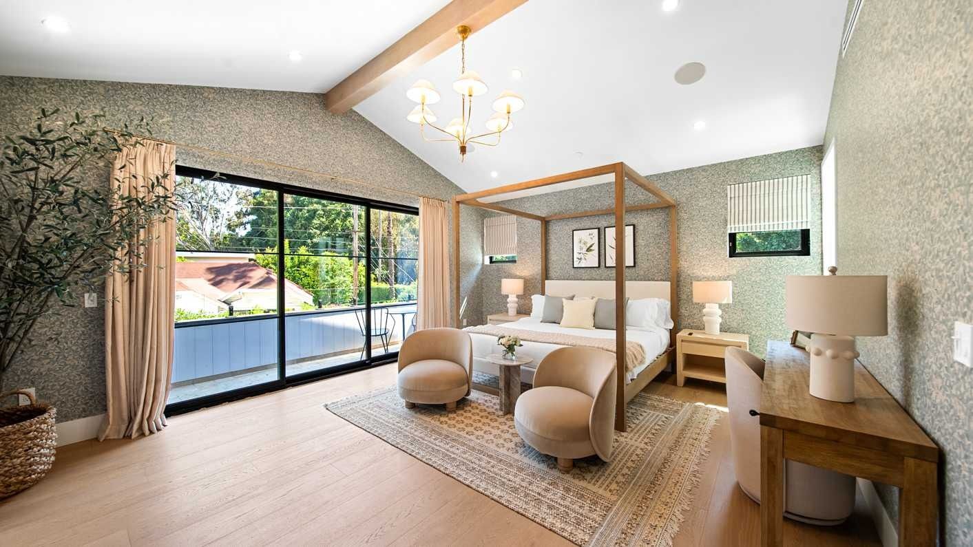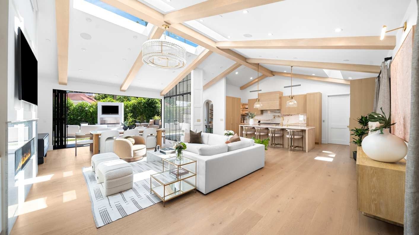 A ten-minute drive from the Sunset Strip, this house offers a true taste of the Hollywood lifestyle. The space feels bright and open, with almost every room opening directly to the outdoors. There are four bedrooms in the main house and two more in a self-contained guest house – ideal for hosting visiting family or friends. Days here are best spent lounging by the pool, recharging in the sauna or hot tub, and firing up the grill for alfresco feasts beneath the palms. Come nightfall, an outdoor cinema and lounge set the scene for movie nights and starlit conversations. Location-wise, there are restaurants, shops and cafes right outside the door, while hiking trails wind through Laurel Canyon.