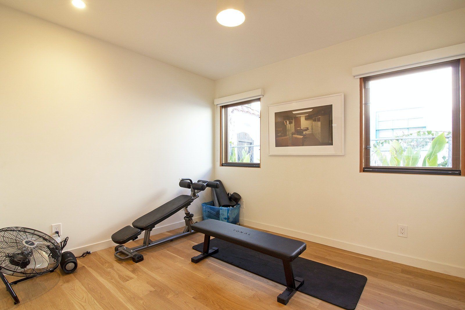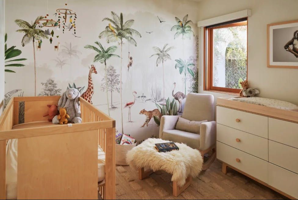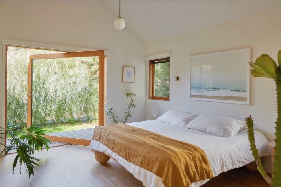 Our favourite room in the house, the master bedroom, is bright and spacious, with a big pivot door leading to a little lawned area outside. Elsewhere in the main house, there's a second bedroom with digital all-in-one gym equipment, two stylish bathrooms and a pretty nursery, while the guest house in the garden can be your fourth bedroom or maybe an office if you'll be working during your stay.