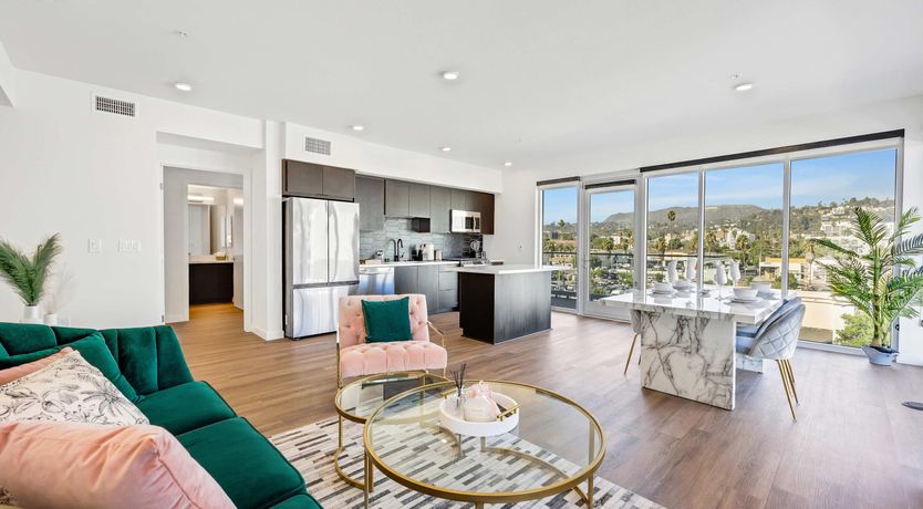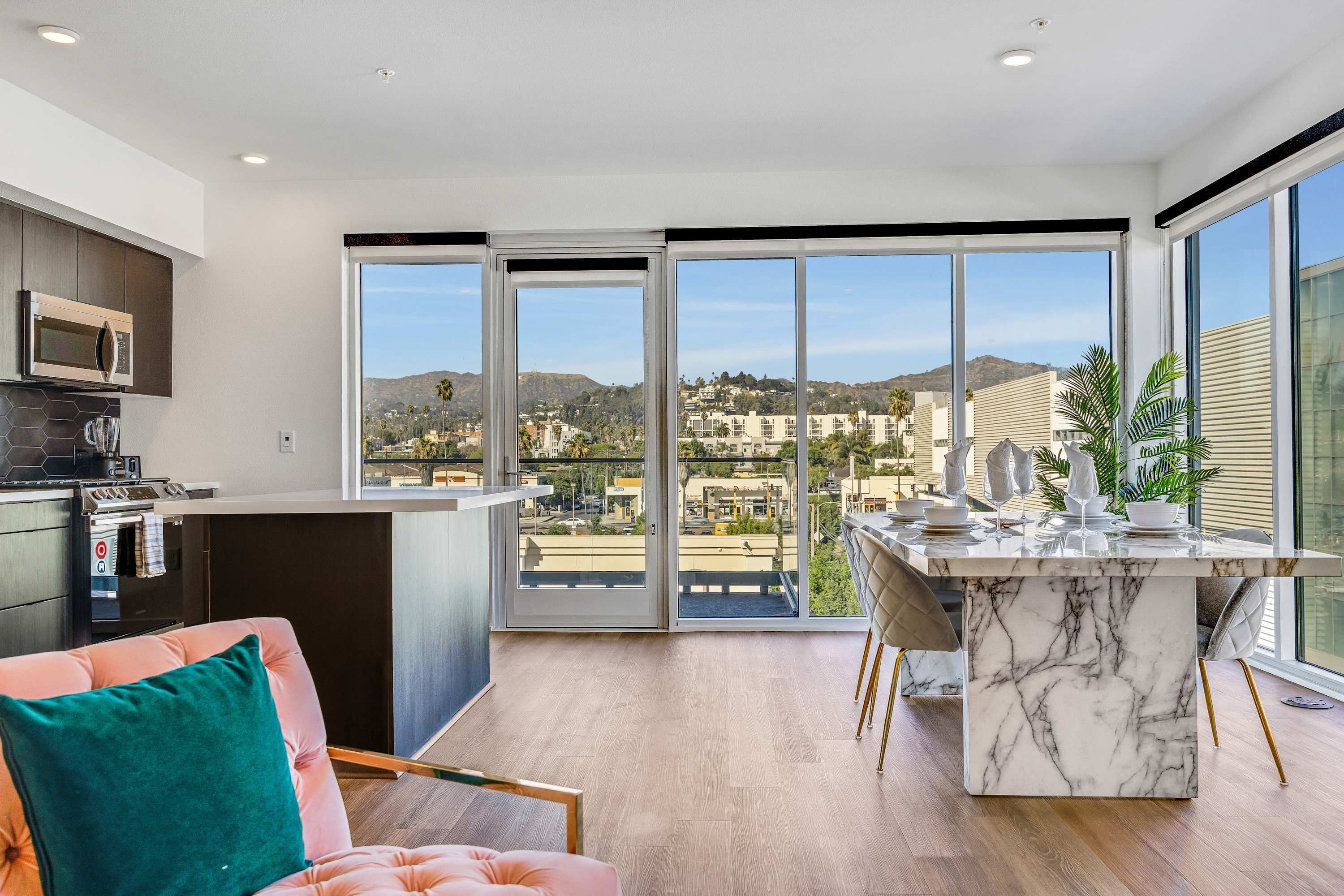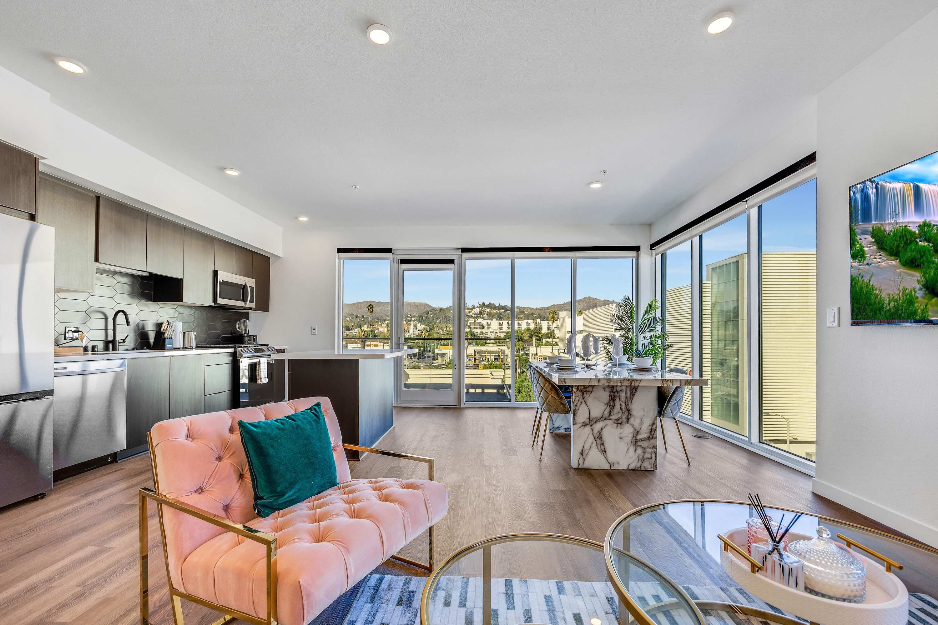 This LA apartment comes with impressive views across the Hollywood sign. It also boasts a wonderful open-plan layout for laidback movie nights or catch up work sessions. You’ll have a private balcony for sunset drinks and the building features a rooftop terrace, a pool and a gym – covering all your wellness needs. Free parking is available and well-behaved pets are welcome to join you for an additional fee. It’s also just a short drive to iconic sights across Hollywood – making this a great base for an exciting city stay.